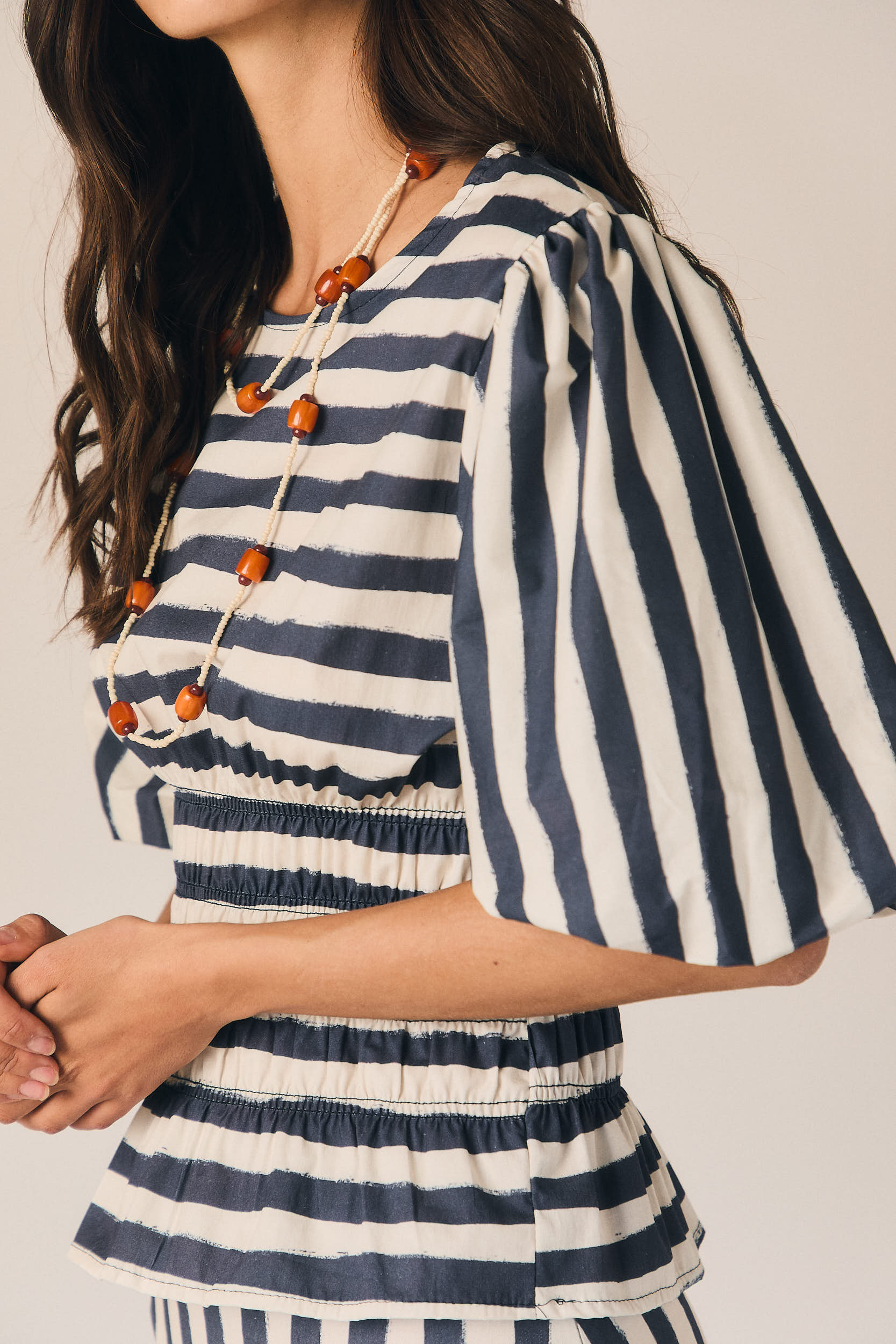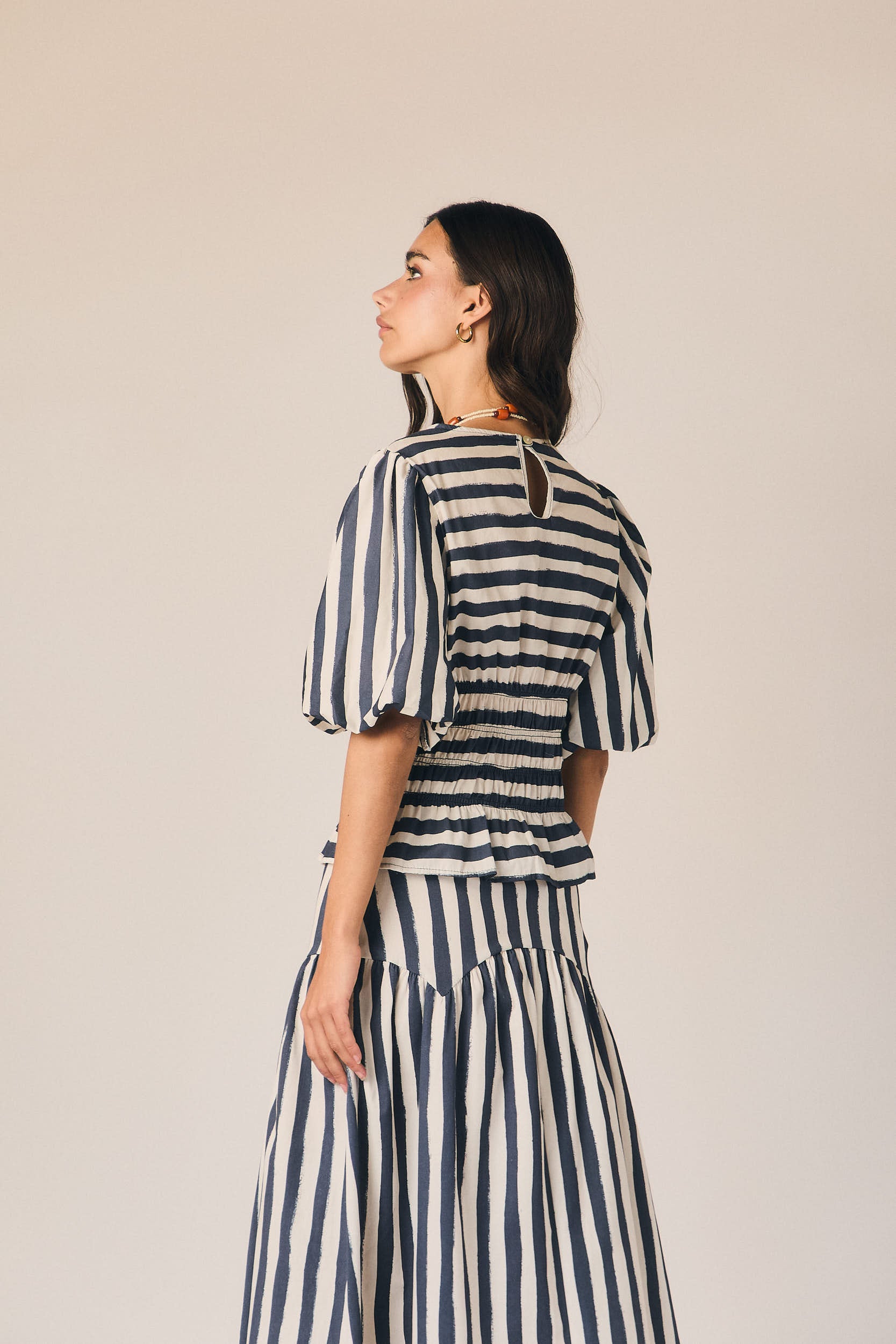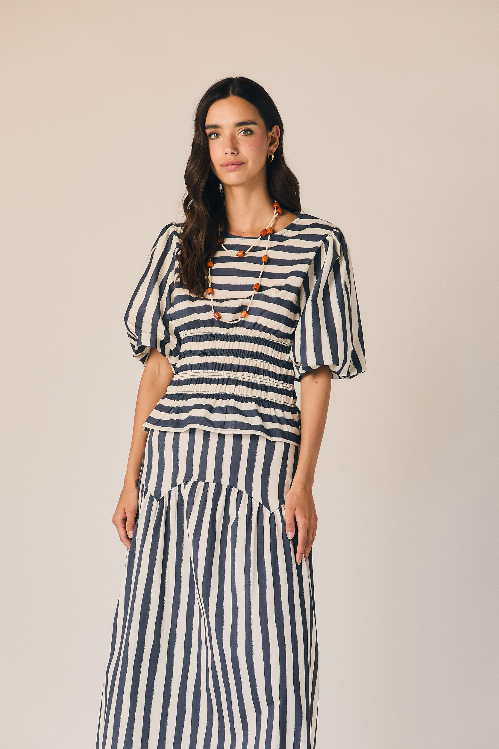 Top en estampado de rayas en tono azul con corte entallado en la cintura. Diseño de cuello redondo y manga corta abullonada que aporta volumen. Presenta cuerpo con fruncido elástico tipo nido de abeja y bajo con ligero volante.