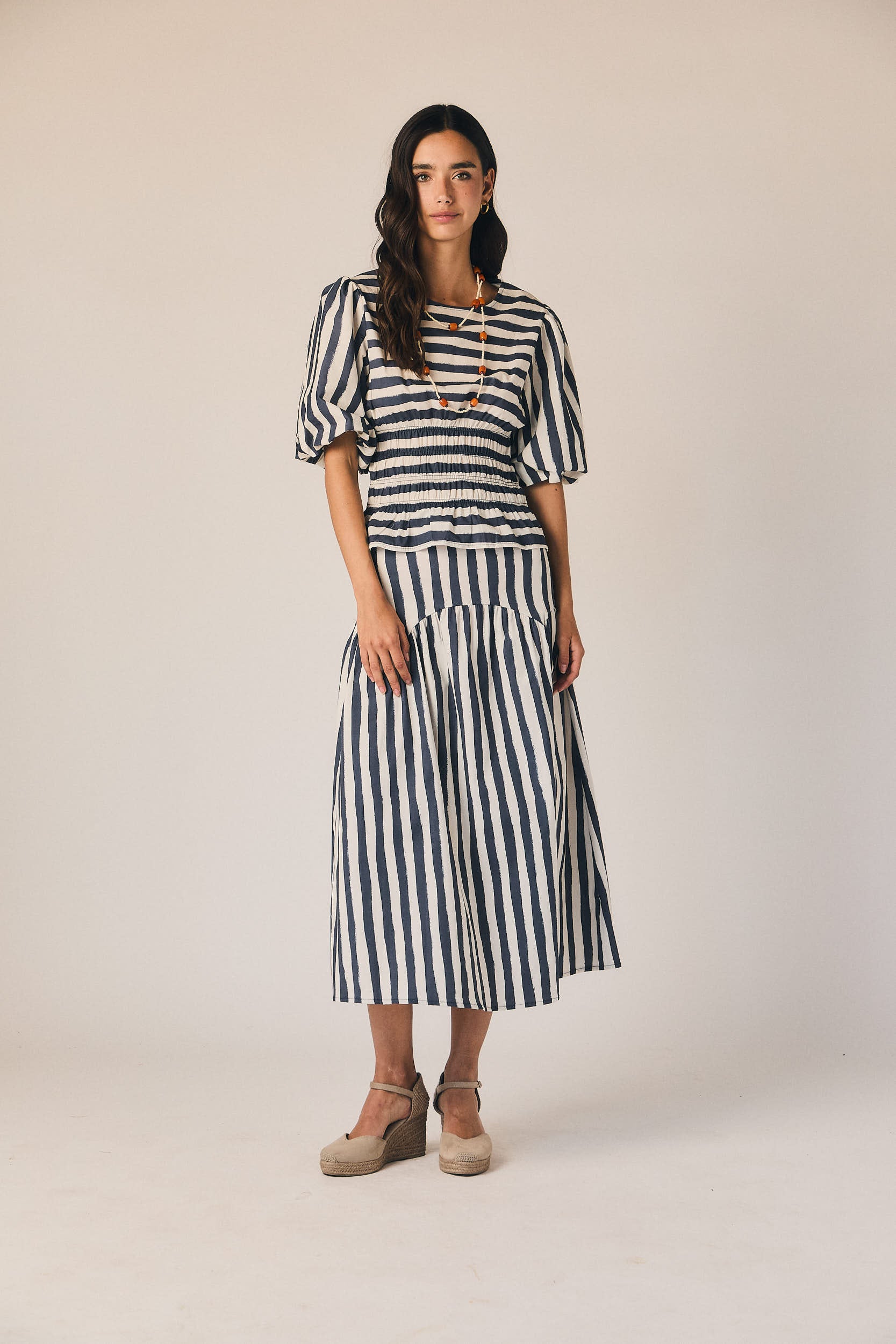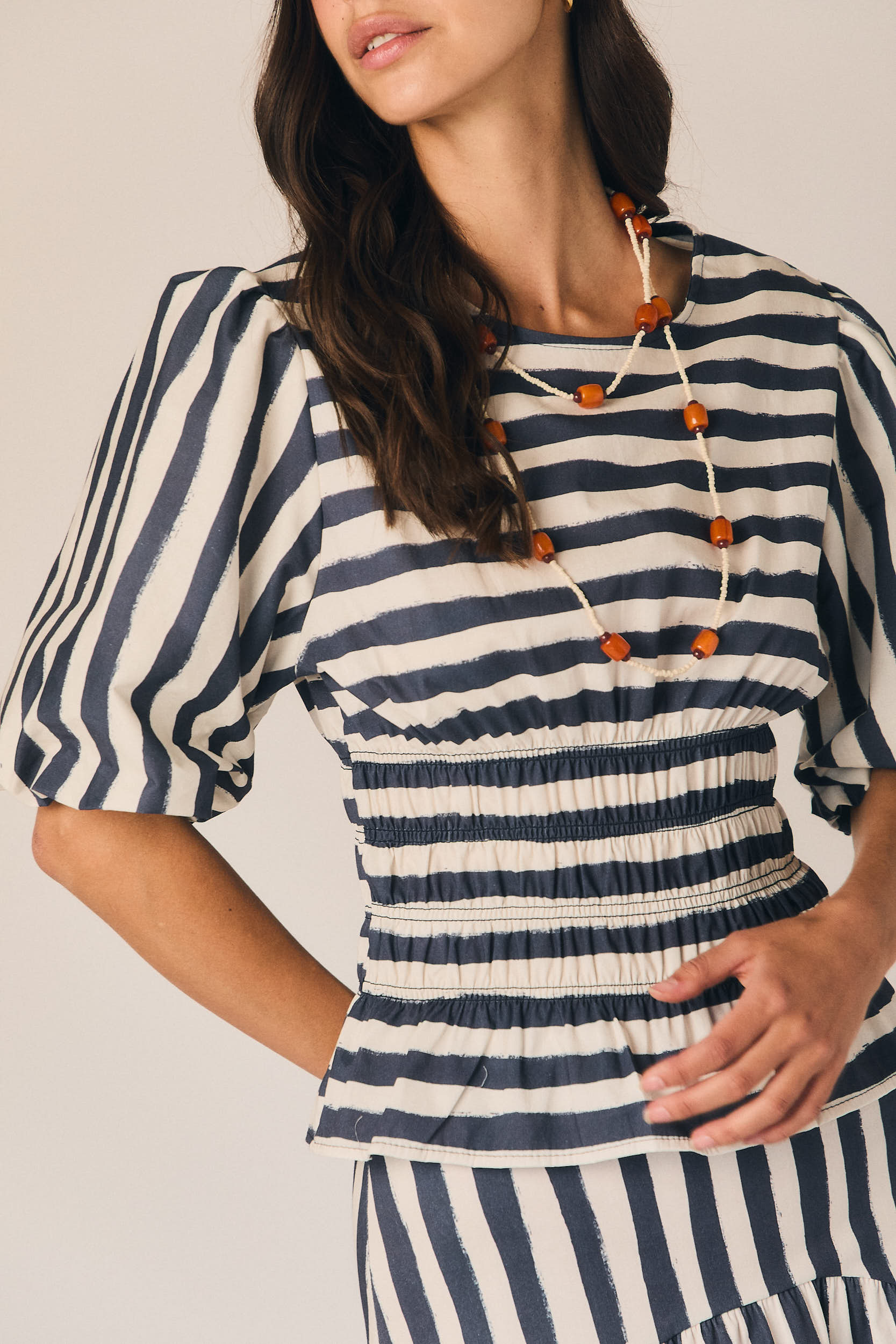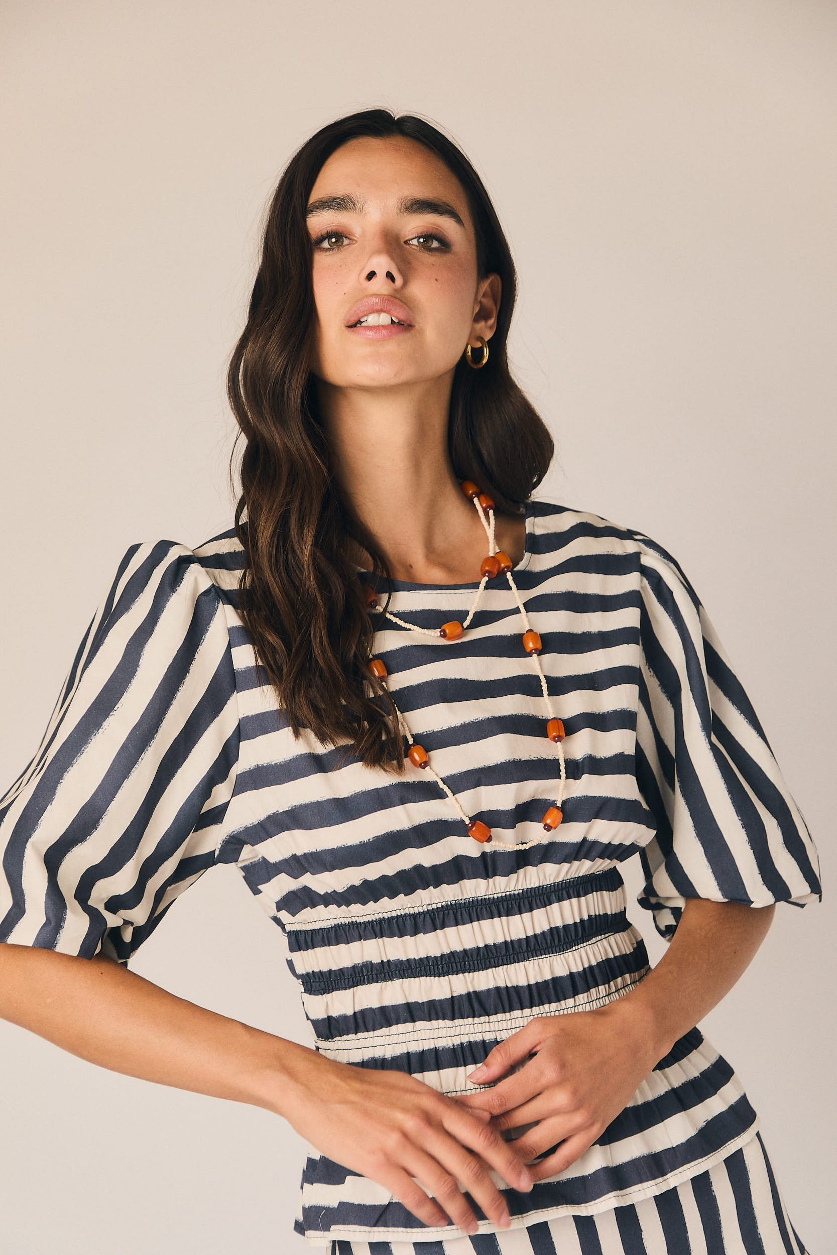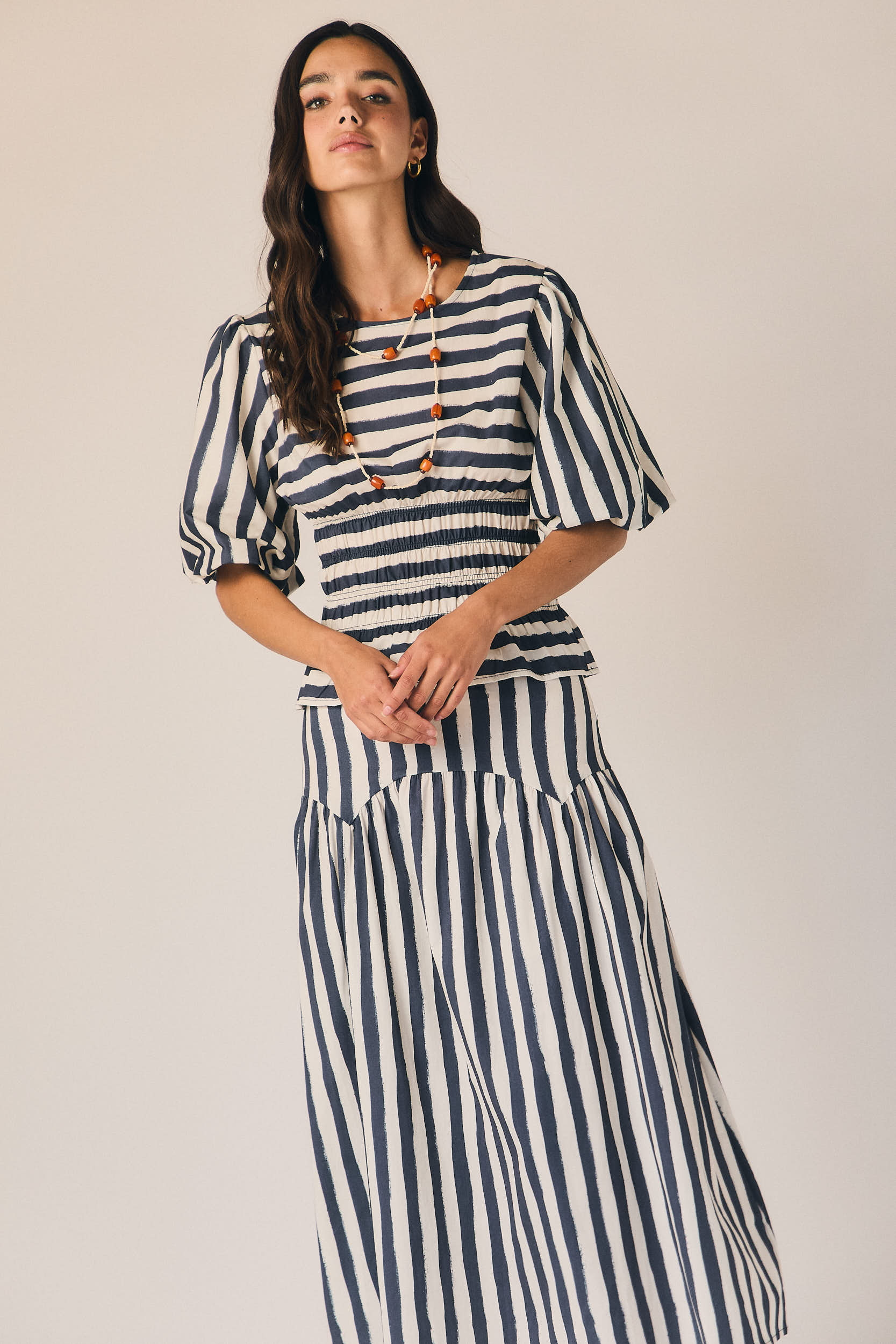 Top en estampado de rayas en tono azul con corte entallado en la cintura. Diseño de cuello redondo y manga corta abullonada que aporta volumen. Presenta cuerpo con fruncido elástico tipo nido de abeja y bajo con ligero volante.
