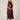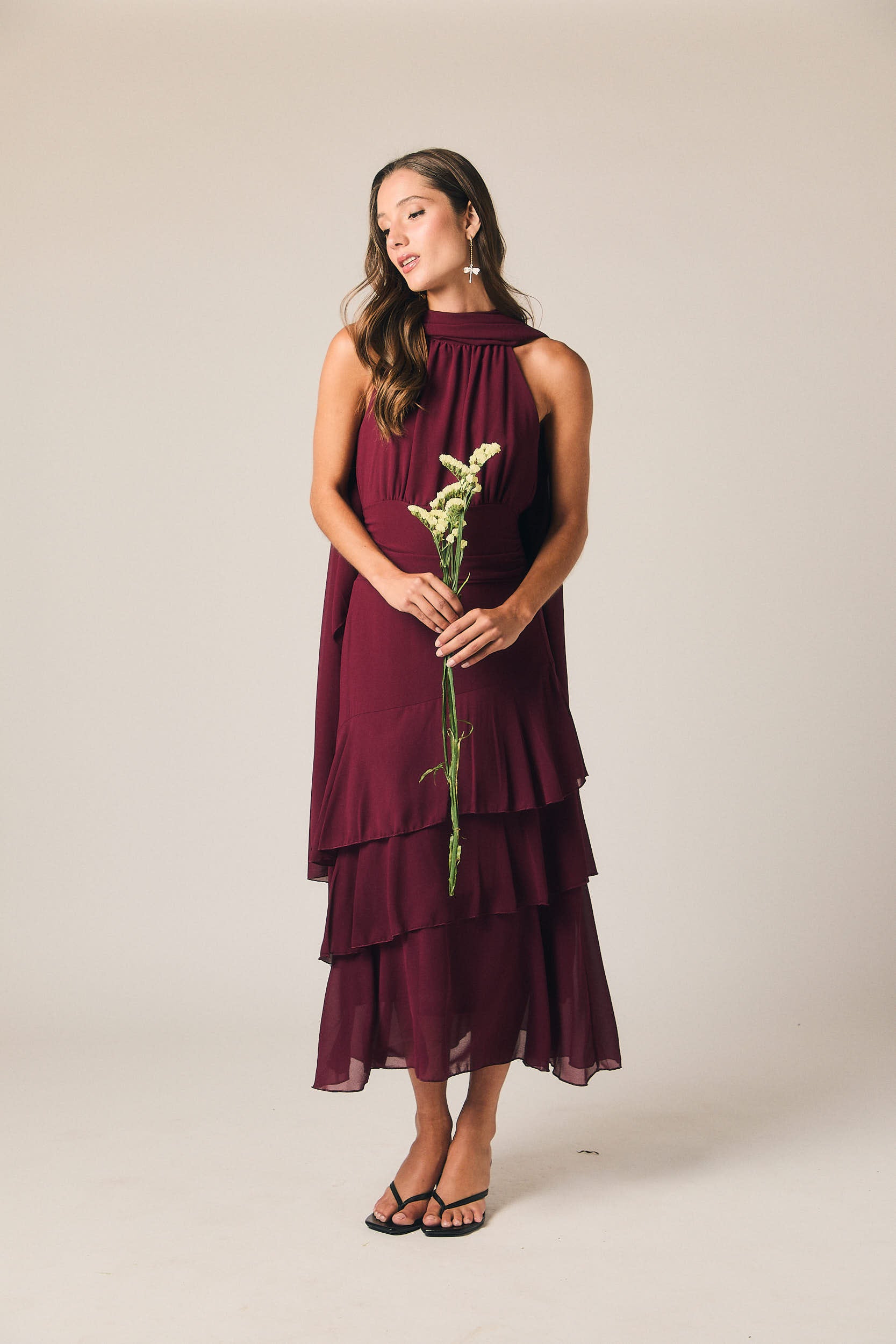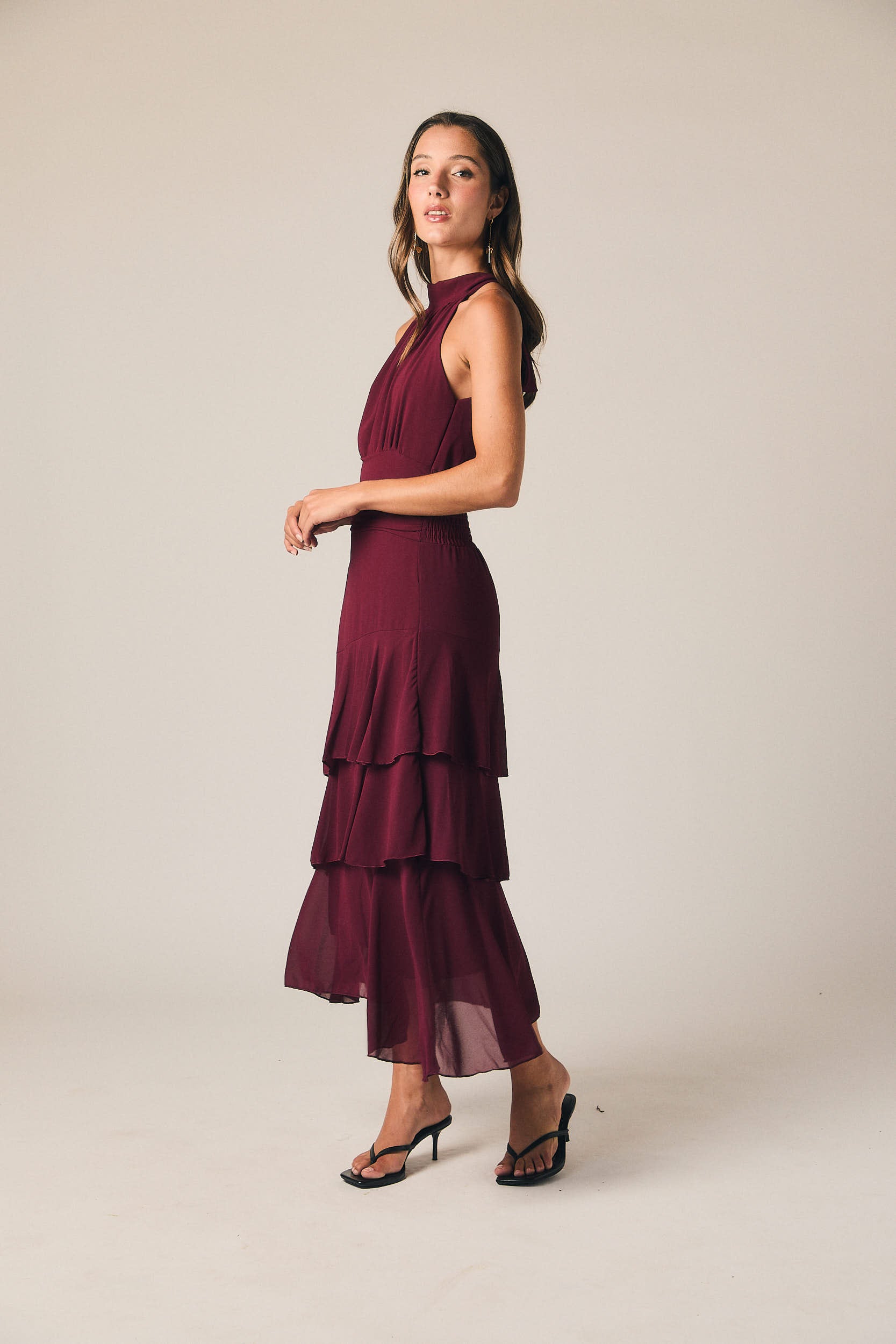 Vestido midi en tono granate con escote halter y cuello cerrado. Cuerpo con ligero frunce frontal y cintura marcada con efecto fajín. Falda con capas superpuestas en corte asimétrico que aportan movimiento y ligereza. Espalda con detalle elástico tipo nido de abeja y cierre con lazada.