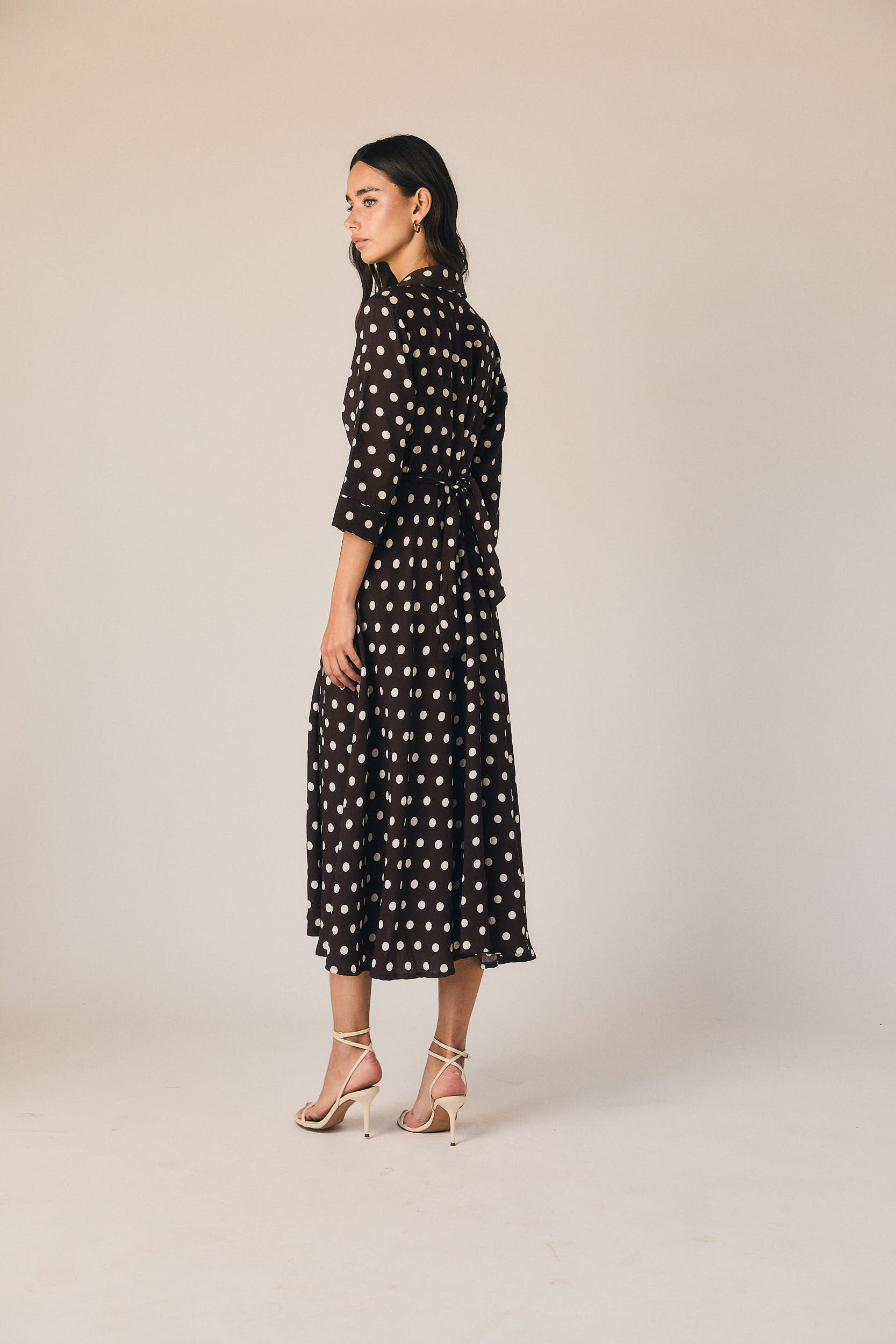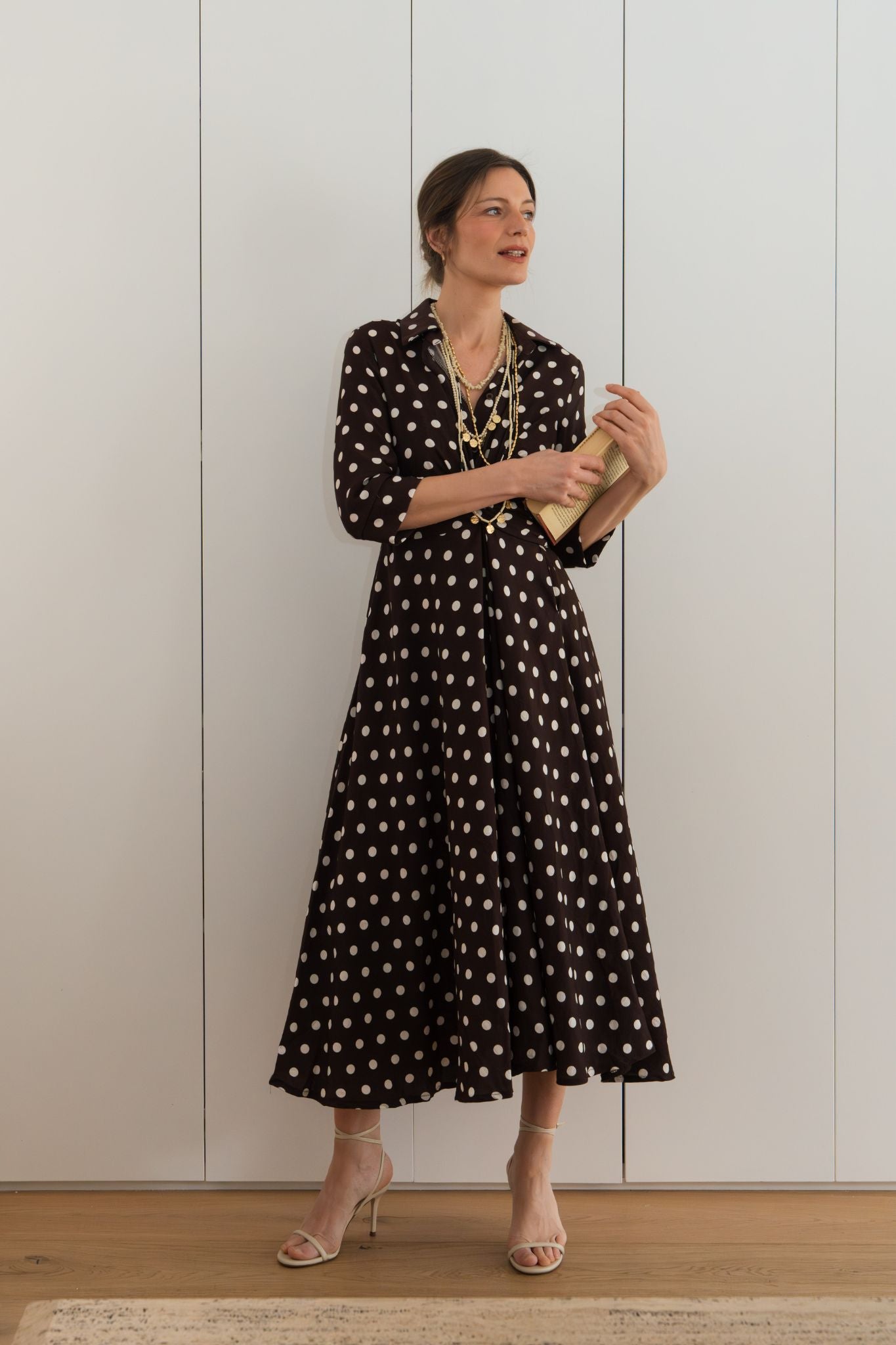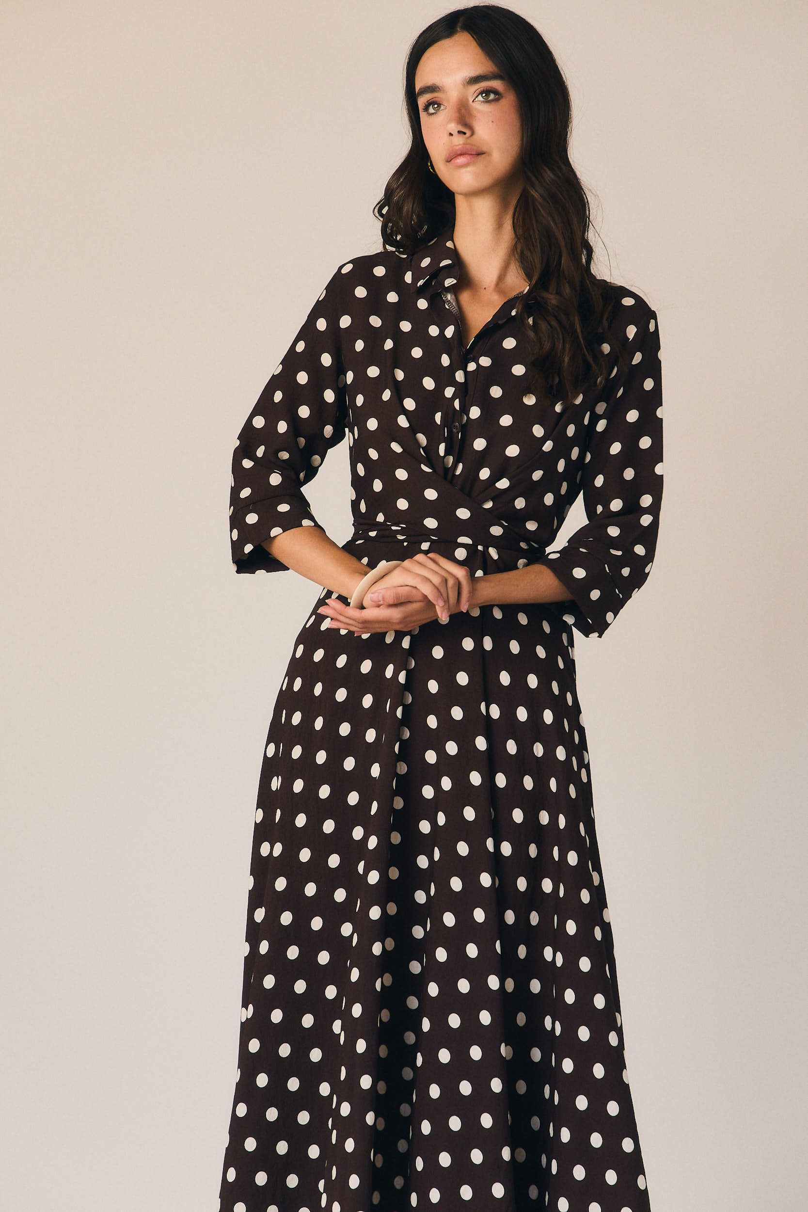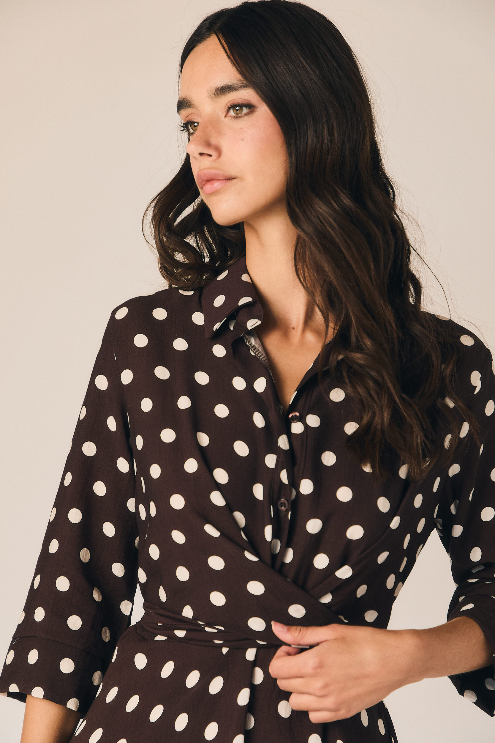 Vestido midi en color marrón con estampado de lunares en contraste. Diseño con escote camisero y cierre frontal de botones. Manga tres cuartos con puño amplio y detalle de lazada en cintura que permite ajustar la silueta. Falda con caída fluida y movimiento.