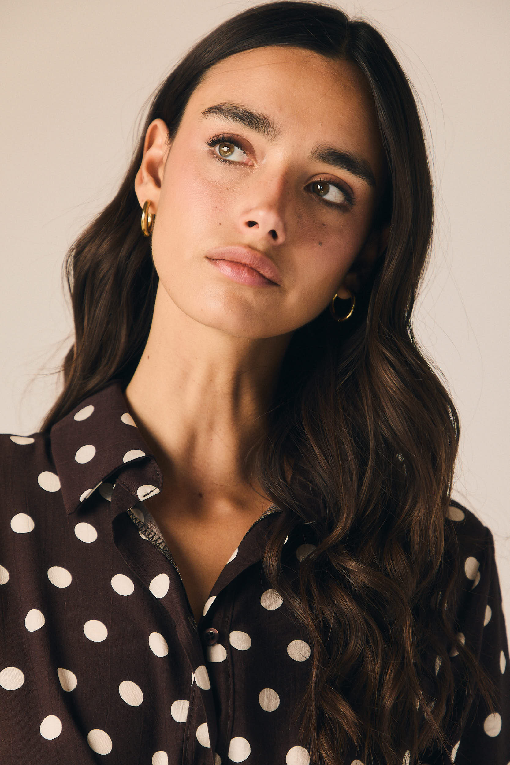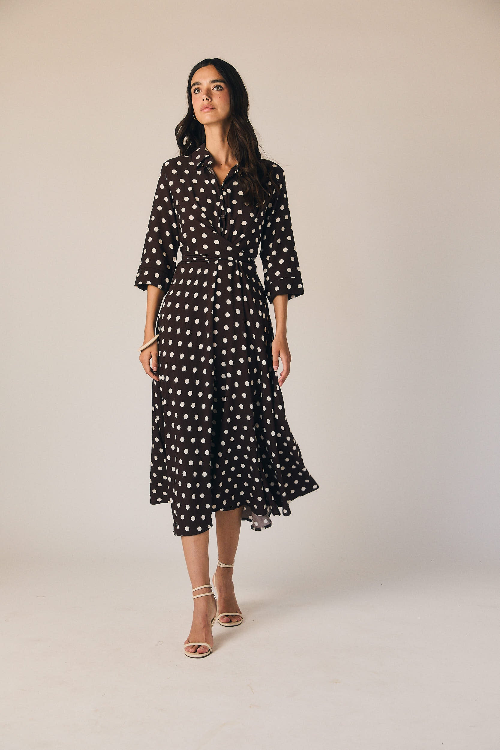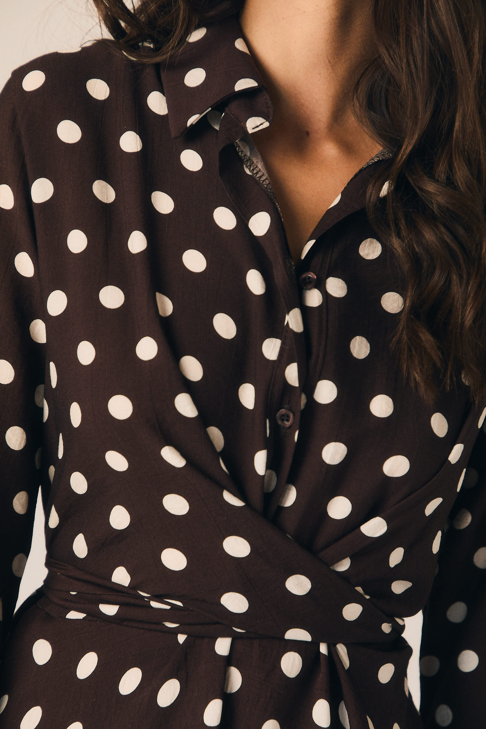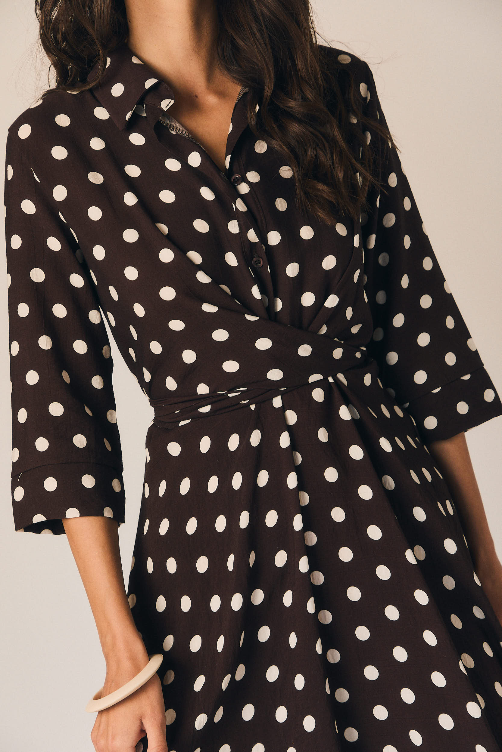 Vestido midi en color marrón con estampado de lunares en contraste. Diseño con escote camisero y cierre frontal de botones. Manga tres cuartos con puño amplio y detalle de lazada en cintura que permite ajustar la silueta. Falda con caída fluida y movimiento.
