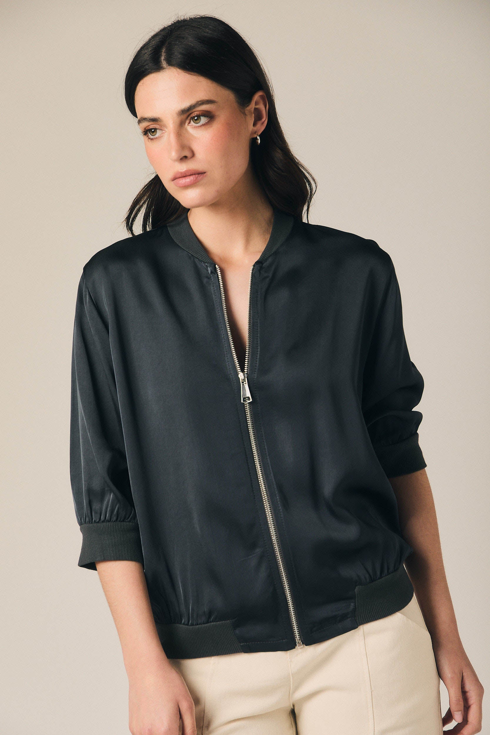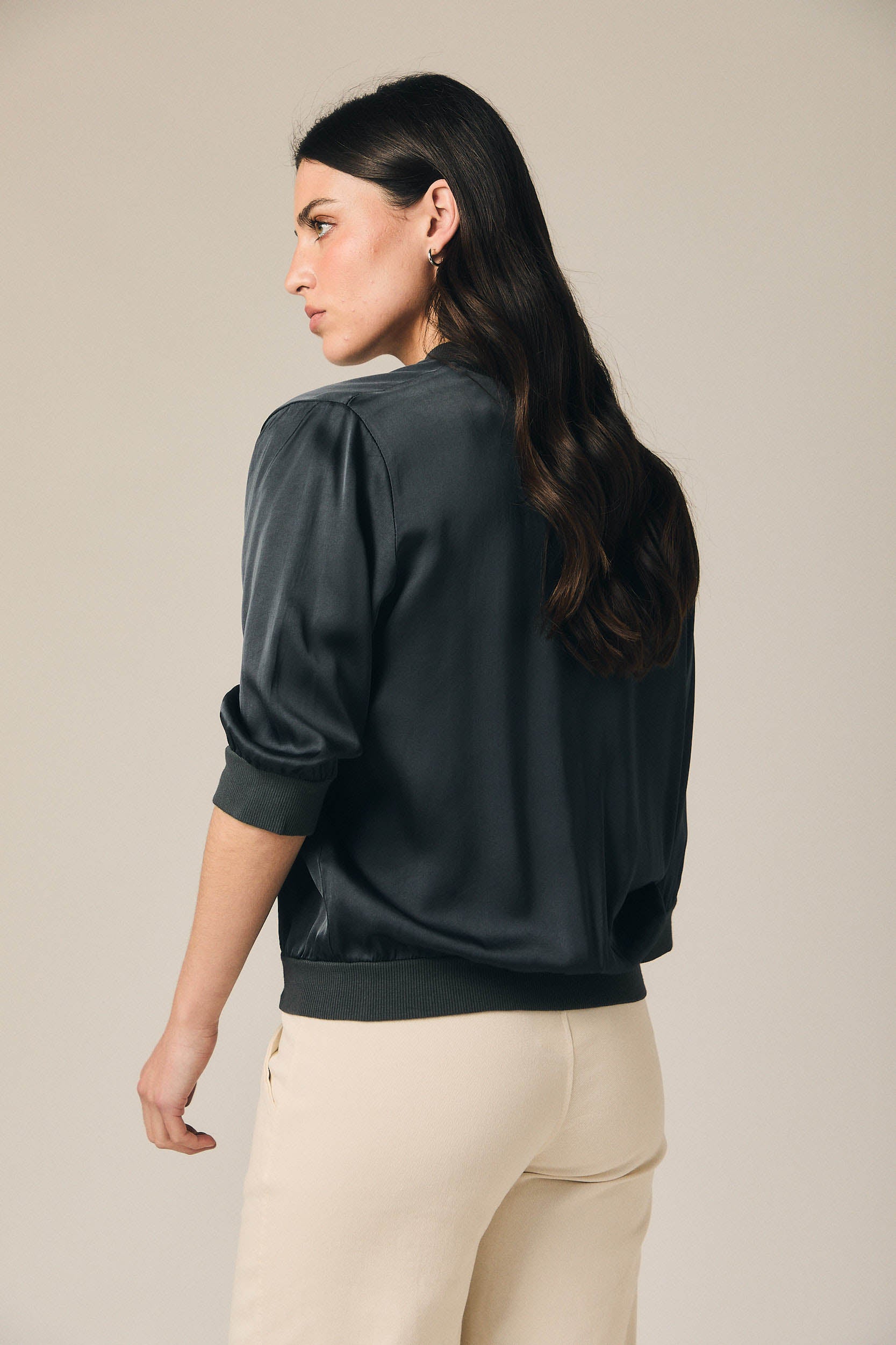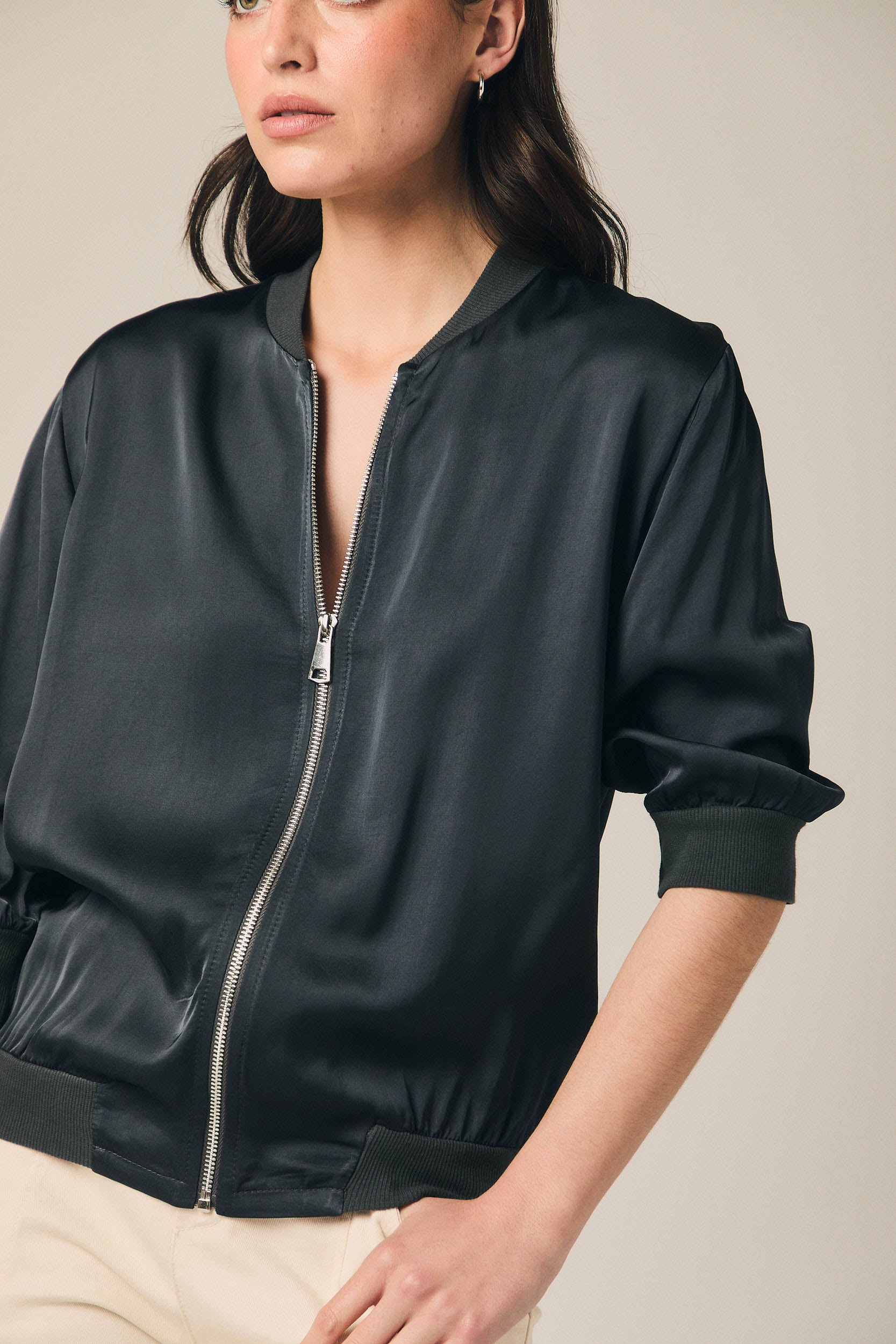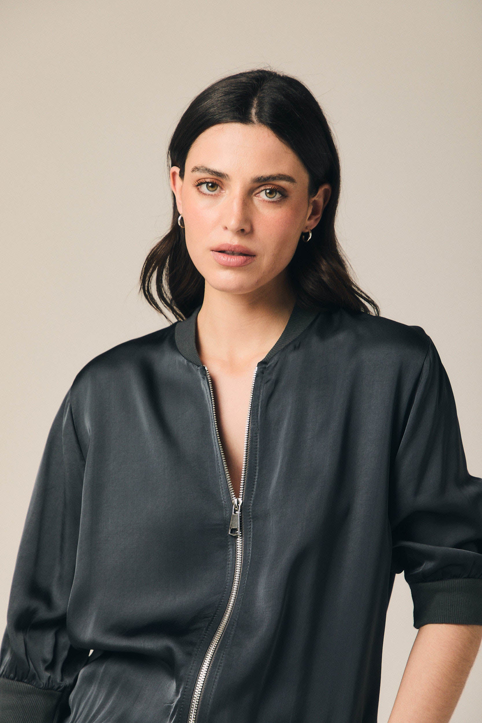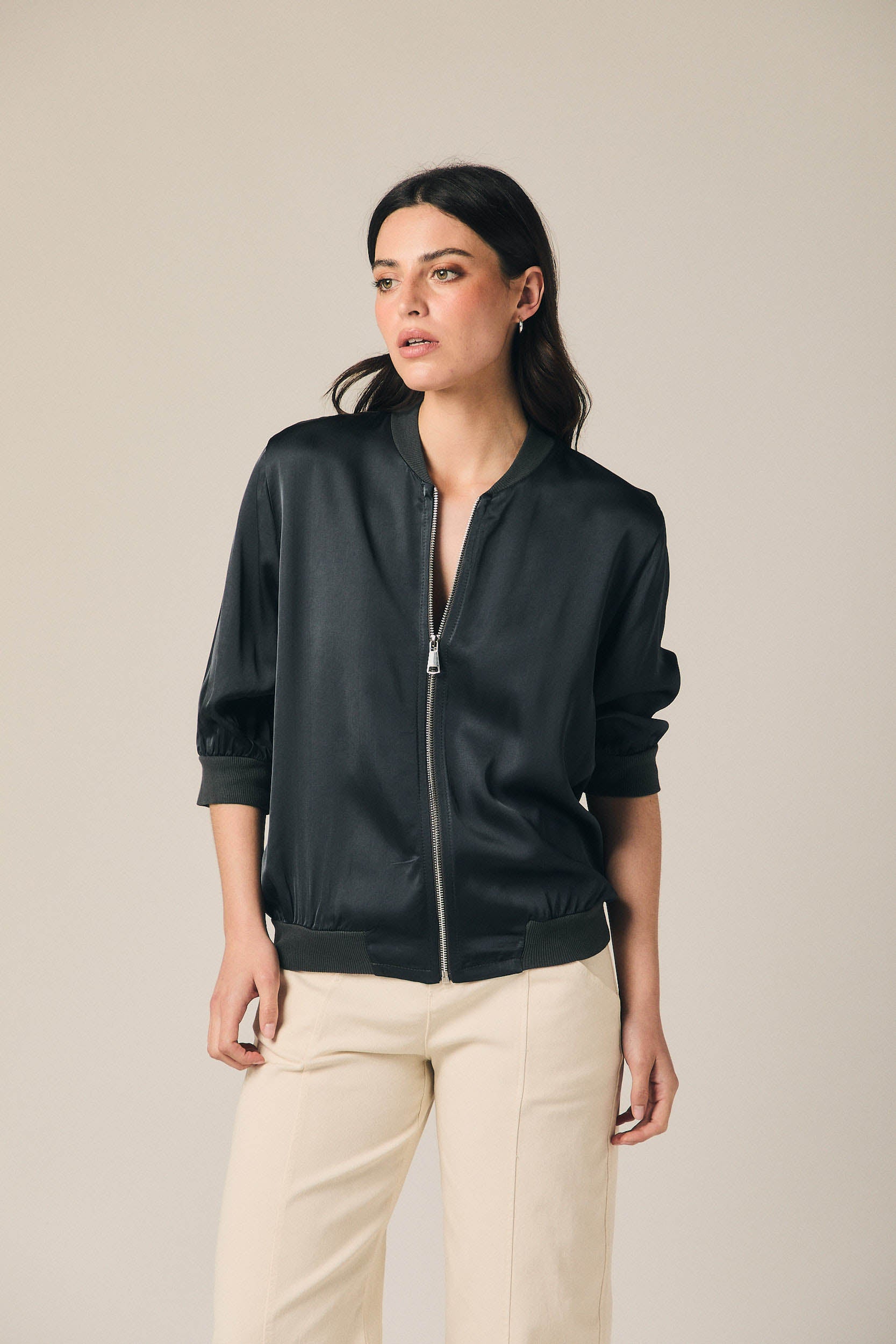 Chaqueta bomber de mujer en color gris antracita con acabado satinado y cierre frontal de cremallera. Presenta cuello redondo, manga francesa ligeramente abullonada y puños elásticos que aportan estructura. El bajo incorpora ribete ajustado que define la silueta y equilibra su caída fluida.