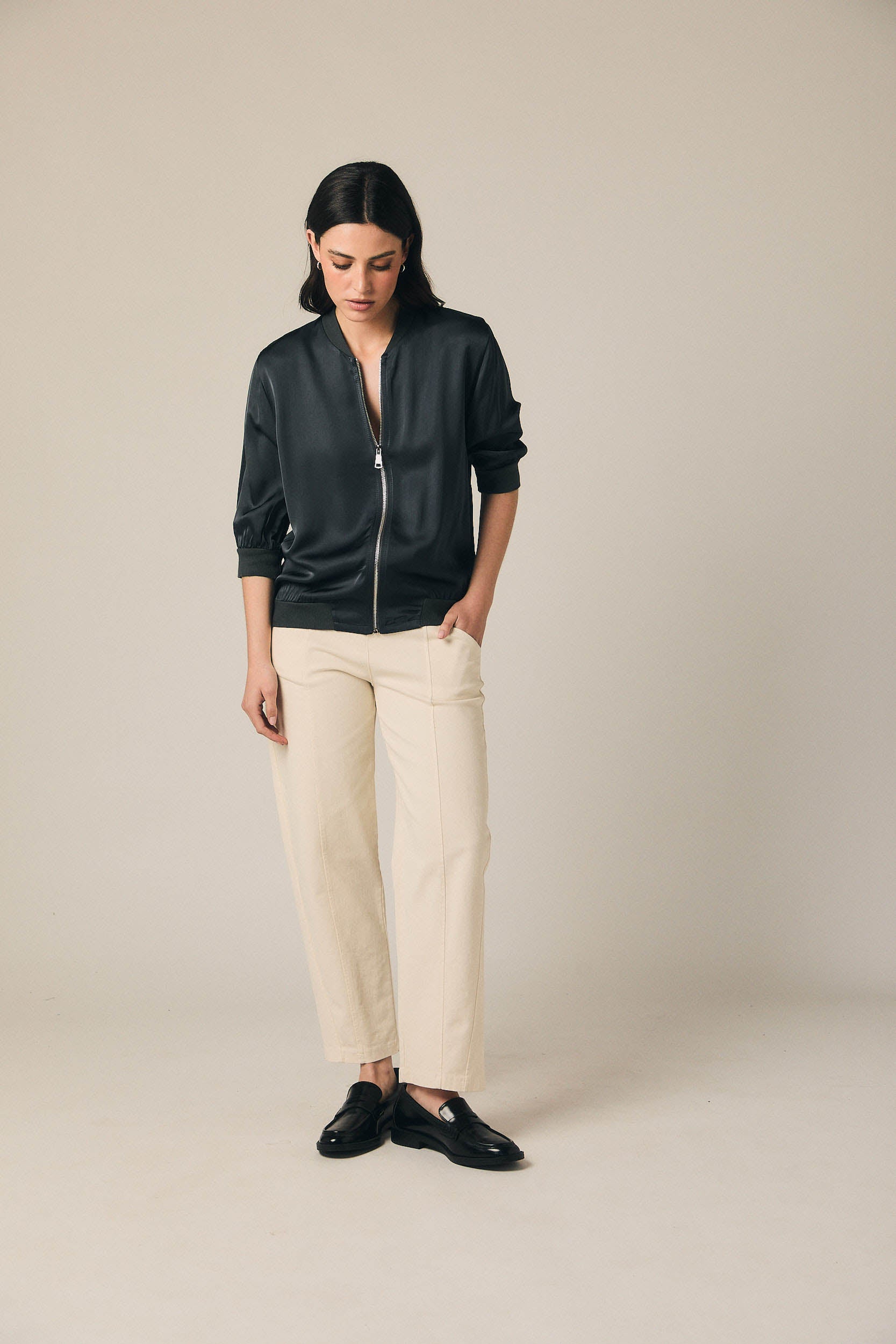 Perfecta para combinar con jeans wide leg y camiseta básica para un look urbano, o sobre vestidos y pantalones de vestir para aportar un punto actual. Una bomber ligera pensada para entretiempo y para sumar estilo a looks neutros.