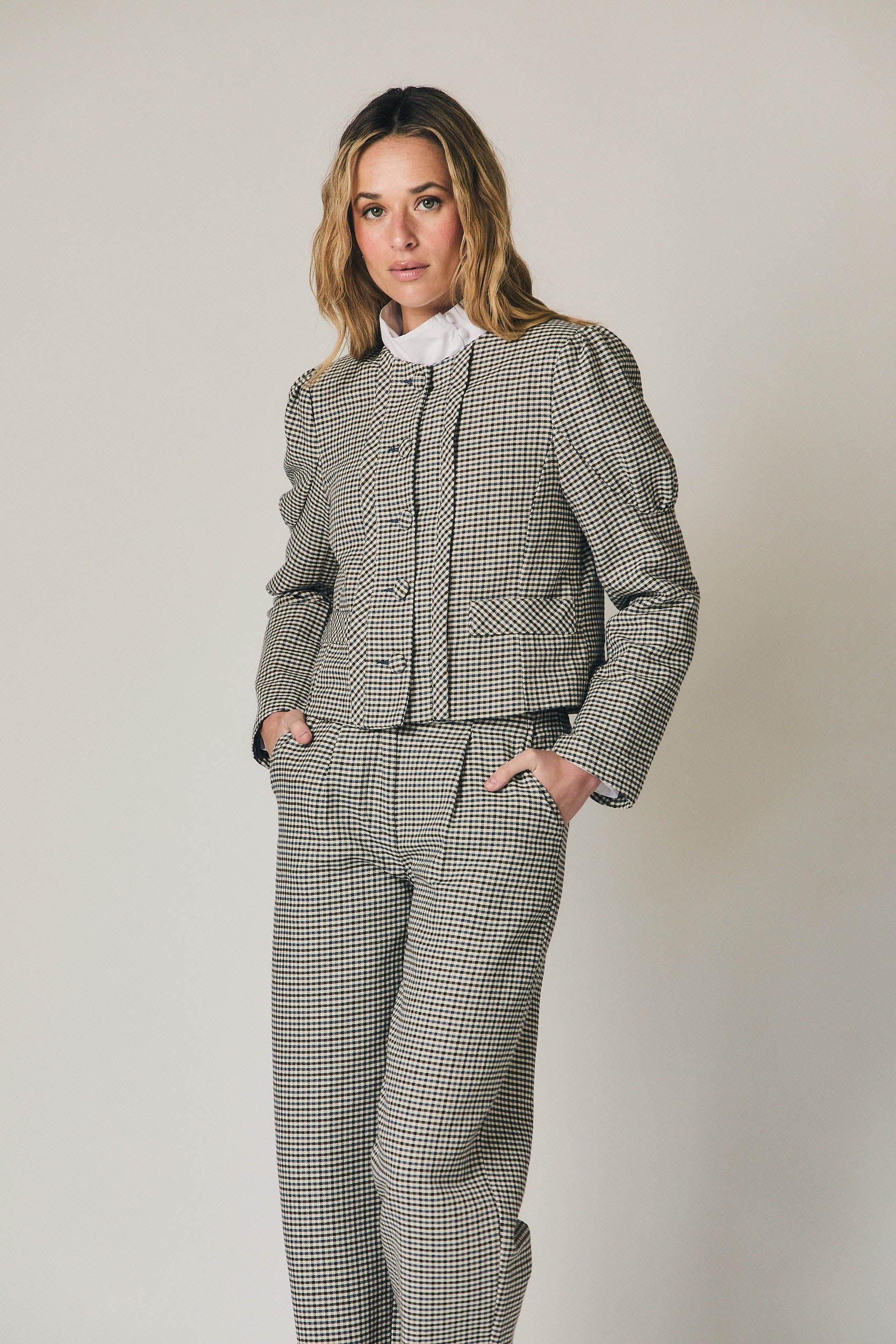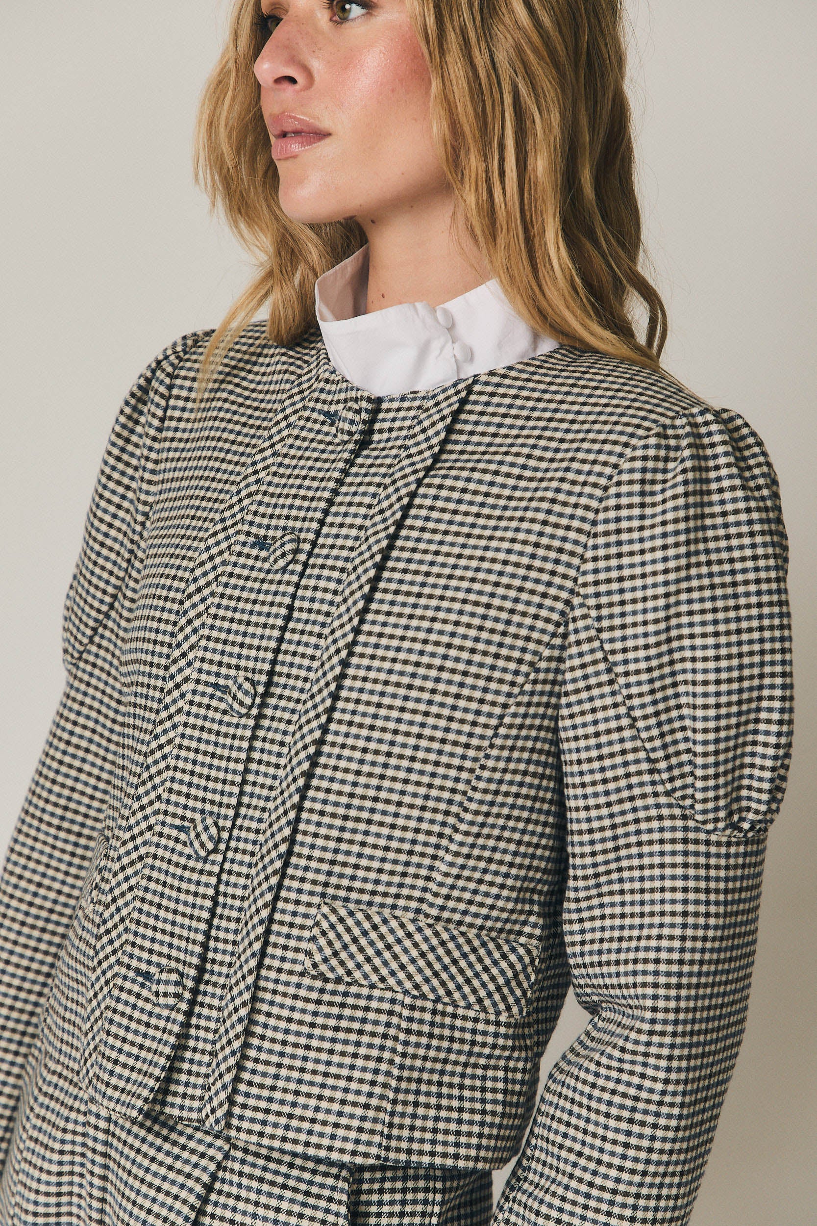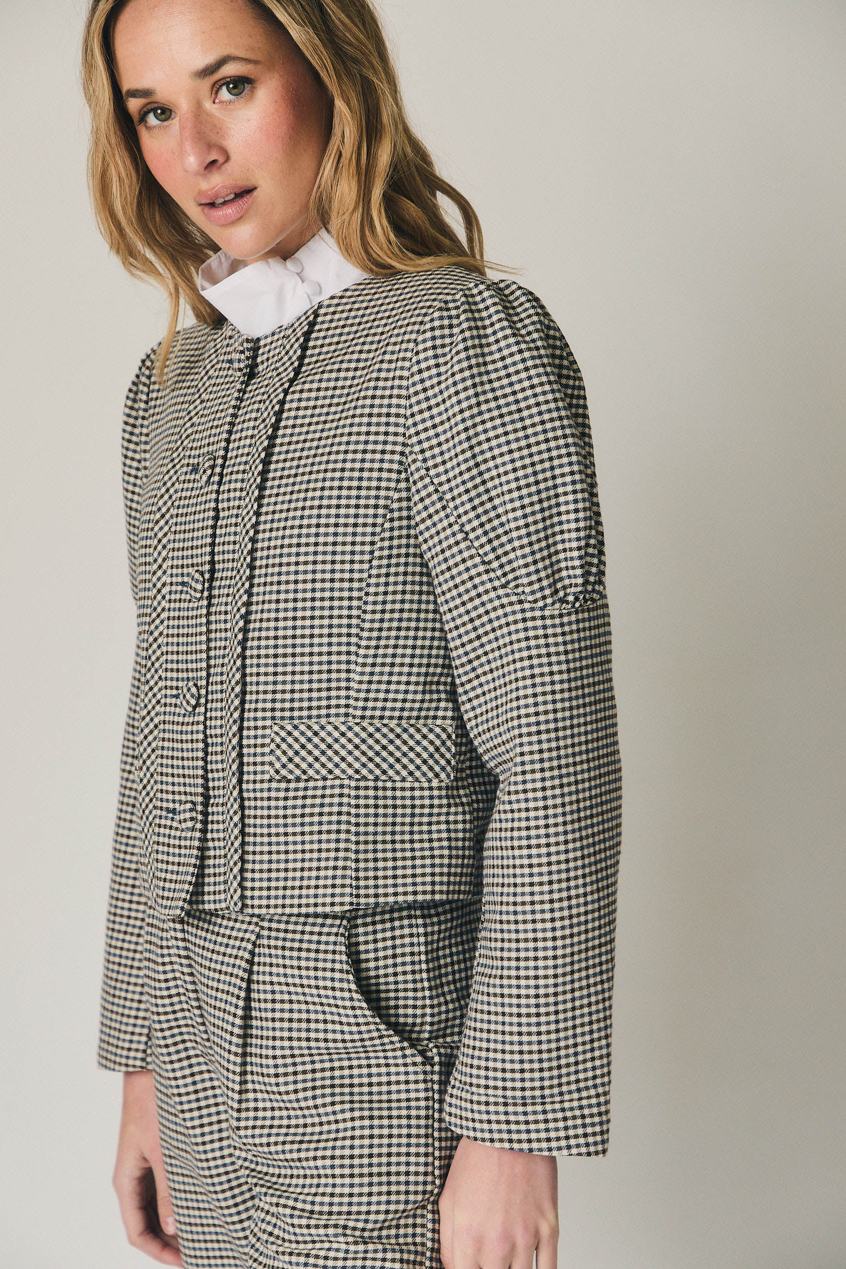 Chaqueta corta con estampado de cuadros en tono azul marino y crudo. Diseño estructurado con cuello redondo, cierre frontal con botones vistos y bolsillos de parche integrados. Las mangas largas presentan un ligero volumen en el hombro que aporta forma sin perder limpieza en la silueta. Largo a la cintura, pensada para equilibrar el conjunto.