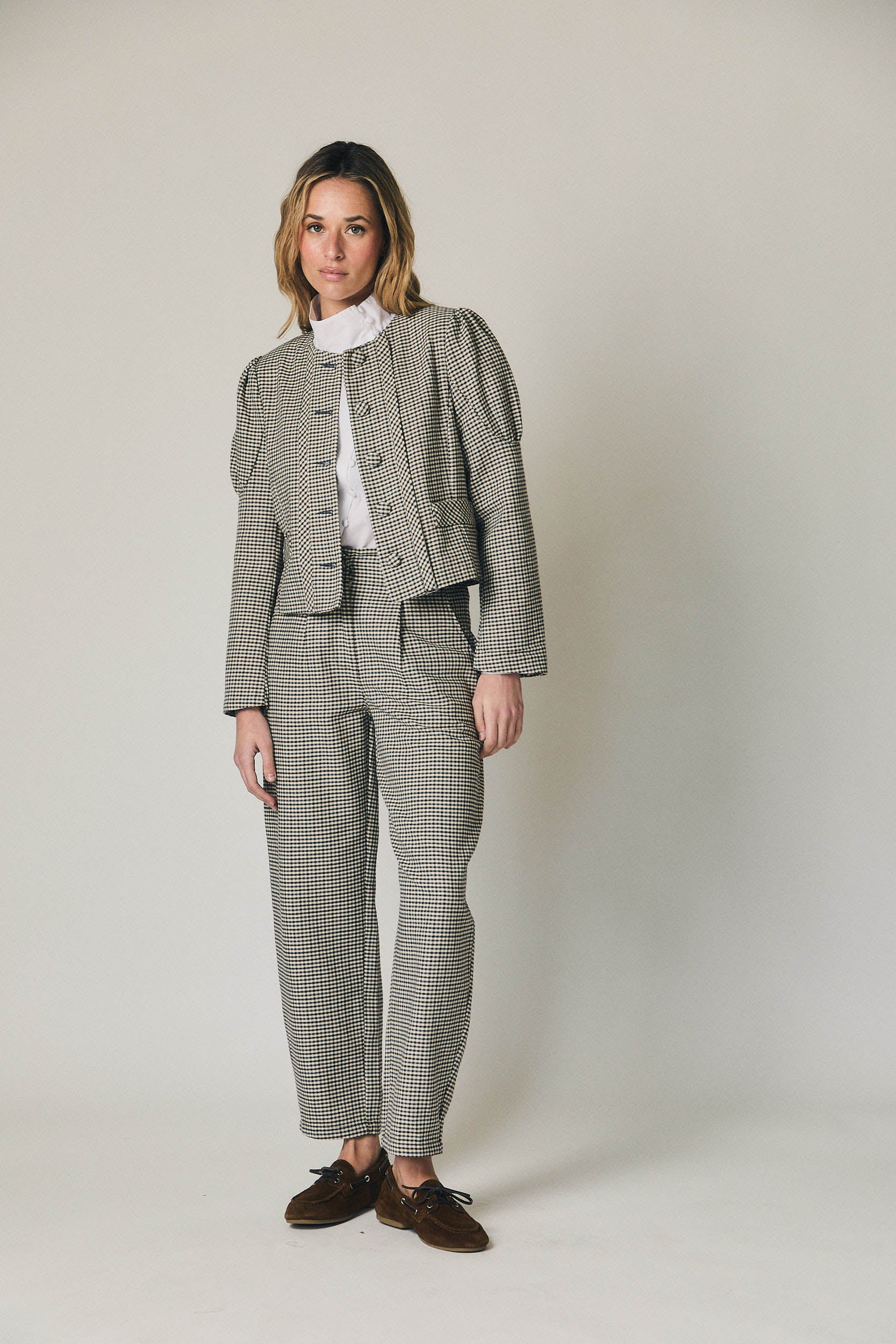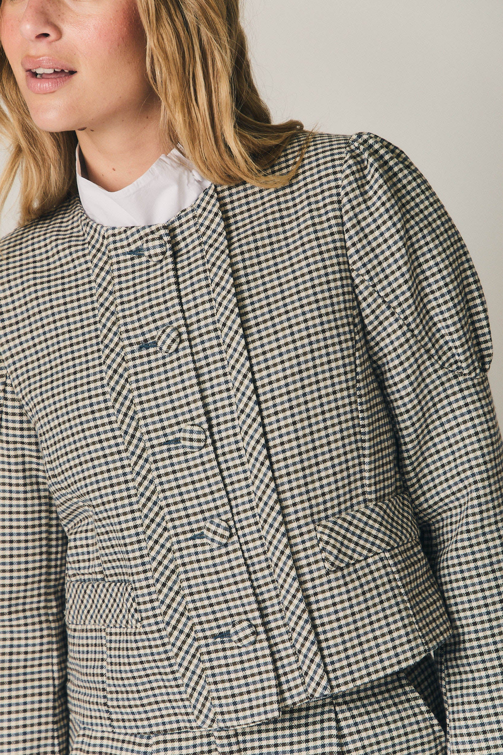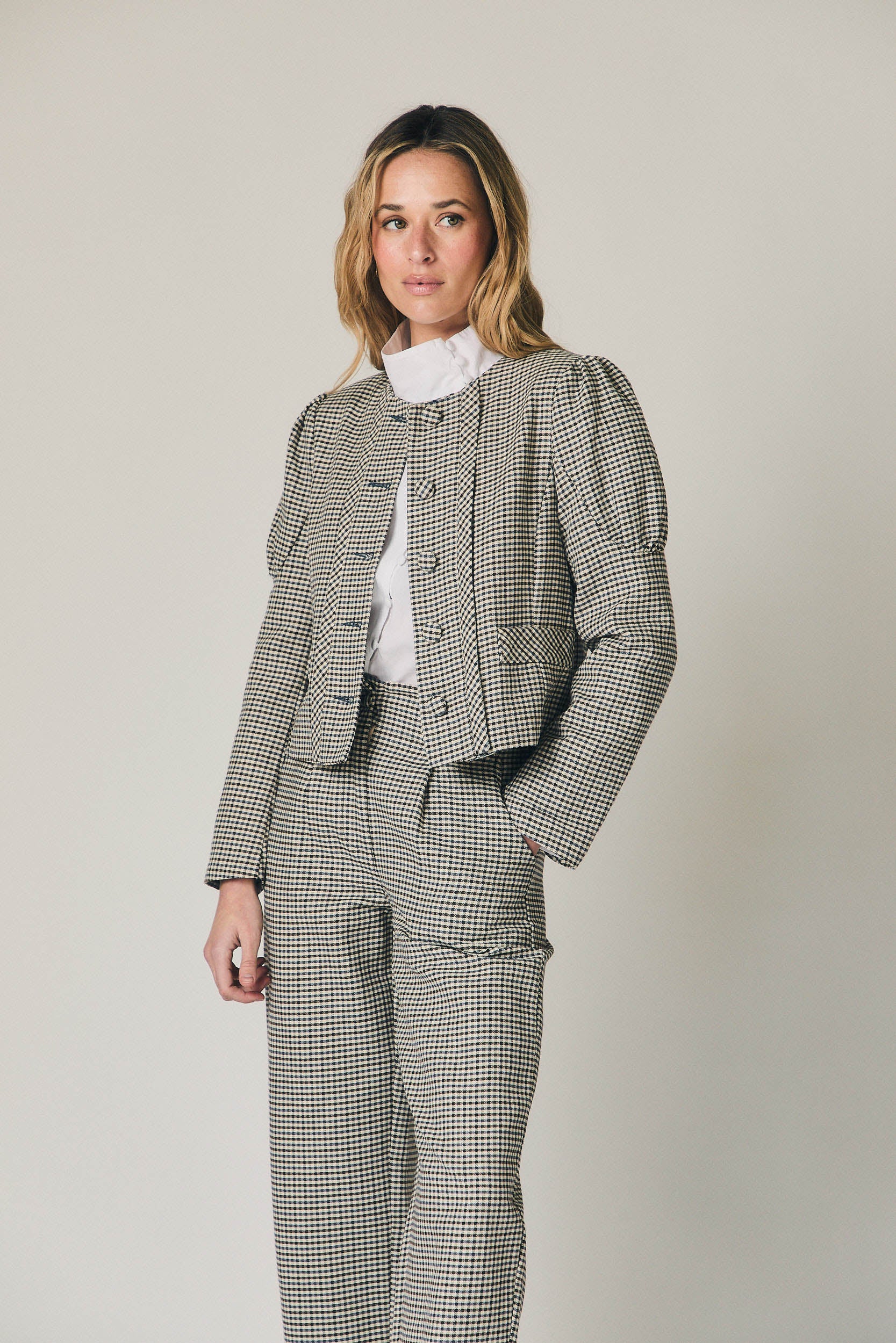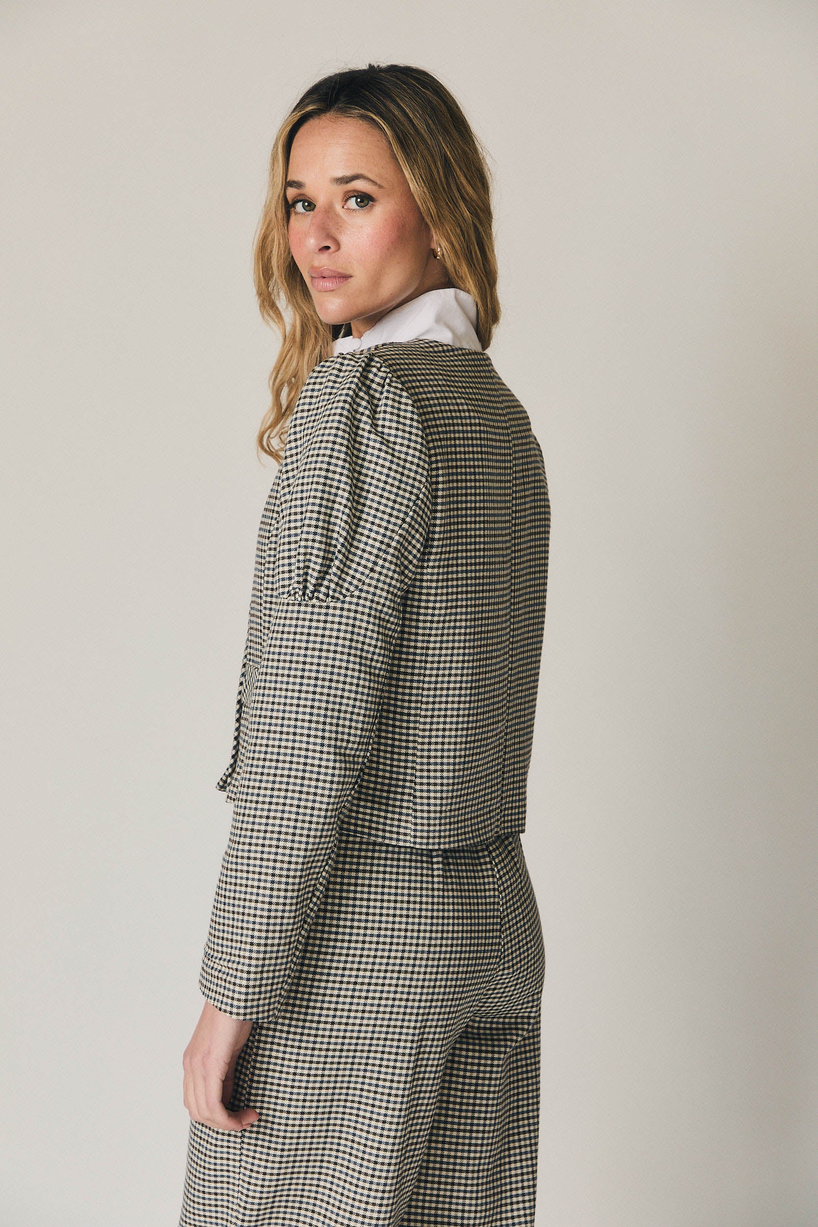Chaqueta corta con estampado de cuadros en tono azul marino y crudo. Diseño estructurado con cuello redondo, cierre frontal con botones vistos y bolsillos de parche integrados. Las mangas largas presentan un ligero volumen en el hombro que aporta forma sin perder limpieza en la silueta. Largo a la cintura, pensada para equilibrar el conjunto.