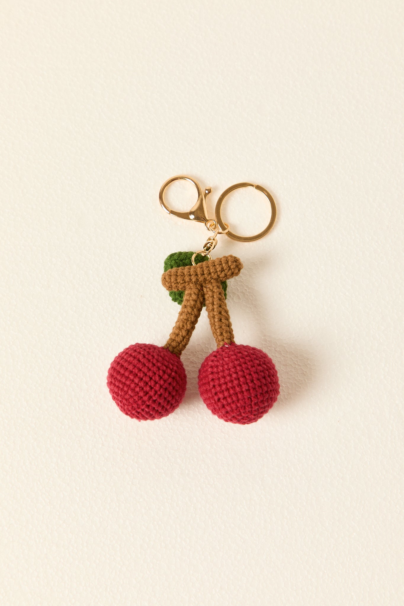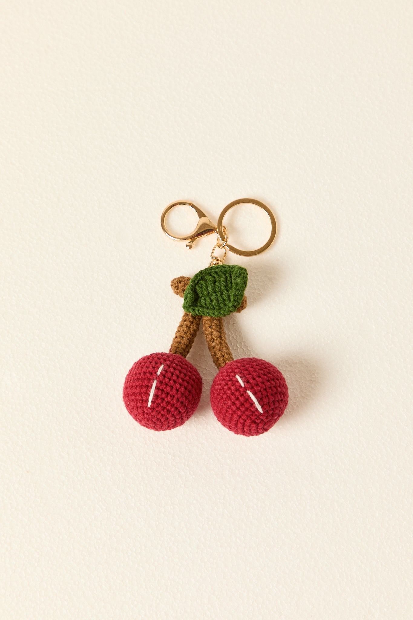 Charm de ganchillo con forma de cereza doble en tono burdeos. Diseño redondeado con bordados en azul claro que simulan reflejos, tallo en marrón y hoja verde tejida. Incluye anilla y mosquetón metálico dorado para una sujeción práctica en bolsos, llaves o mochilas.