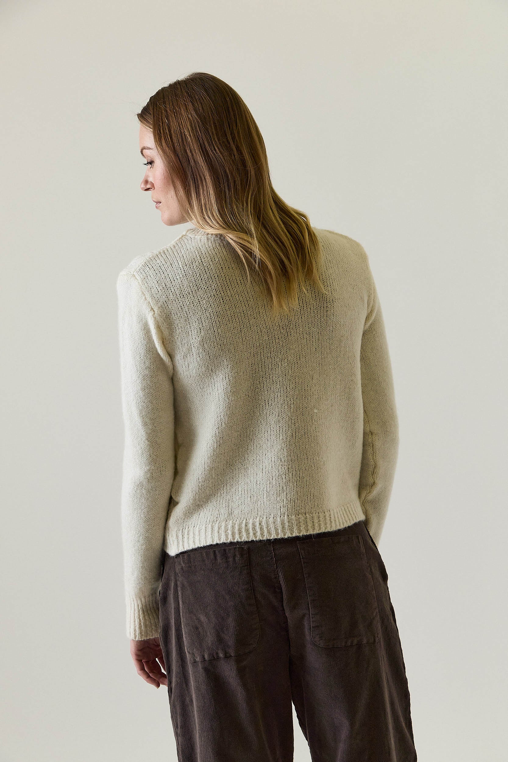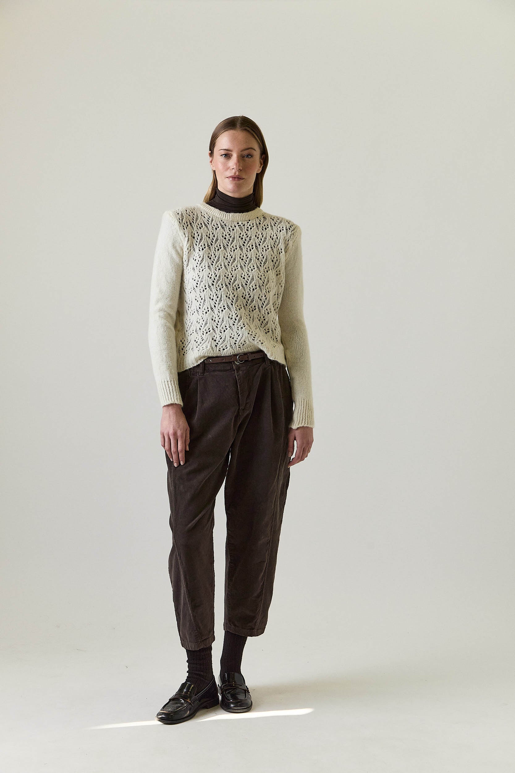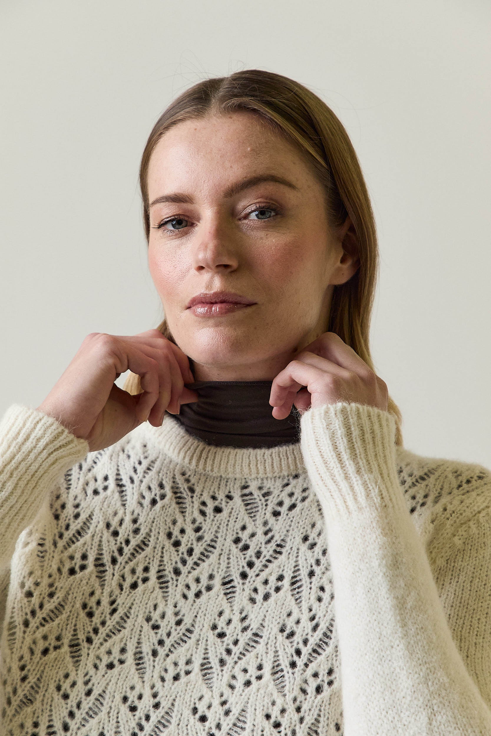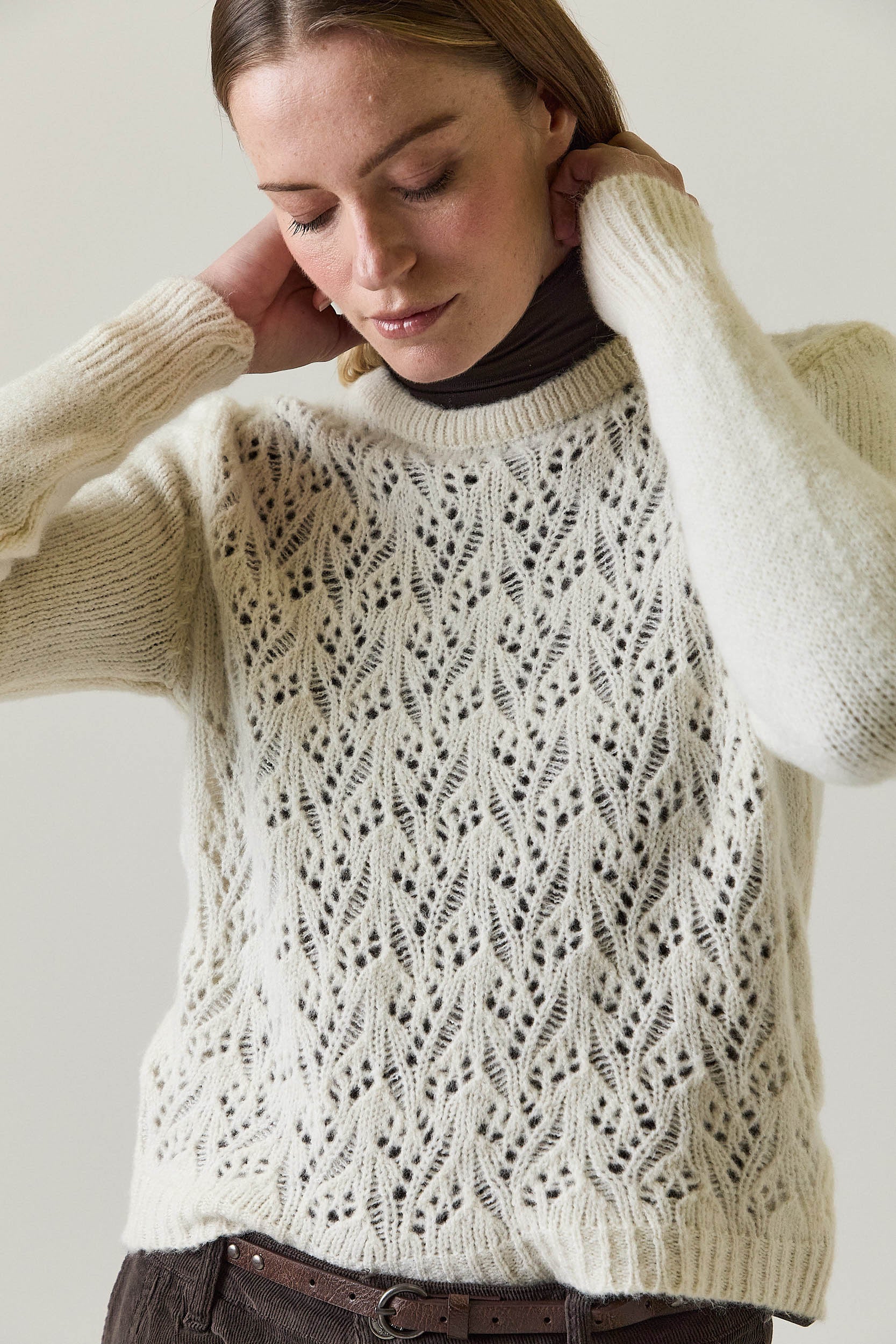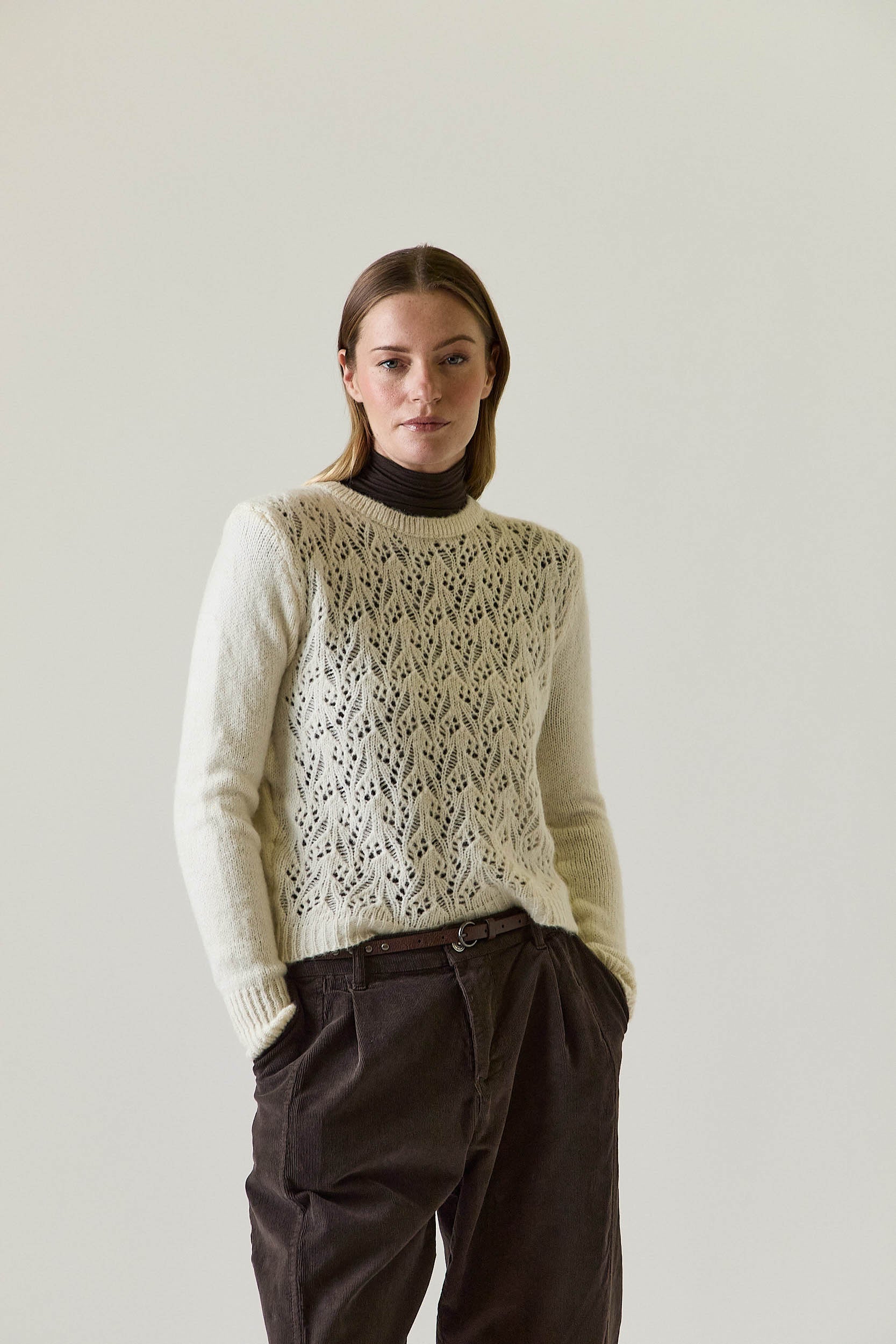 Jersey de punto en tono crudo con diseño calado geométrico en la parte frontal. Presenta cuello redondo, manga larga y remates de canalé en puños y bajo para aportar estructura. La espalda es lisa, creando un contraste suave y muy favorecedor.