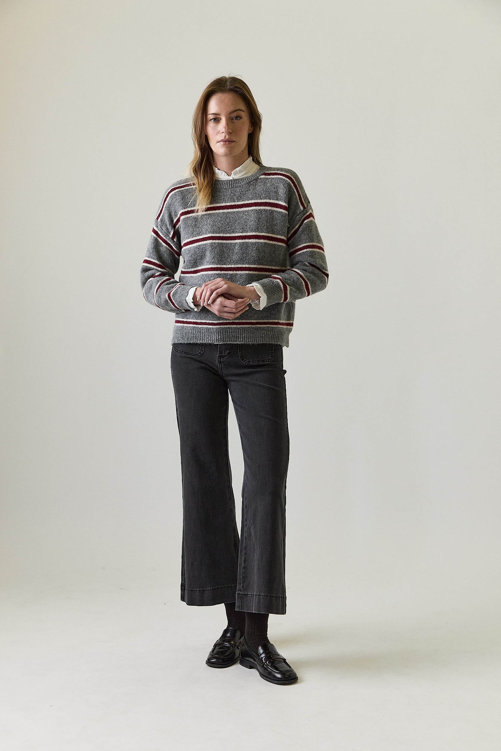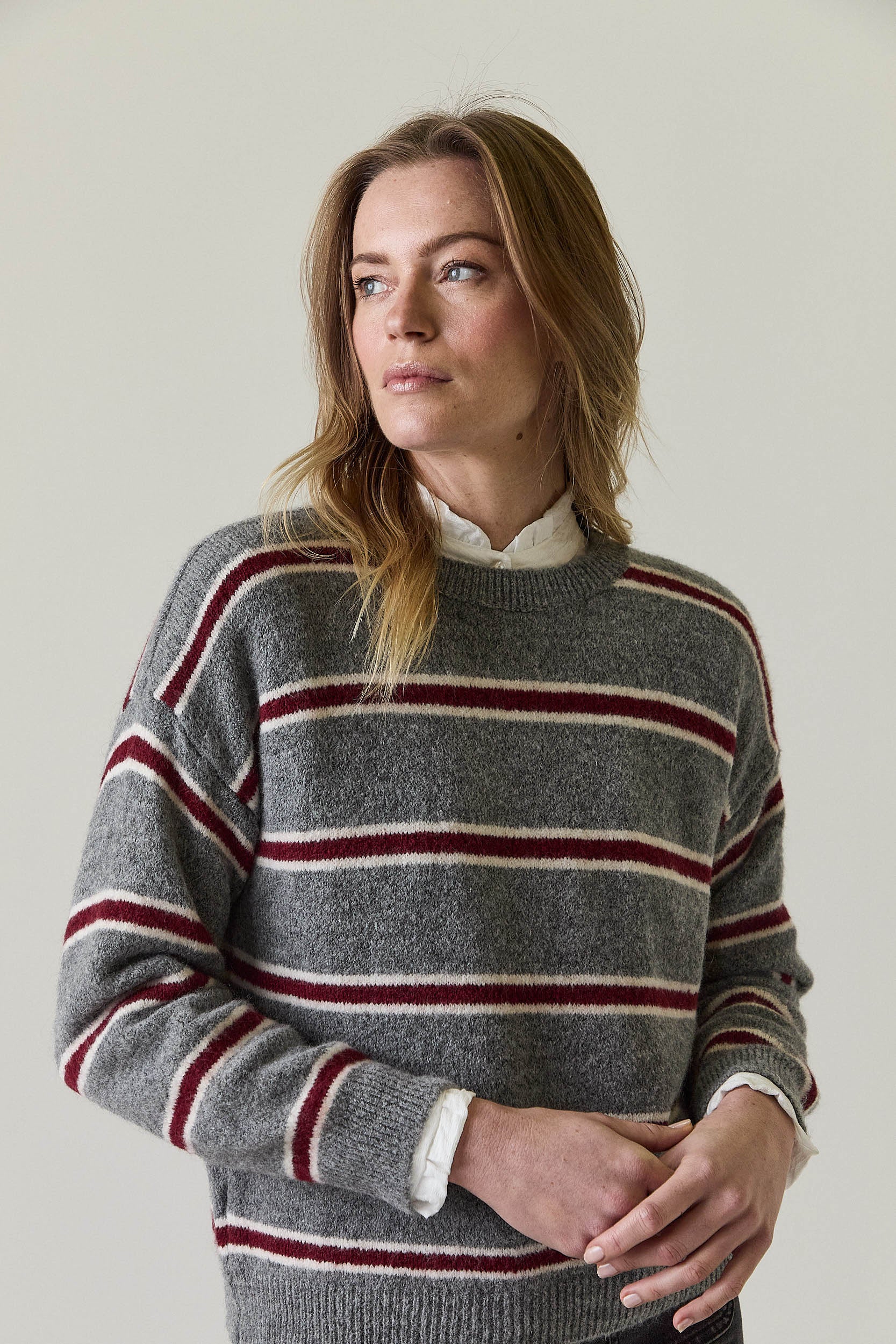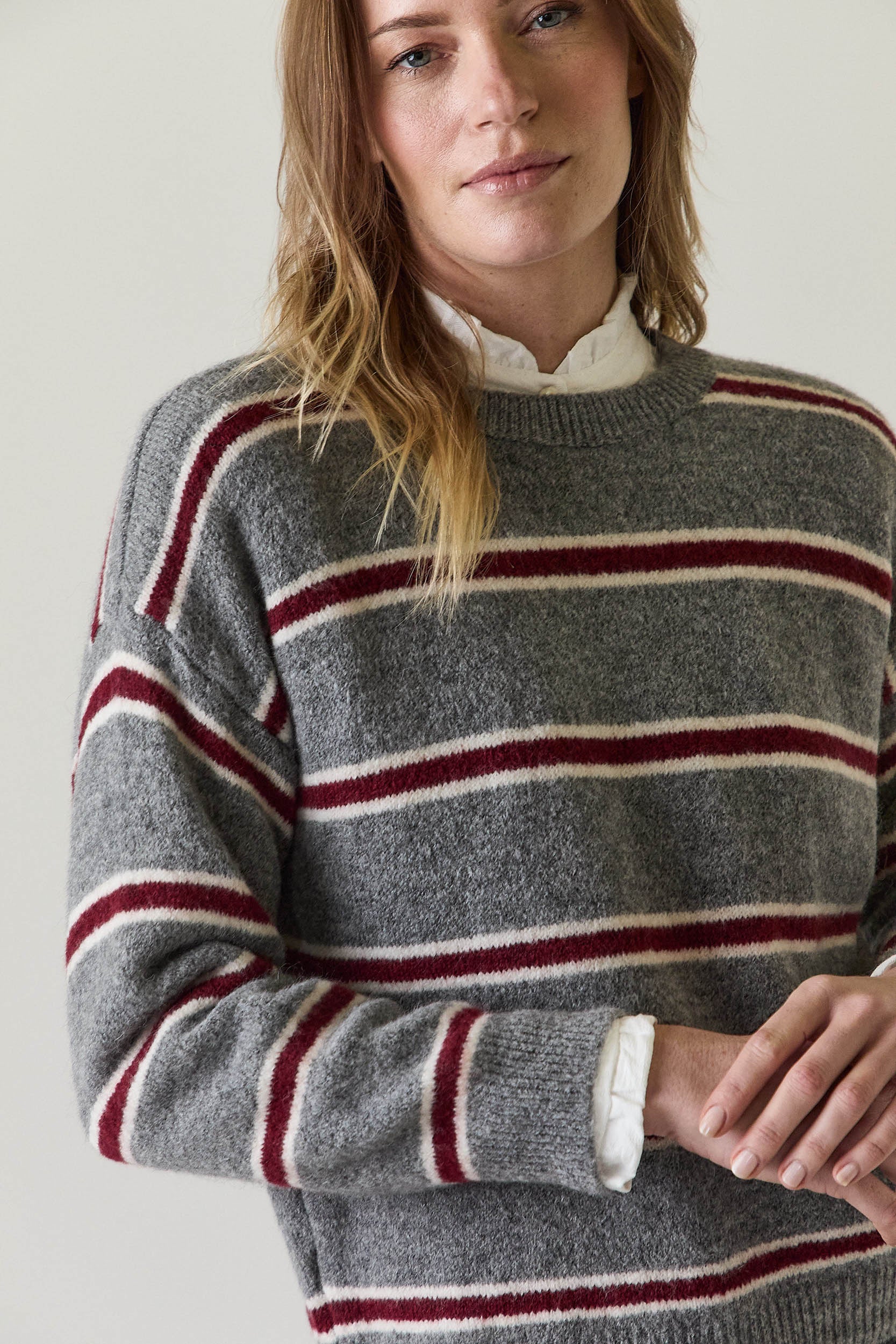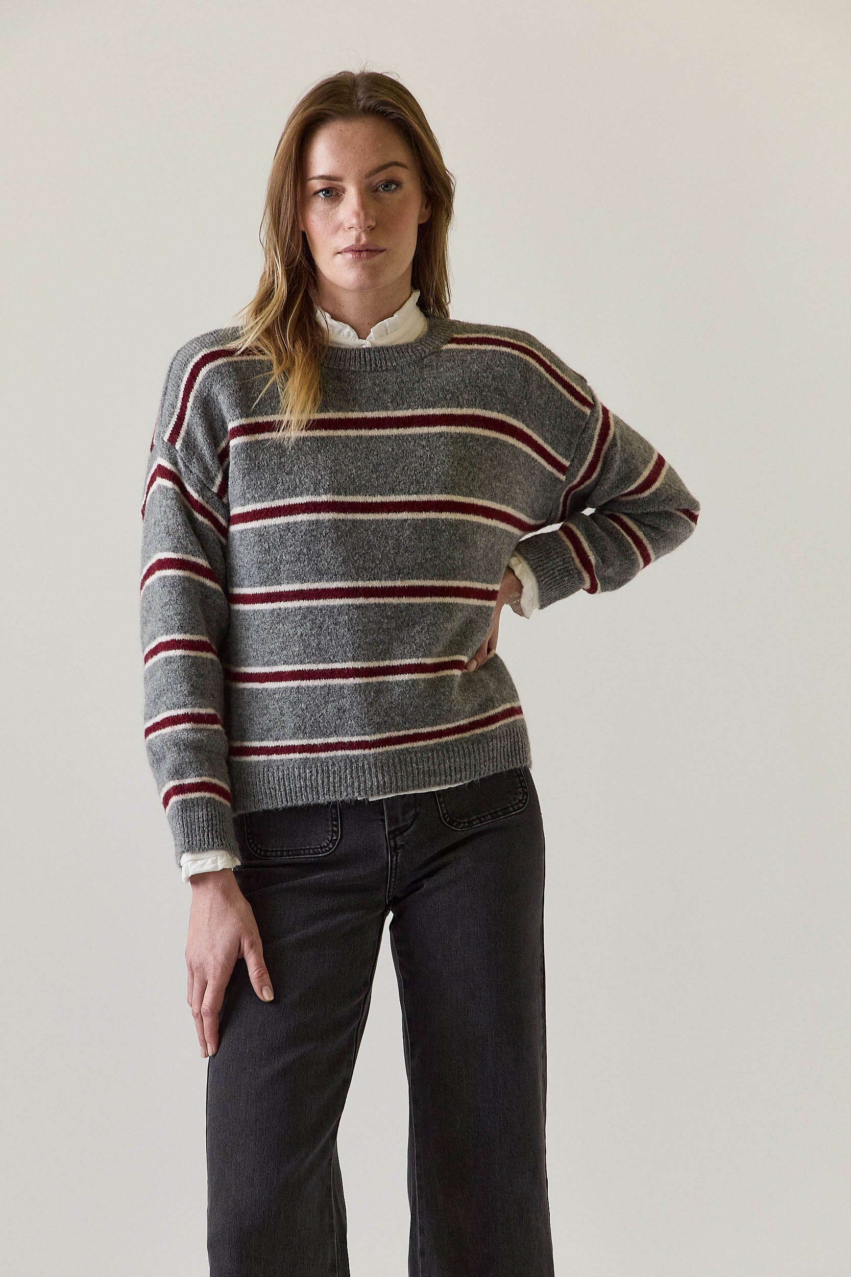 Jersey de punto en tono gris con estampado de rayas horizontales en contraste, combinando líneas en color vino y crudo. Presenta cuello redondo acanalado, manga larga y corte recto que aporta una caída natural y cómoda. Los ribetes en cuello, puños y bajo refuerzan la estructura del diseño.