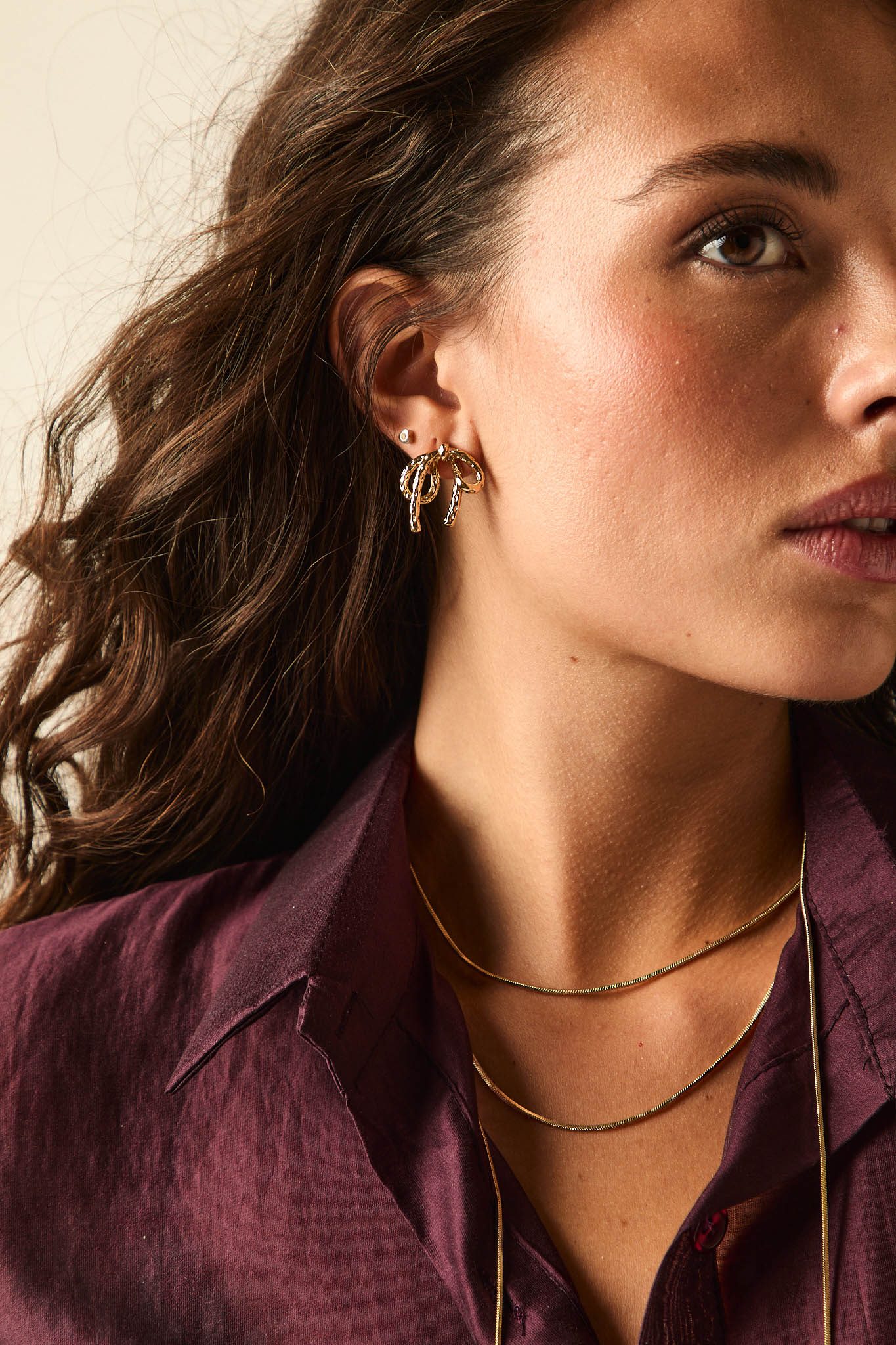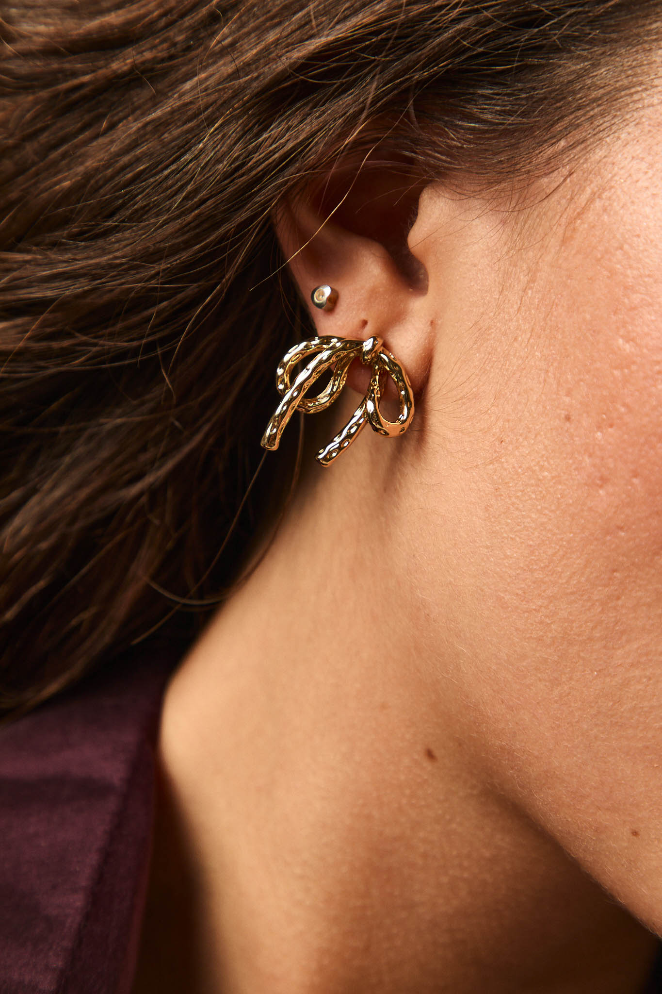 Pendientes dorados en forma de lazo con acabado texturizado. Su diseño pequeño y con volumen aporta un toque femenino y original, perfecto para dar luz y estilo a tus looks diarios o más especiales.