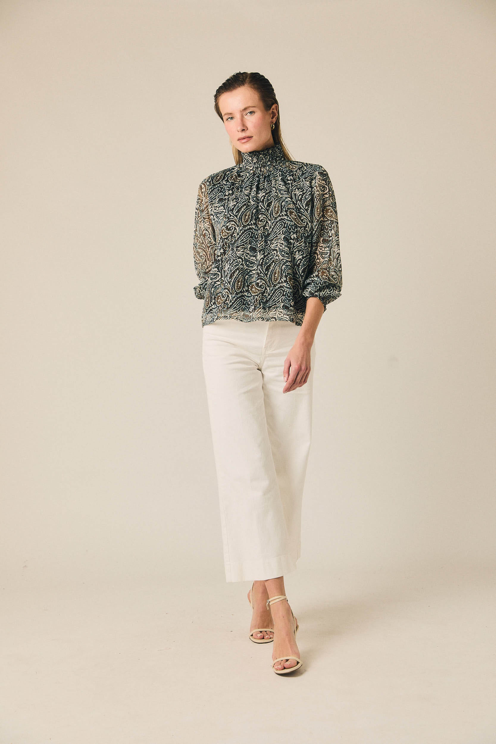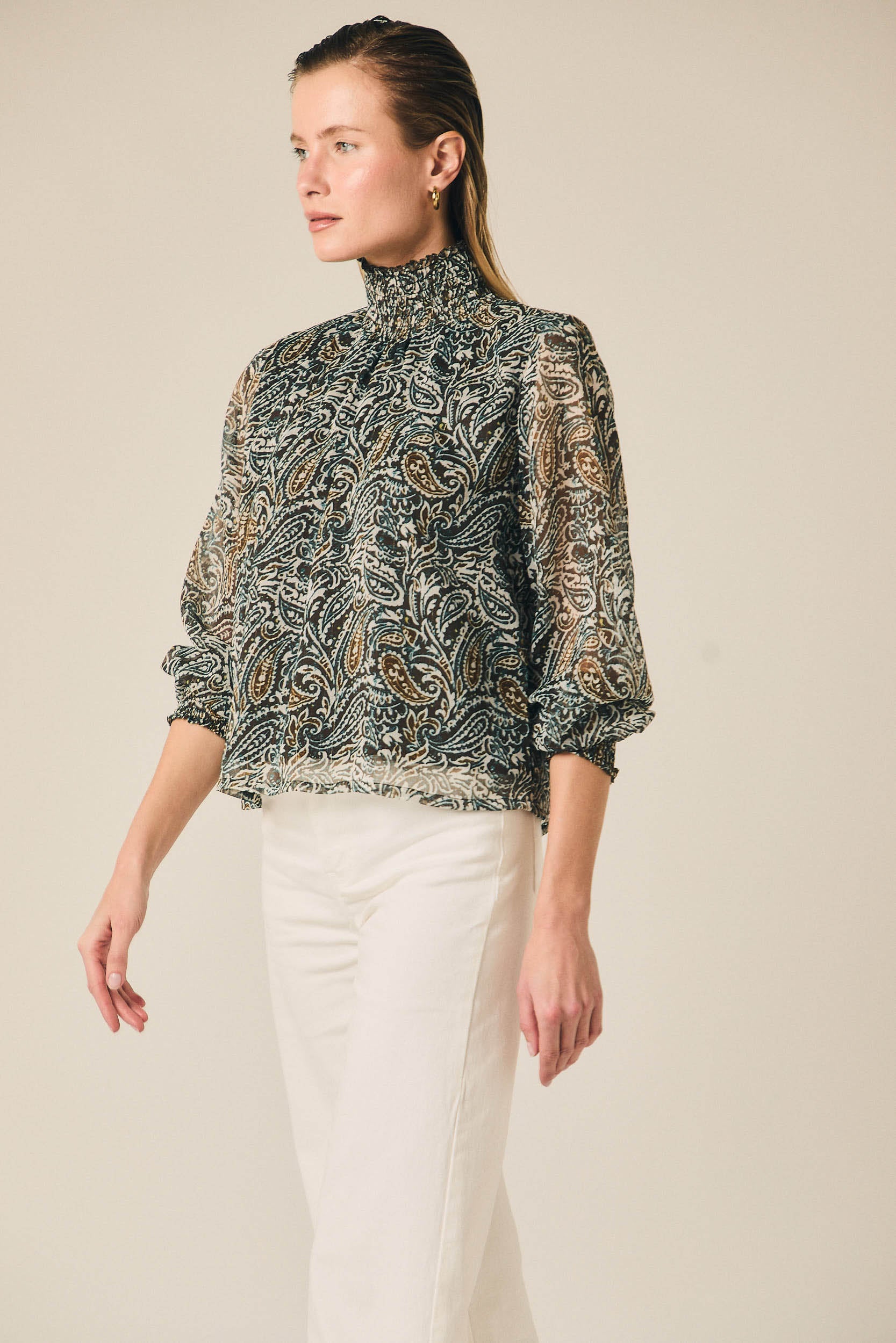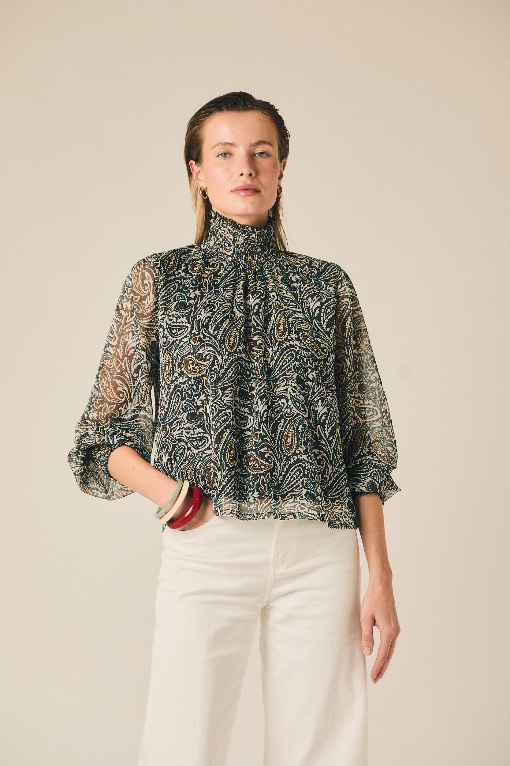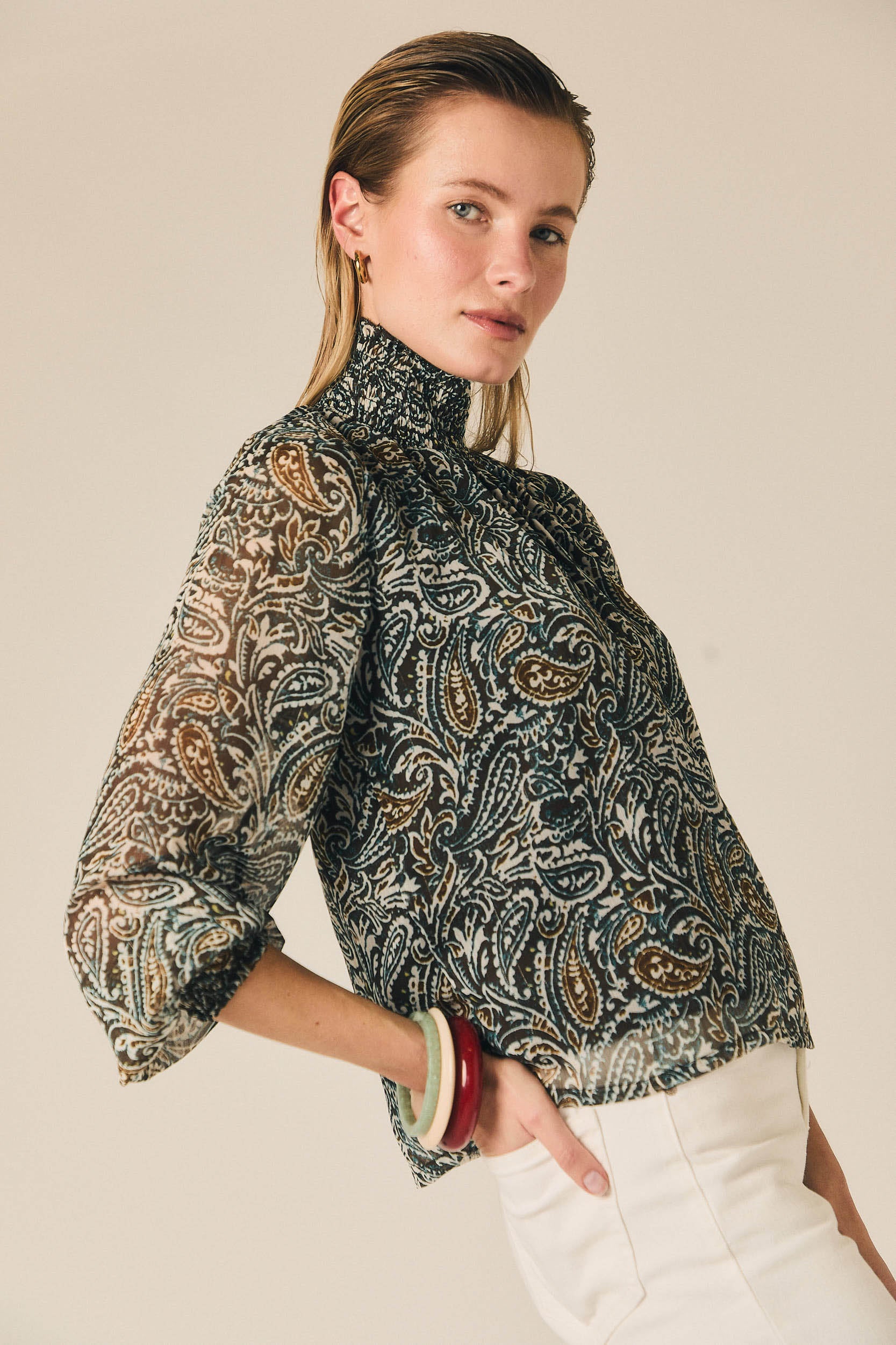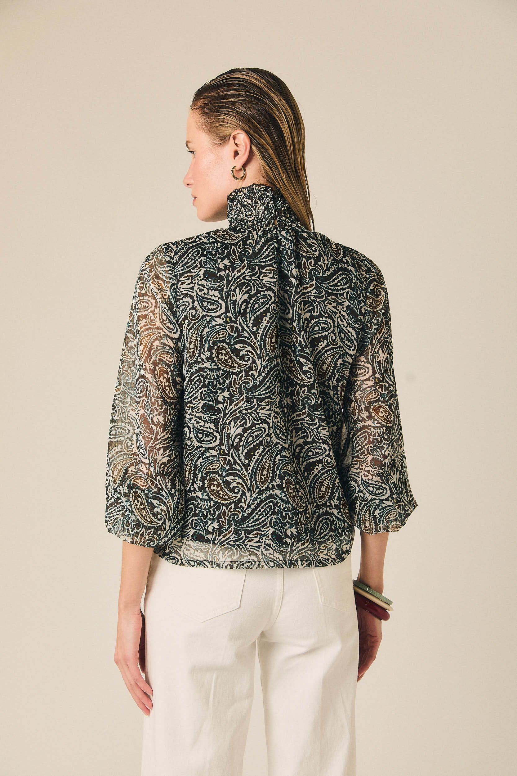 Blusa de tejido ligero con estampado paisley en tonos verdes, beige y marrón. Presenta cuello alto fruncido que enmarca el escote y mangas largas semitransparentes con puño elástico. El corte recto y el tejido fluido aportan movimiento al diseño.
