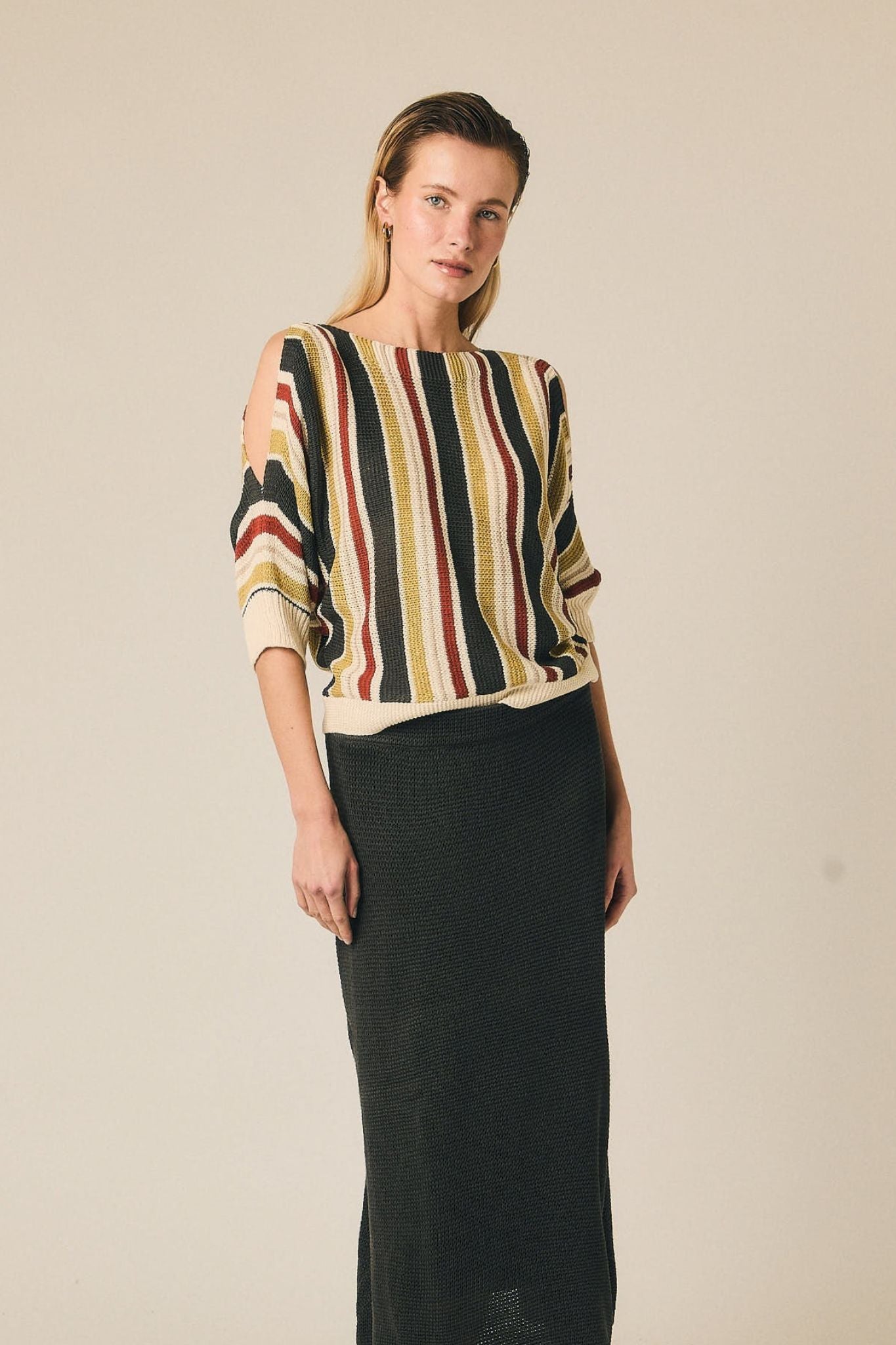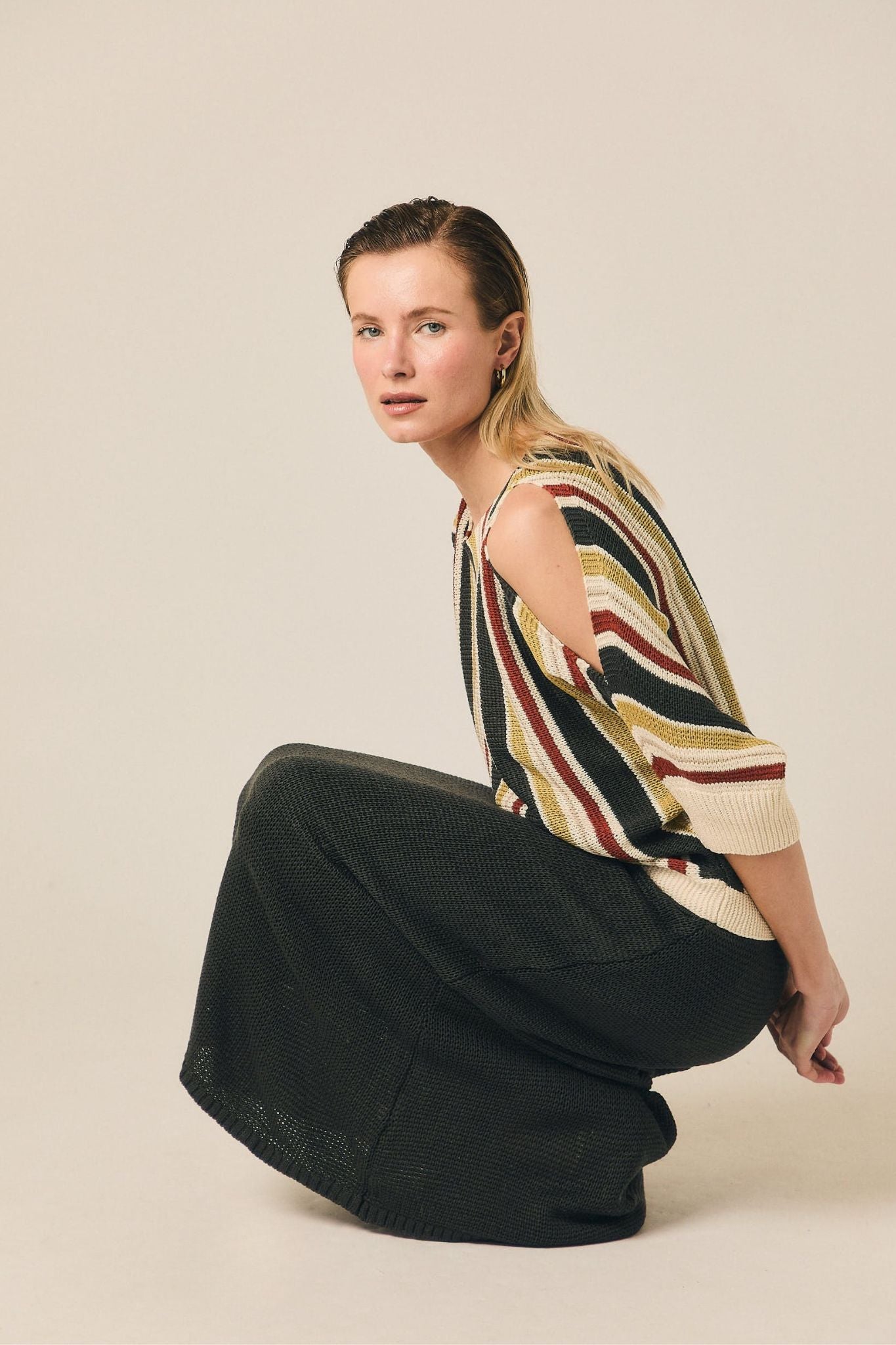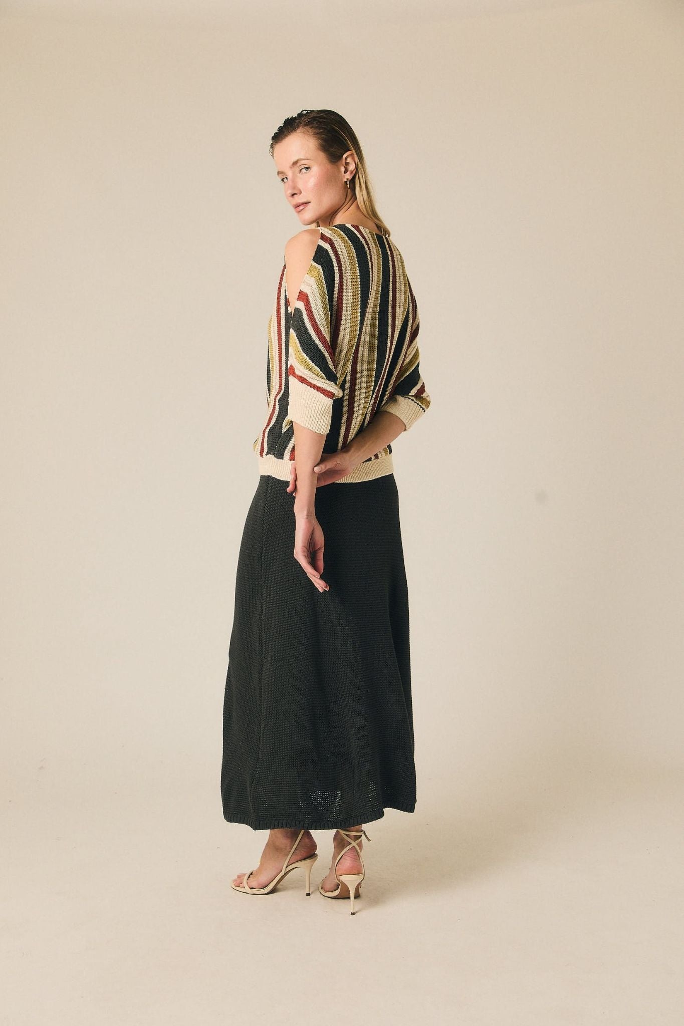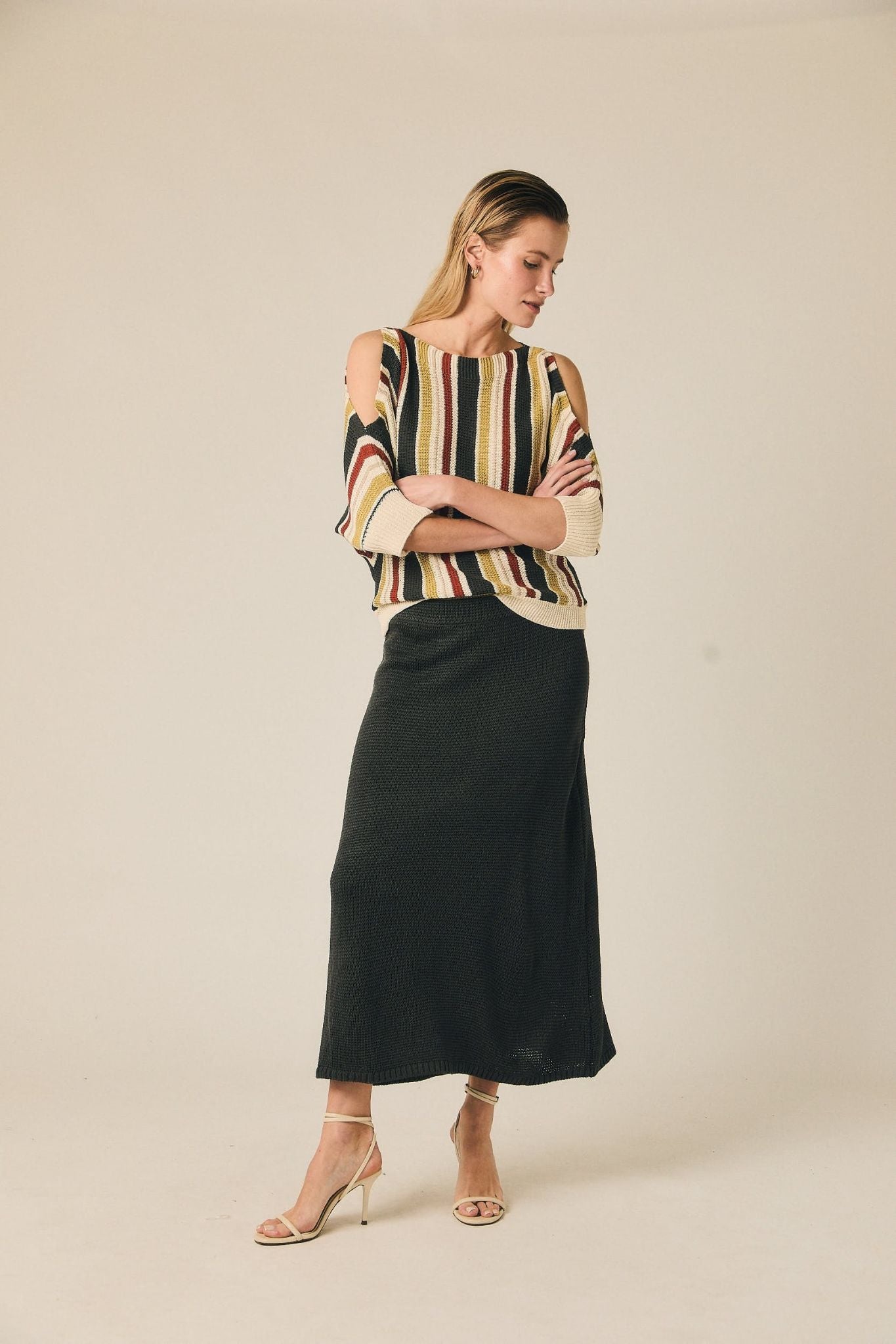 Falda midi de punto con silueta recta y diseño limpio. Presenta cintura elástica que se adapta cómodamente y una textura de punto marcada que aporta estructura al conjunto. Su largo por debajo de la rodilla crea una línea estilizada y fácil de combinar.