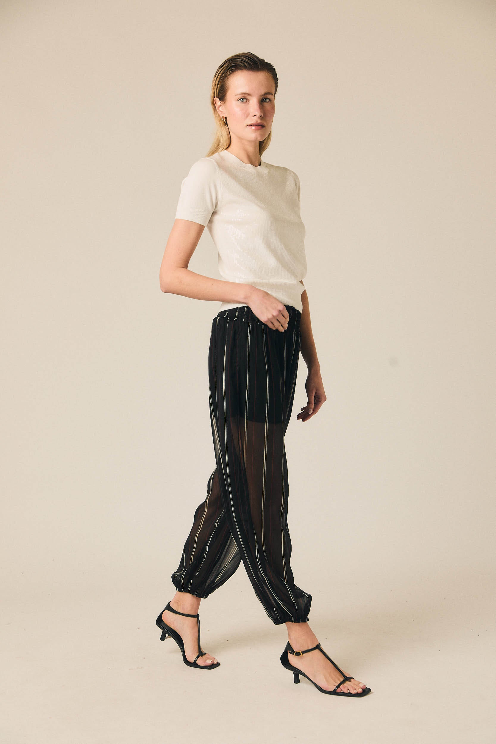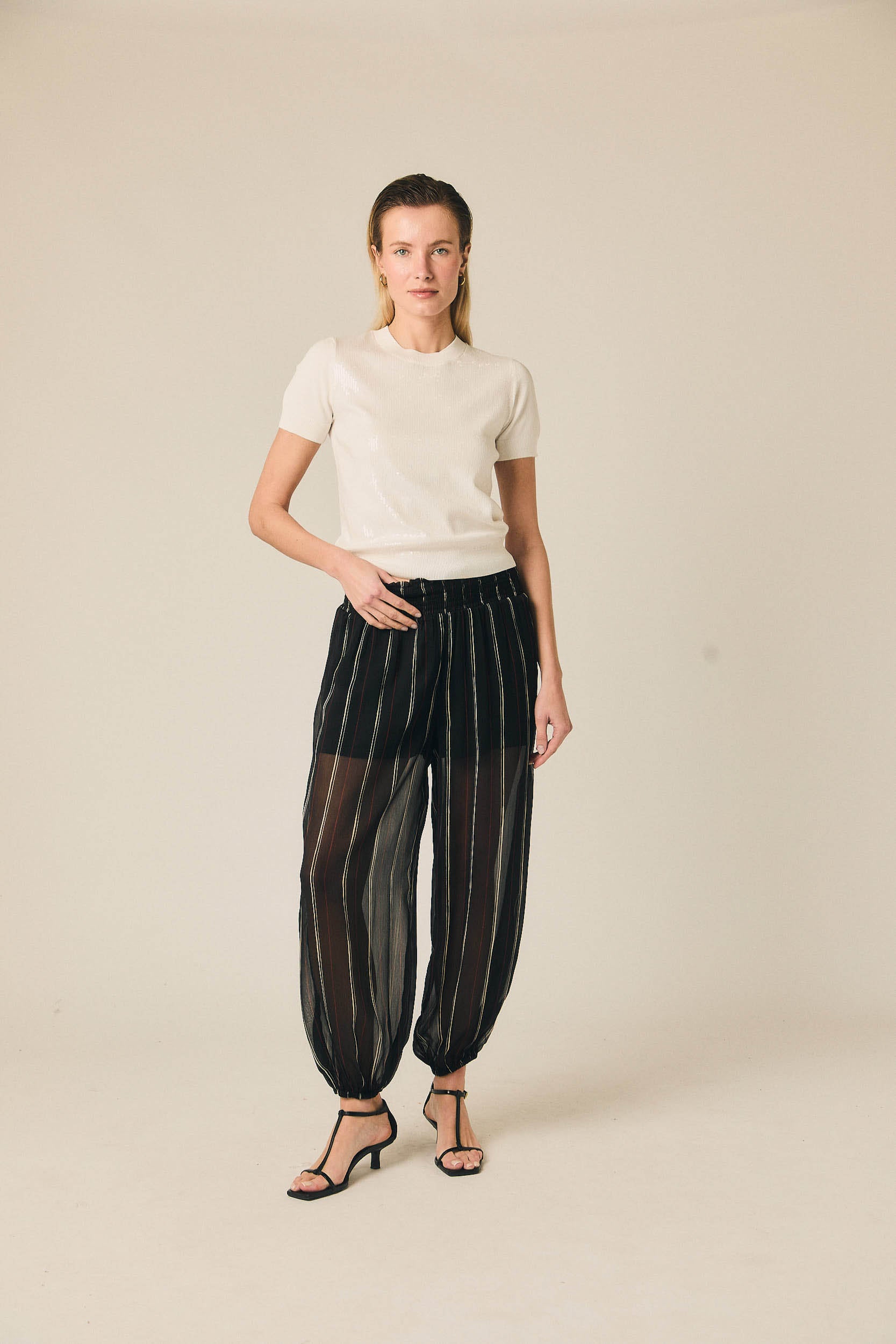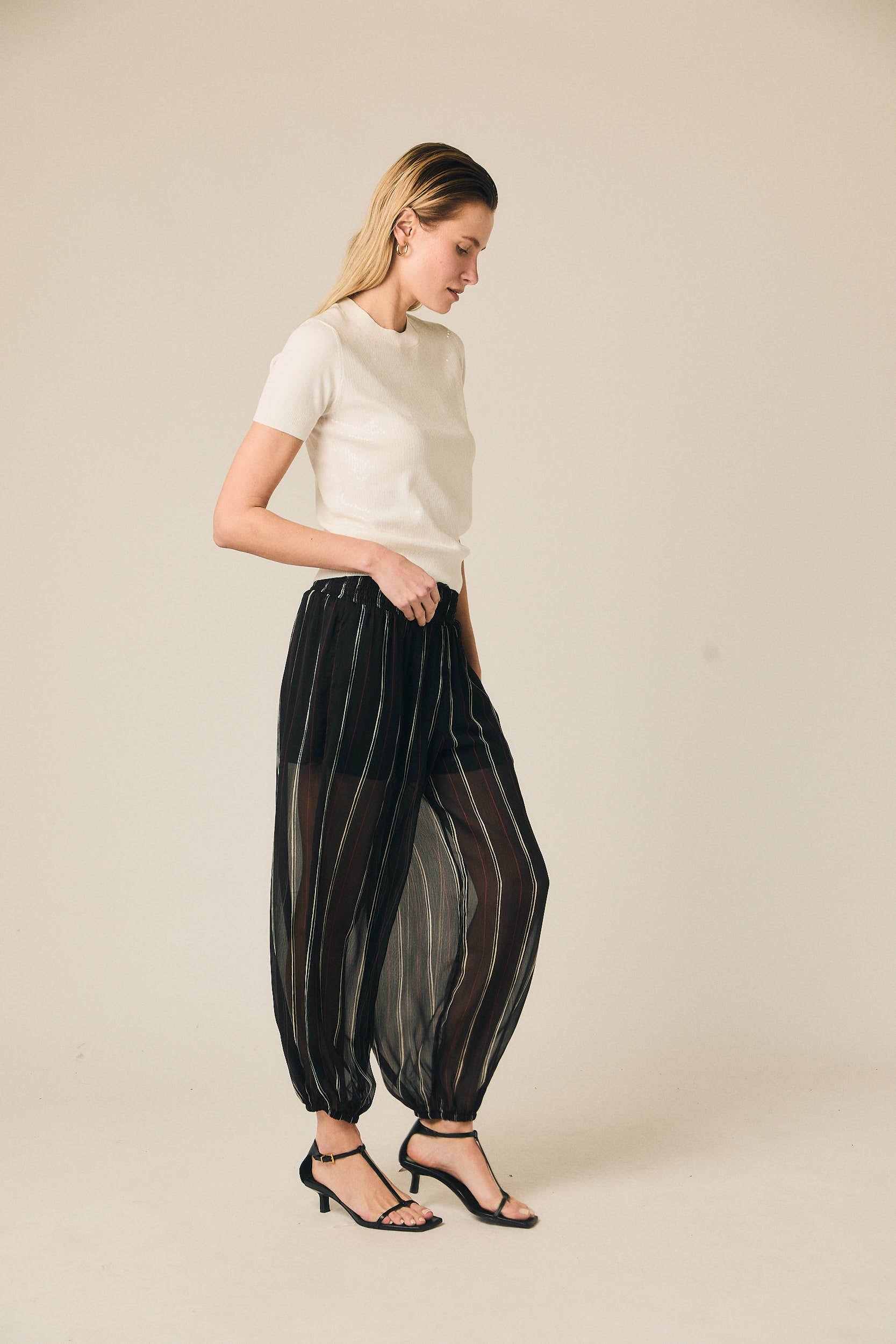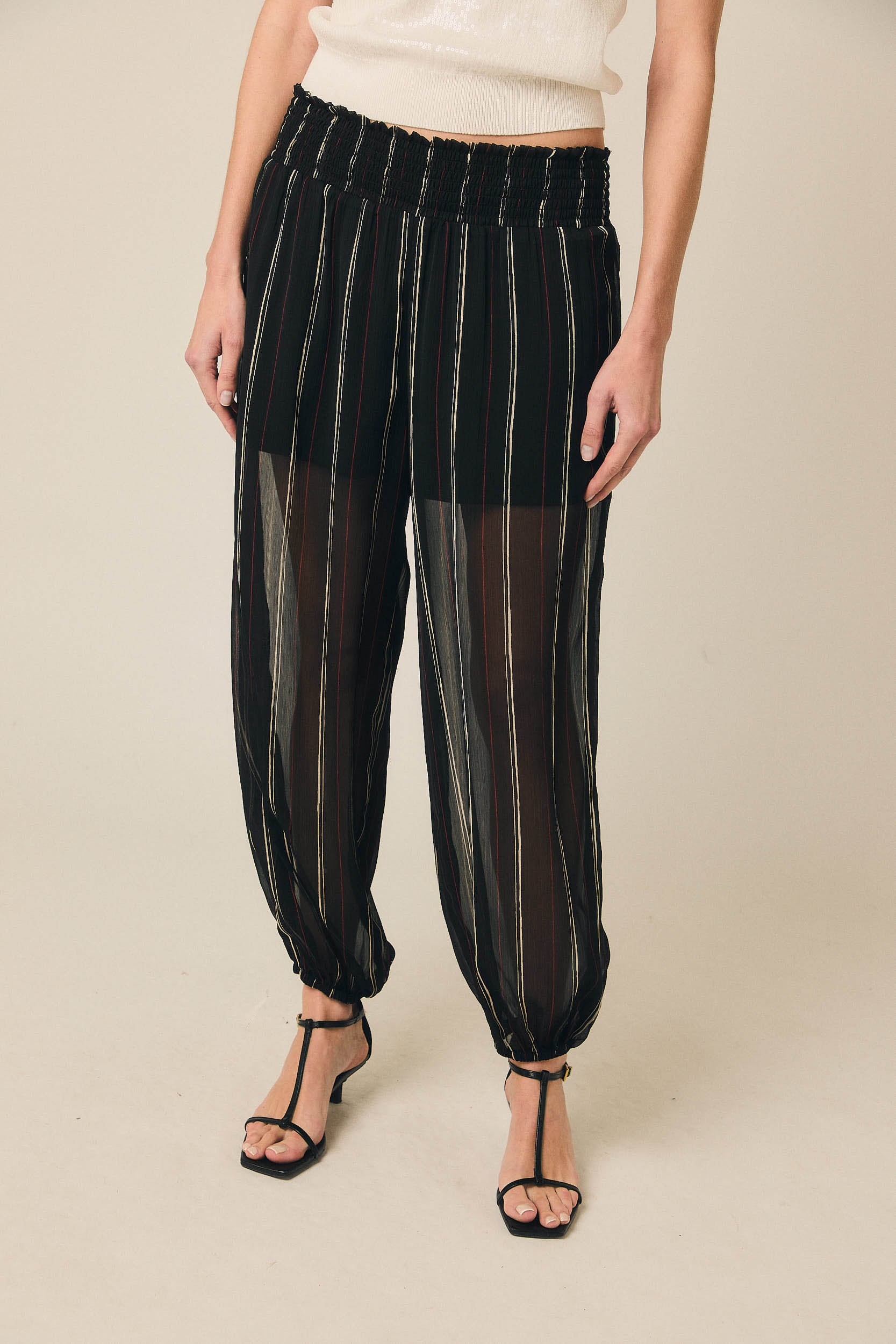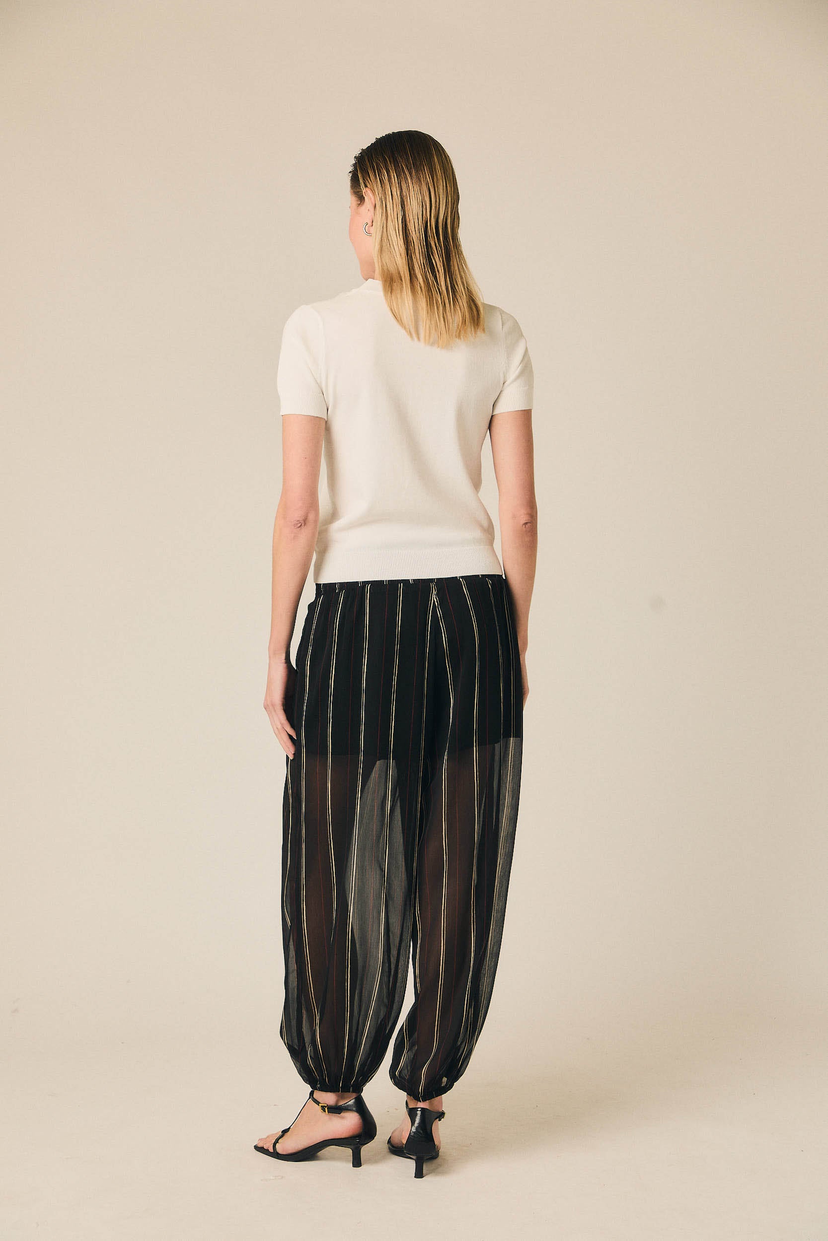 Pantalón de tejido ligero con rayas verticales en tonos negro, beige y rojo. Presenta cintura elástica fruncida que se adapta al cuerpo y pernera amplia con bajo ajustado tipo bombacho. El tejido semitransparente aporta movimiento y ligereza al diseño.