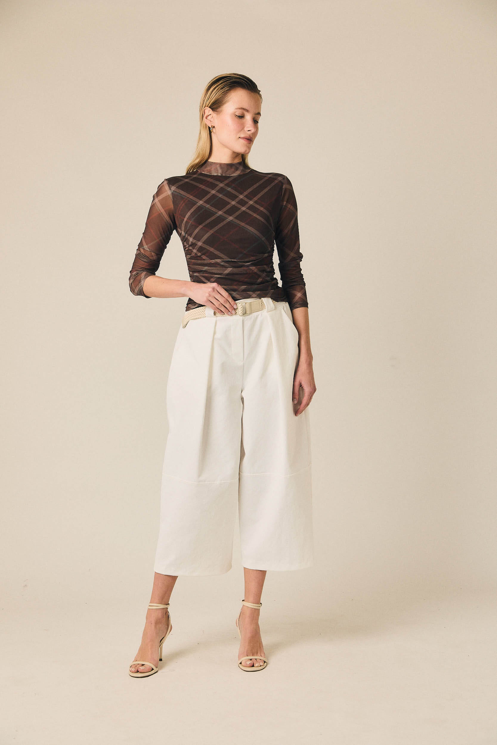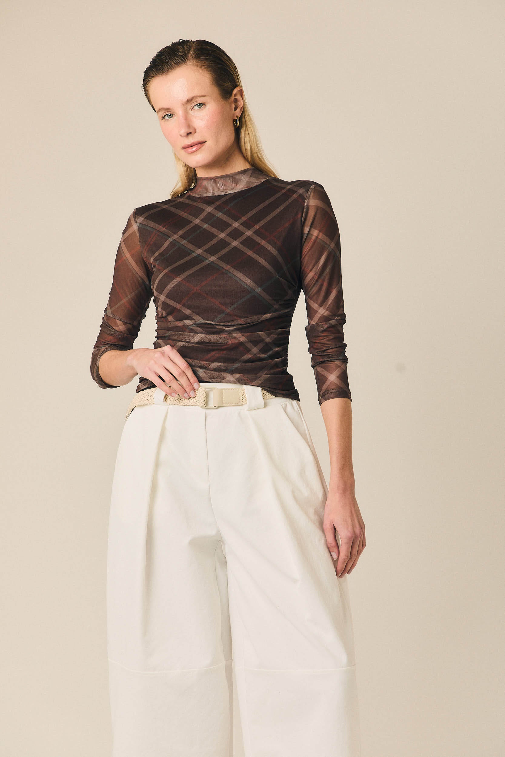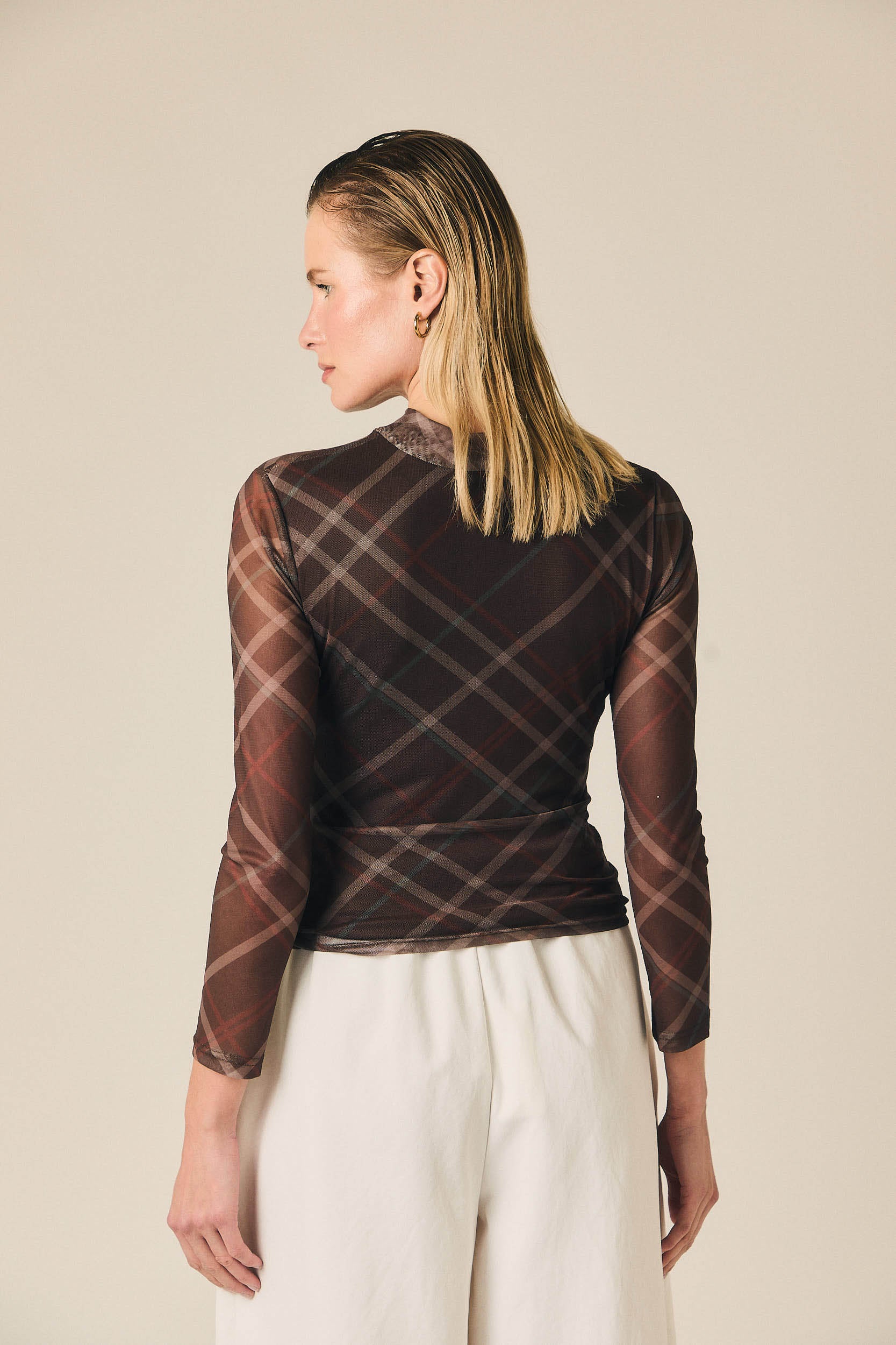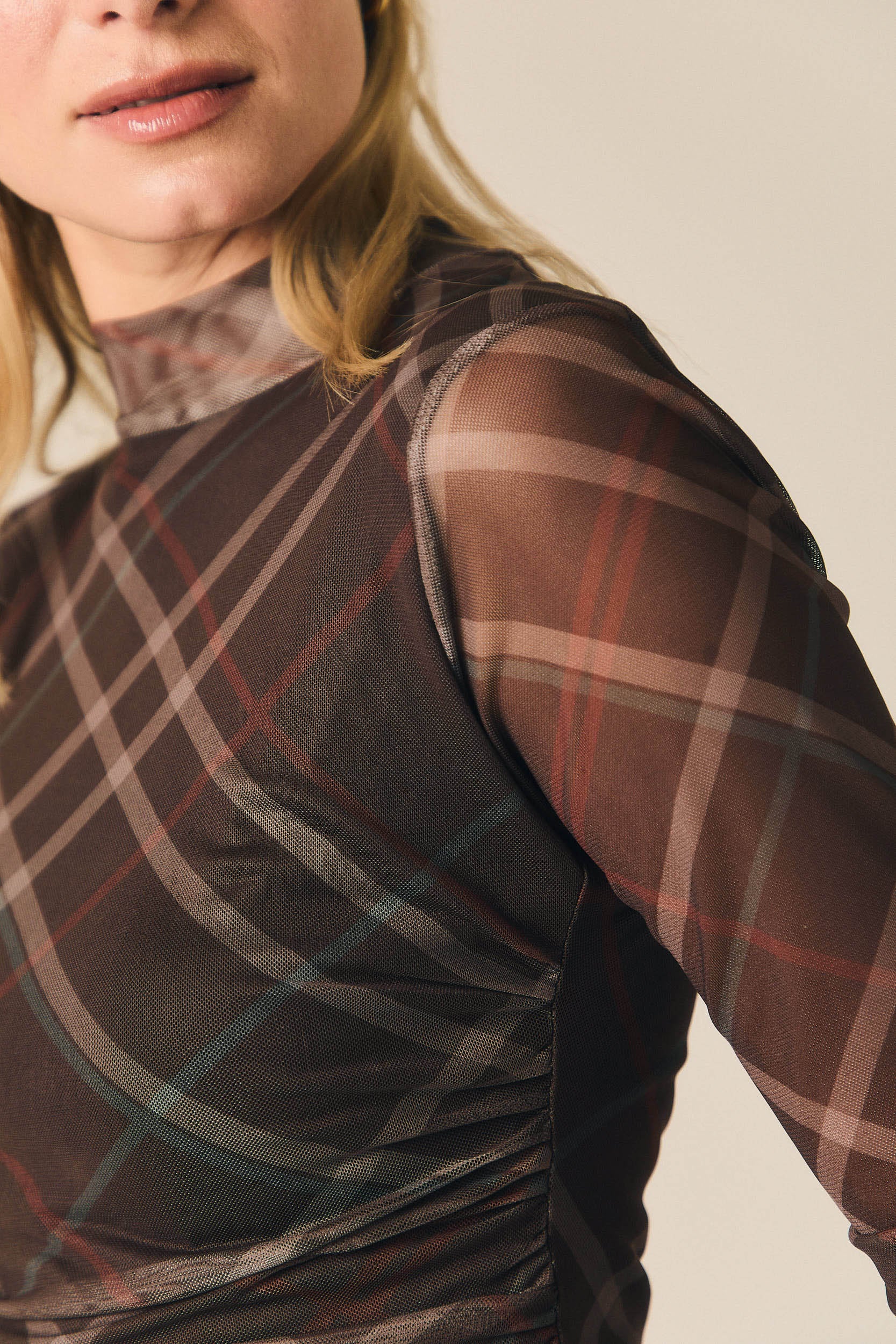 Top de tul semitransparente con estampado de cuadros en tonos marrón, beige y rojizo. Presenta cuello alto, manga larga y silueta entallada que se adapta al cuerpo. El frunce lateral aporta textura y define ligeramente la forma de la prenda.