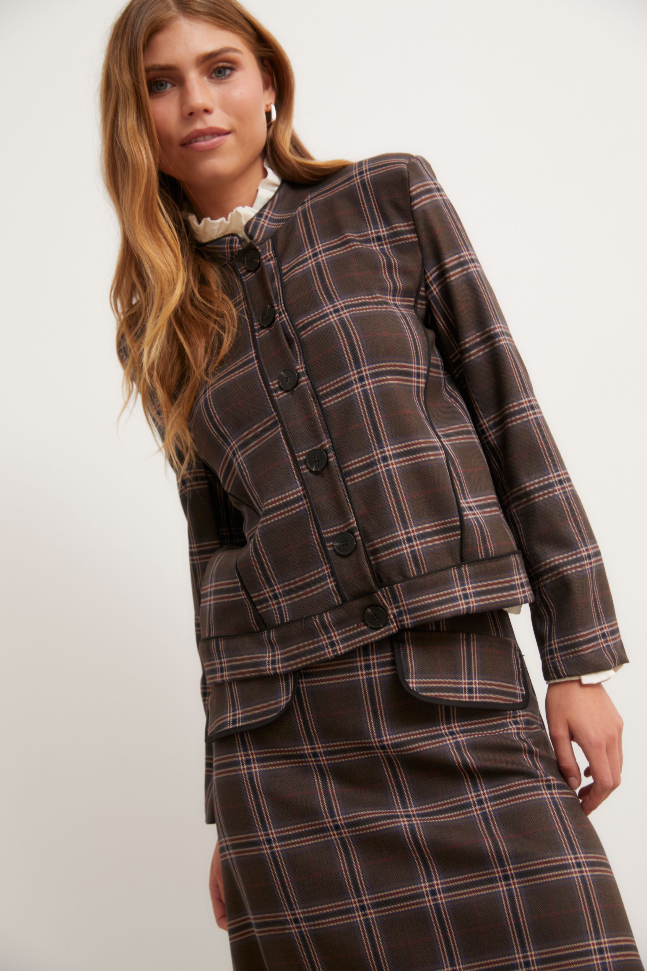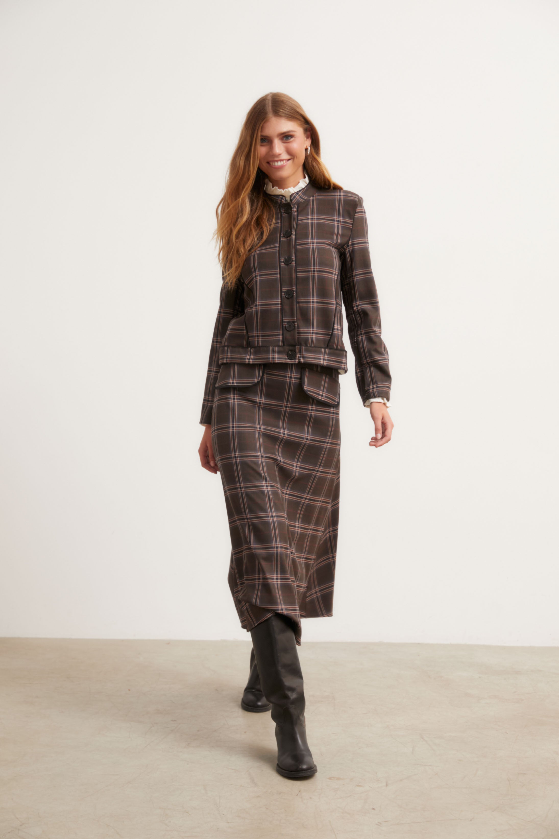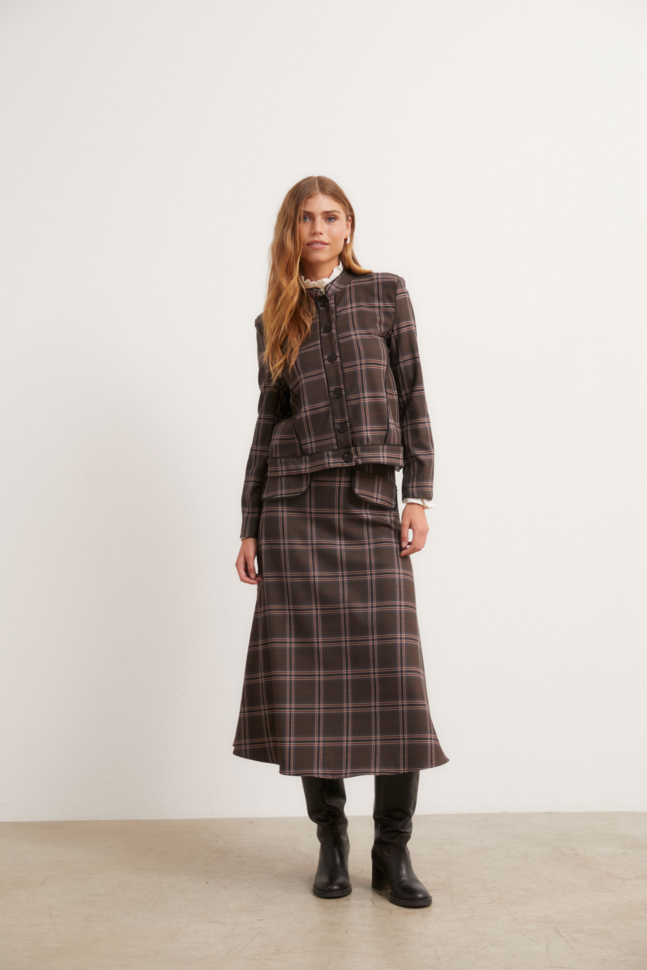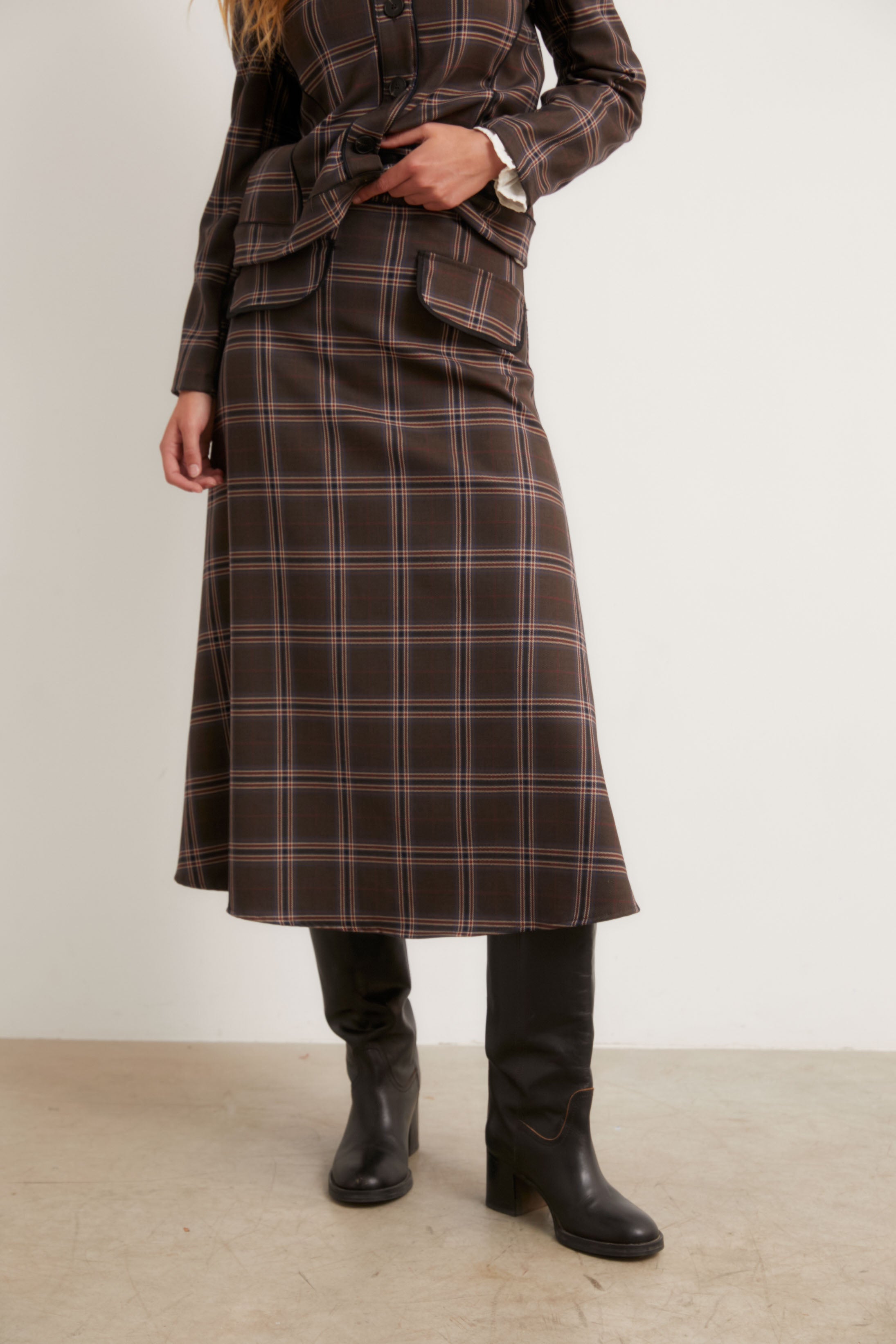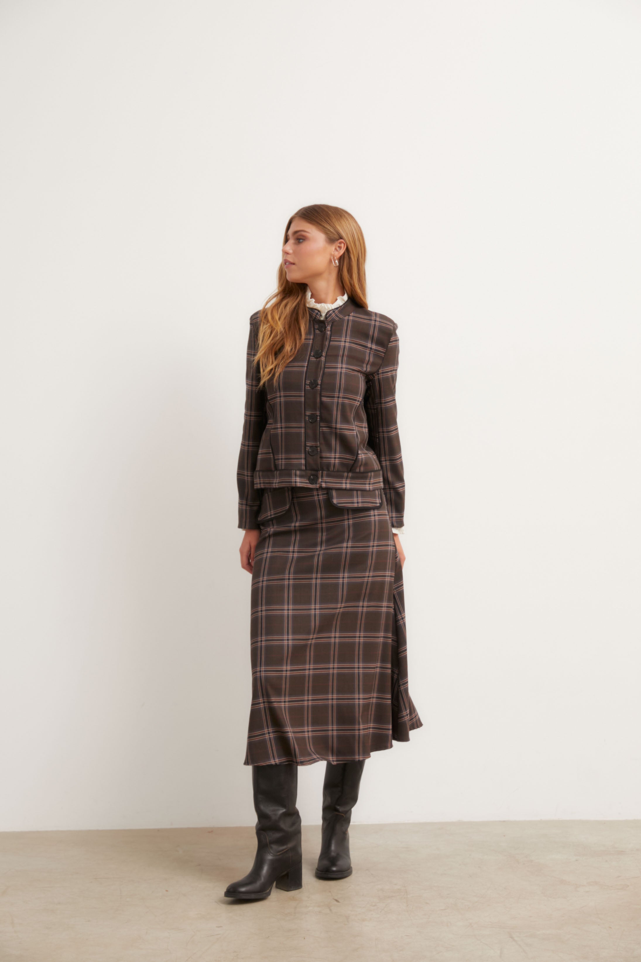 Falda midi de cuadros en tonos marrones con ribetes lisos a contraste. Presenta cintura recta, cierre trasero y bajo con ligera abertura que facilita el movimiento. Su silueta recta y estructura fluida crean un efecto elegante y favorecedor.