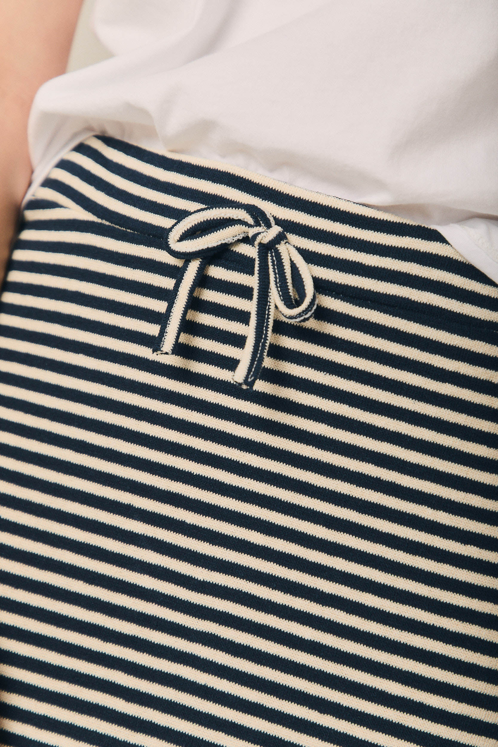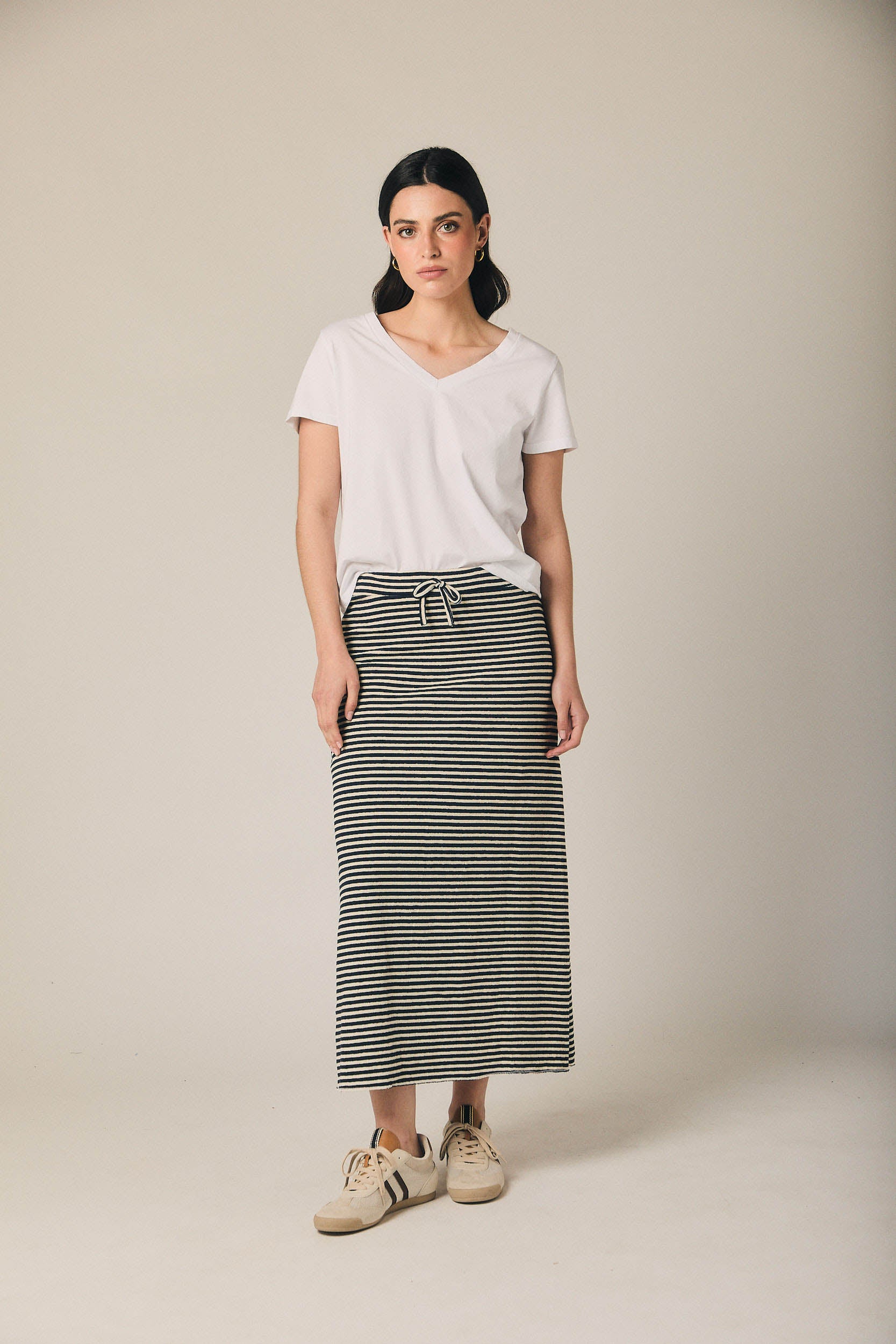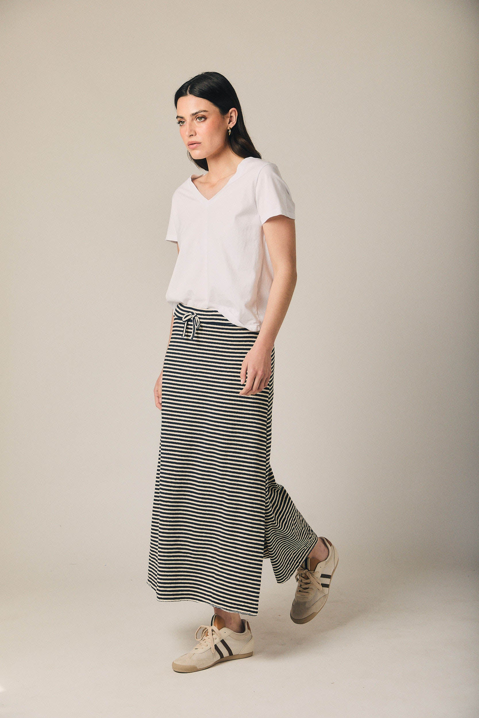 Falda midi de mujer con estampado de rayas horizontales en azul marino y beige. Diseño recto con ligera caída evasé y abertura lateral que aporta movimiento. Cintura elástica con cordón ajustable en contraste para mayor comodidad.
