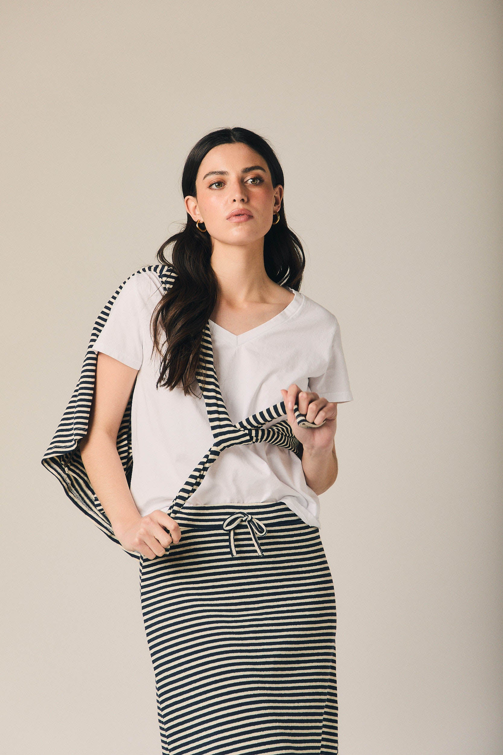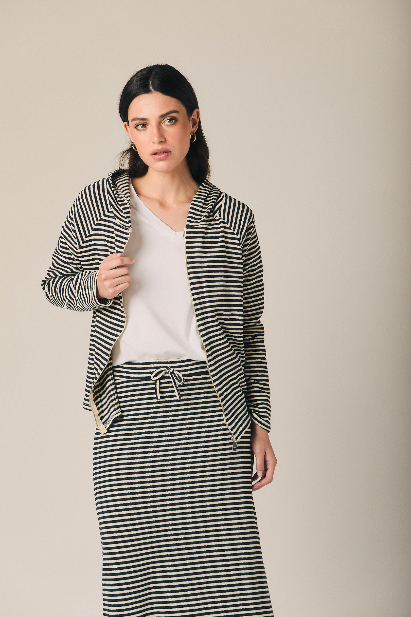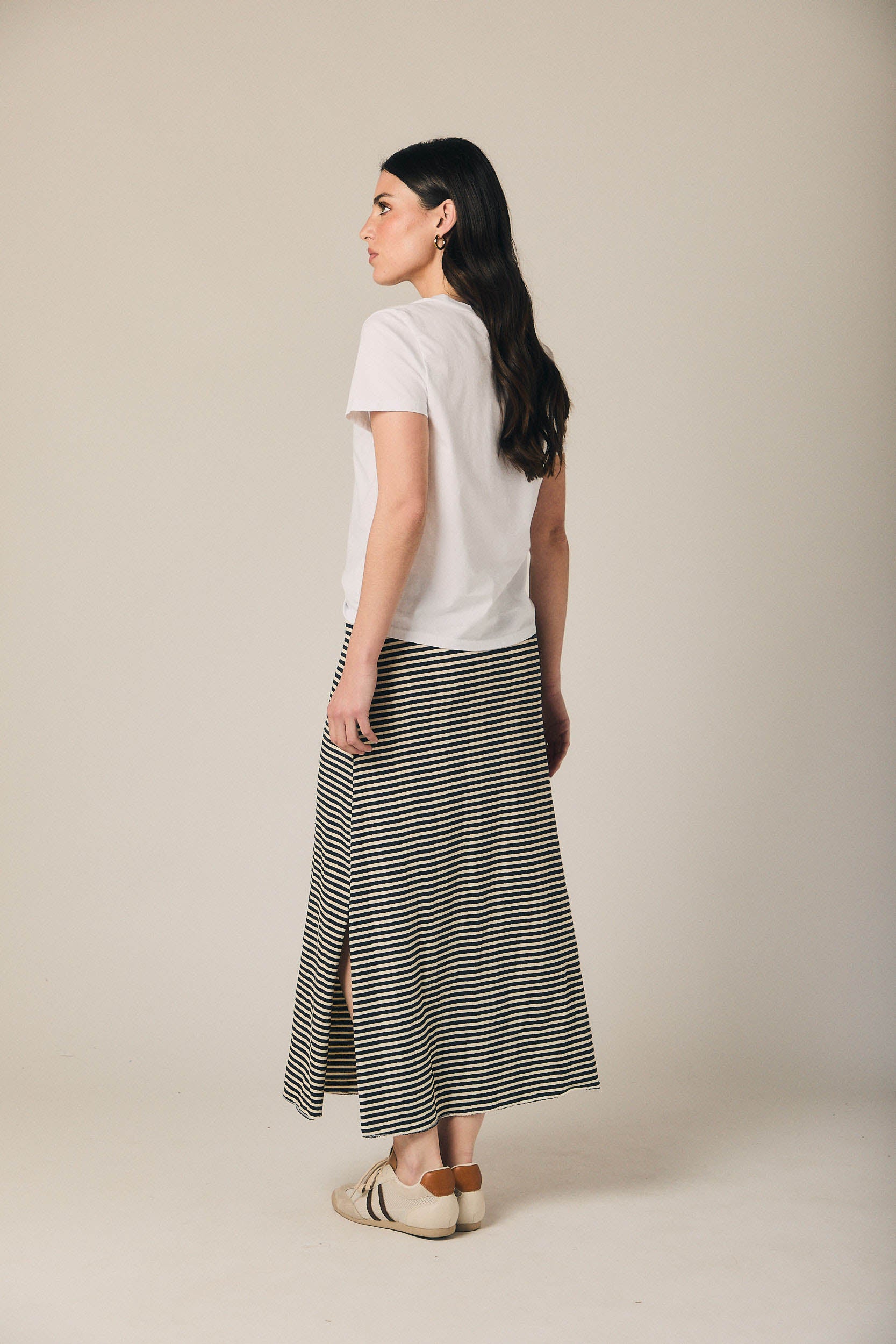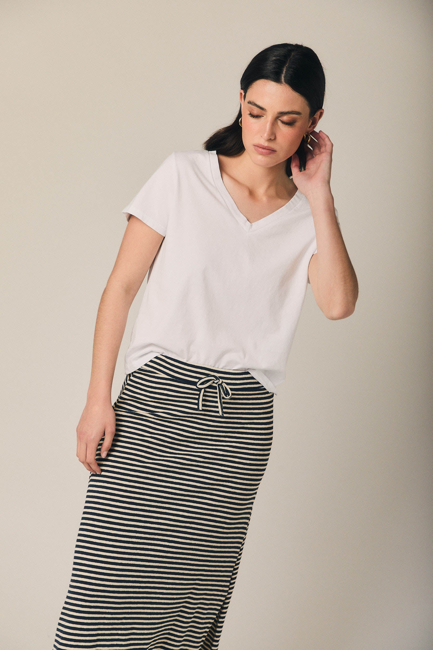 Falda midi de mujer con estampado de rayas horizontales en azul marino y beige. Diseño recto con ligera caída evasé y abertura lateral que aporta movimiento. Cintura elástica con cordón ajustable en contraste para mayor comodidad.