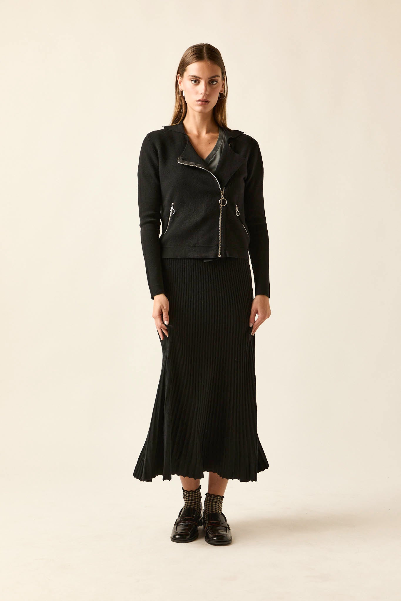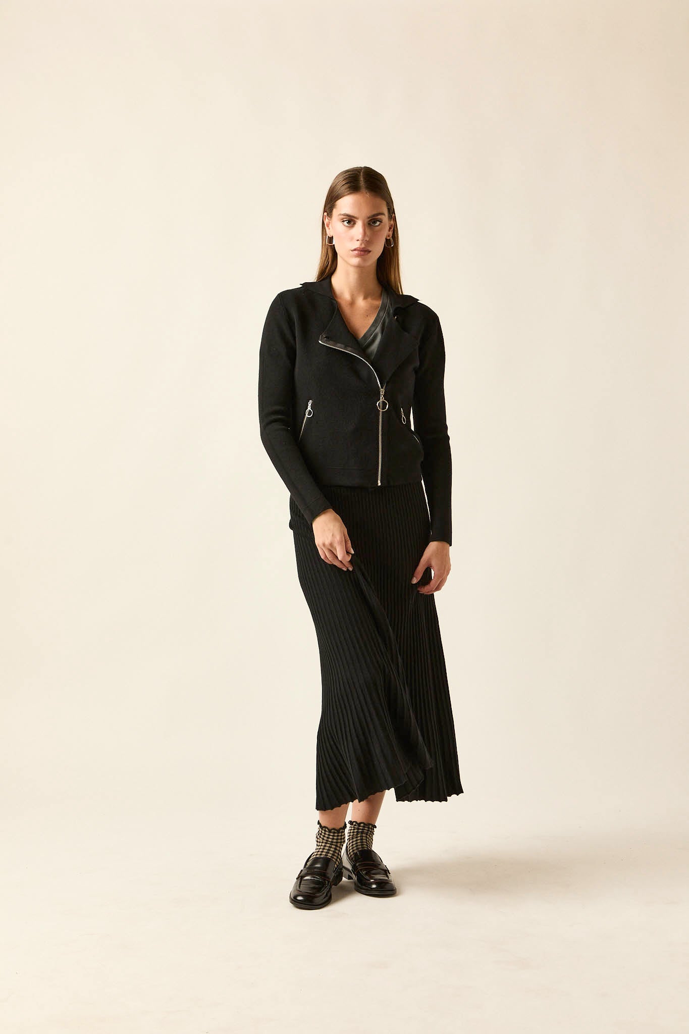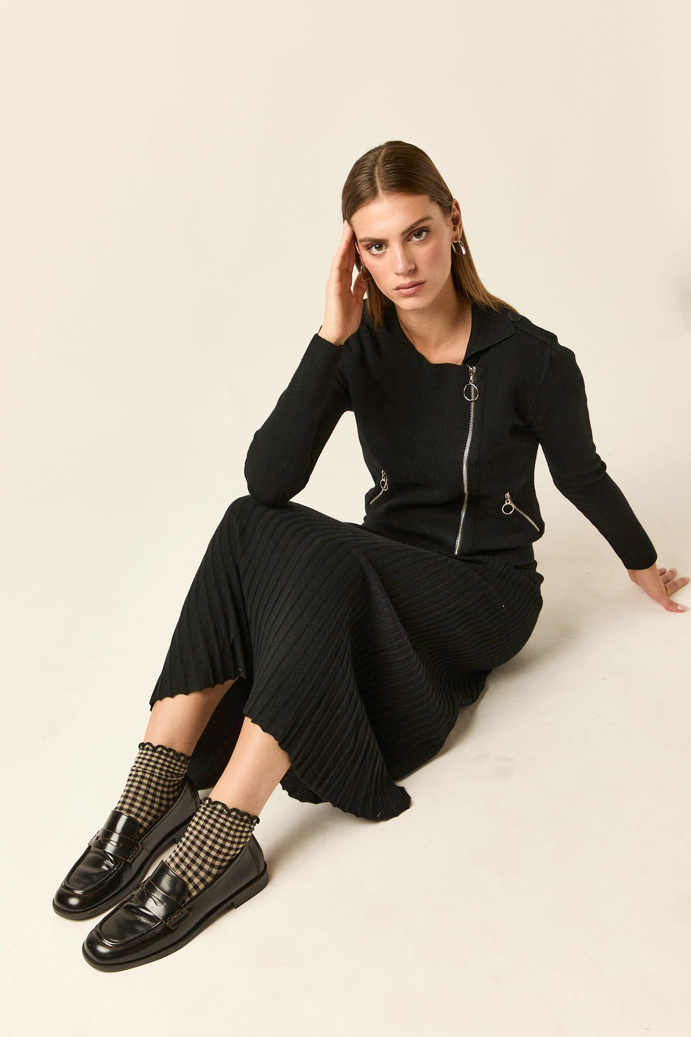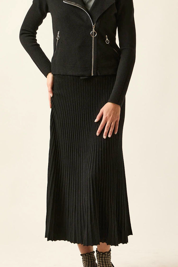 Falda de punto en color negro con diseño de largo midi. Presenta corte recto con vuelo sutil y acabado plisado que aporta movimiento y ligereza. Su cintura elástica favorece la comodidad y se adapta con facilidad a la silueta.