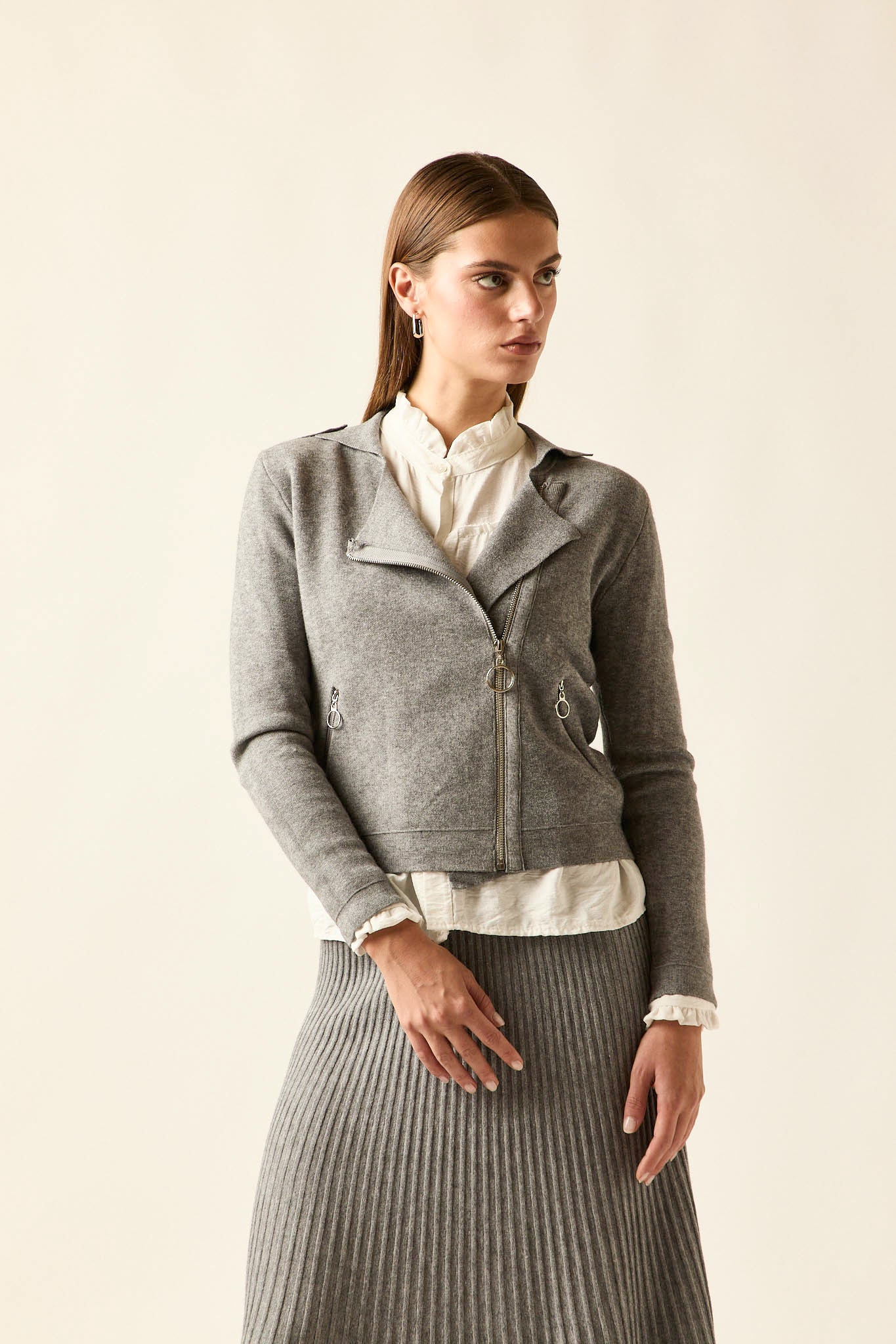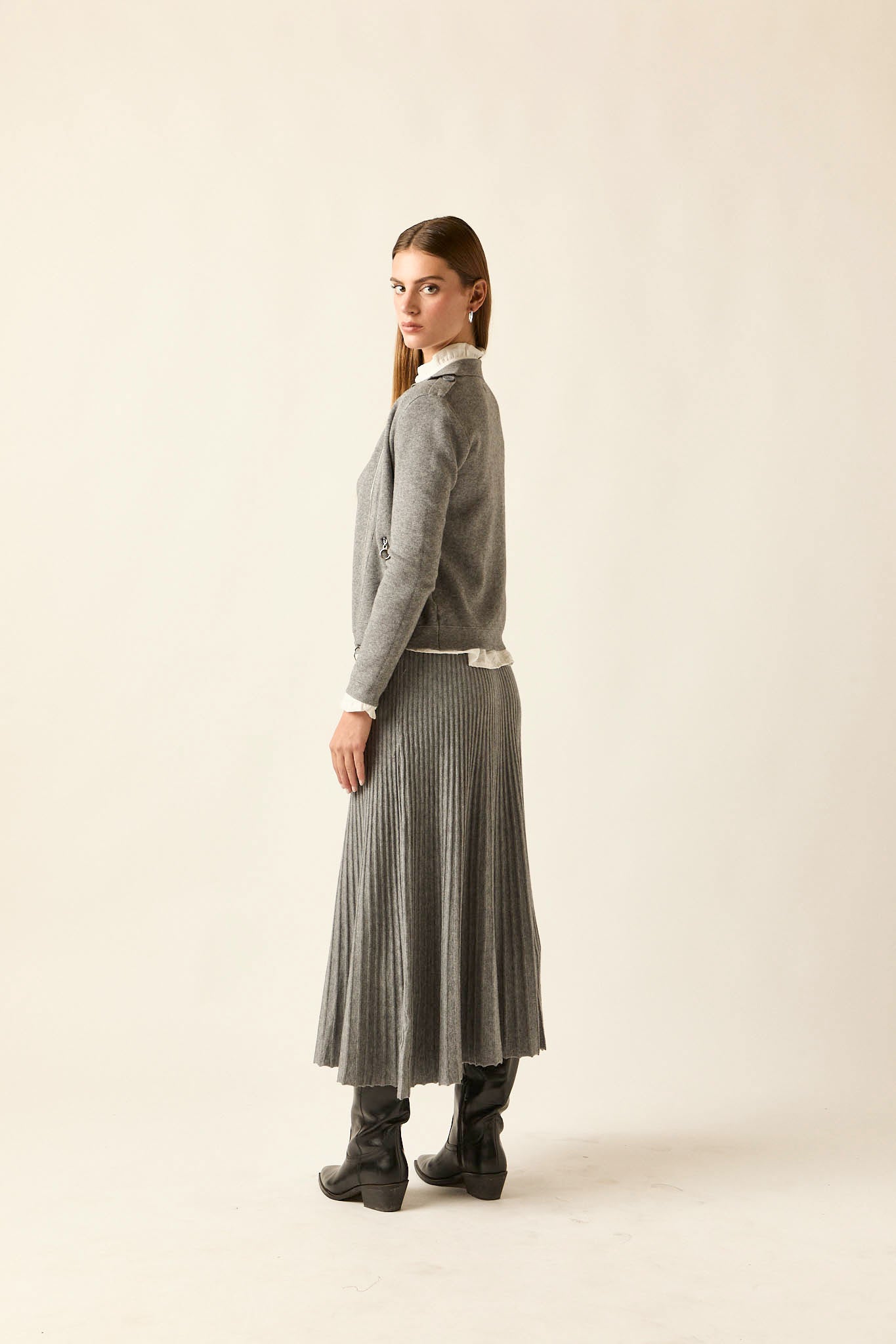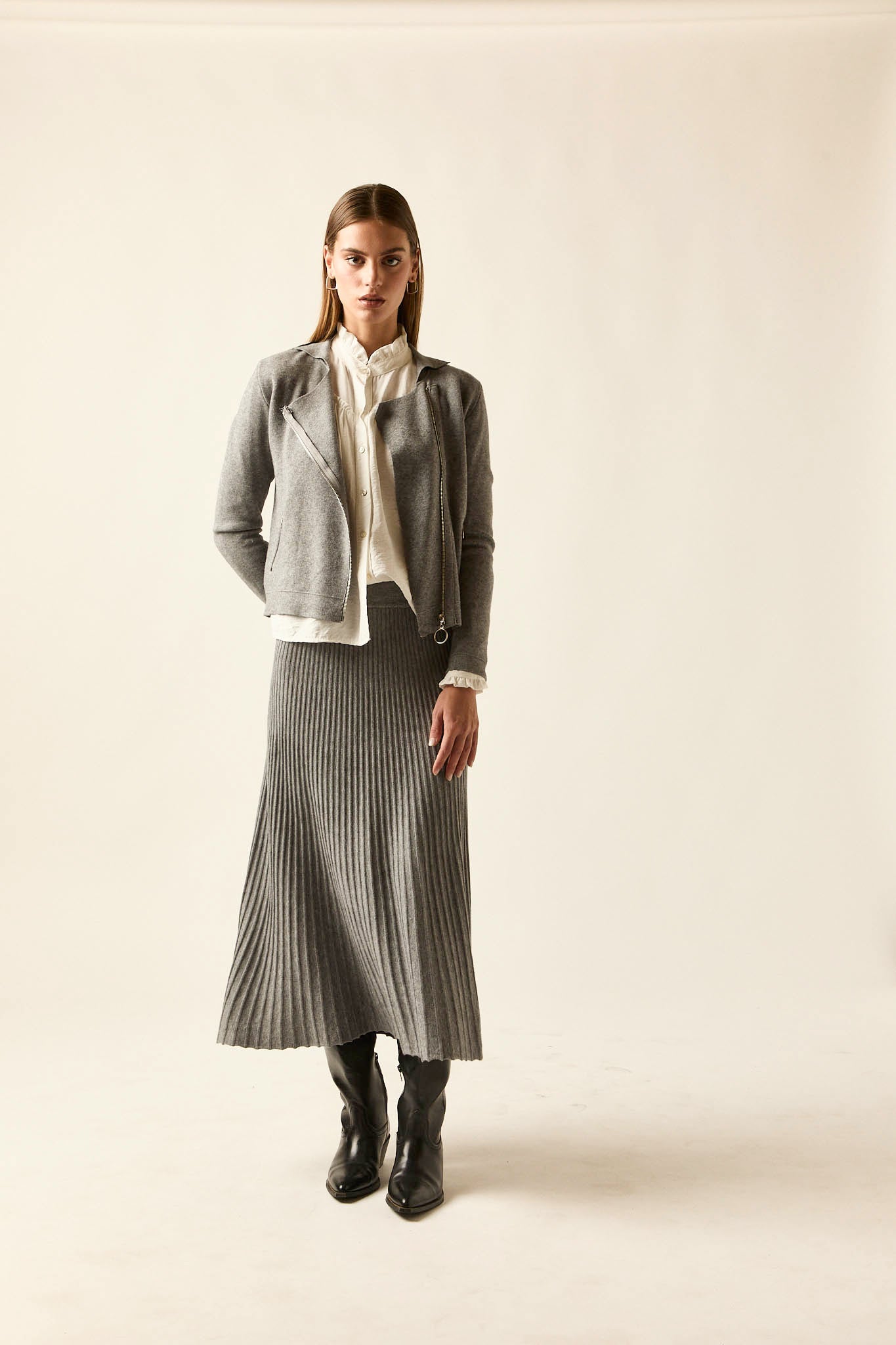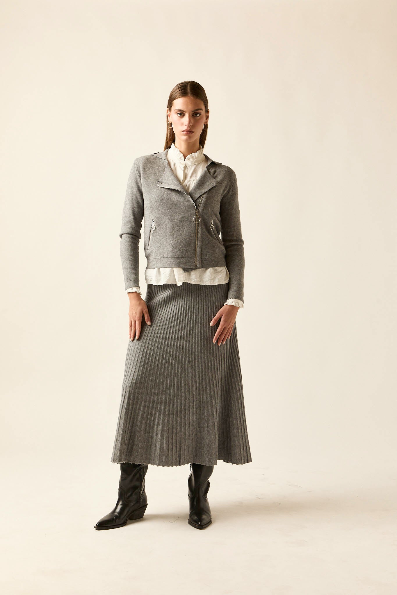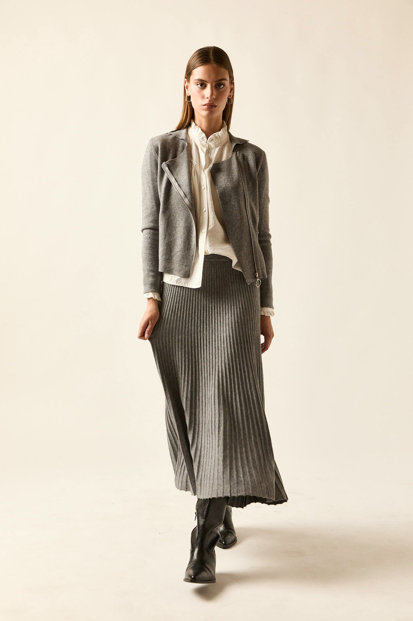 Falda de punto en color gris con diseño de largo midi. Presenta corte recto con vuelo sutil y acabado plisado que aporta movimiento y ligereza. Su cintura elástica favorece la comodidad y se adapta con facilidad a la silueta.