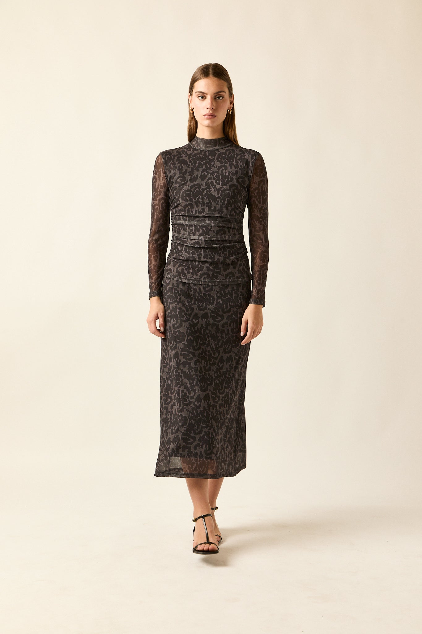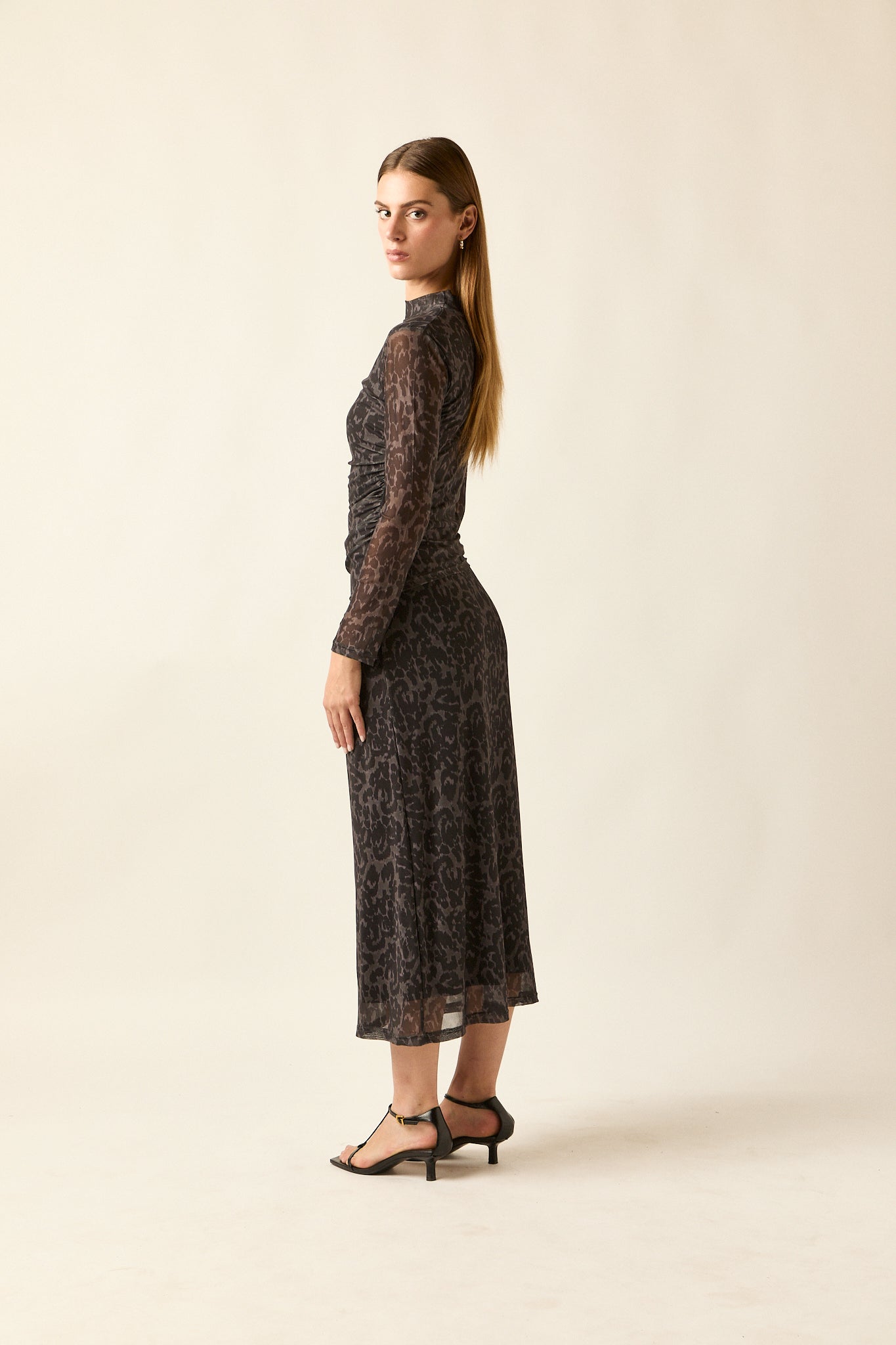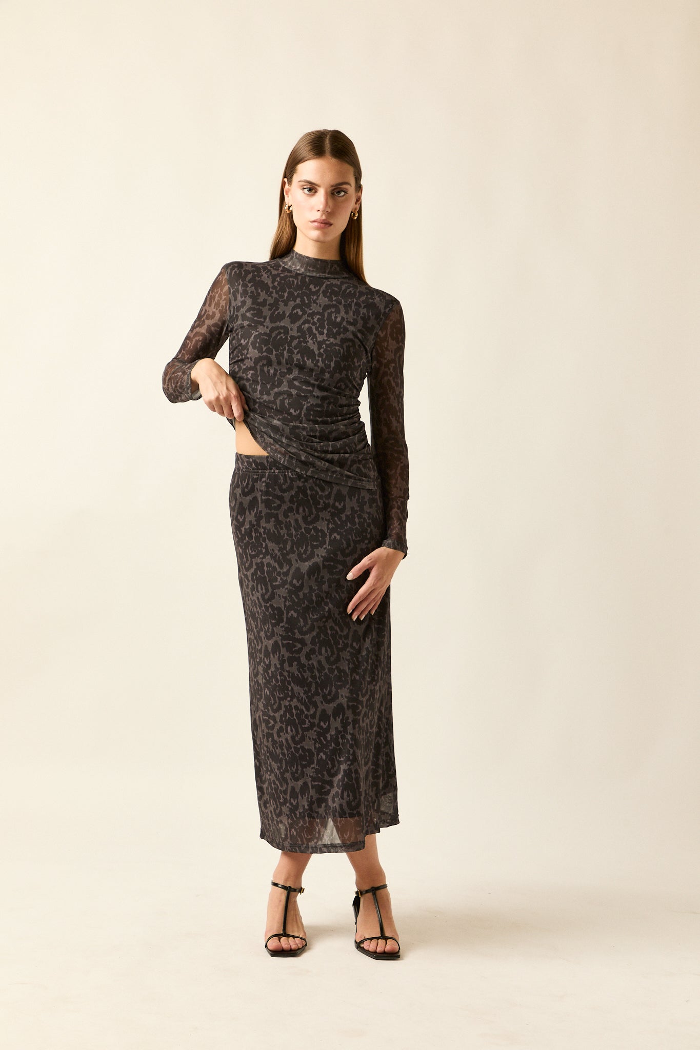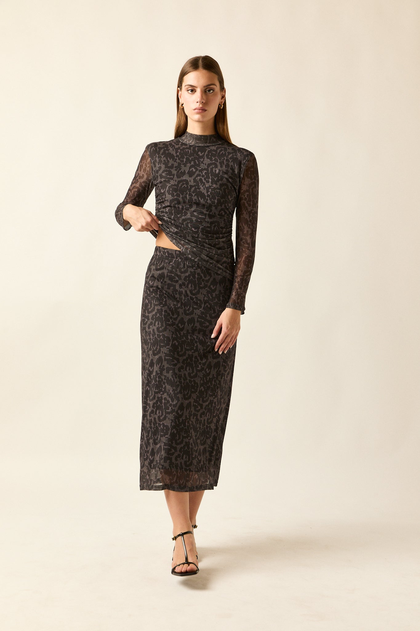 Falda midi de tul con estampado animal en tonos gris y negro. De corte recto y caída fluida, cuenta con forro interior opaco y cintura elástica que se adapta cómodamente. Su tejido ligero y semitransparente añade movimiento y un aire sofisticado al conjunto.