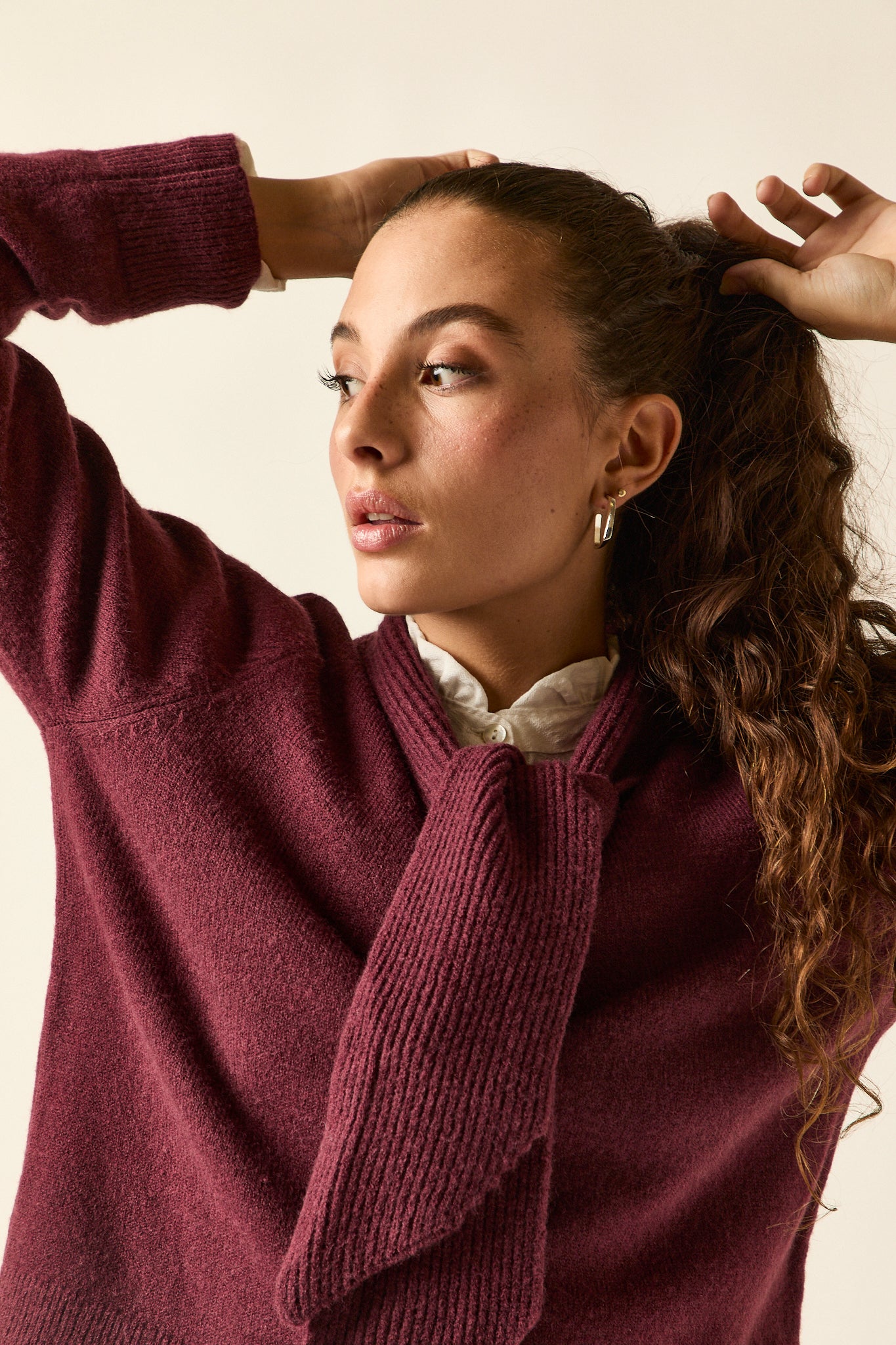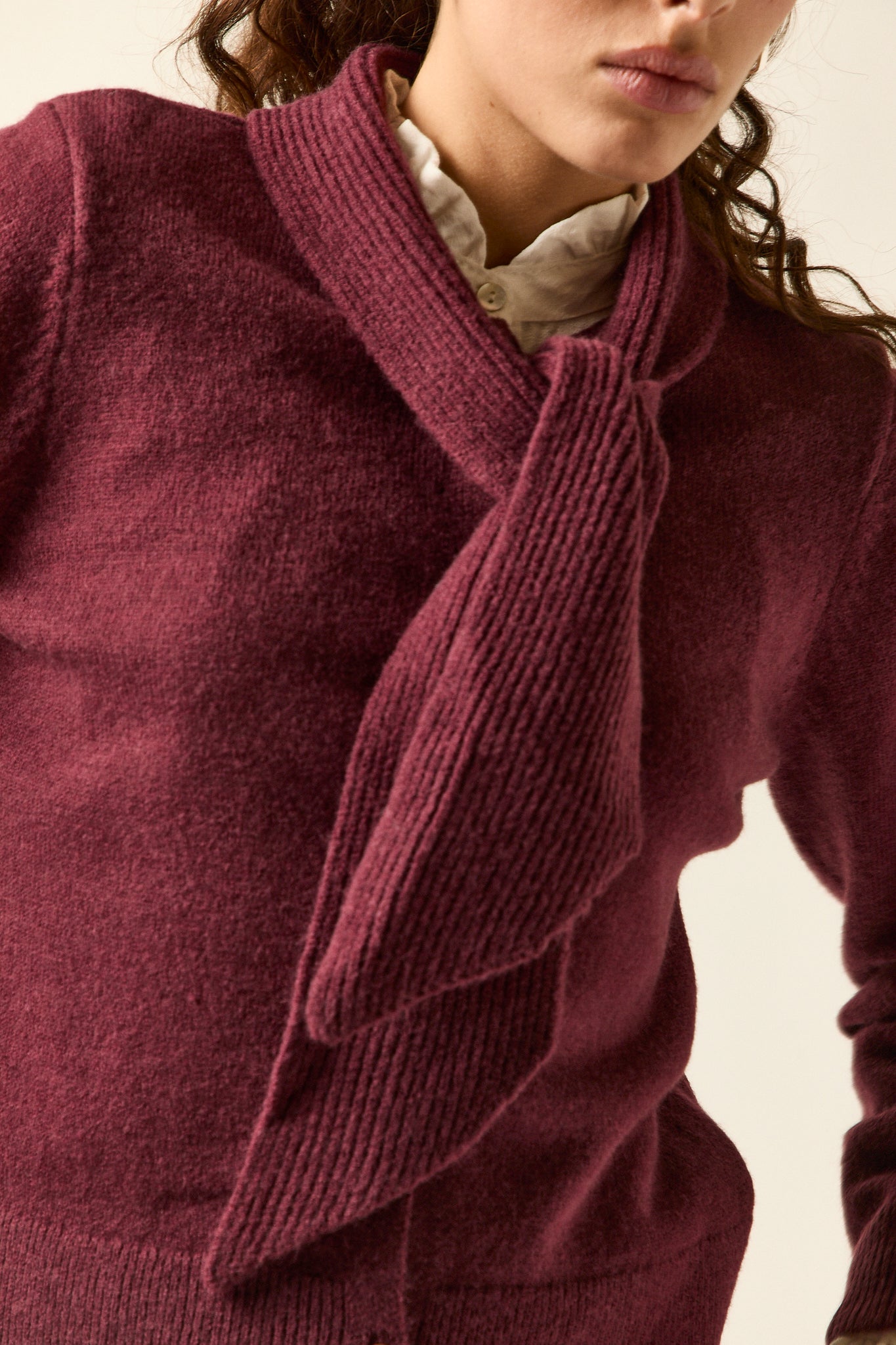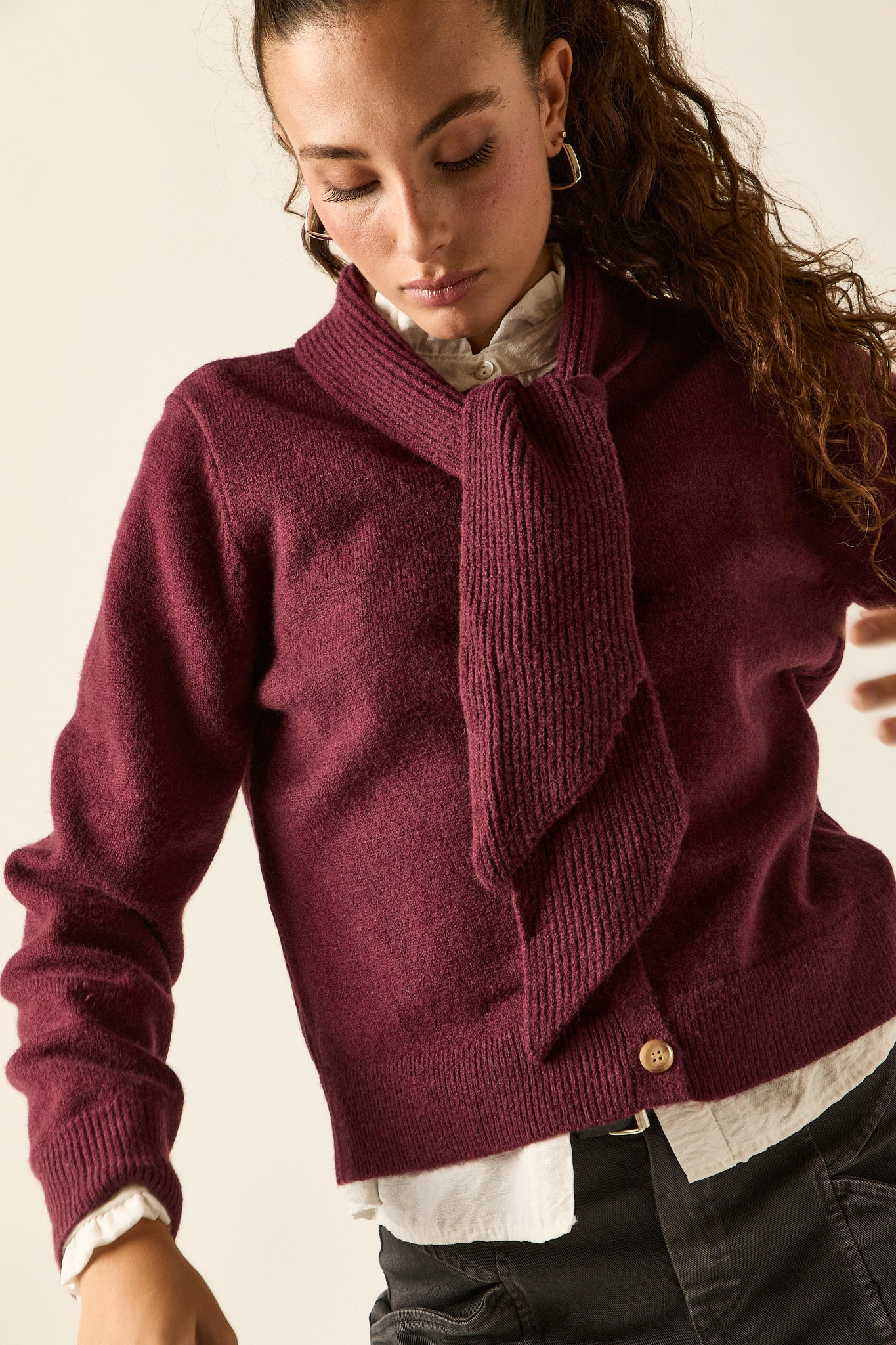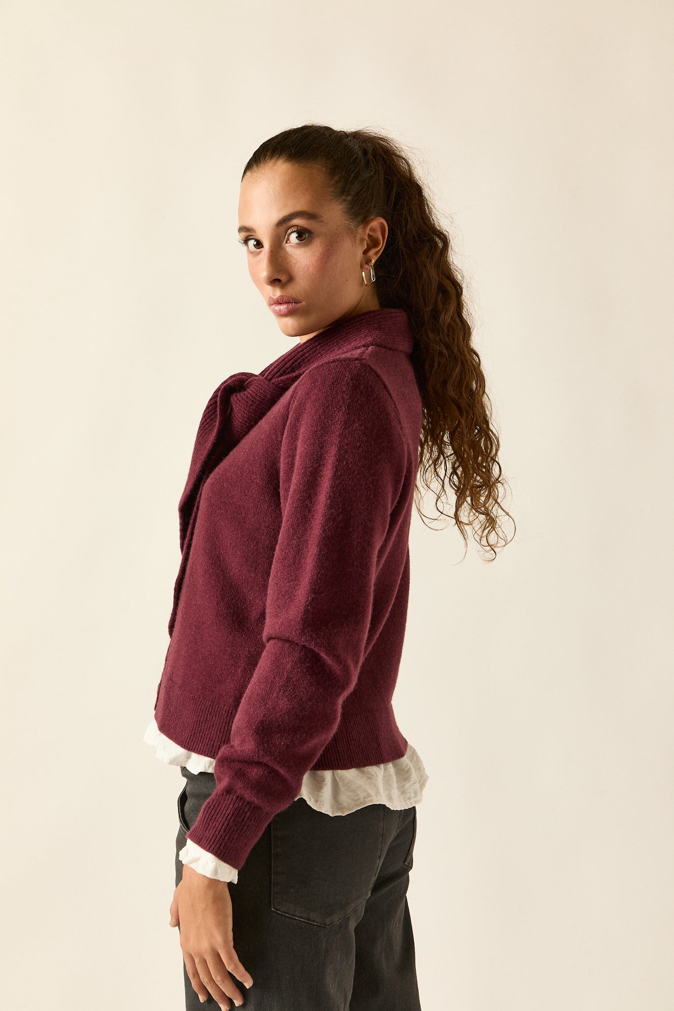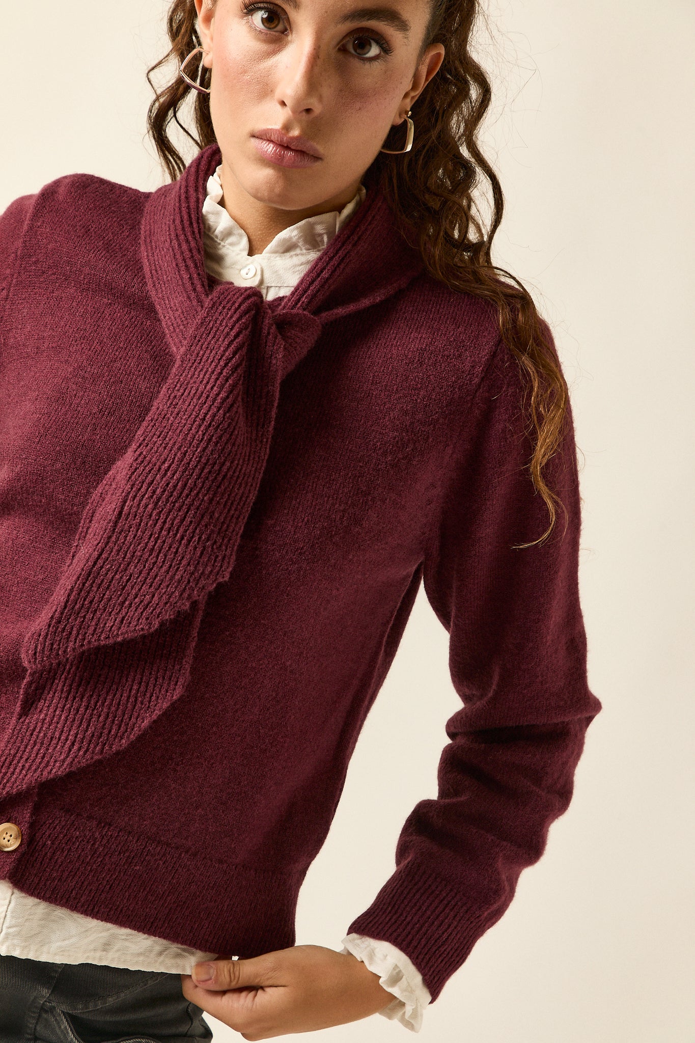 Cárdigan de punto suave en tono berenjena con escote en pico y detalle de lazada en el cuello del mismo tejido. Presenta cierre frontal con botones y un corte recto que aporta comodidad sin perder estilo. Su diseño combina un aire clásico con un toque romántico y femenino.