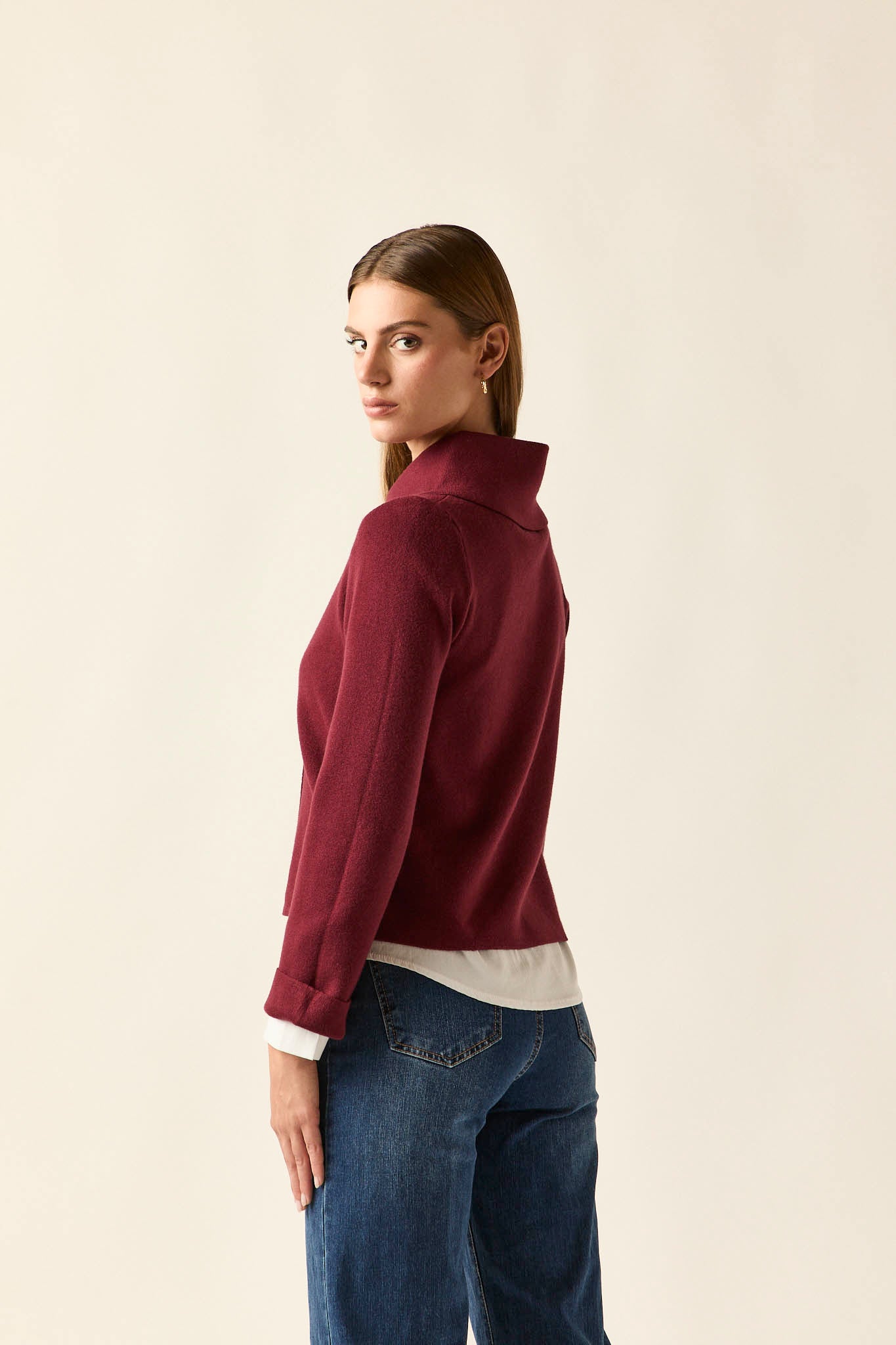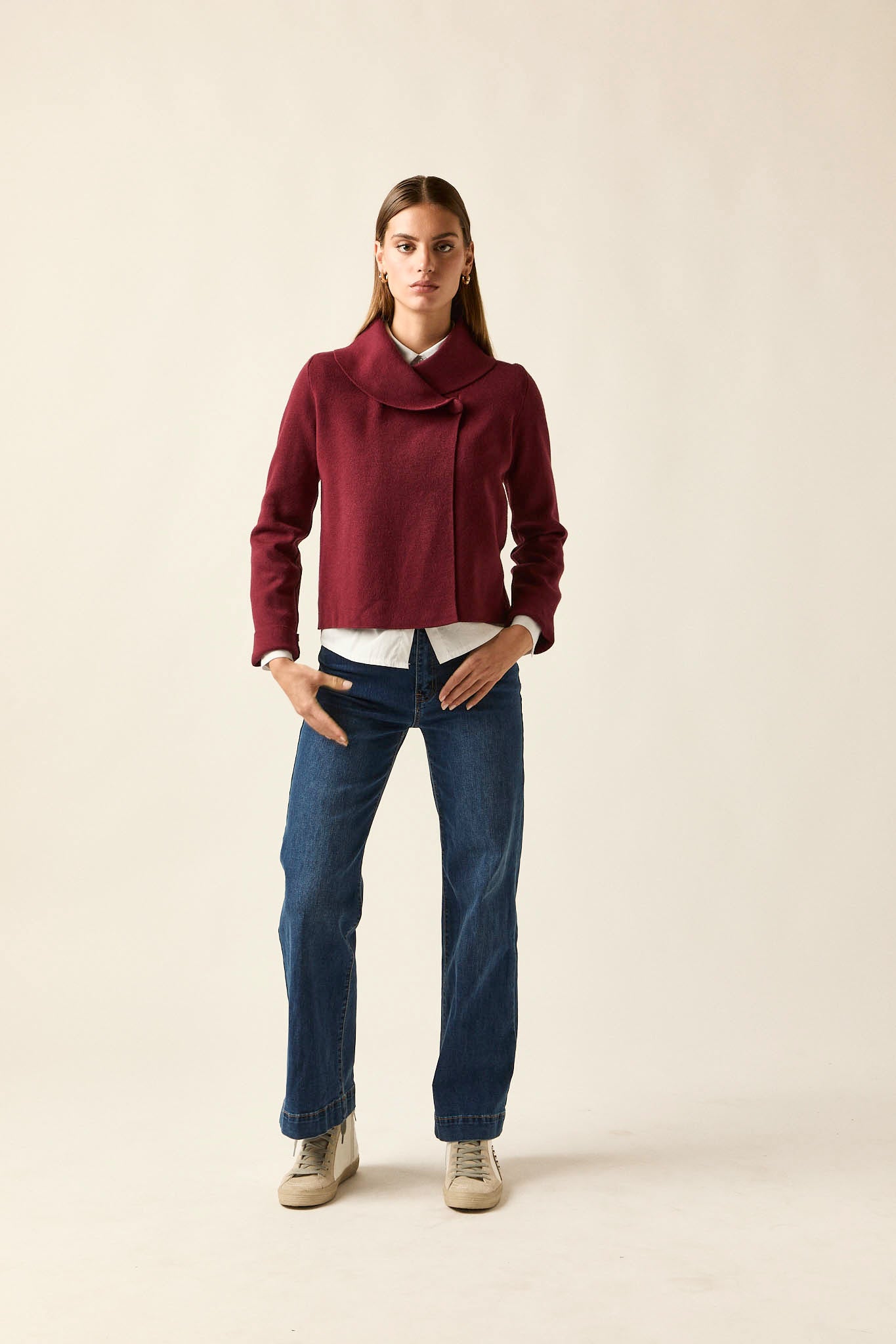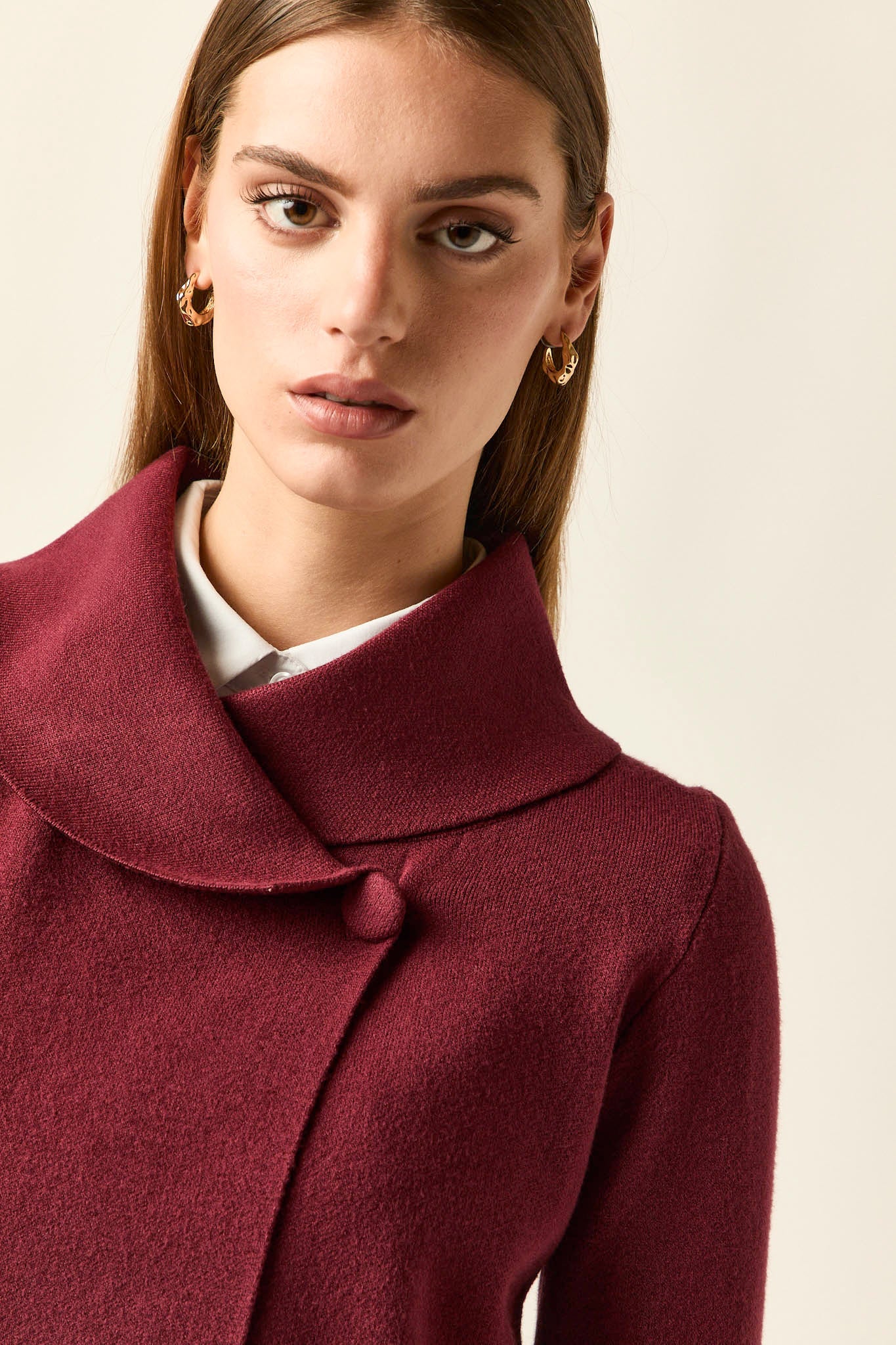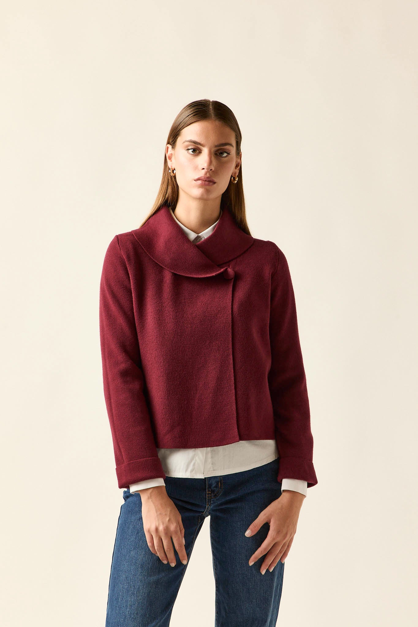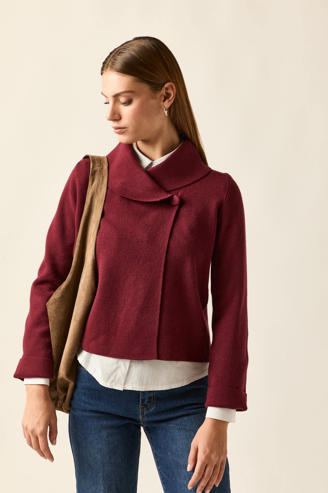 Chaqueta corta de punto en color burdeos, con cuello amplio envolvente y cierre cruzado con botón forrado. Su corte recto y manga larga crean una silueta elegante y confortable, perfecta para el día a día con un toque sofisticado.