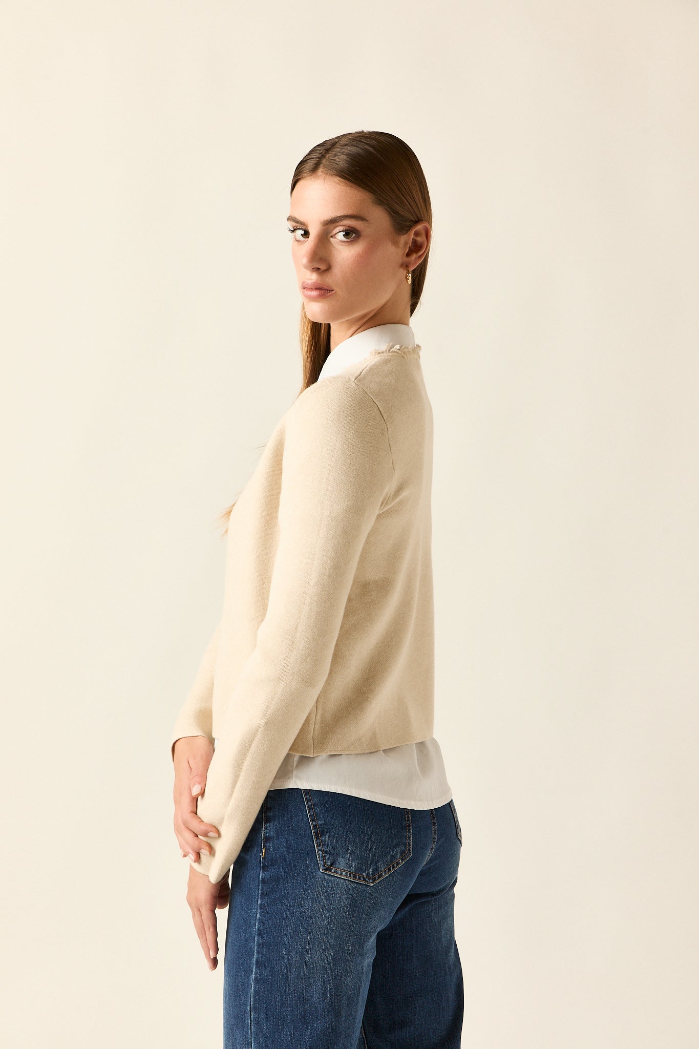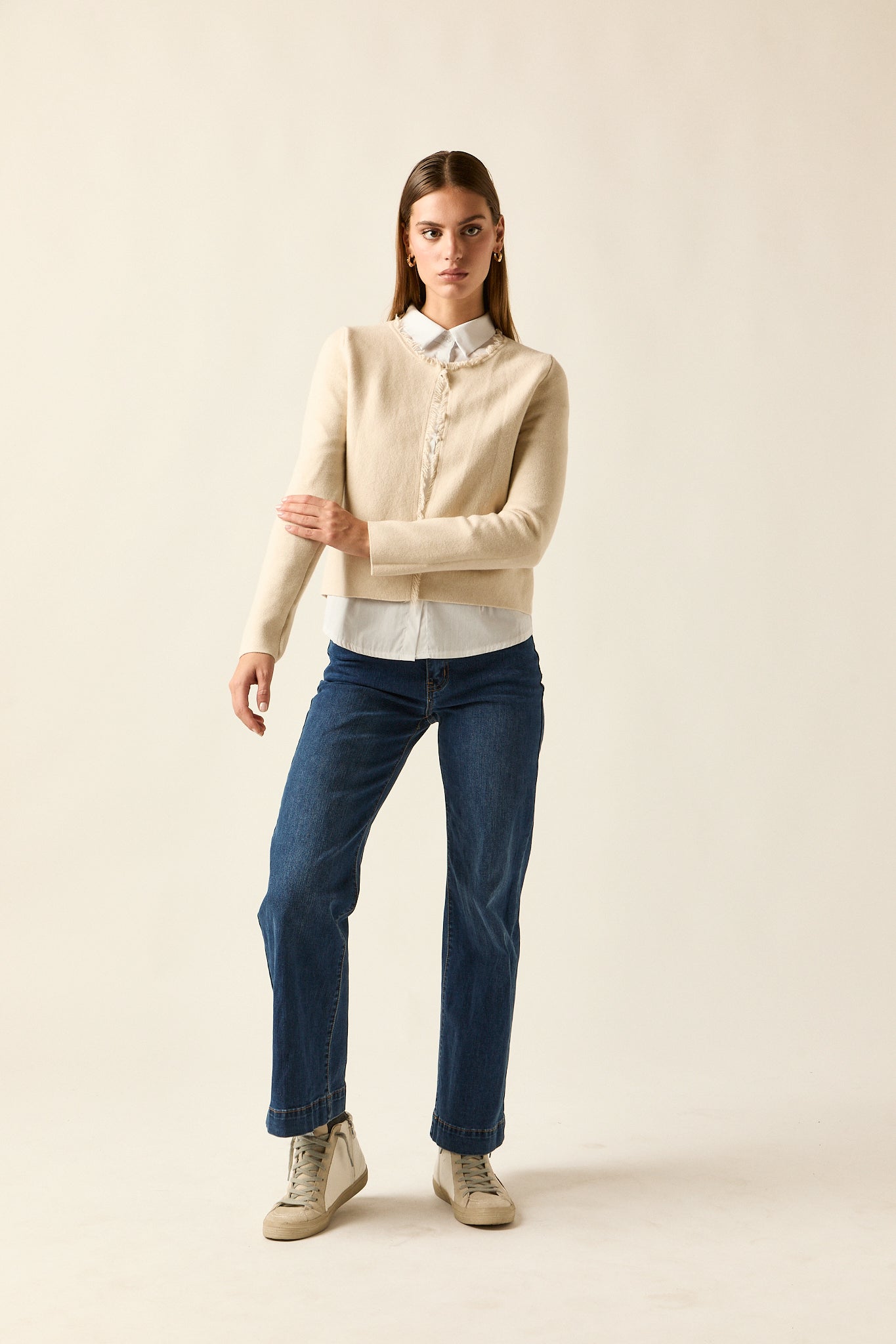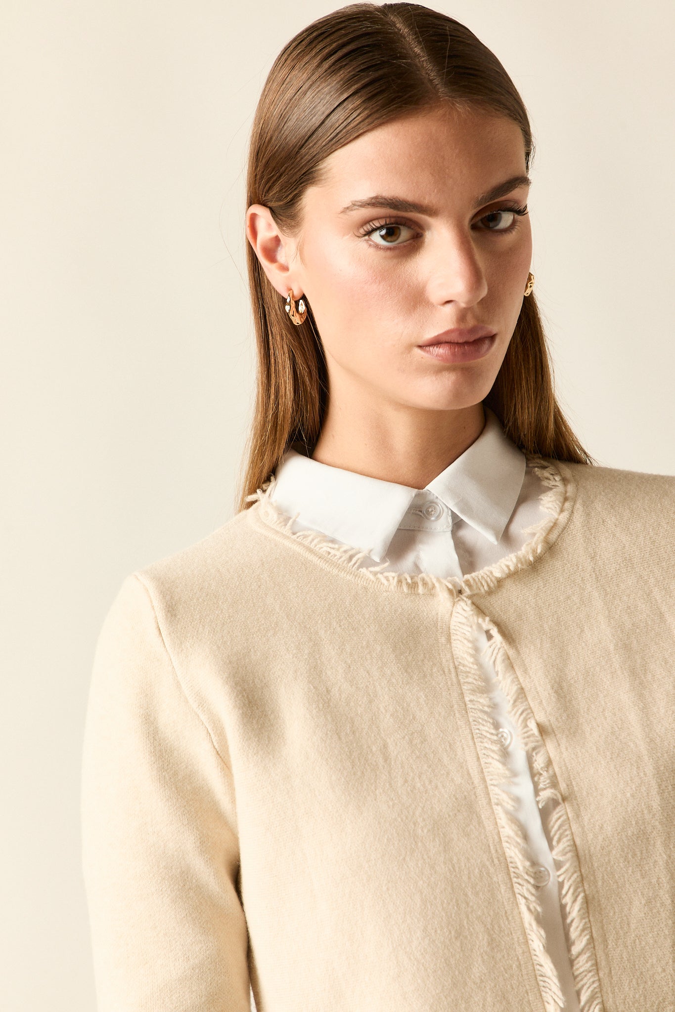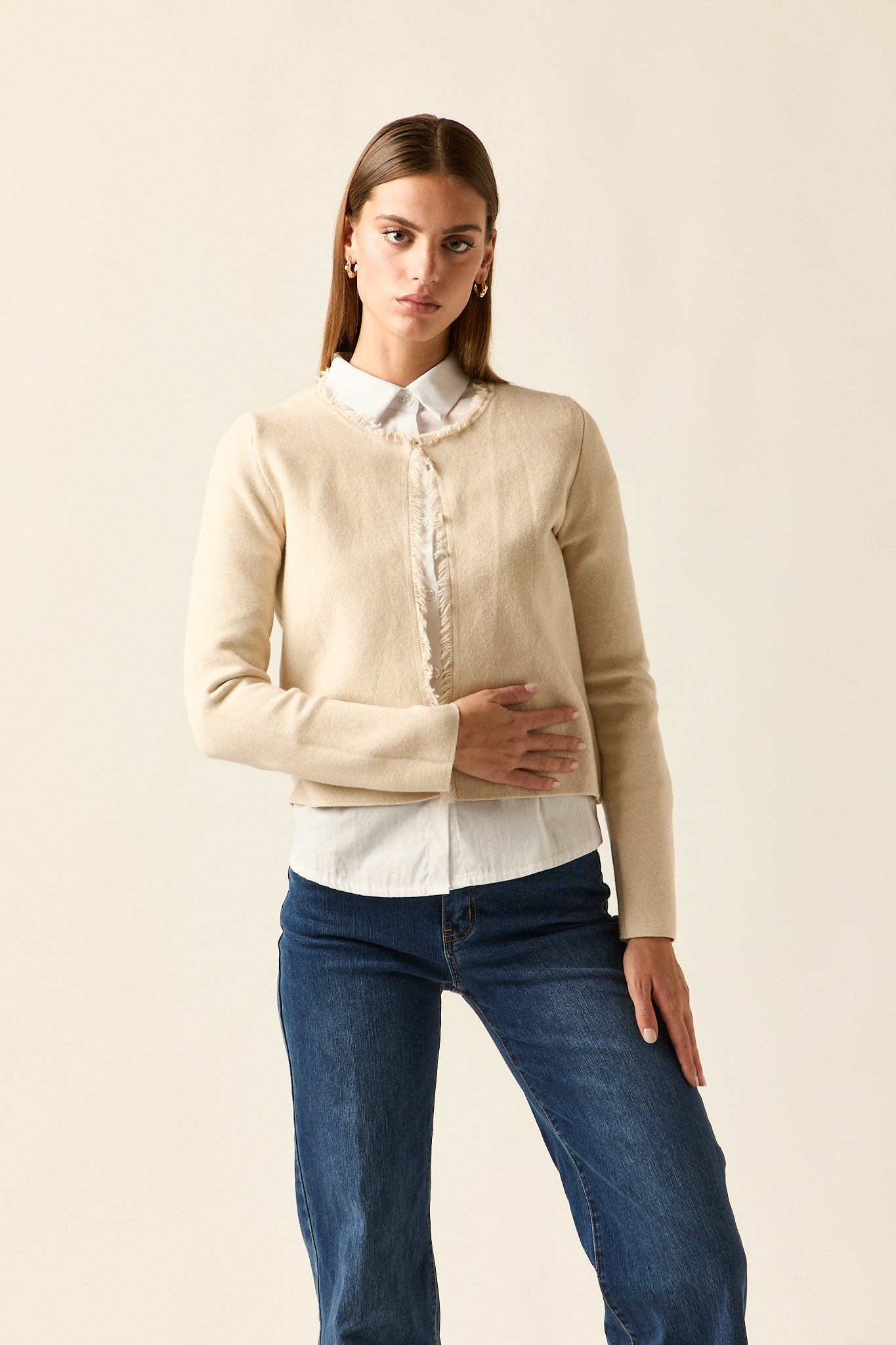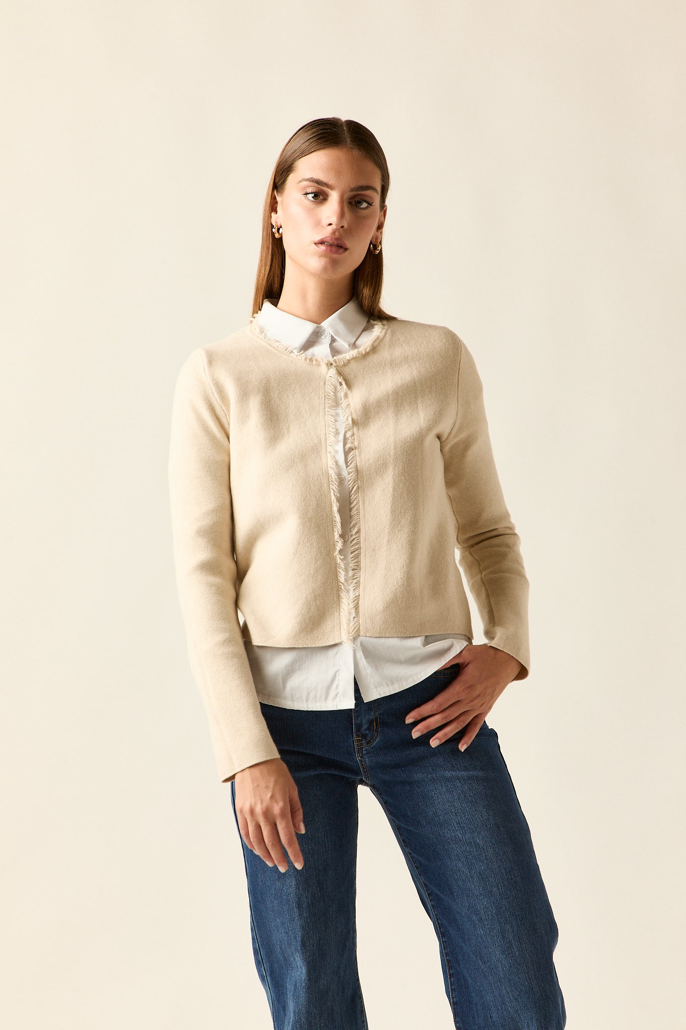 Chaqueta de punto en tono beige con detalle de ribetes deshilachados a modo de flecos. De corte recto y cuello redondo, cuenta con cierre de botones ocultos en la parte frontal que aportan un acabado limpio y sofisticado. Su diseño sencillo pero con textura convierte esta prenda en una opción versátil y con un toque diferente.