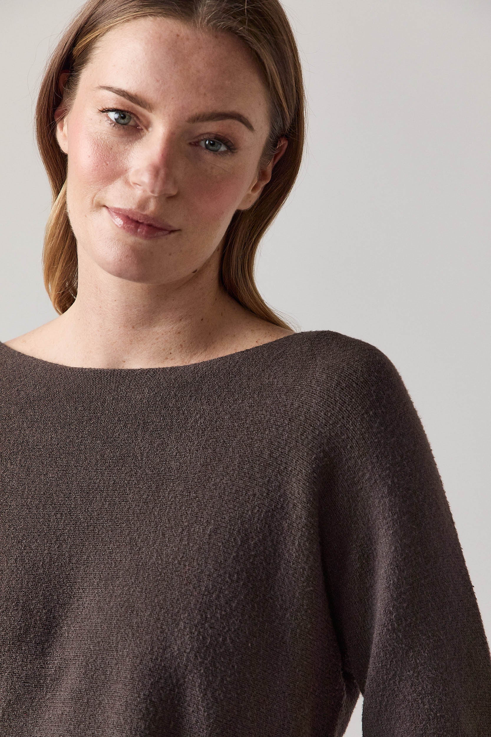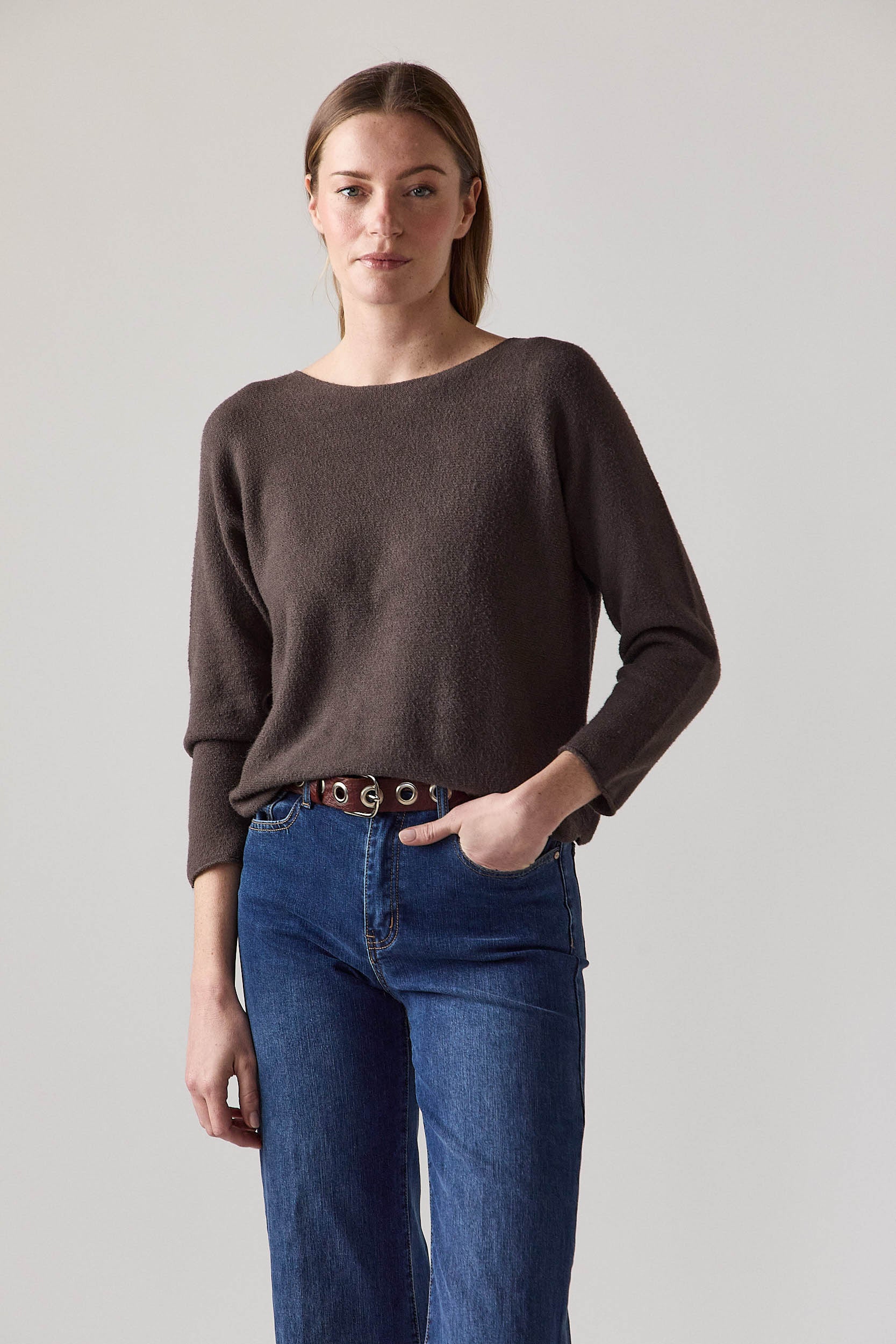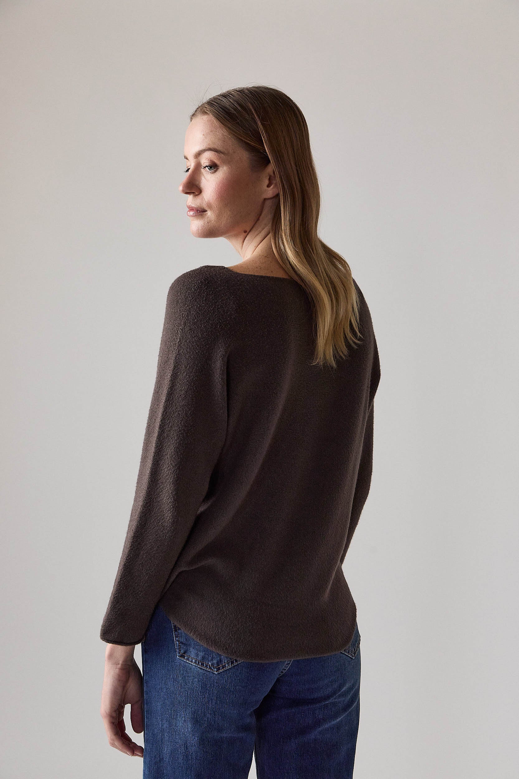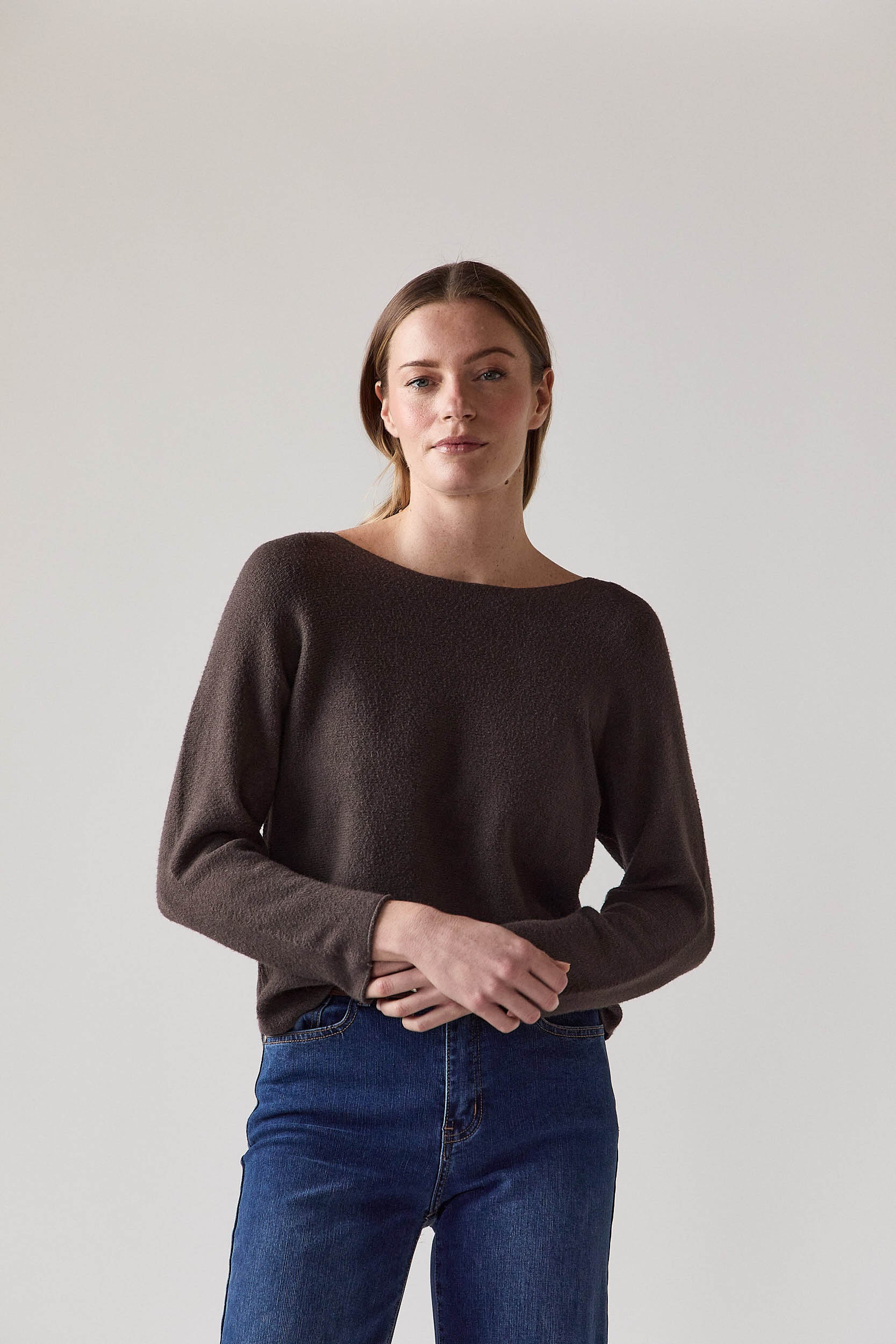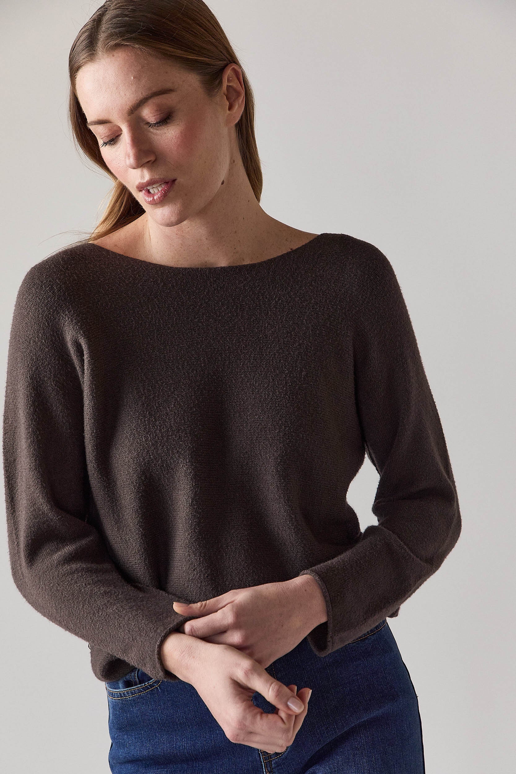 Jersey de punto en color marrón con cuello redondo y corte recto. Diseño limpio y equilibrado, con manga larga y acabados sencillos que aportan una silueta cómoda y natural. El tono profundo del color realza el conjunto y facilita su combinación.