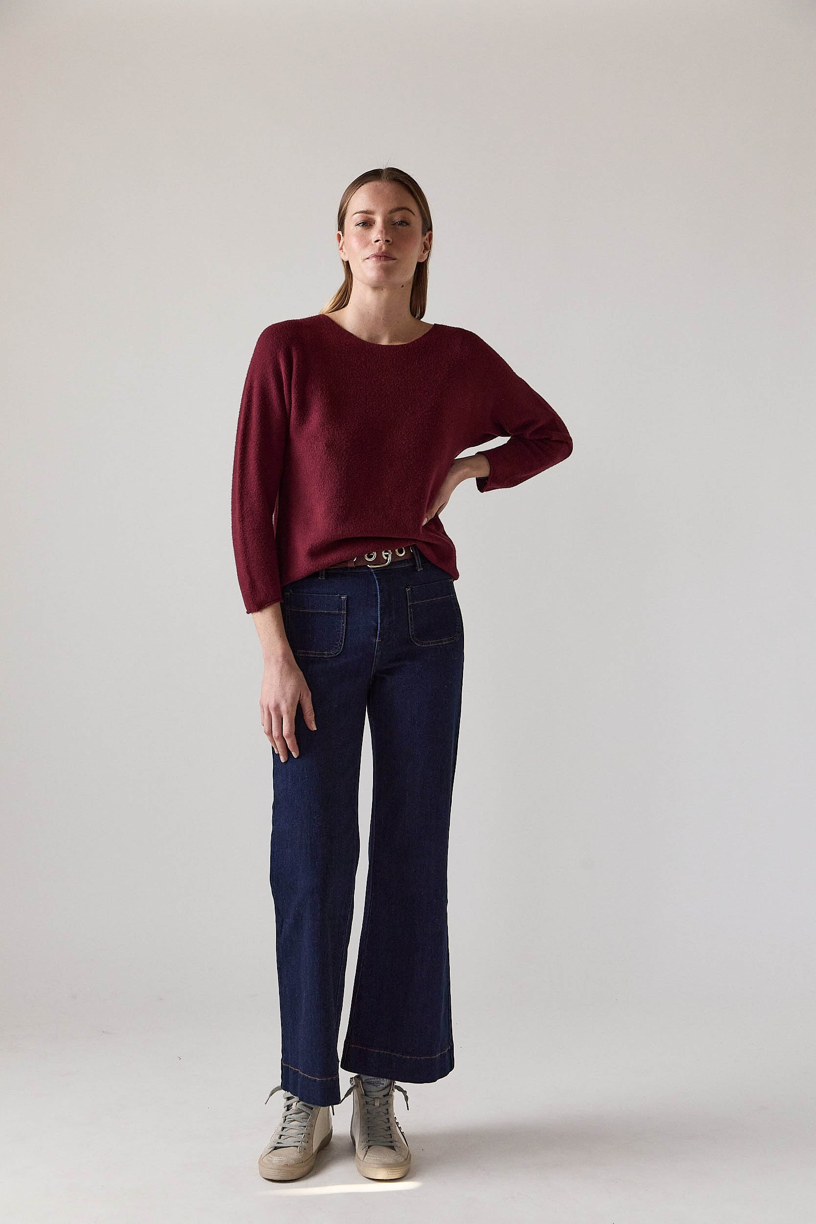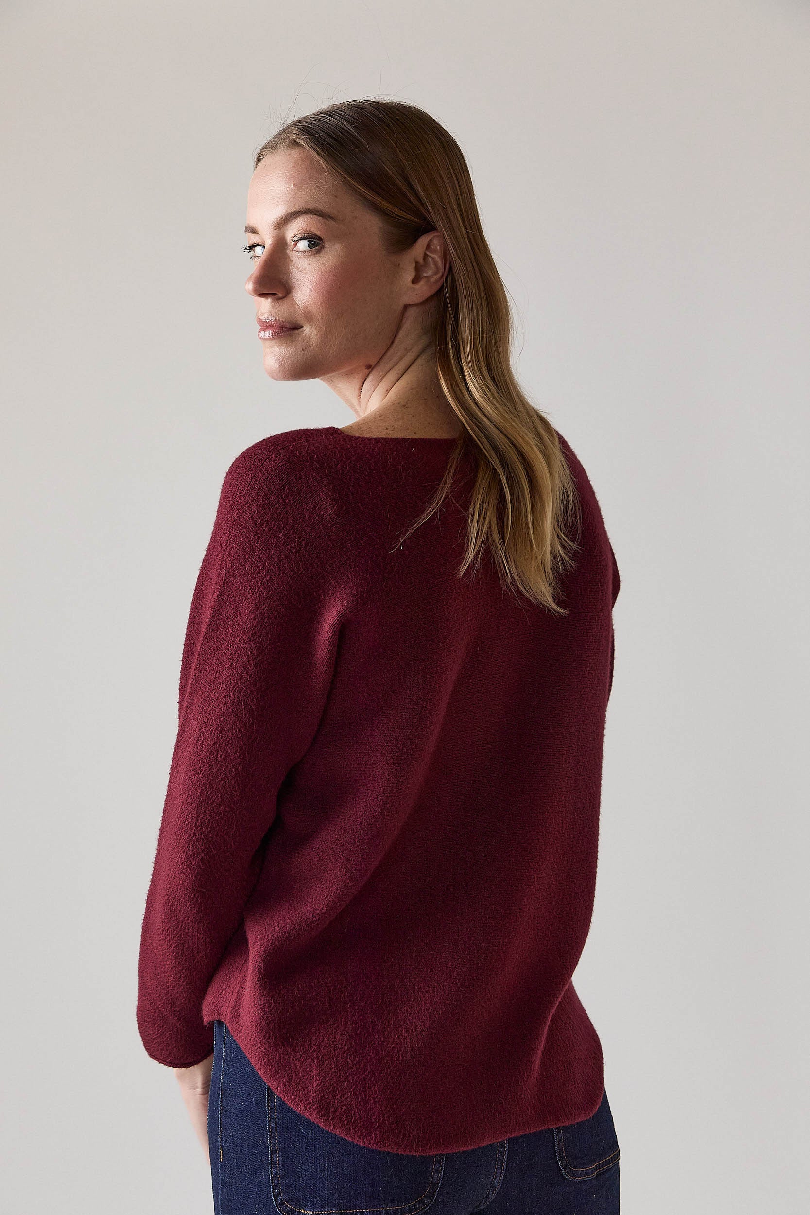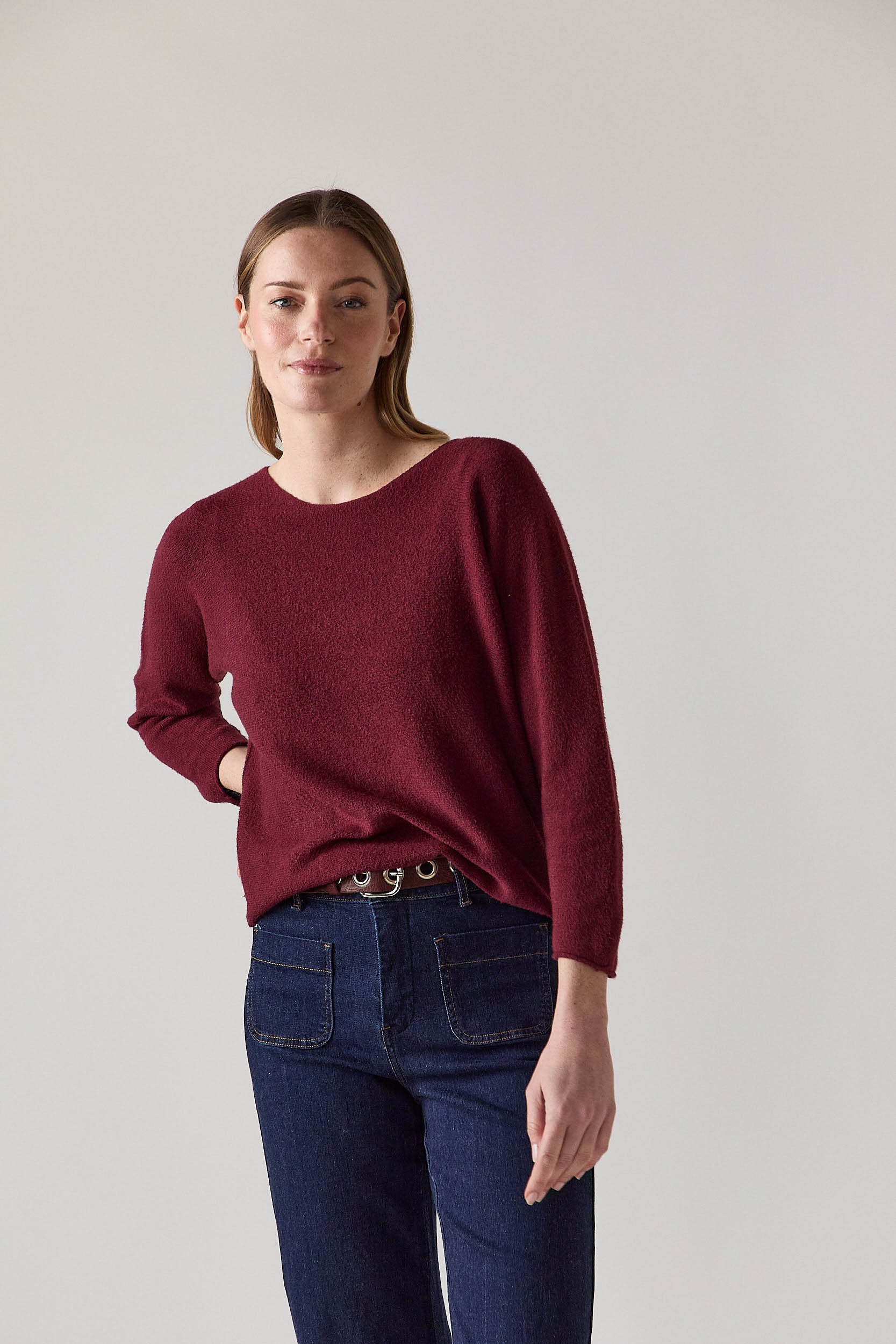 Jersey de punto en color vino con cuello redondo y corte recto. Diseño limpio y equilibrado, con manga larga y acabados sencillos que aportan una silueta cómoda y natural. El tono profundo del color realza el conjunto y facilita su combinación.