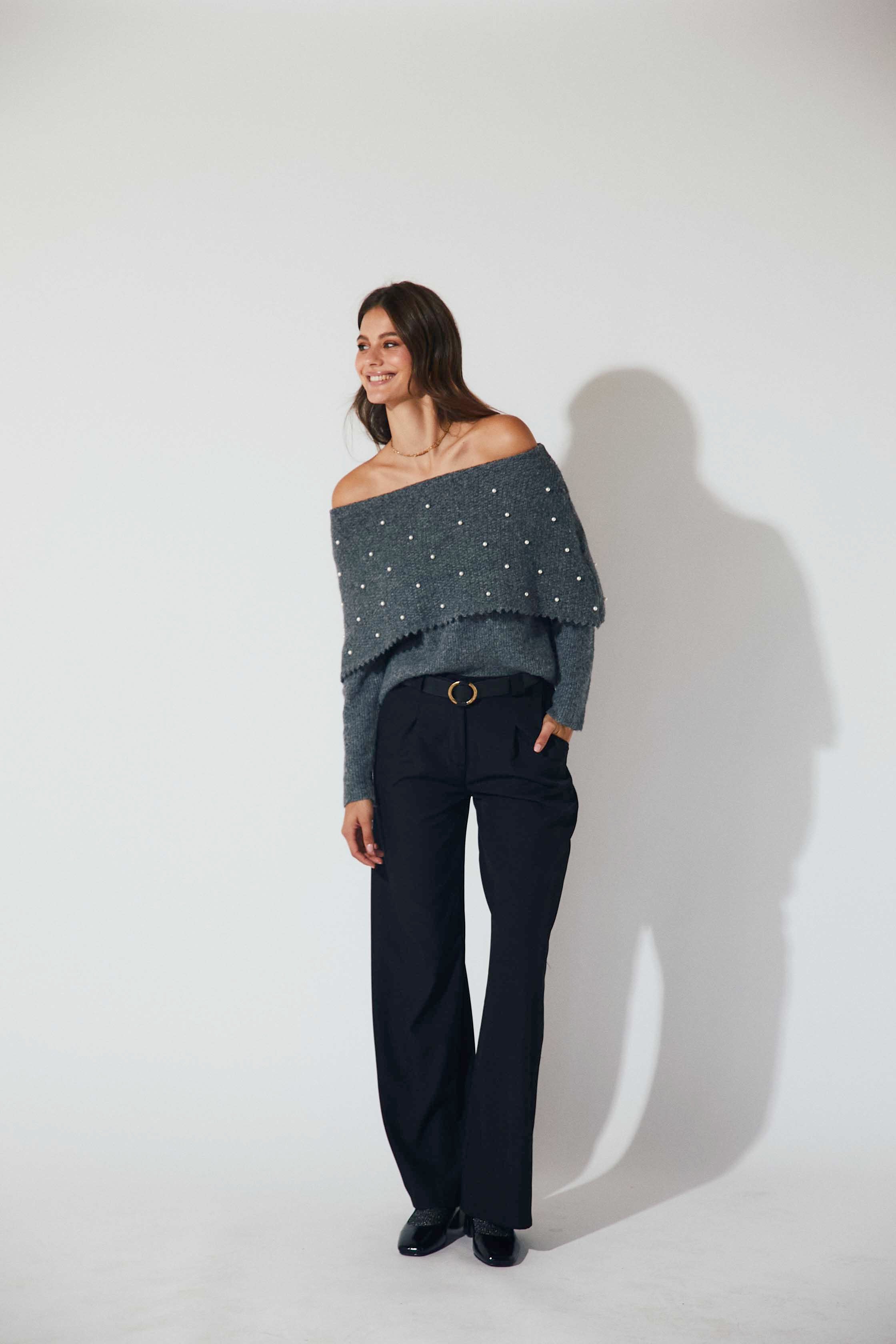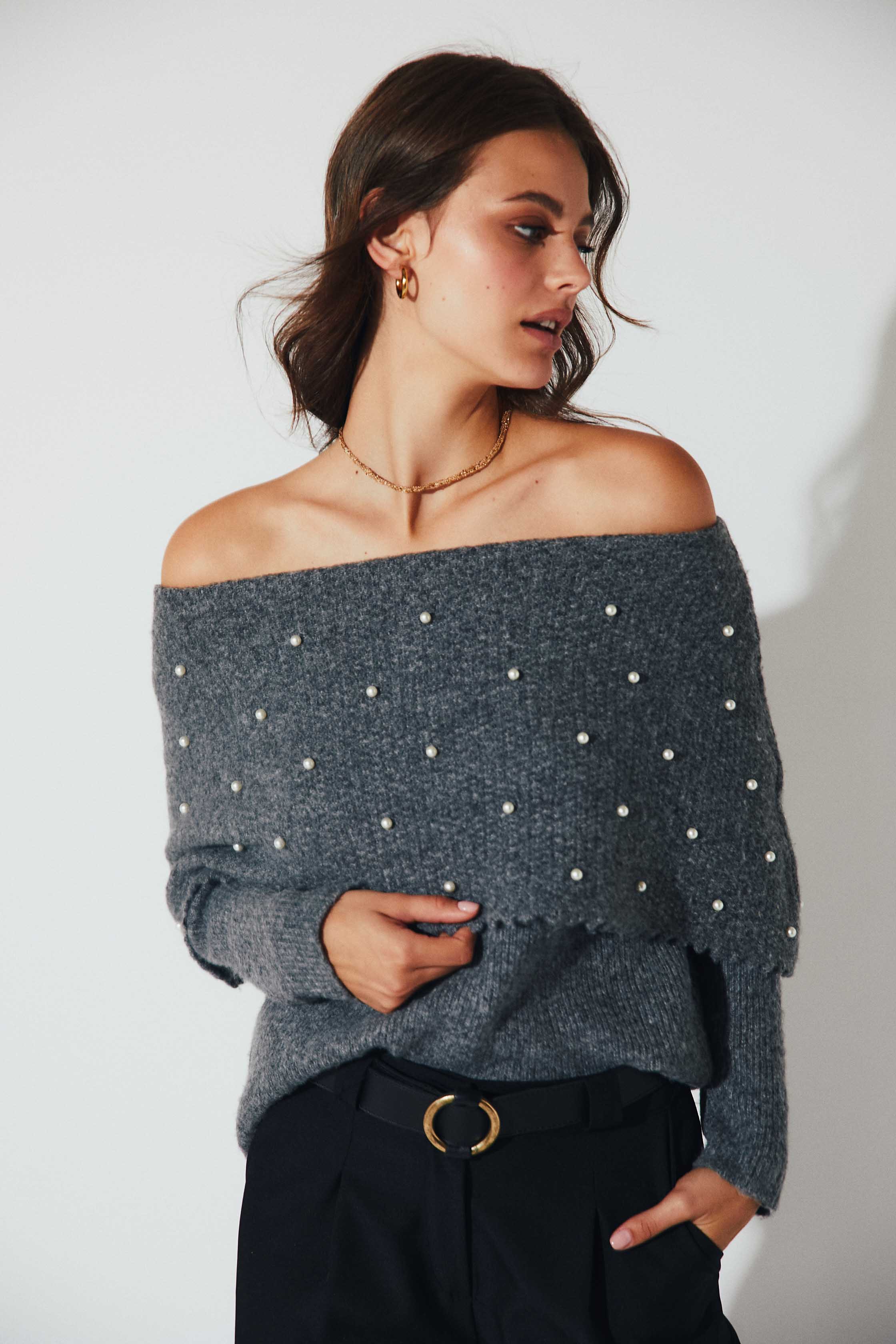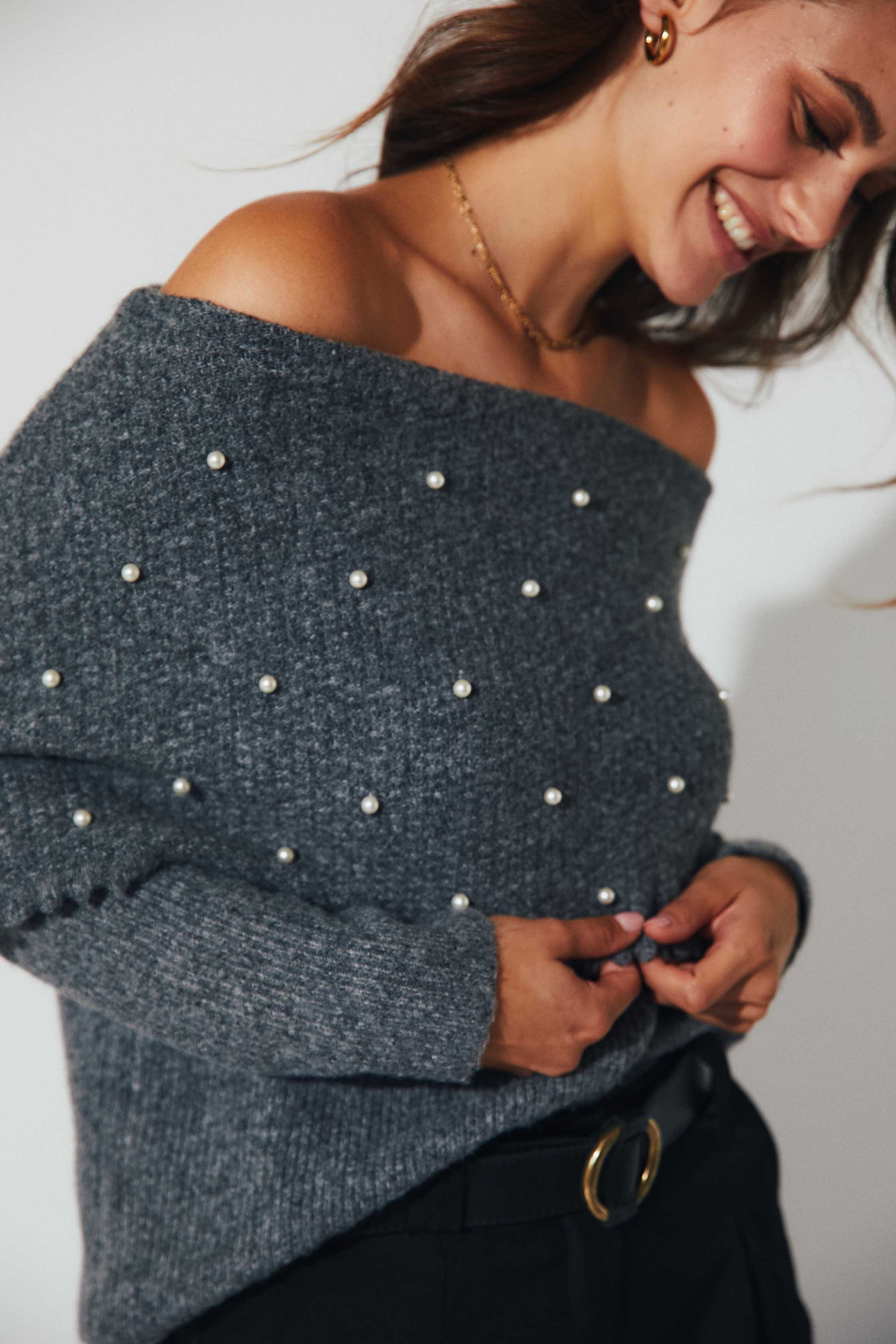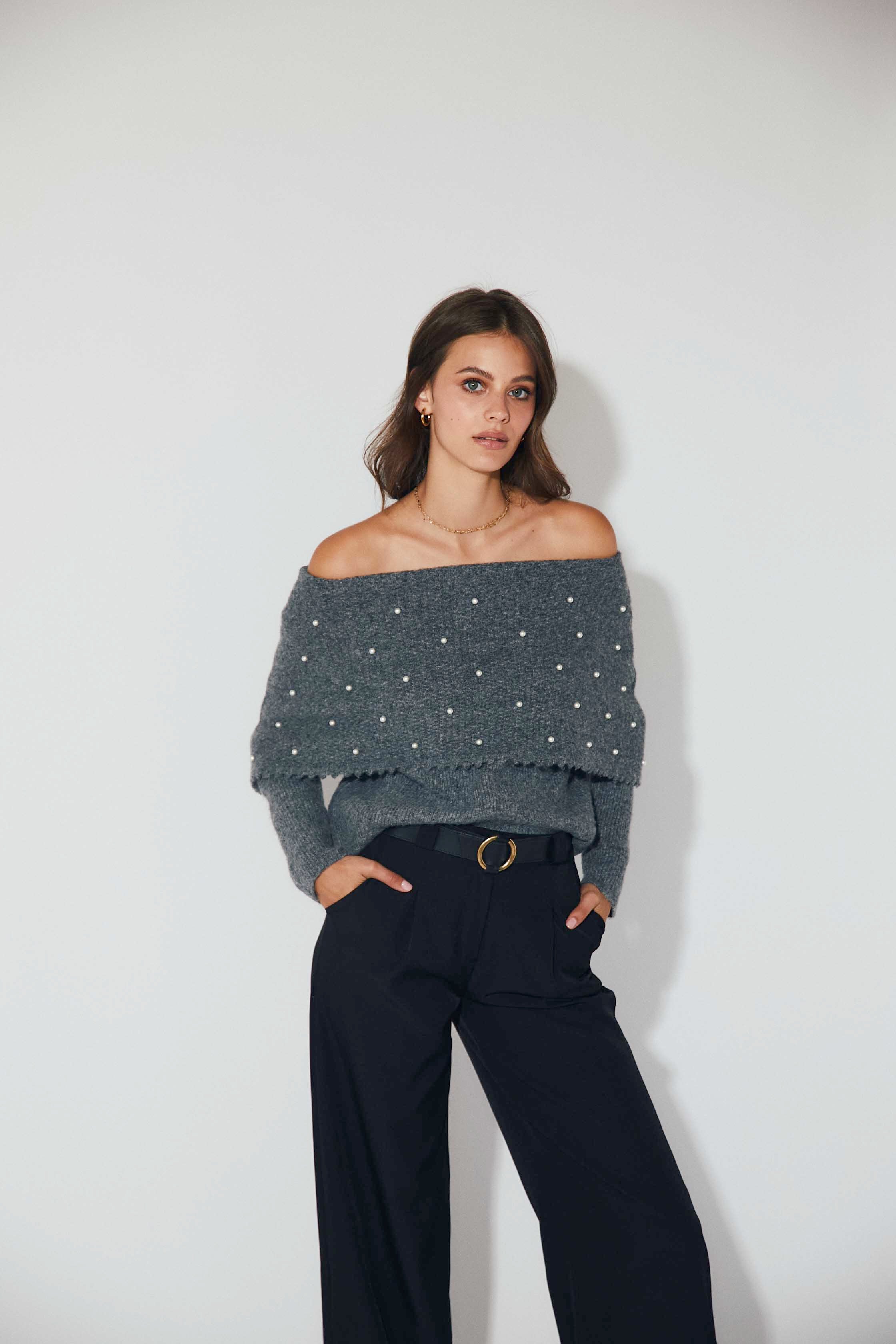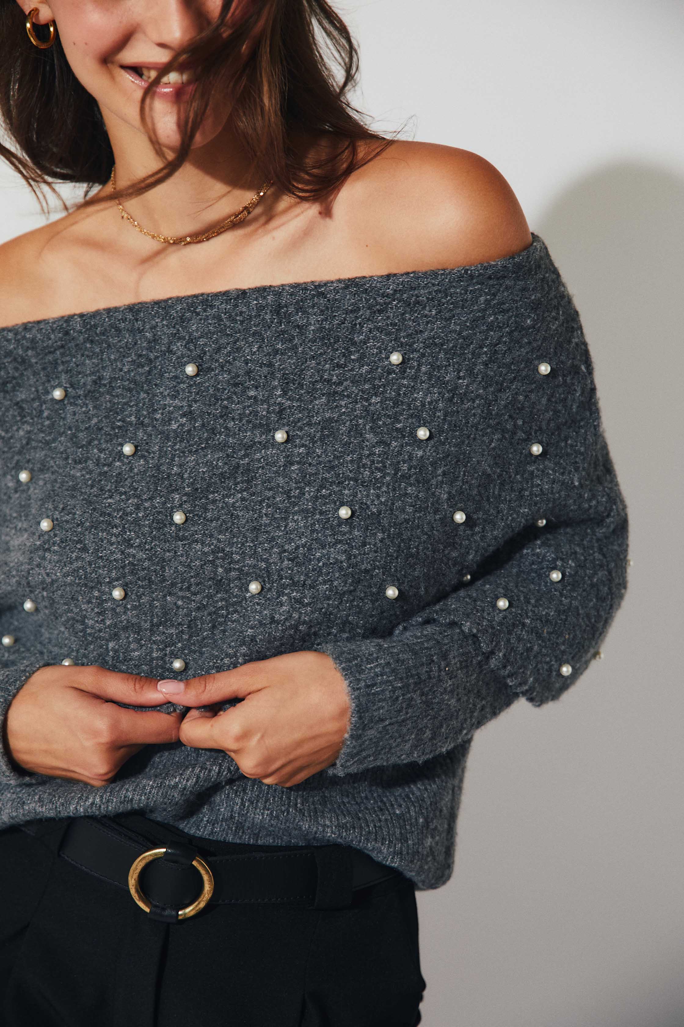Jersey de punto en tono gris con cuello barco y detalle de perlas aplicadas en la parte superior. Diseño de hombros descubiertos, manga larga y acabado con sutil canalé en puños y bajo. Su textura suave y su caída relajada aportan un toque femenino y actual al look.