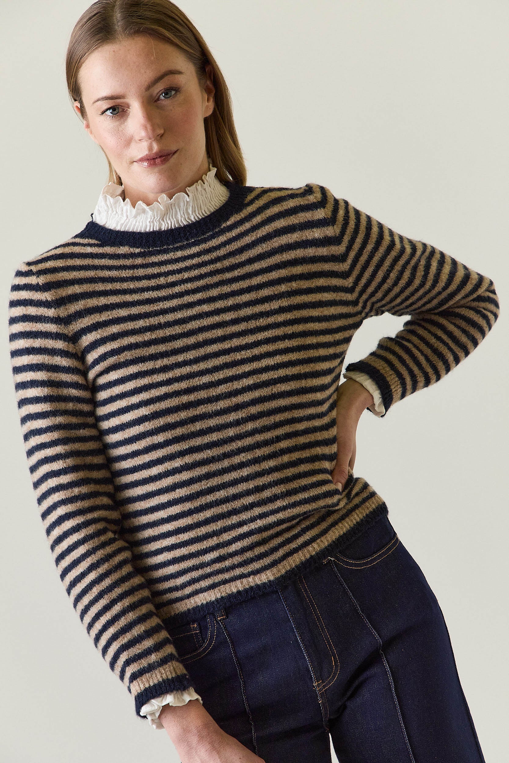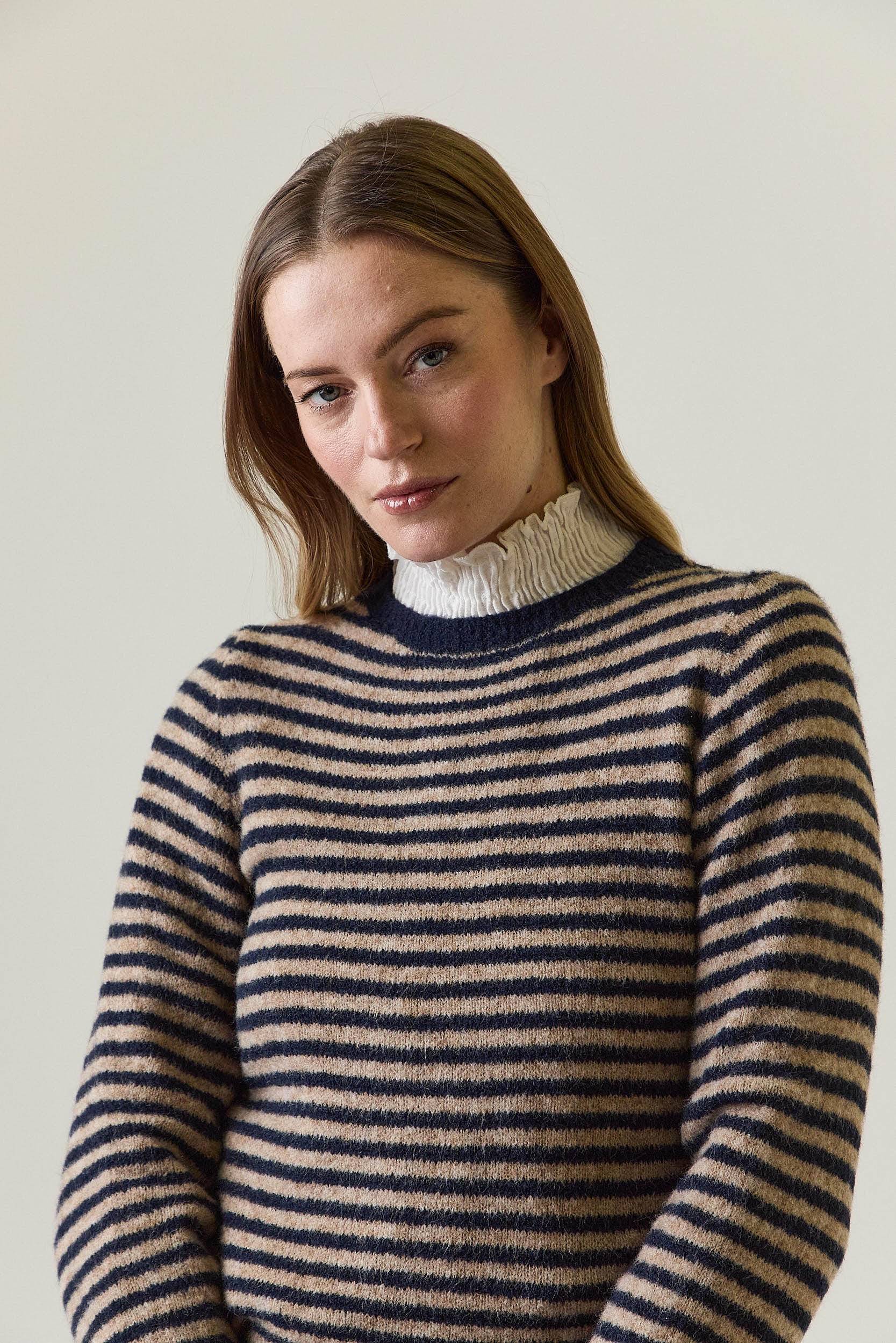 Jersey de punto con diseño de rayas en tono azul marino combinado con beige. Presenta cuello redondo acanalado y manga larga, con un corte recto que se adapta con naturalidad al cuerpo. El juego de rayas aporta ritmo visual sin recargar, manteniendo una silueta equilibrada y fácil de llevar.