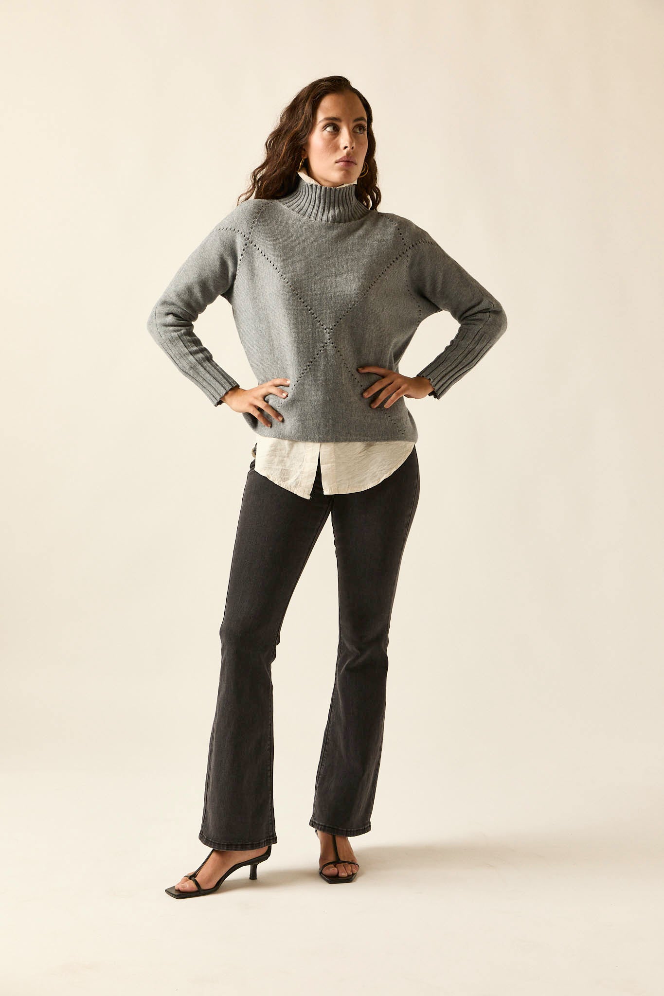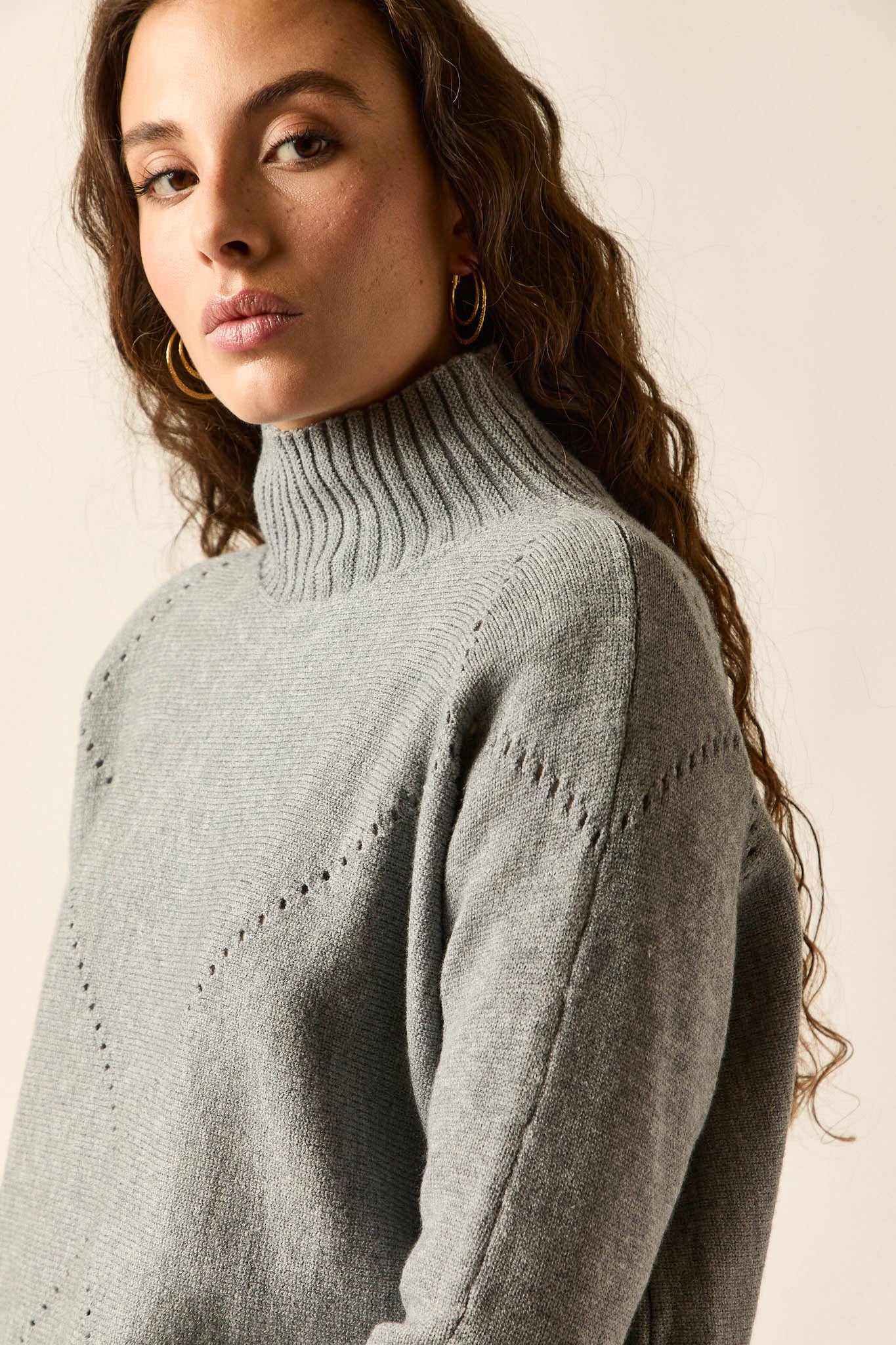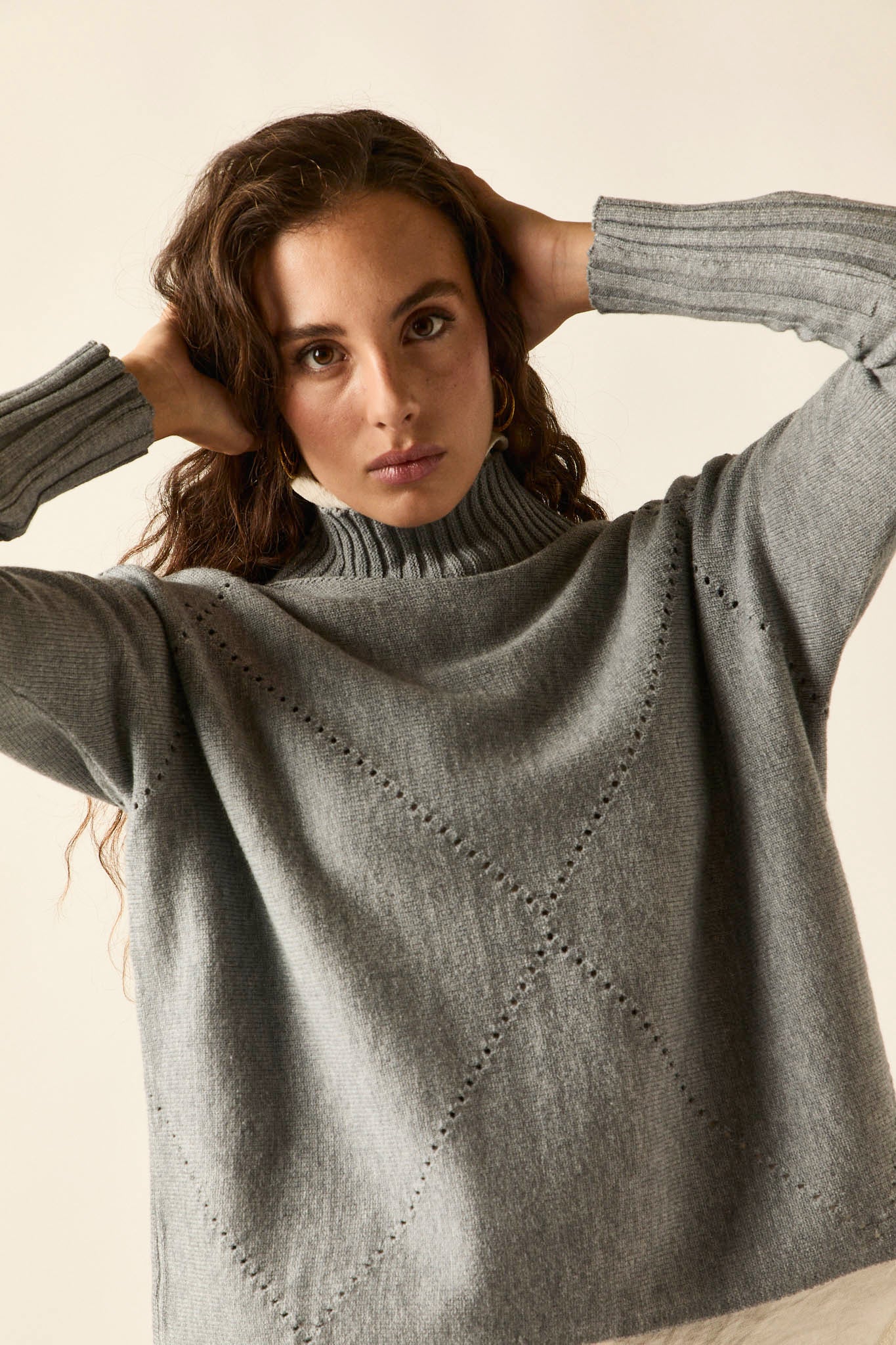 Jersey en tono gris con cuello vuelto de canalé. Presenta diseño de rombos calados en el frontal y mangas, aportando un aire femenino y ligero. Su silueta recta y el acabado de punto suave lo convierten en una prenda cómoda y versátil para la temporada.