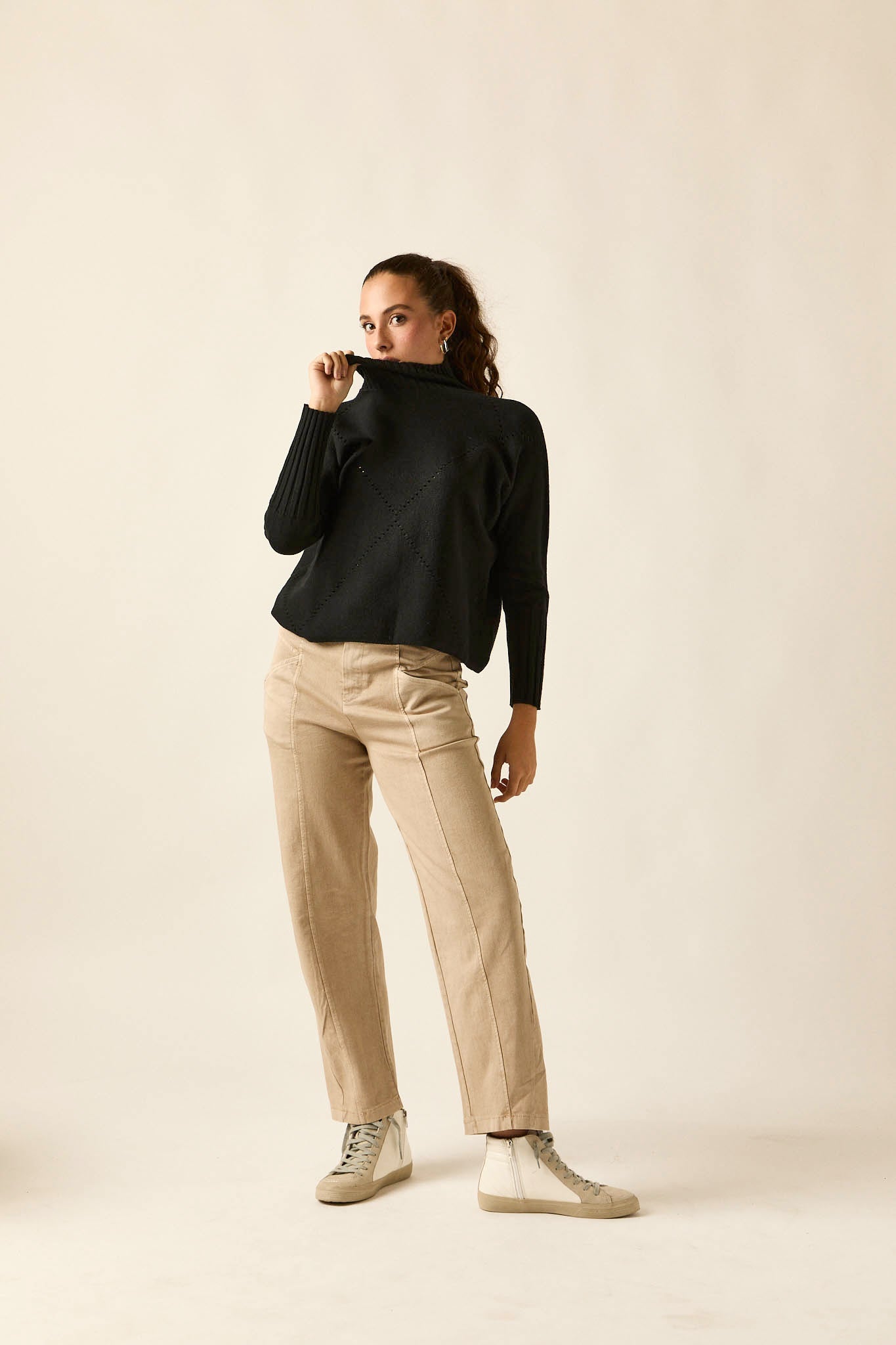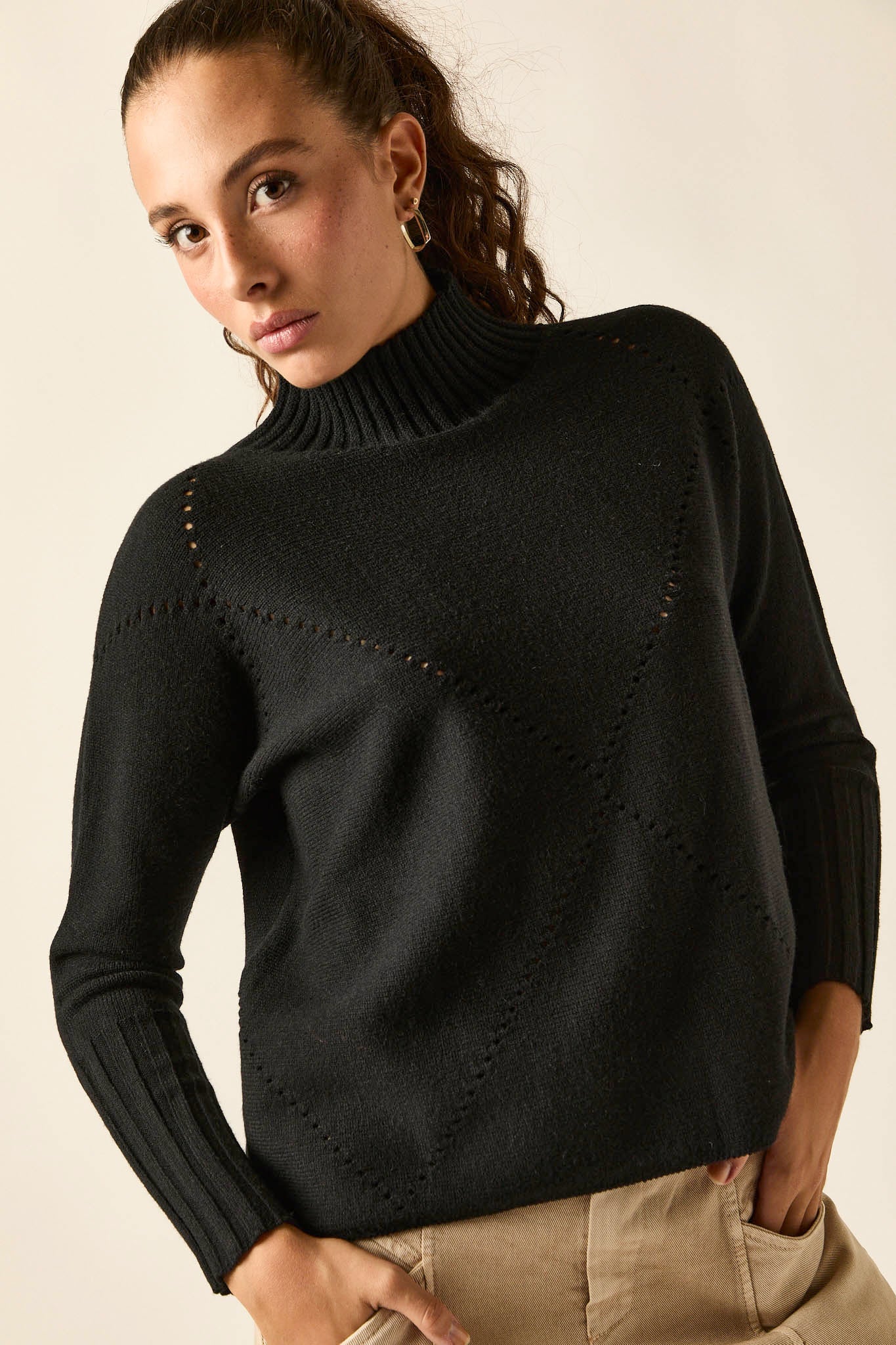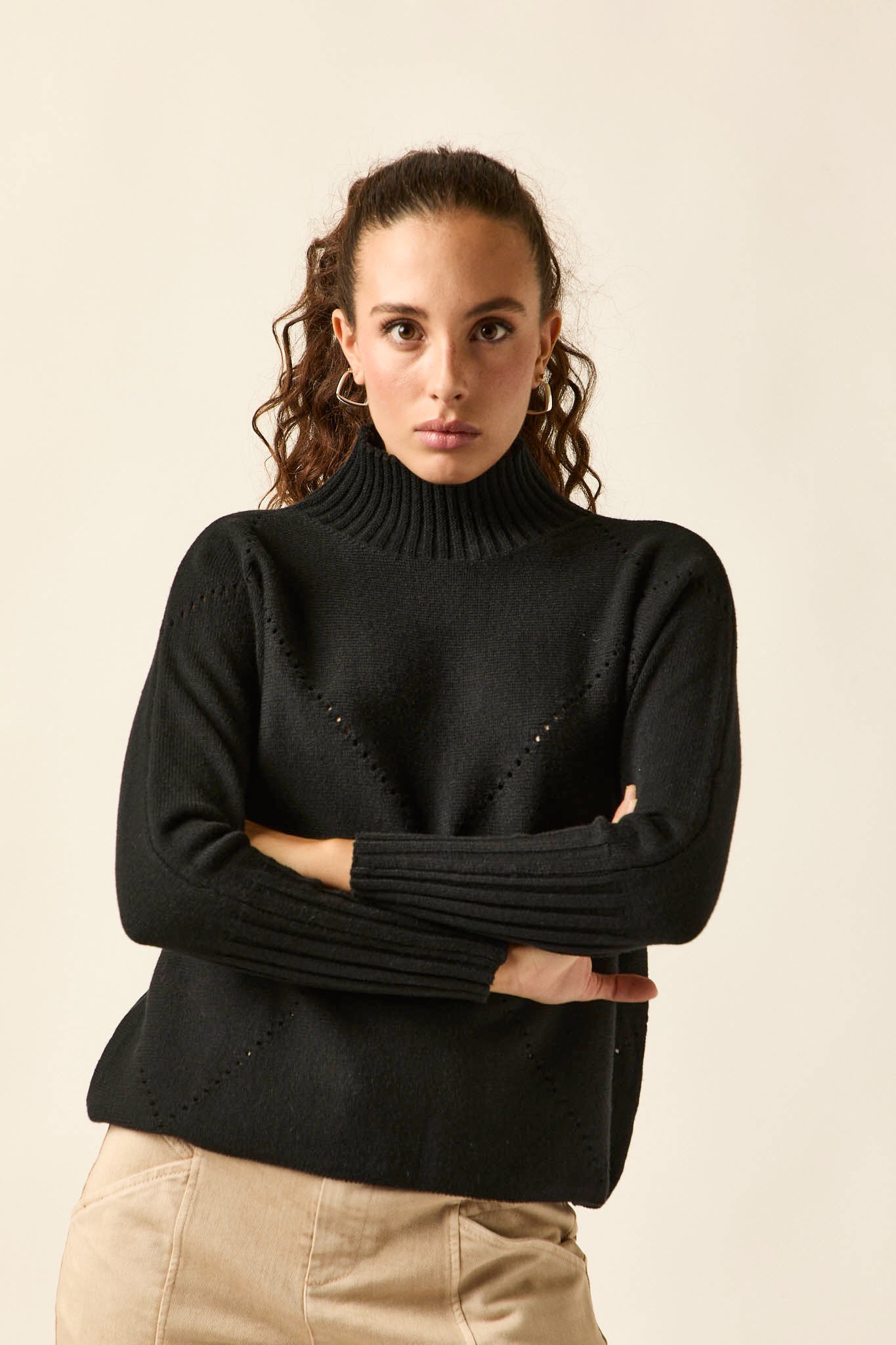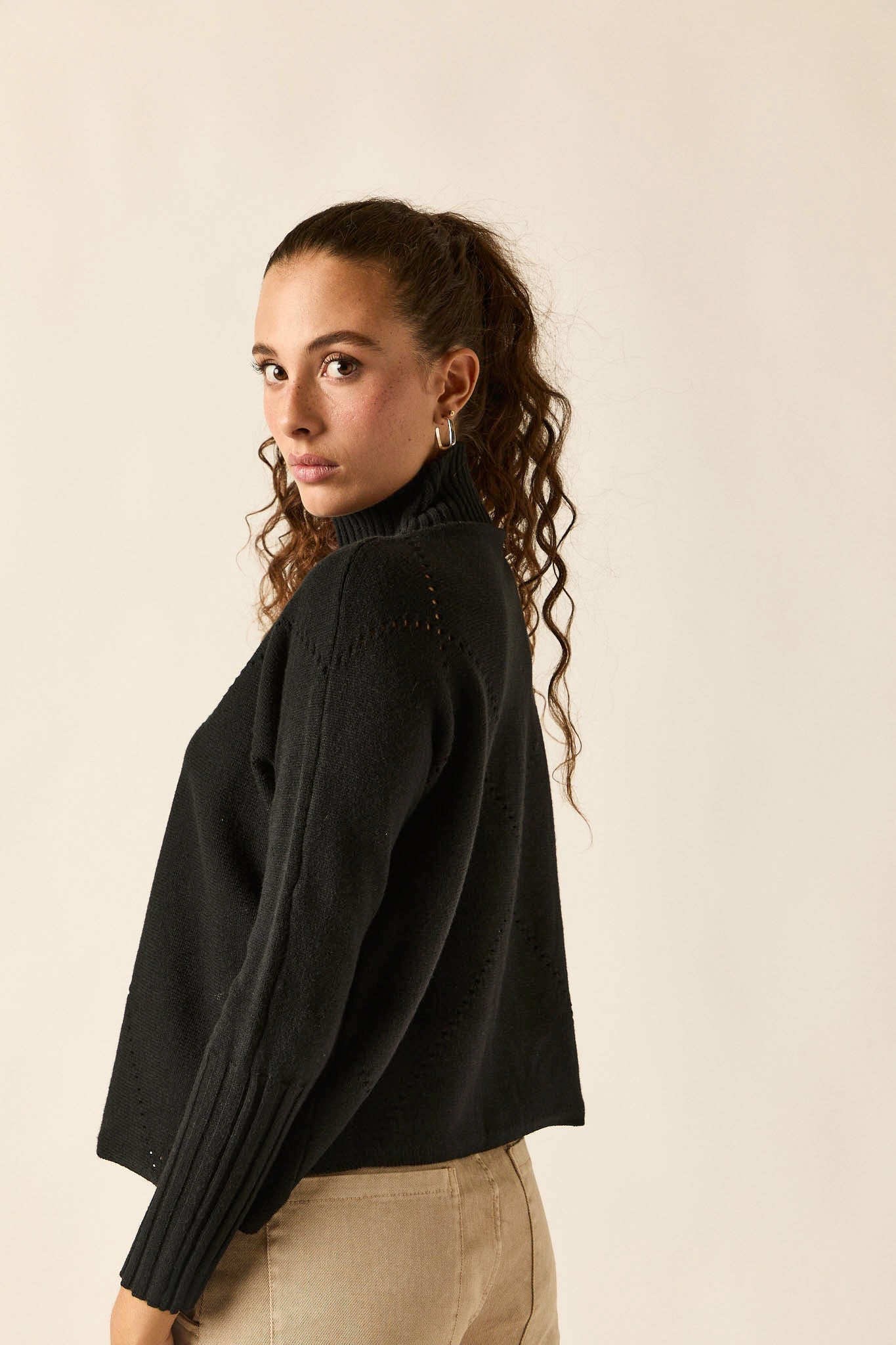 Jersey en tono negro con cuello vuelto de canalé. Presenta diseño de rombos calados en el frontal y mangas, aportando un aire femenino y ligero. Su silueta recta y el acabado de punto suave lo convierten en una prenda cómoda y versátil para la temporada.