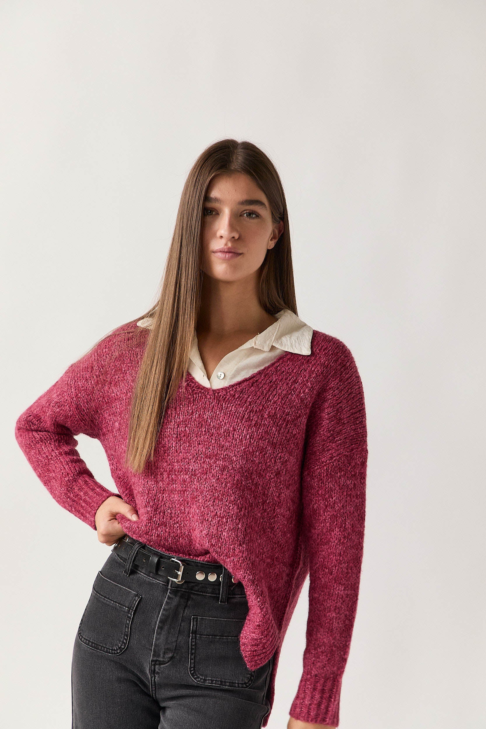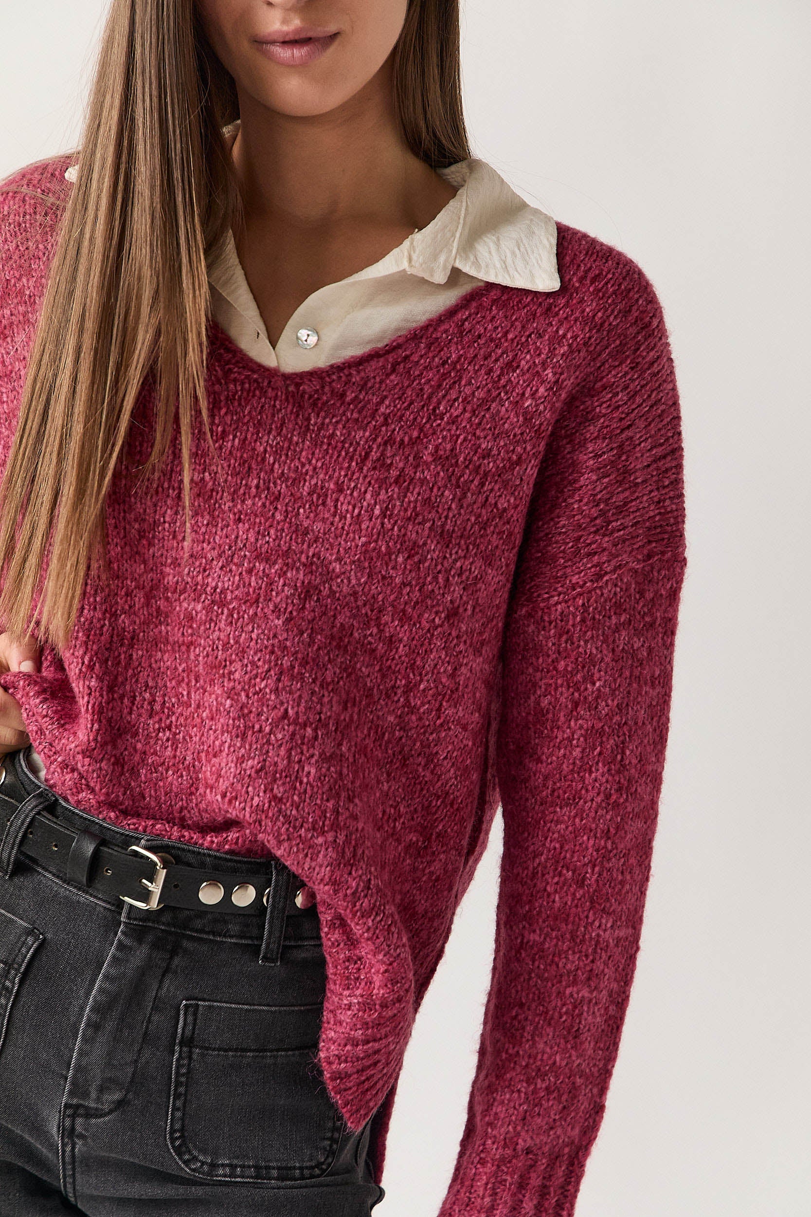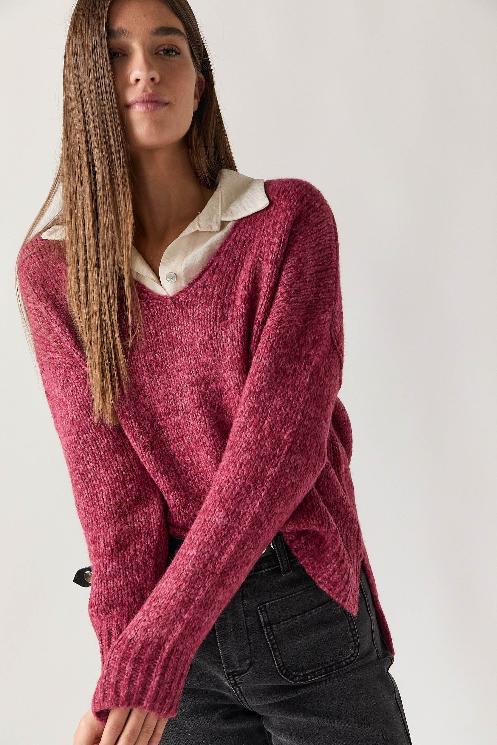 Jersey de punto rústico en tono rosa con cuello pico y hombros caídos. Presenta silueta relajada, bajo con aberturas laterales y remate acanalado en puños y cintura. Su textura suave y el corte holgado aportan comodidad y un aire desenfadado.