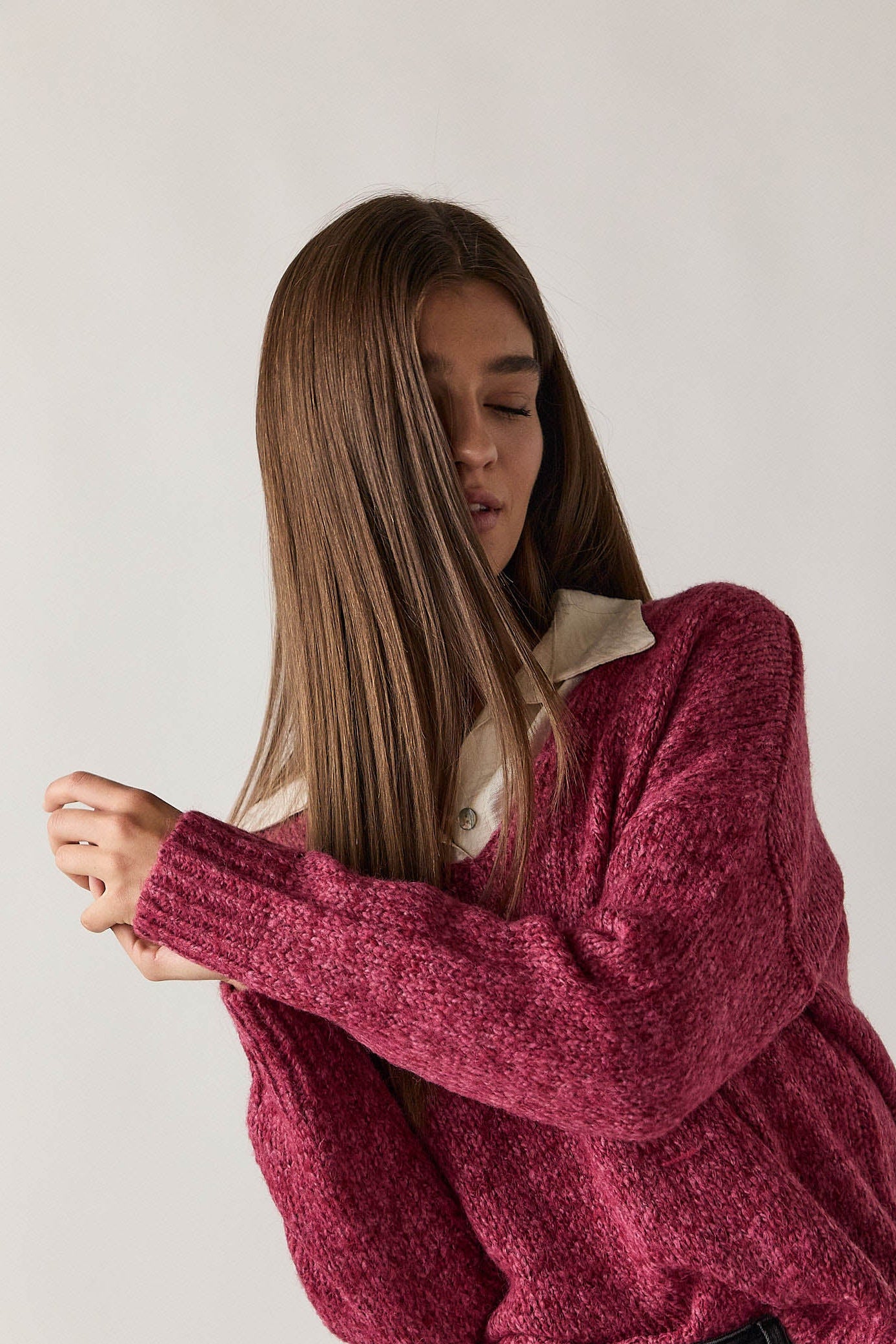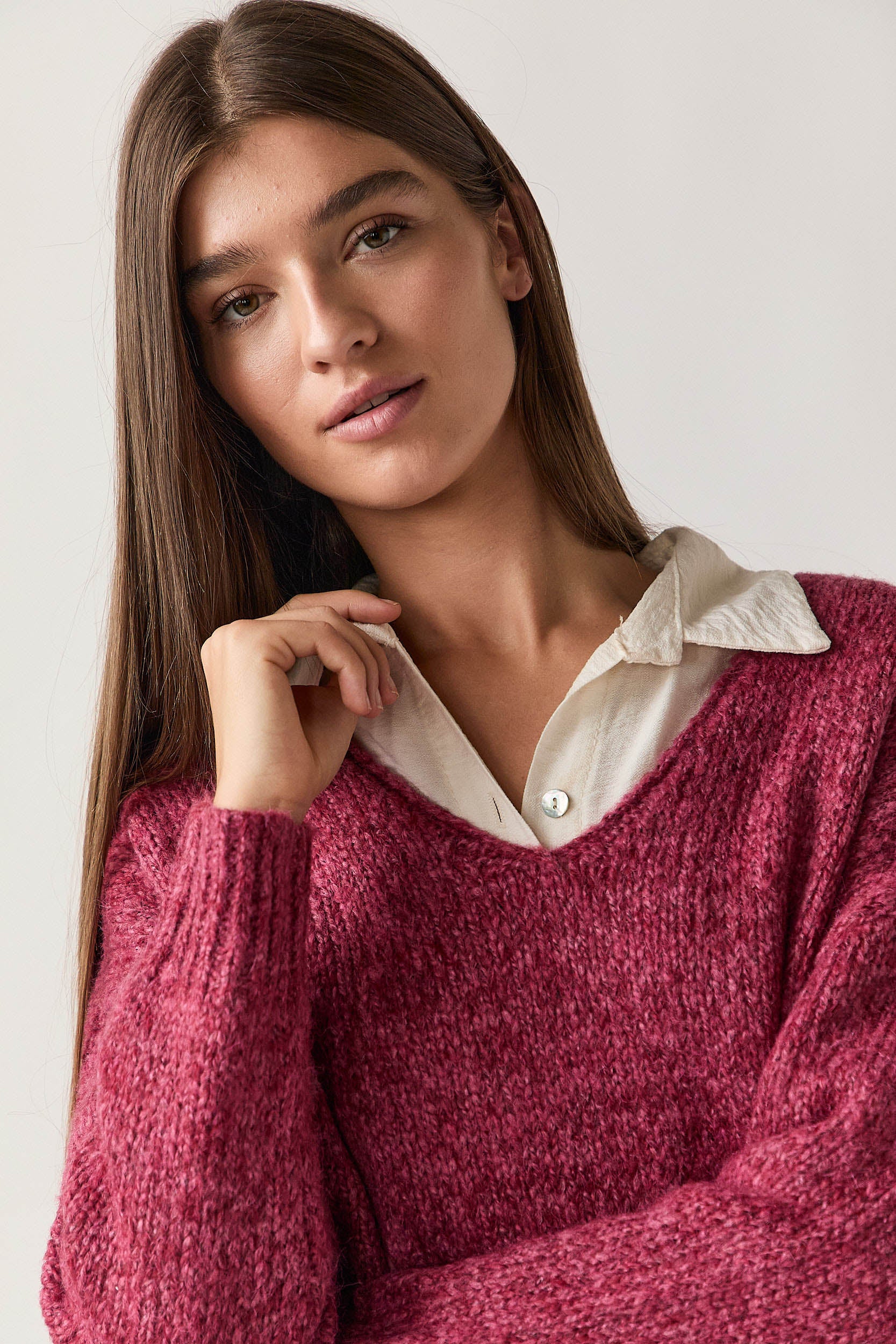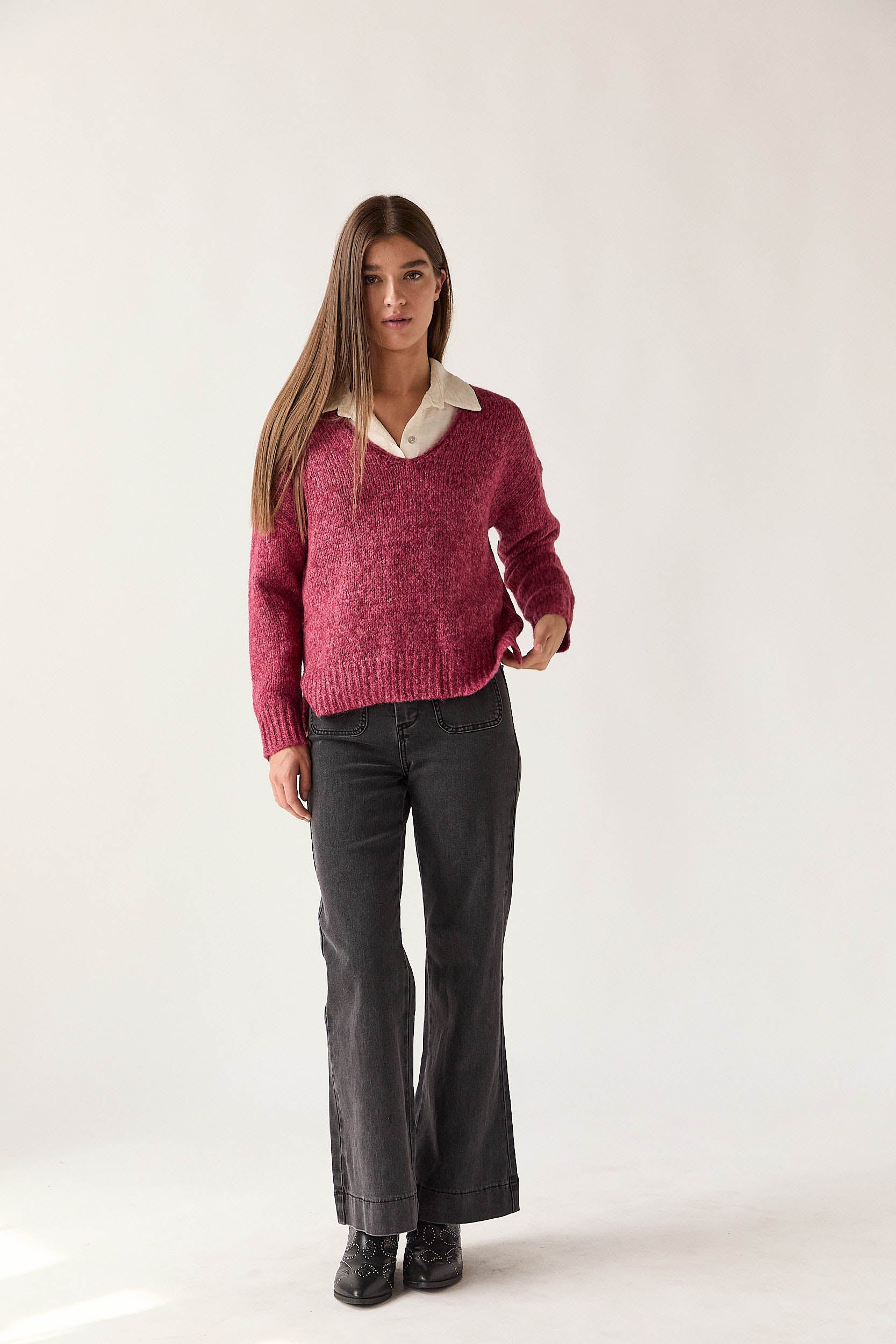 Jersey de punto rústico en tono rosa con cuello pico y hombros caídos. Presenta silueta relajada, bajo con aberturas laterales y remate acanalado en puños y cintura. Su textura suave y el corte holgado aportan comodidad y un aire desenfadado.