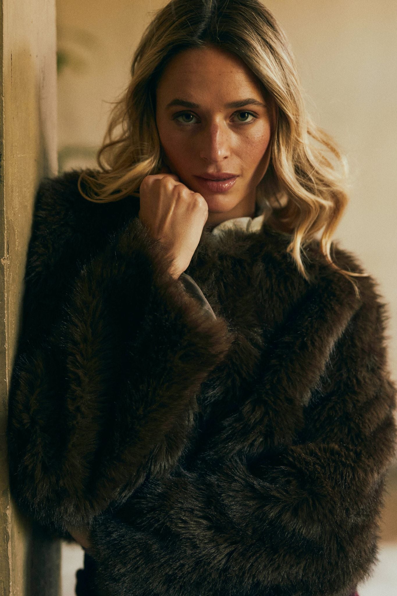 Abrigo corto de pelo sintético en tono marrón chocolate. Presenta cuello redondo, manga larga y cierre oculto en la parte frontal. Su textura suave y mullida aporta calidez y un aire sofisticado, perfecto para los looks de invierno.