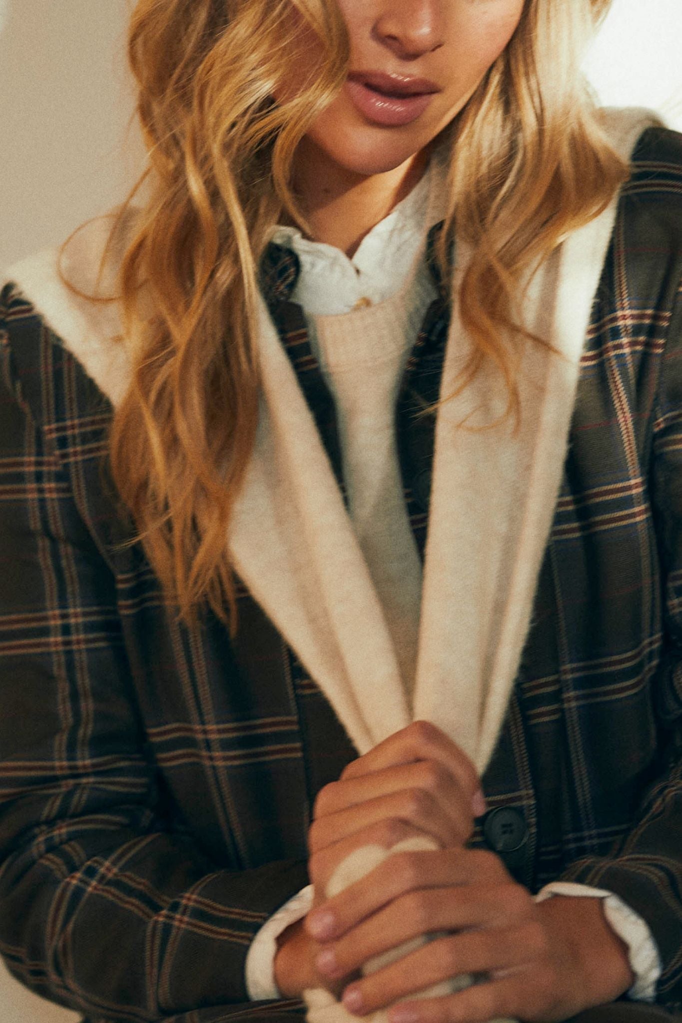 Jersey de punto suave en tono crudo con diseño de efecto capa sobre los hombros. Presenta cuello redondo, hombros caídos y acabado acanalado en puños y bajo. Su silueta relajada y textura esponjosa aportan un aire cálido y sofisticado al look.