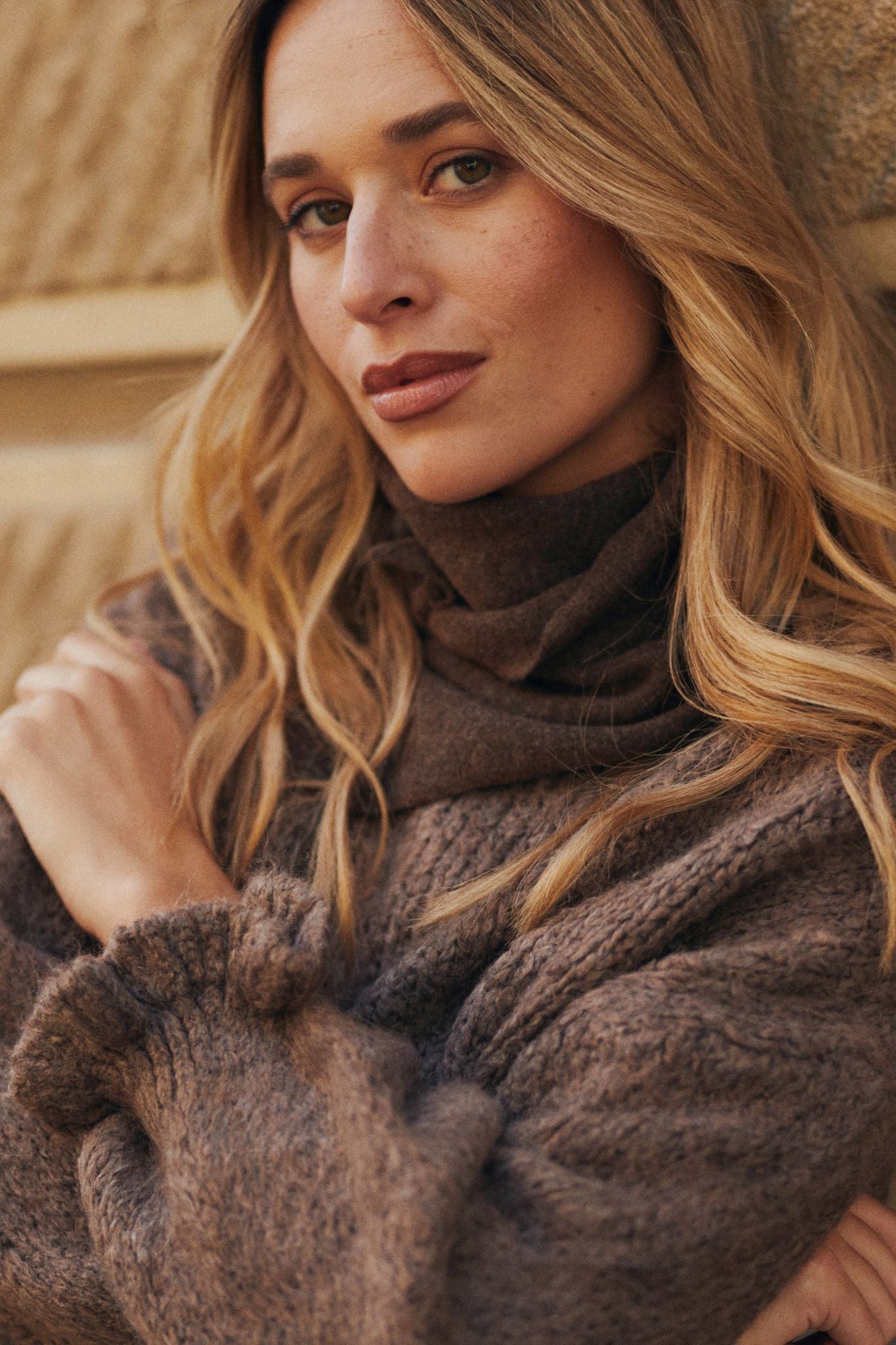 Jersey de punto rústico en tono topo con cuello redondo y manga larga. Destaca por su acabado en puños con volante sutil, que aporta un toque femenino al diseño. Su corte relajado y textura suave hacen de él una prenda cómoda y versátil para los días fríos.