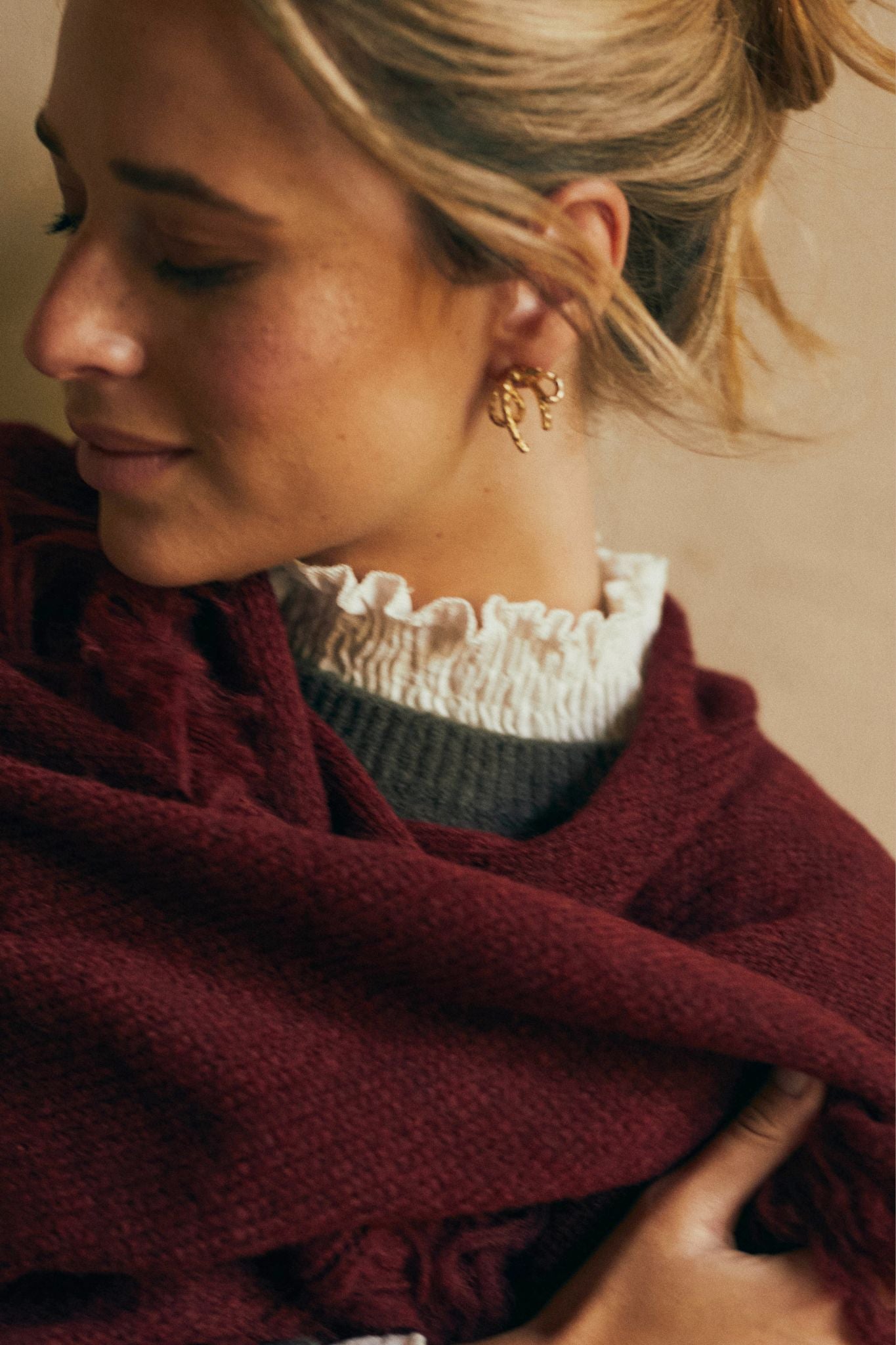 Pendientes dorados en forma de lazo con acabado texturizado. Su diseño pequeño y con volumen aporta un toque femenino y original, perfecto para dar luz y estilo a tus looks diarios o más especiales.