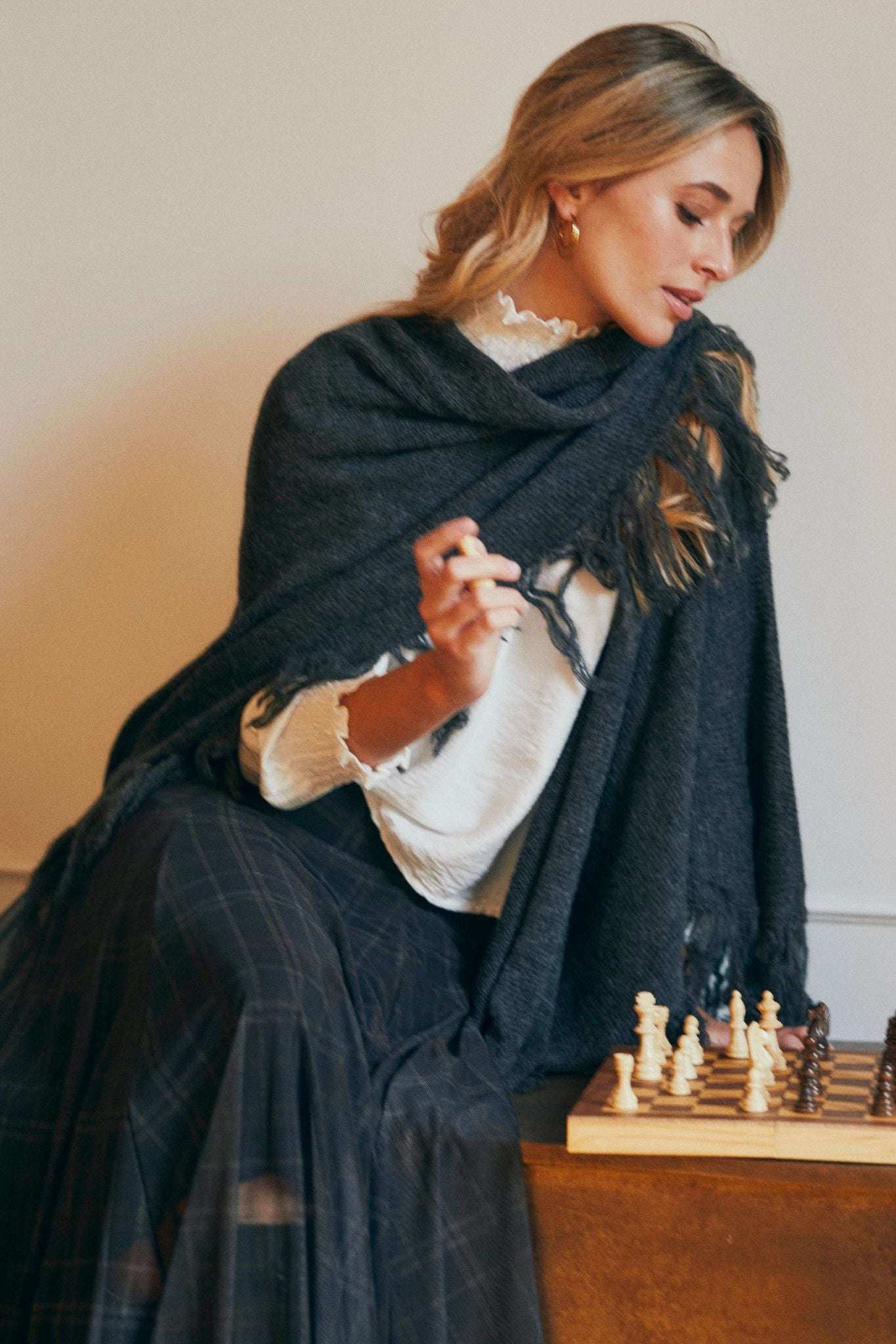 Poncho de punto suave en tono gris antracita con acabado de flecos en el borde. Presenta caída fluida y silueta envolvente, perfecta para llevar sobre camisas, jerséis o abrigos ligeros. Su diseño versátil y cálido lo convierte en un imprescindible para los meses más fríos.