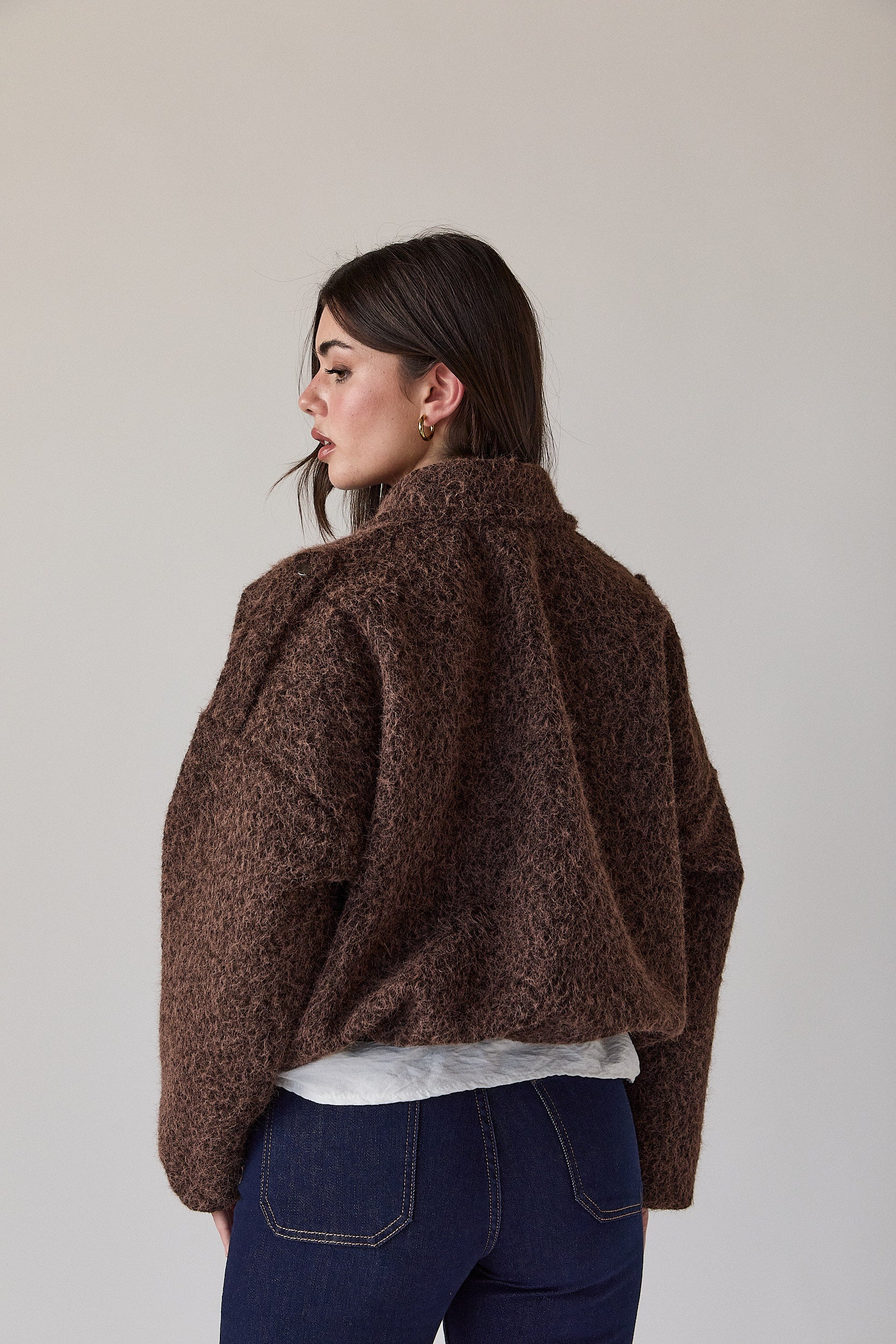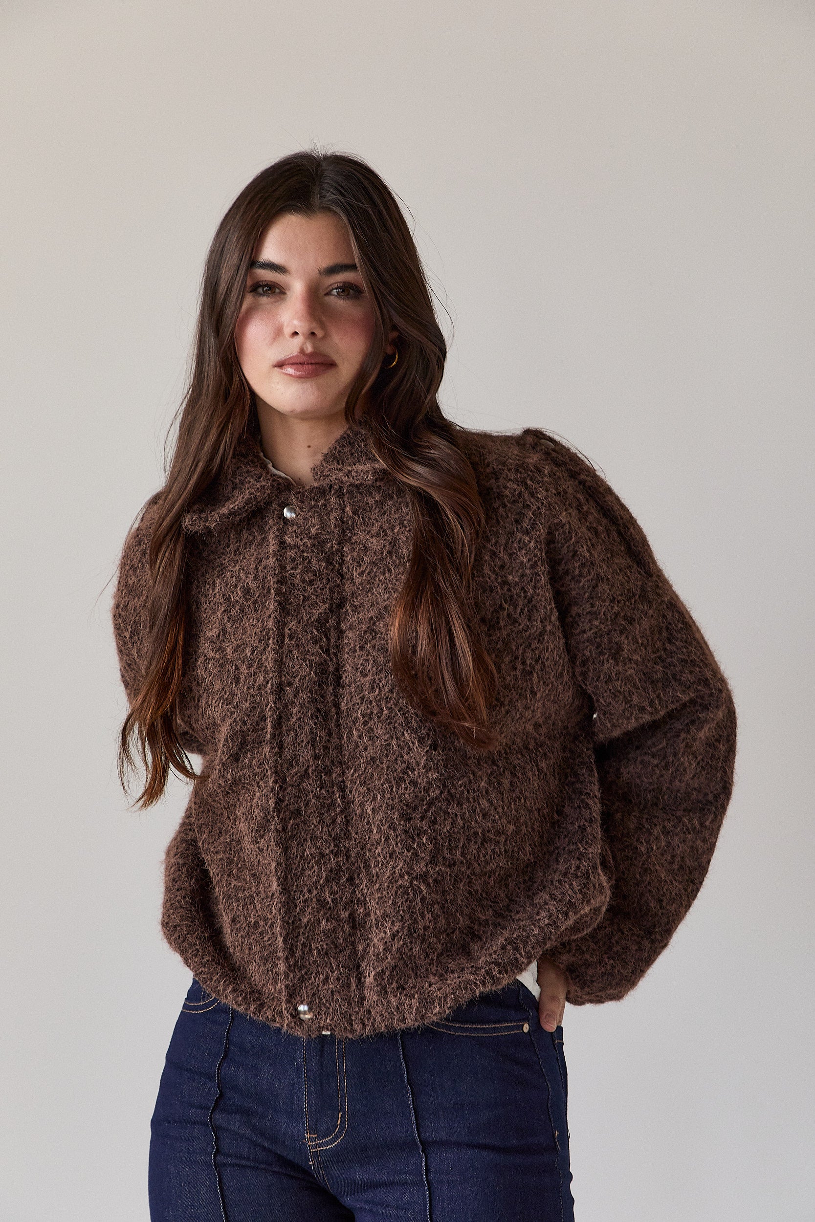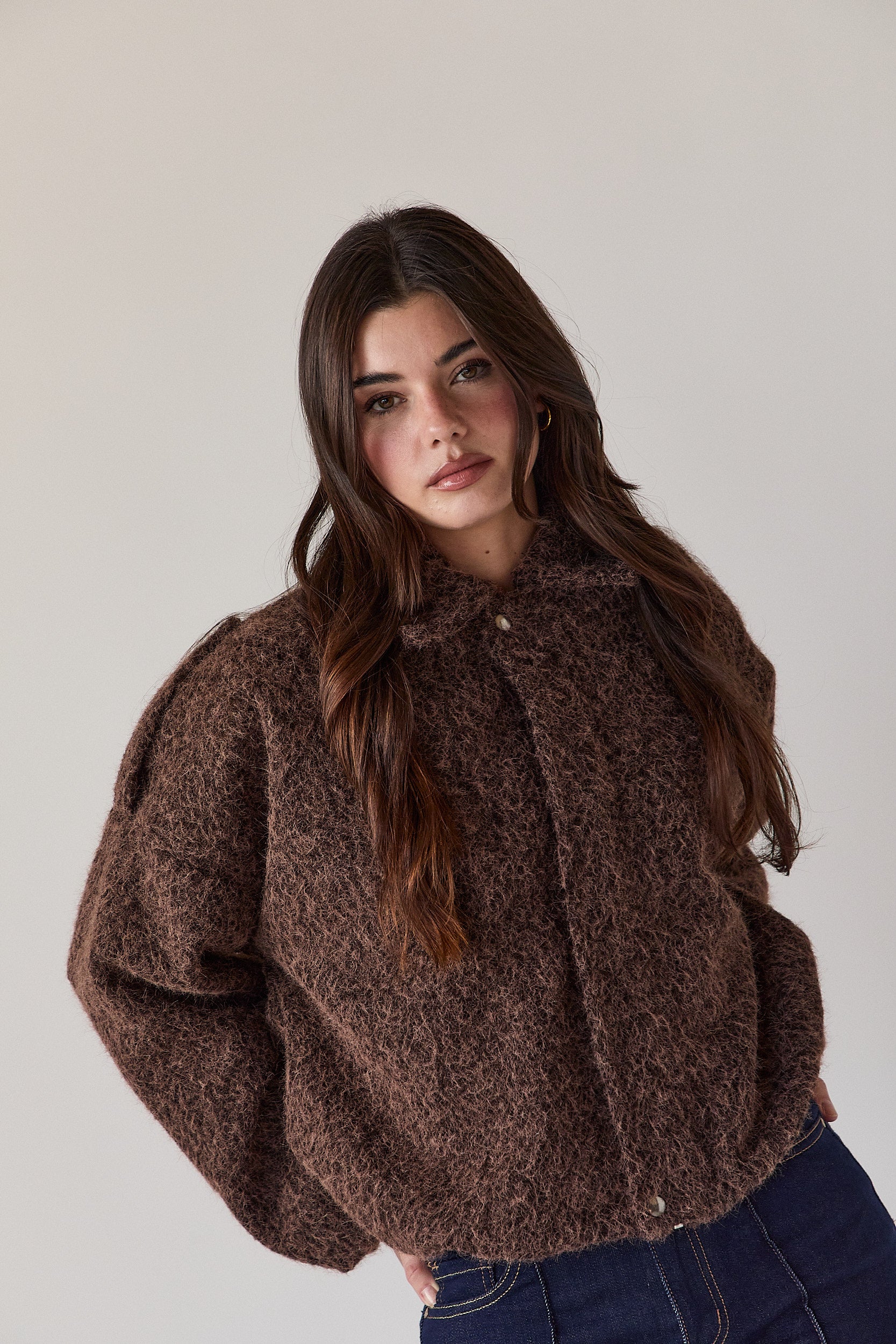 Abrigo corto en tono marrón con textura suave y aspecto abrigado. Presenta un volumen tipo globo en cuerpo y mangas, cierre frontal con botones a presión y cuello subido que aporta estructura al diseño. El fit es relajado y cómodo, perfecto para superponer sobre prendas de punto o camisetas básicas.