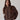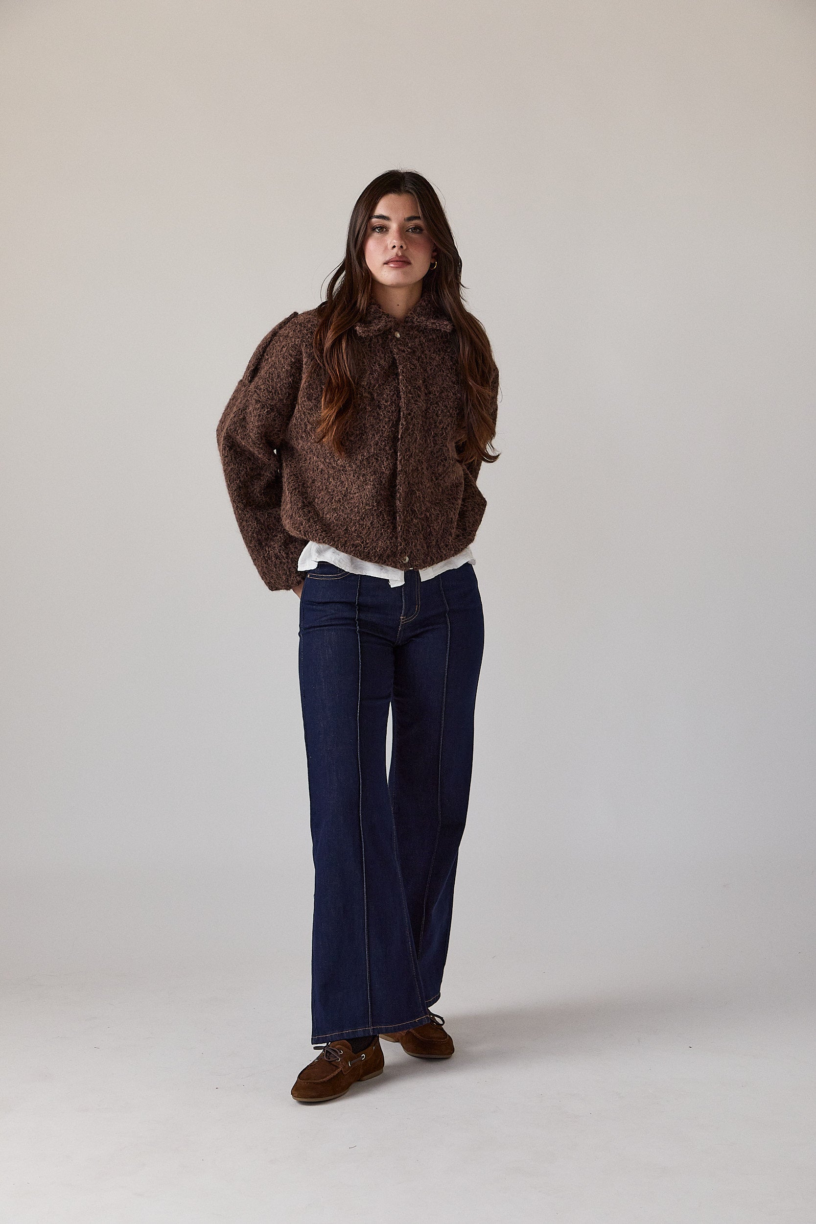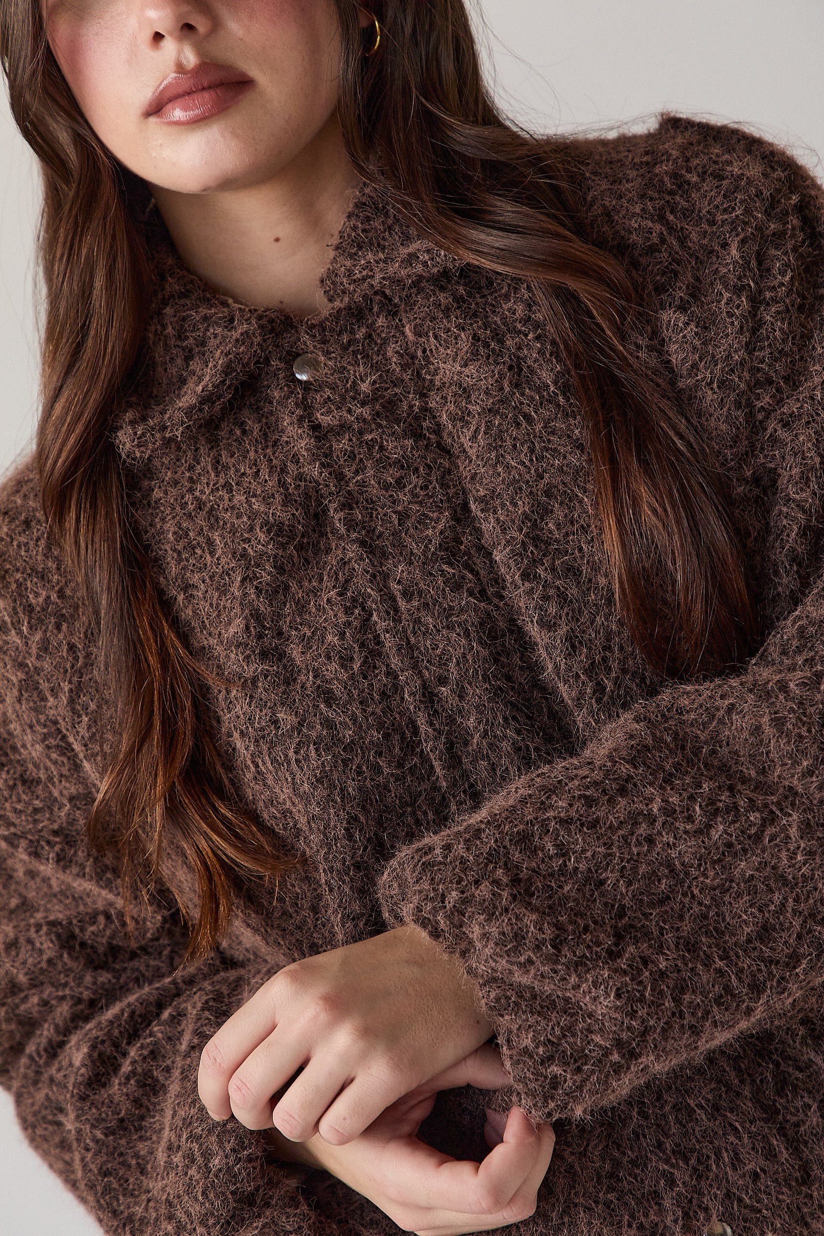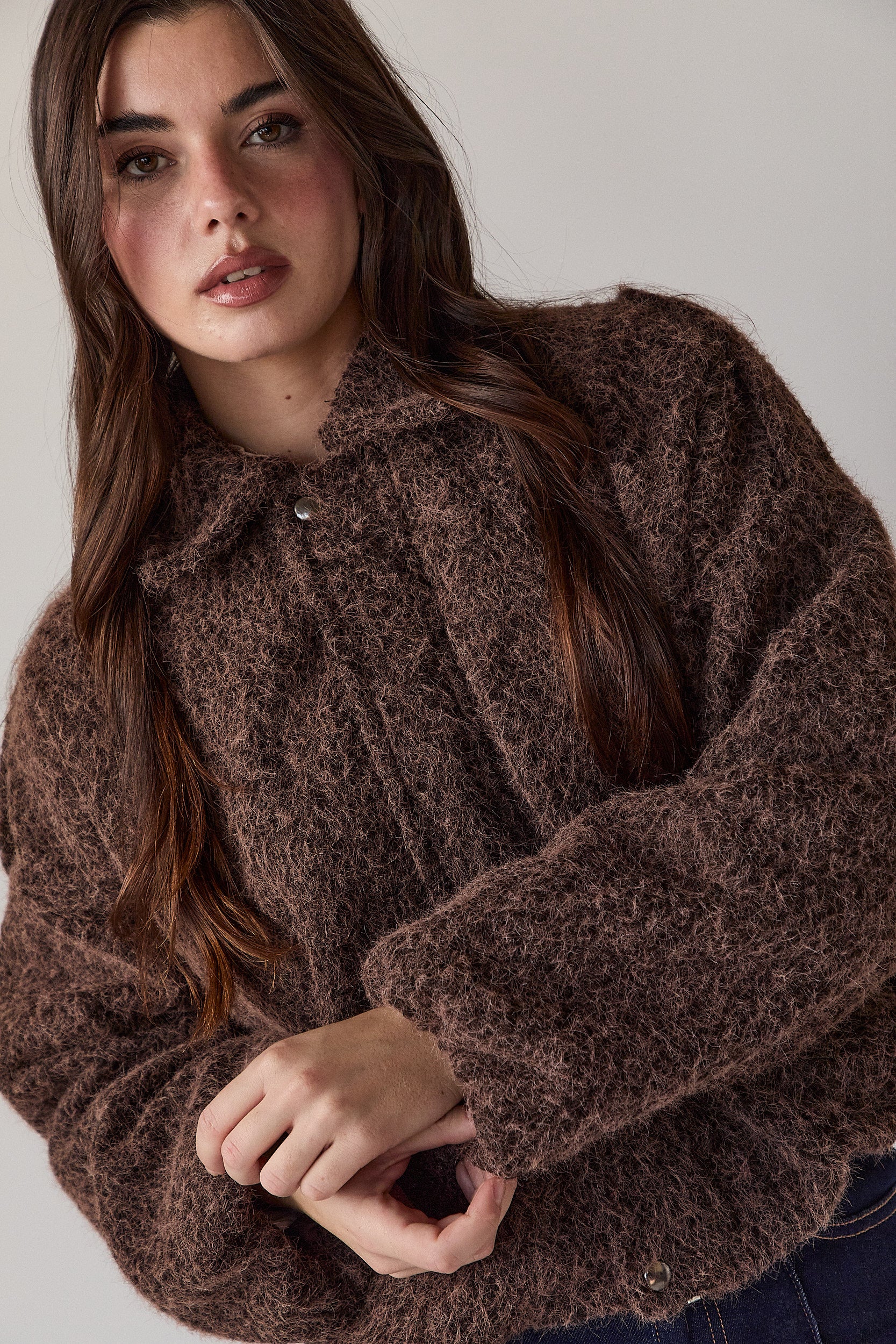 Abrigo corto en tono marrón con textura suave y aspecto abrigado. Presenta un volumen tipo globo en cuerpo y mangas, cierre frontal con botones a presión y cuello subido que aporta estructura al diseño. El fit es relajado y cómodo, perfecto para superponer sobre prendas de punto o camisetas básicas.