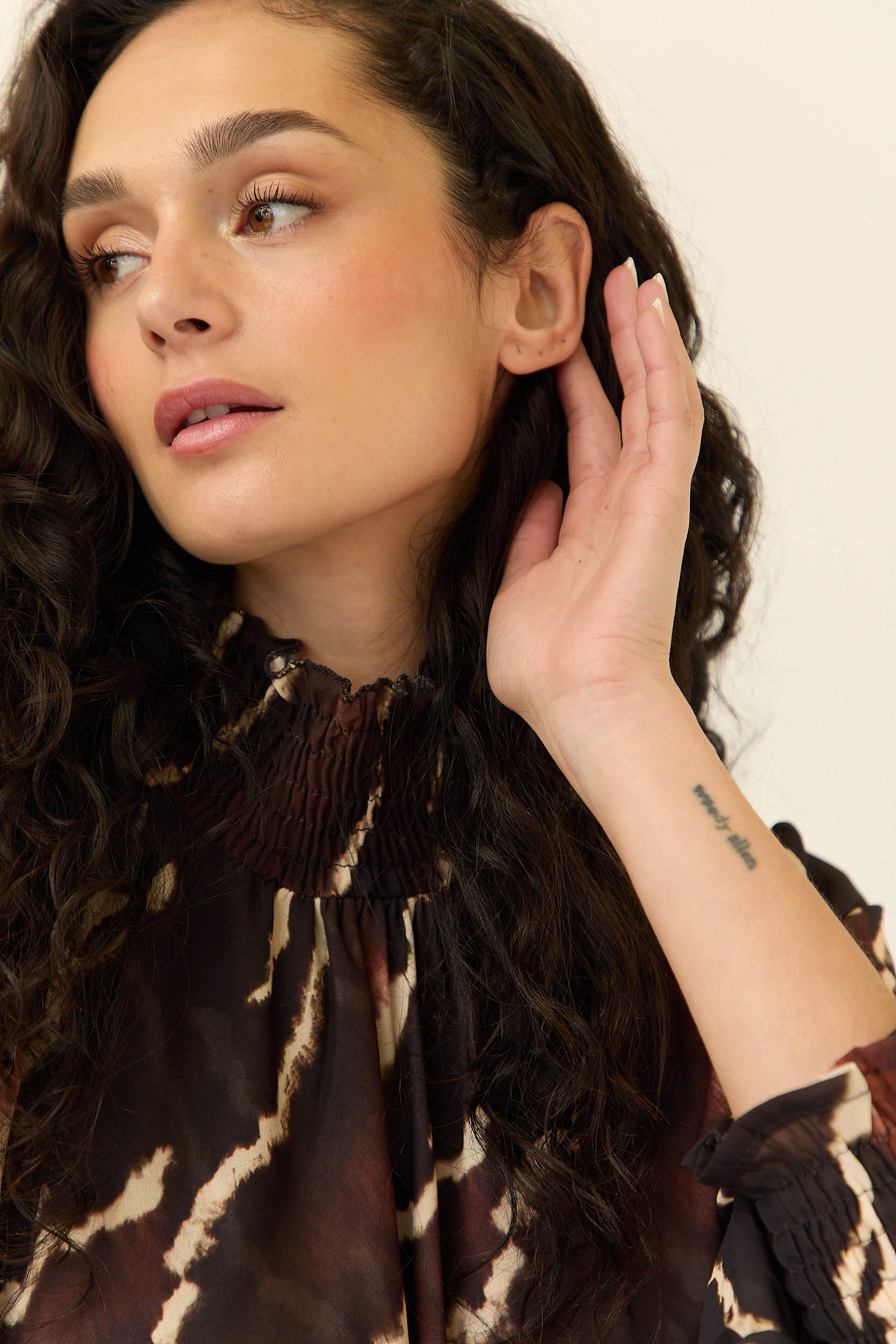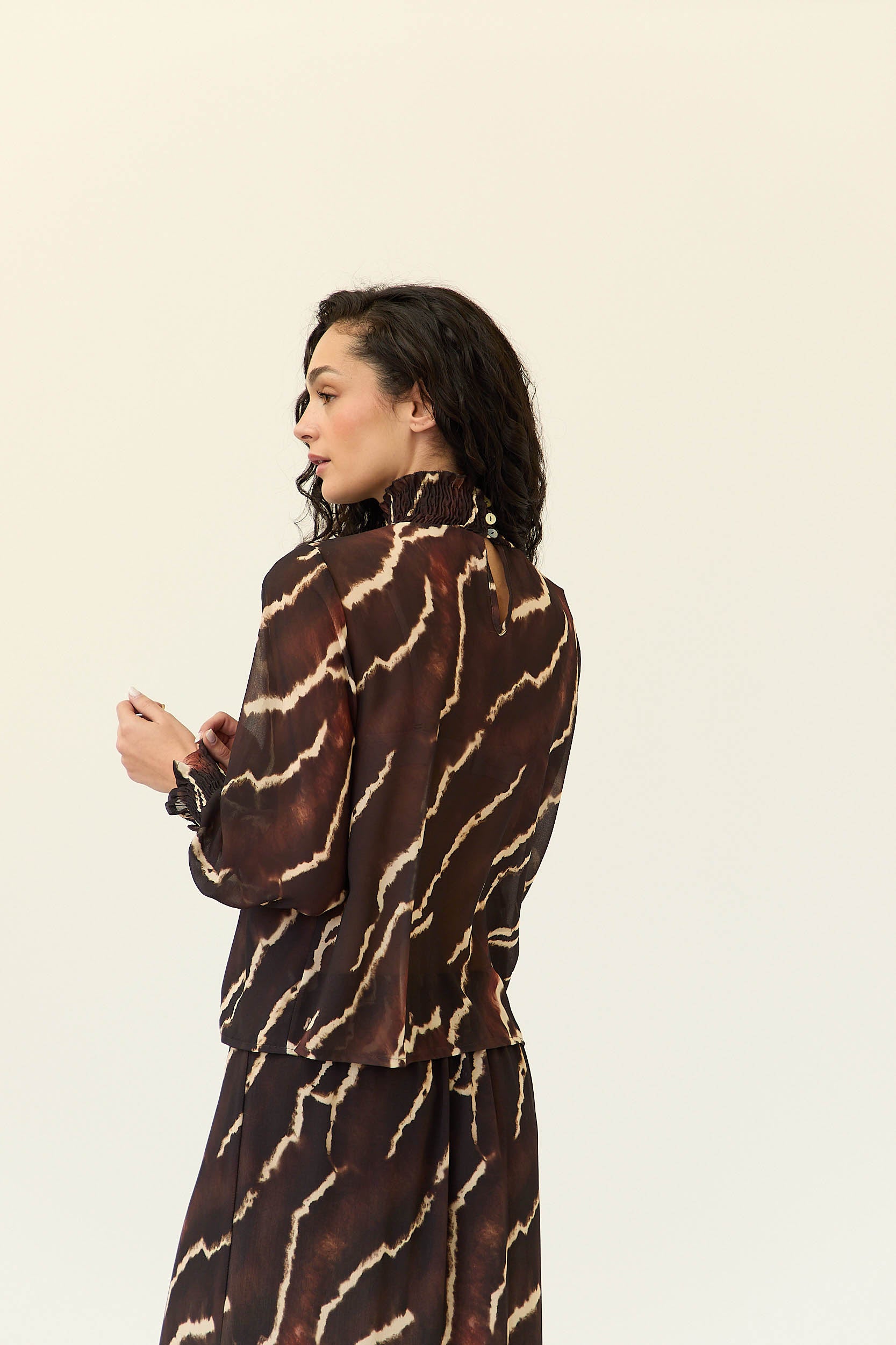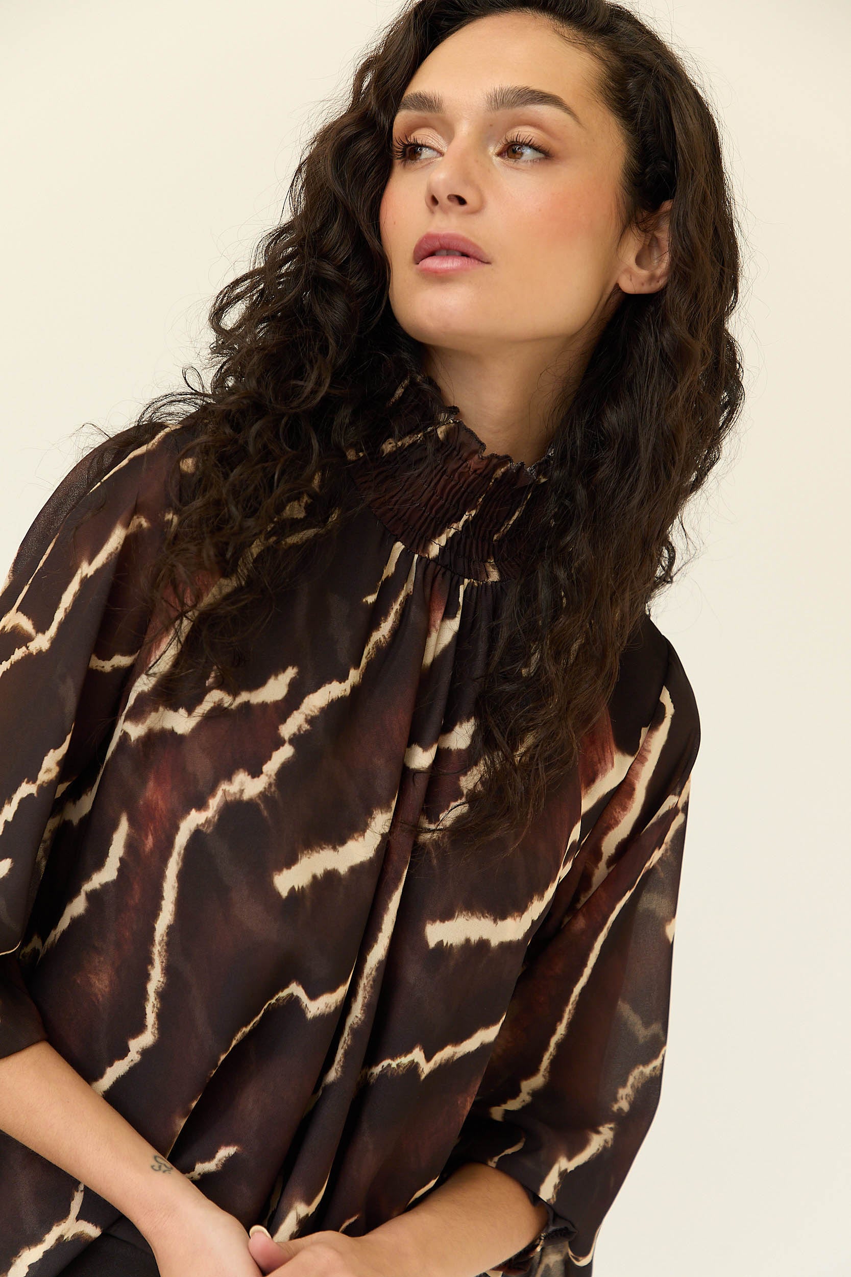Top de gasa con estampado tie dye en tonos marrones y negros. Diseño ajustado al cuerpo, cuello subido y manga larga semitransparente. Acabados con ligero volante en puños y bajo que aportan movimiento. Largo a la cadera y silueta limpia que define sin marcar en exceso.
