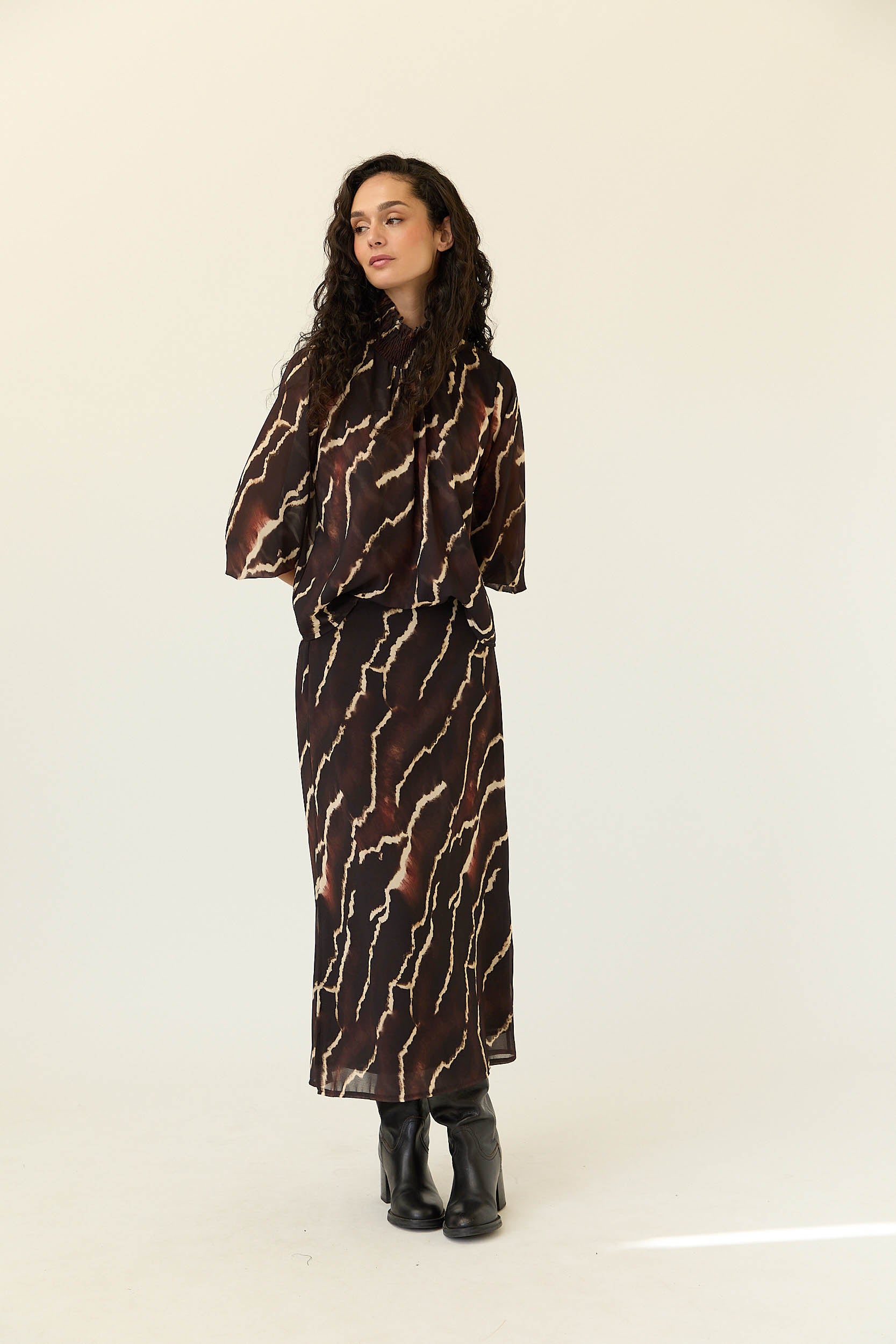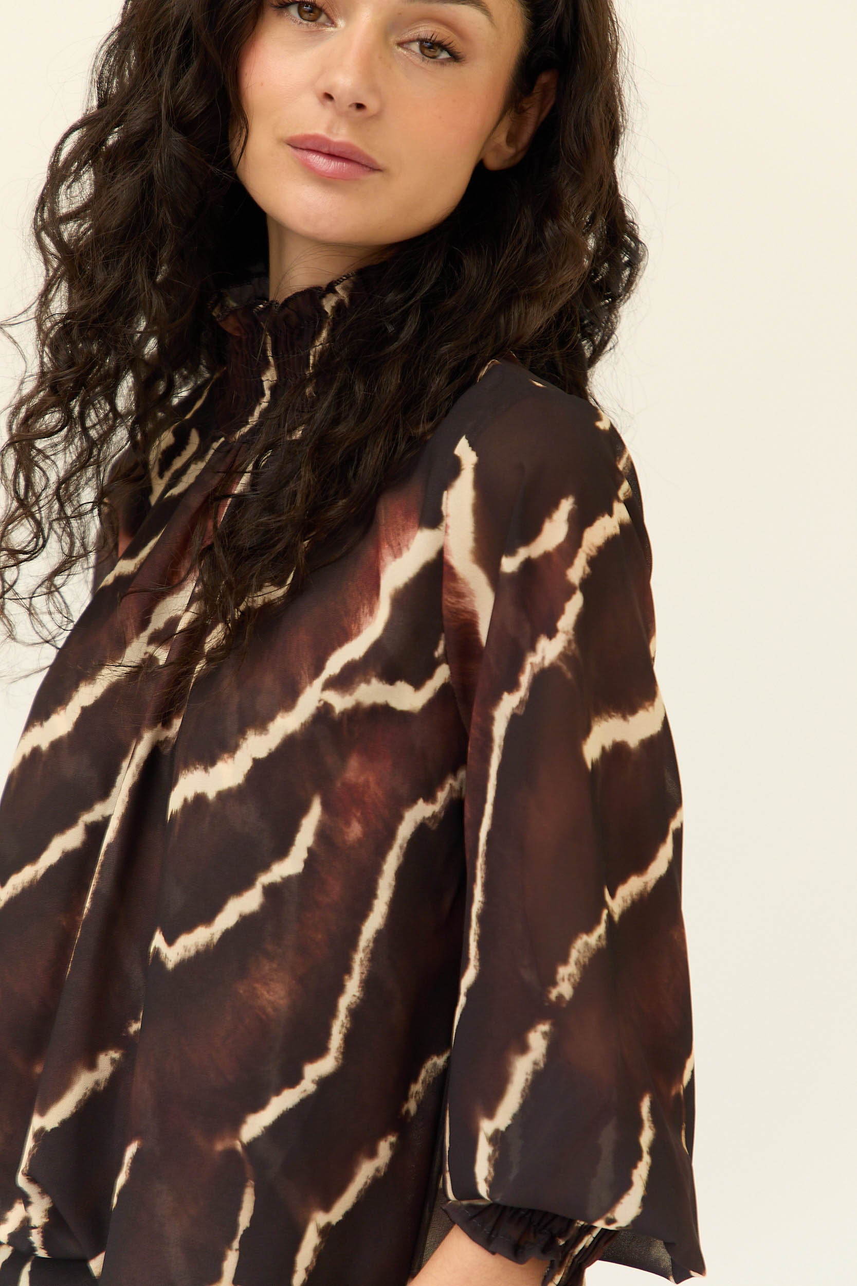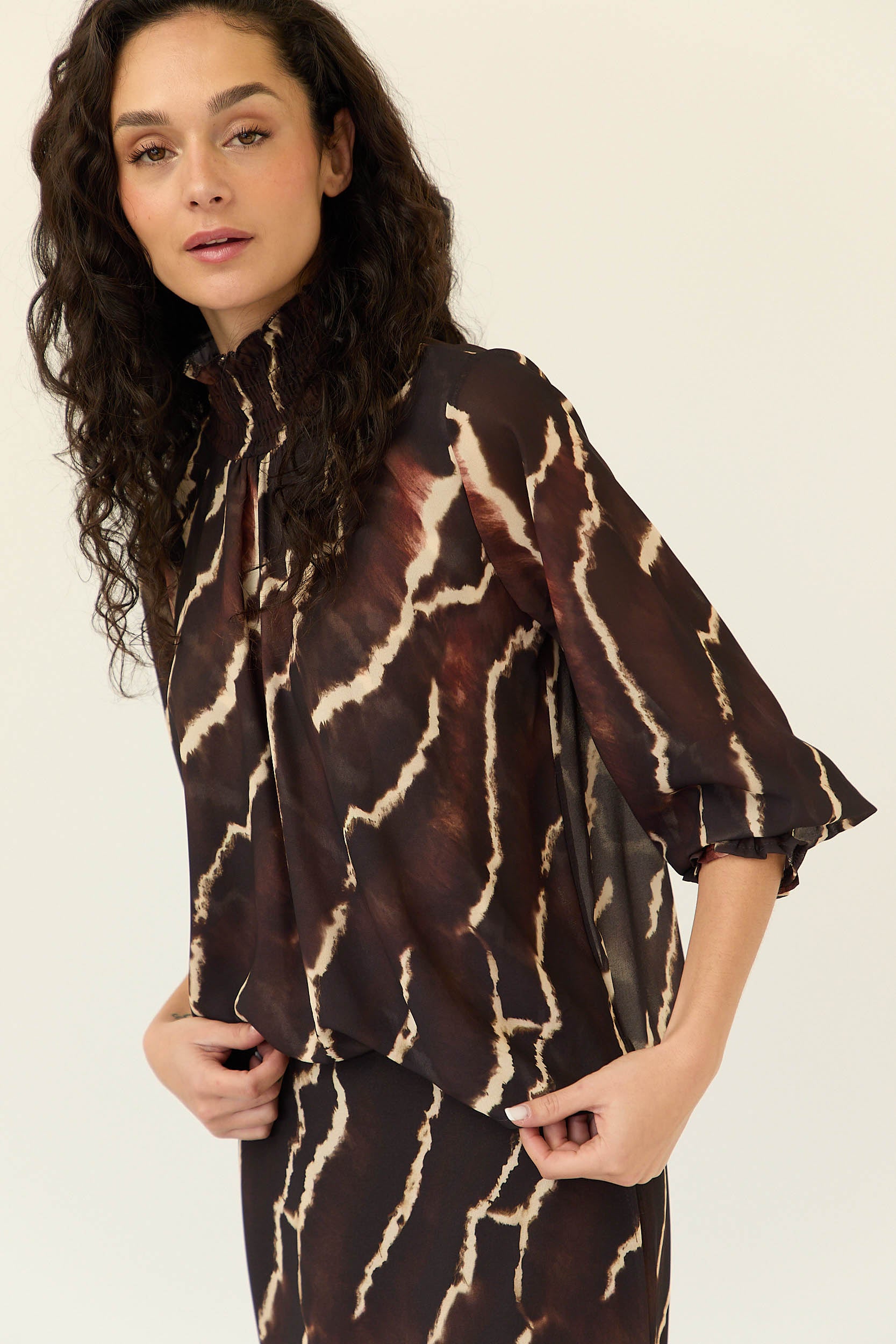 Top de gasa con estampado tie dye en tonos marrones y negros. Diseño ajustado al cuerpo, cuello subido y manga larga semitransparente. Acabados con ligero volante en puños y bajo que aportan movimiento. Largo a la cadera y silueta limpia que define sin marcar en exceso.