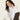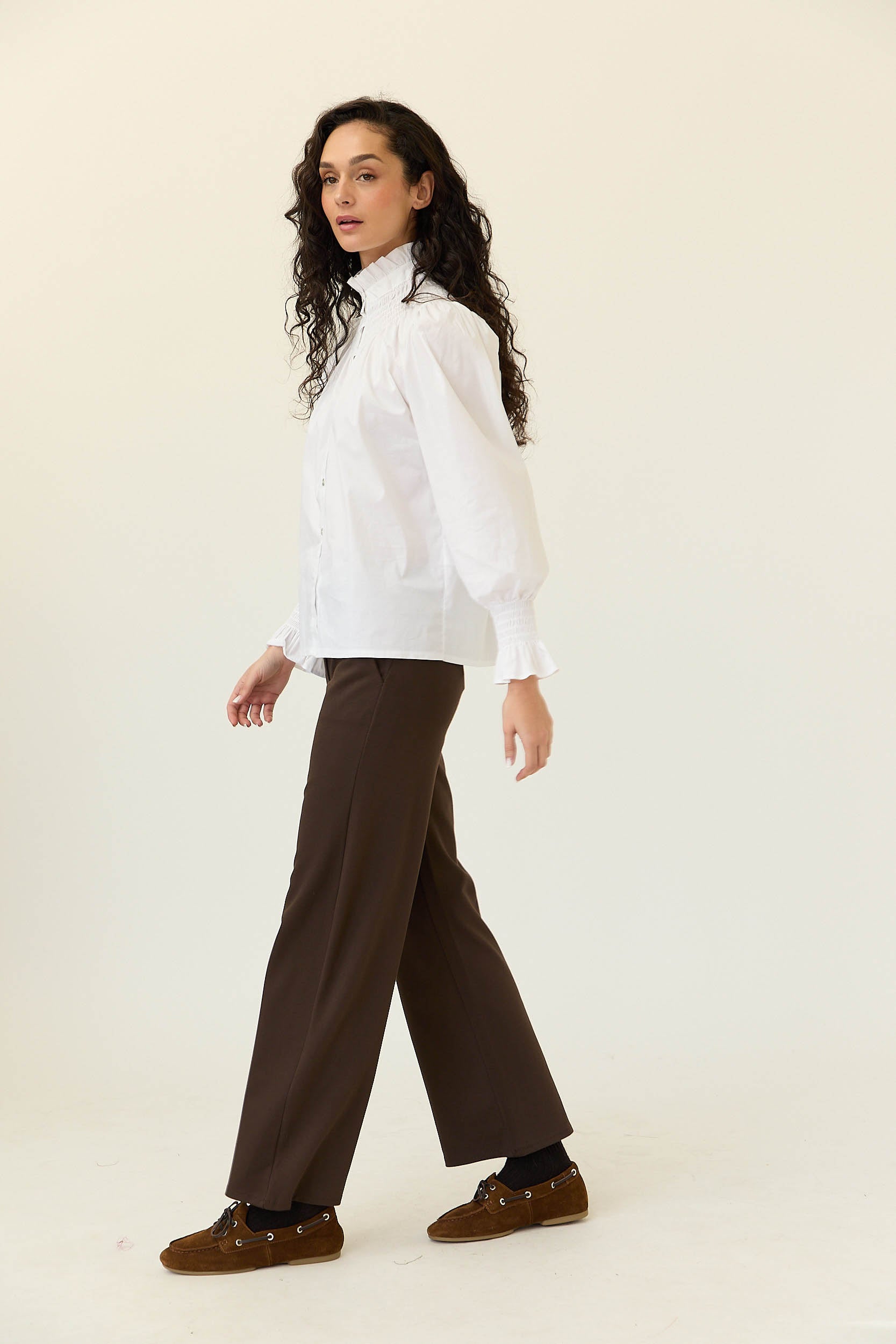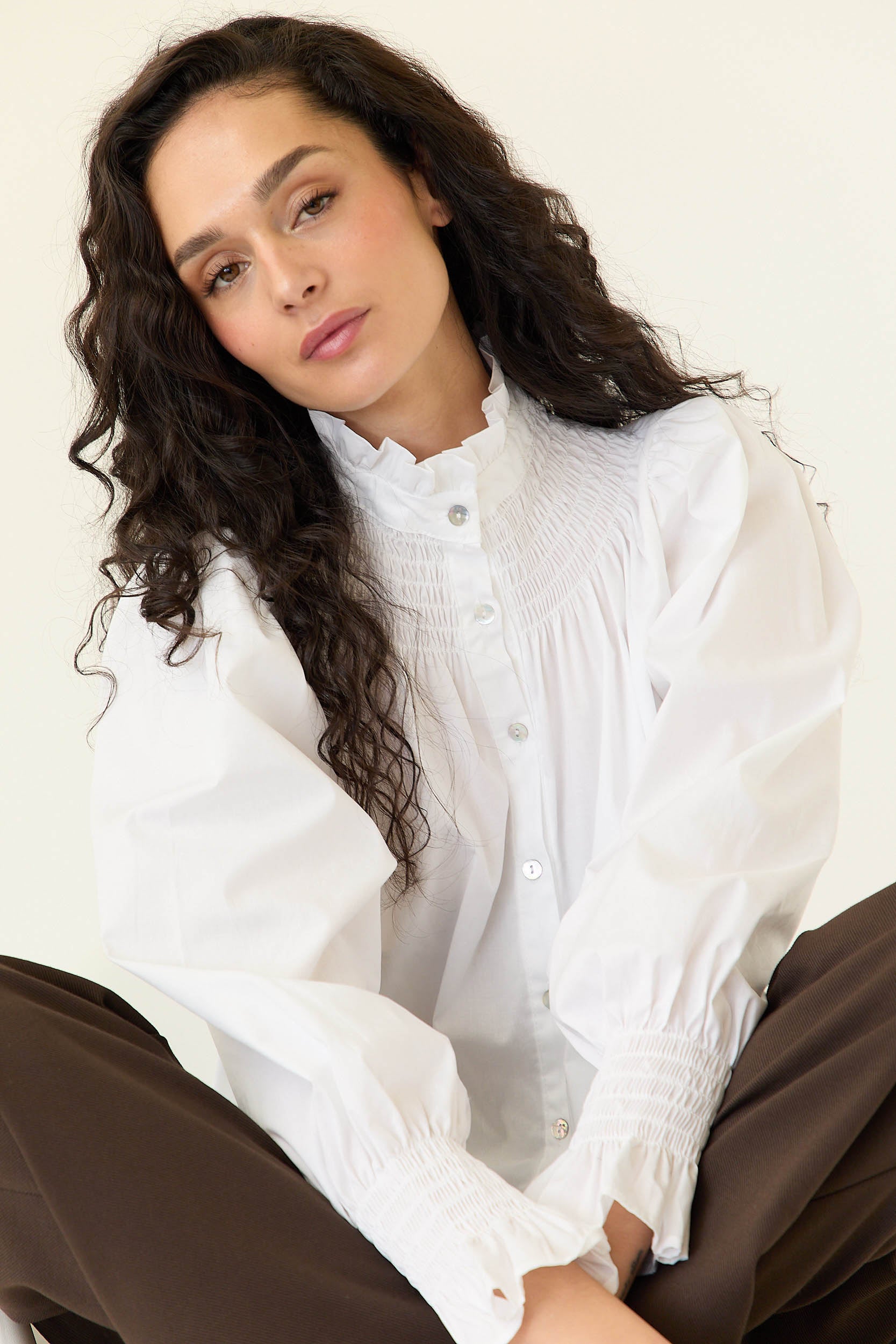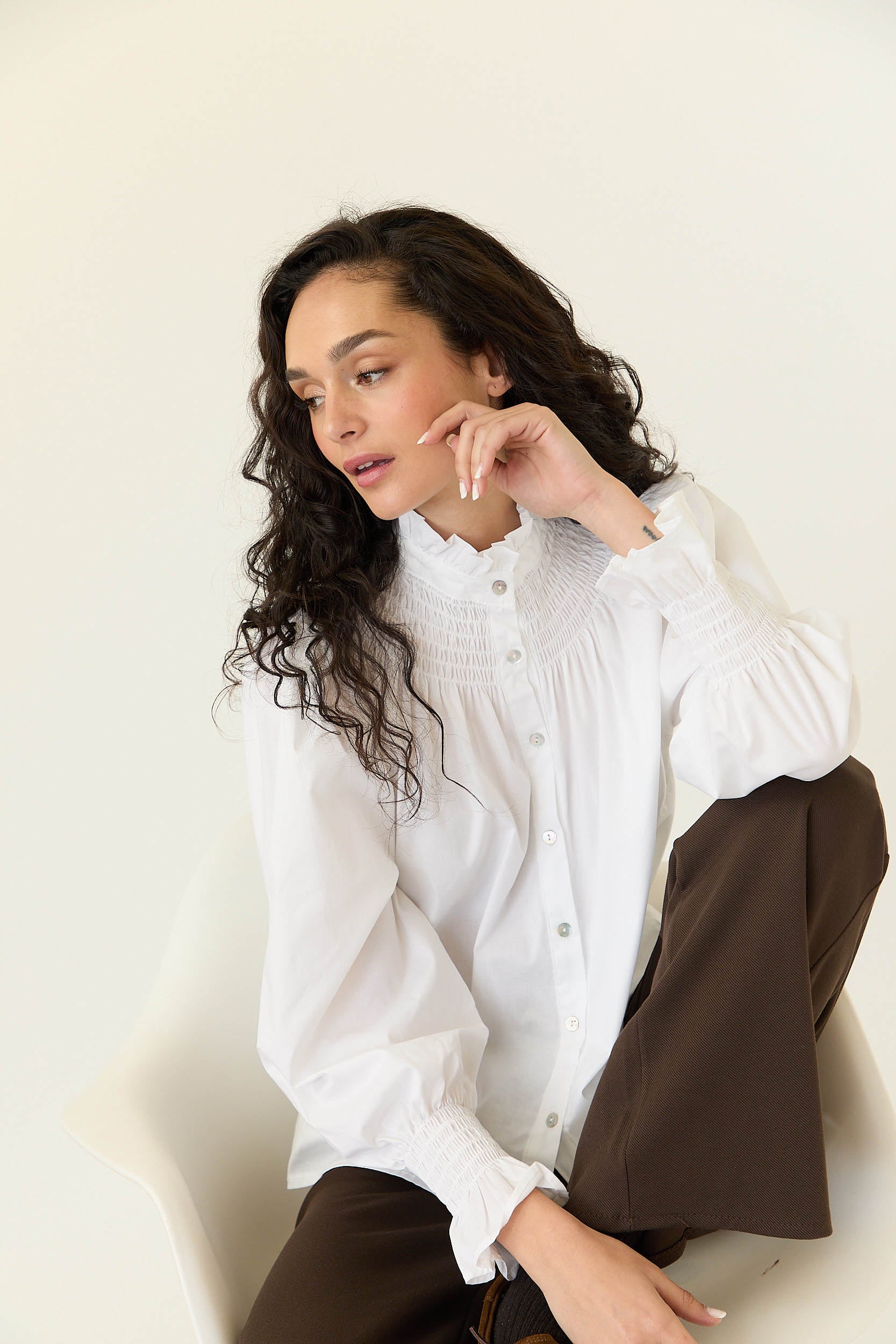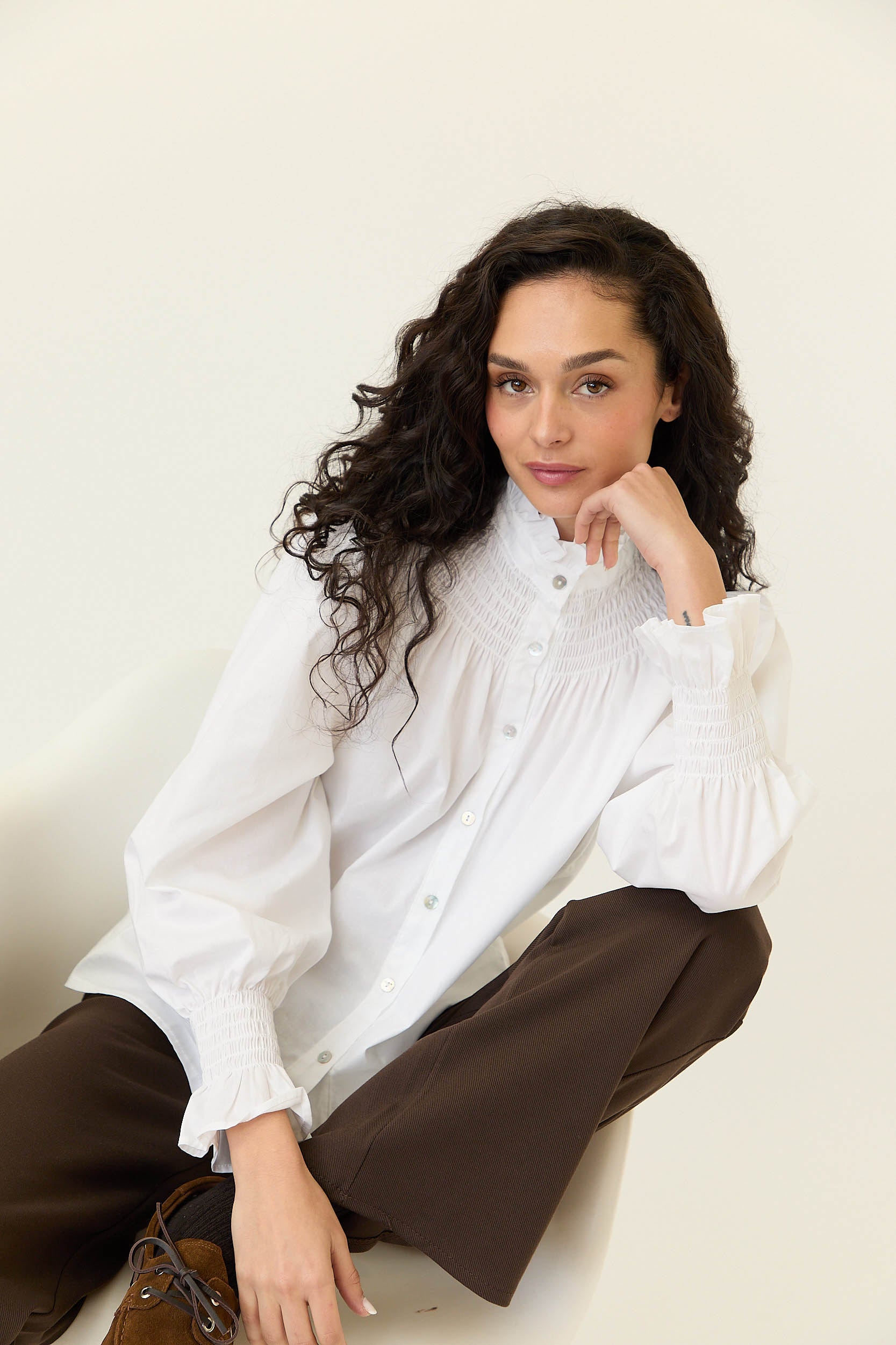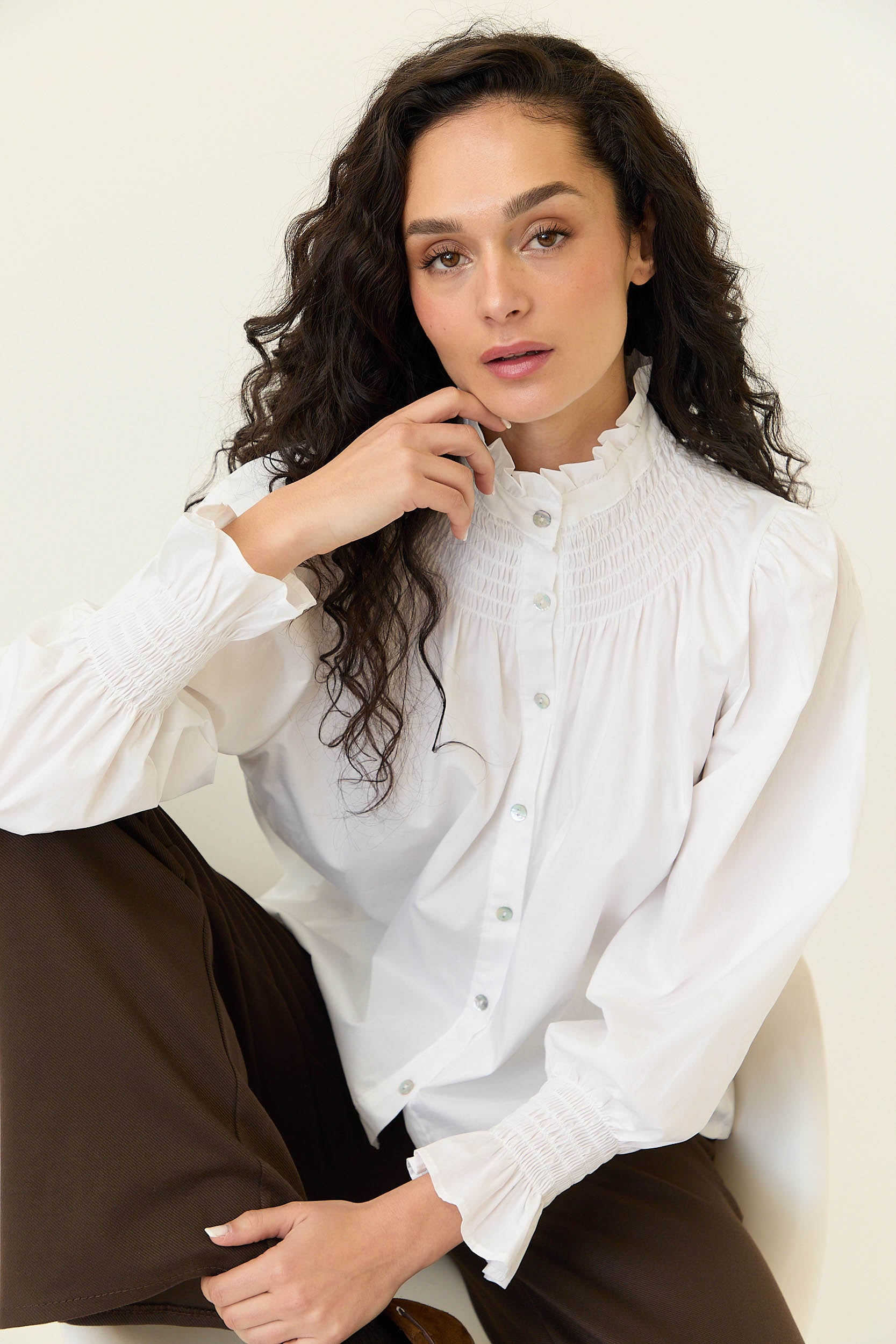 Camisa blanca de corte recto con cuello subido y fruncido elástico. Cierre frontal con botones y canesú delantero con detalle de gomas que aporta textura. Mangas largas ligeramente abullonadas con puño elástico y pequeño volante en el remate.