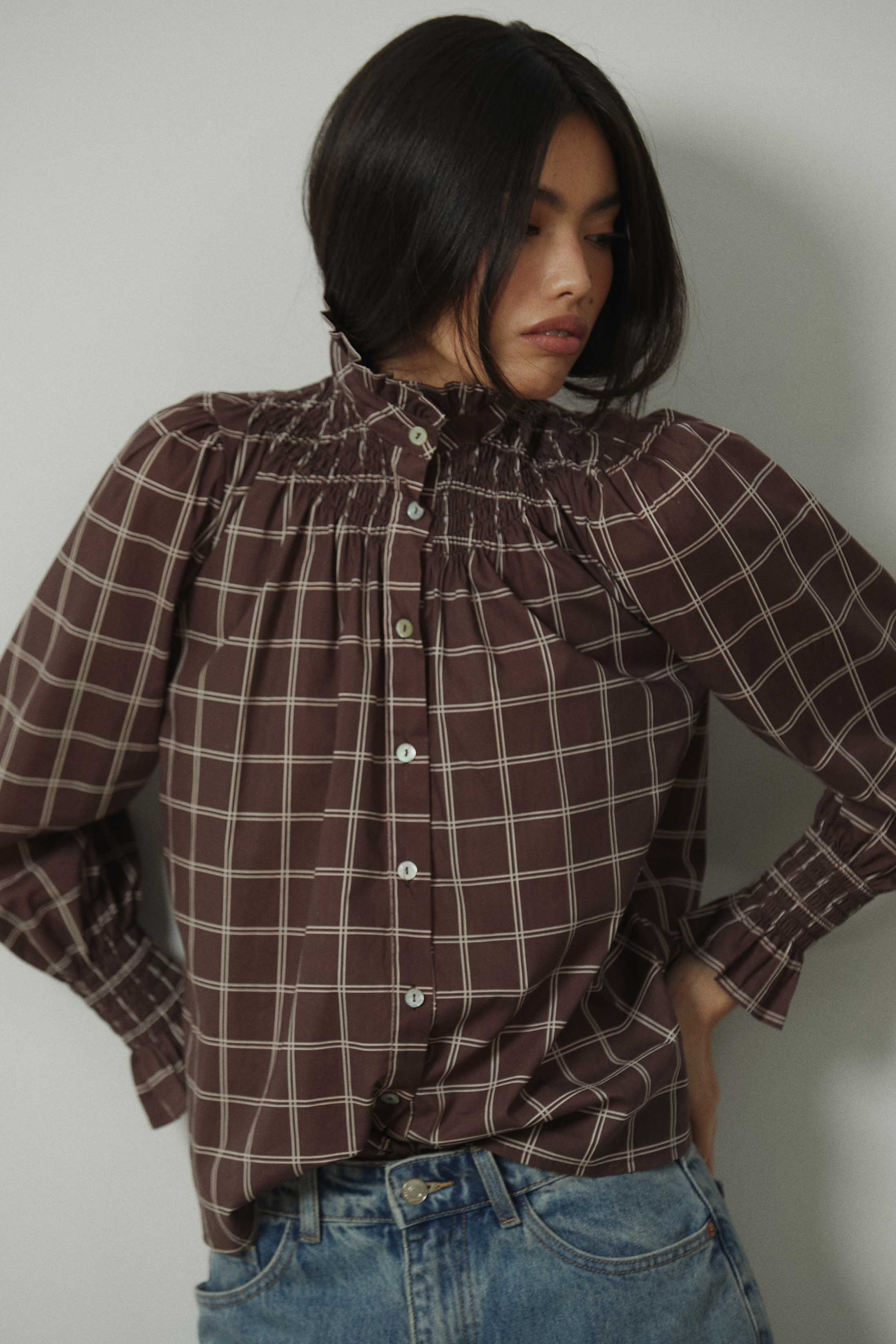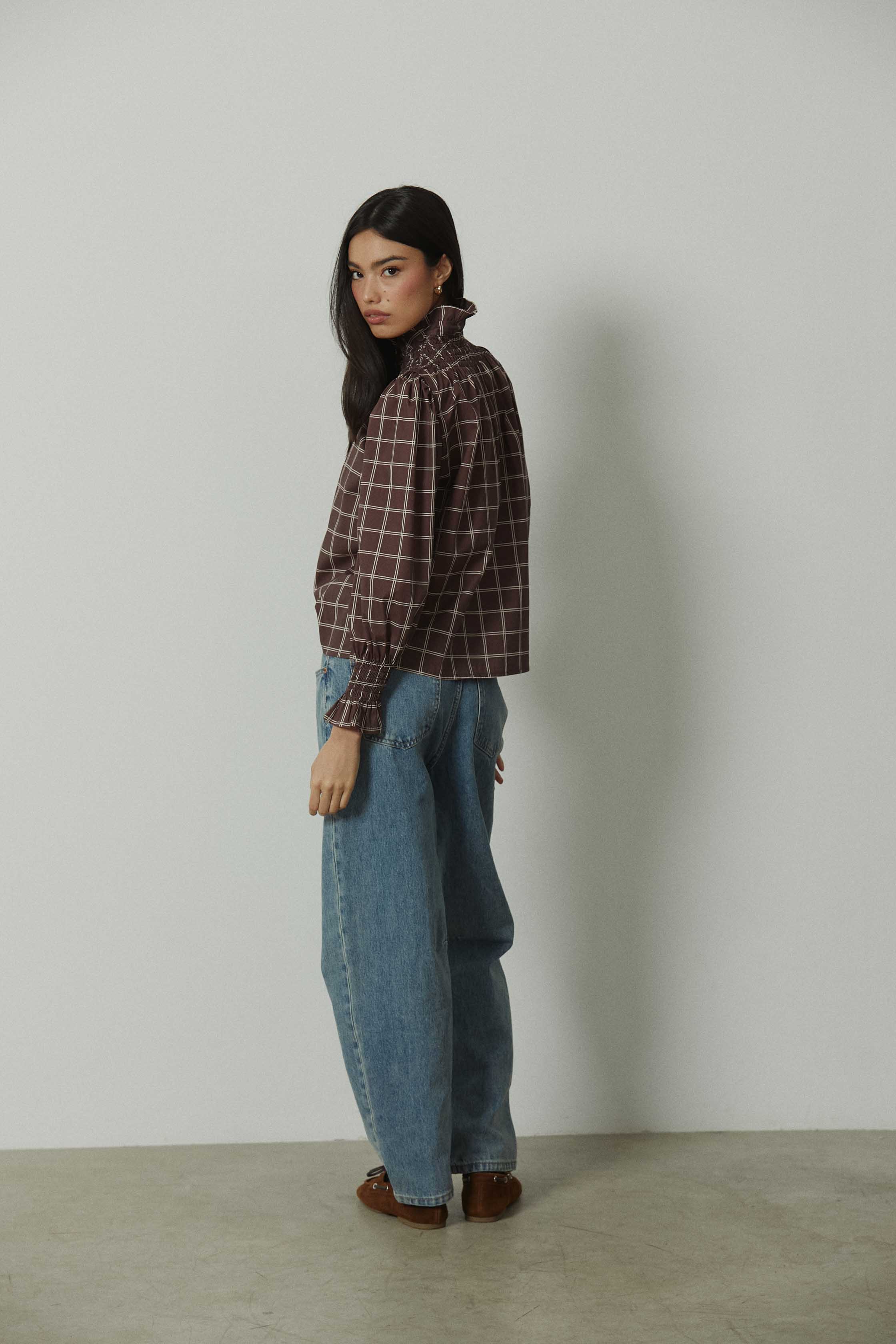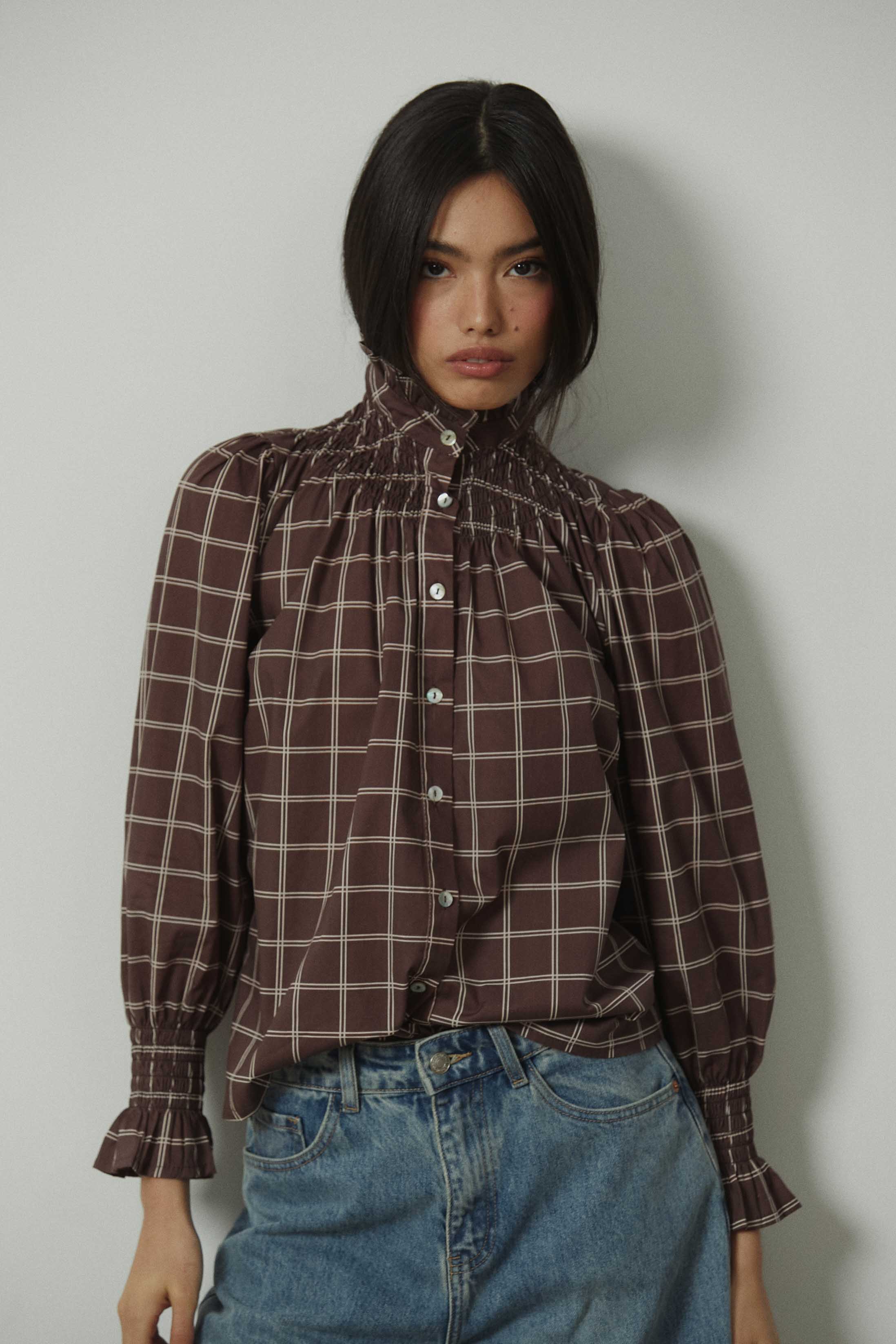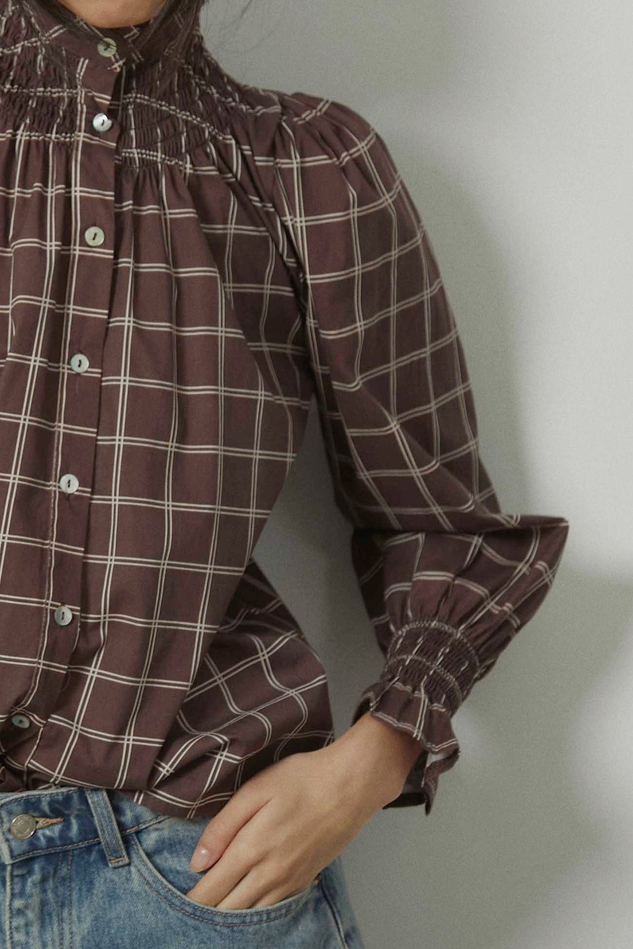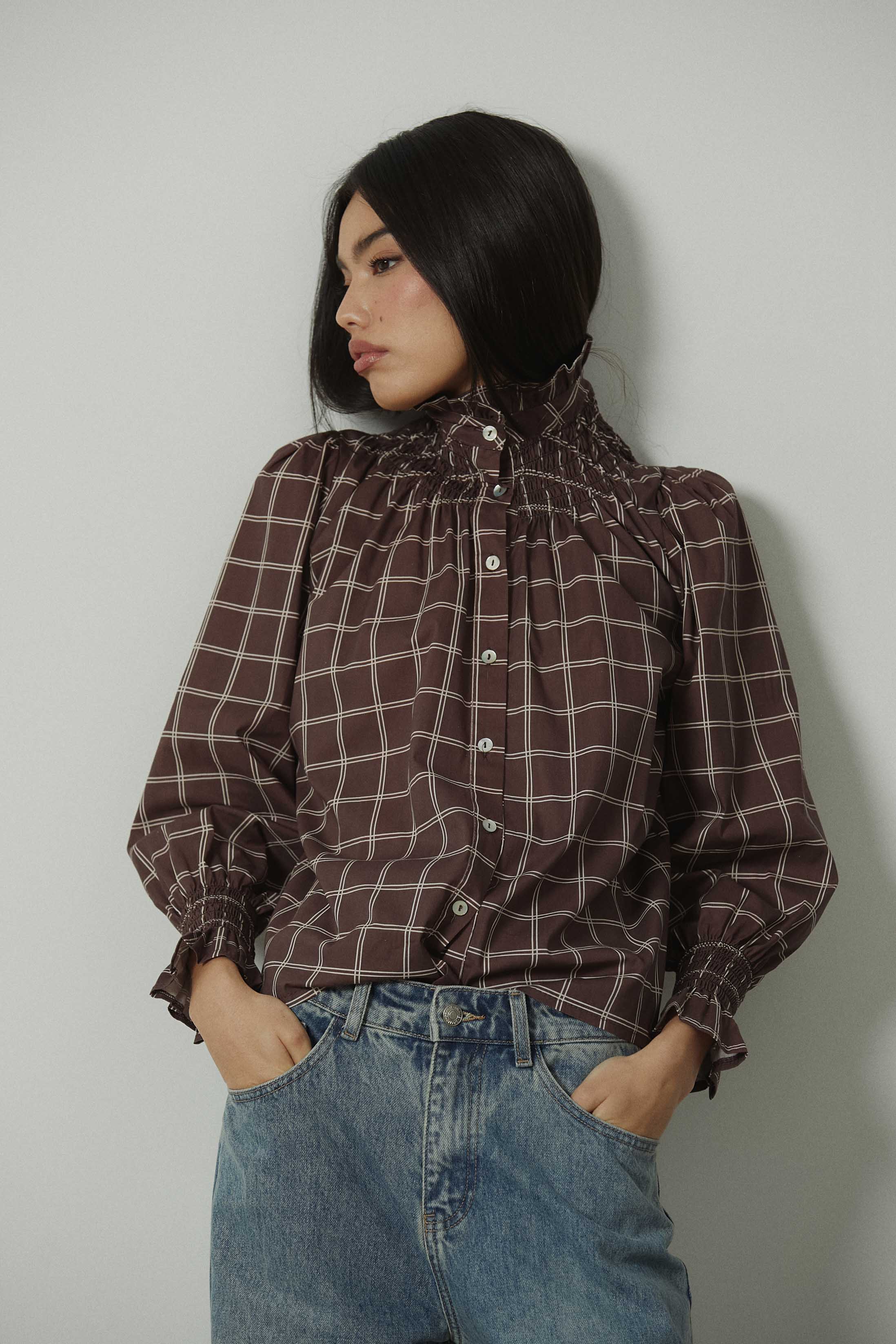 Camisa de manga larga con estampado de cuadros en tonos marrones y crudos. Diseño con cuello subido y fruncido elástico que aporta textura en la parte superior. Cierre frontal con botones y mangas ligeramente abullonadas, rematadas con puño fruncido que define la silueta. Corte recto y largo a la cadera.