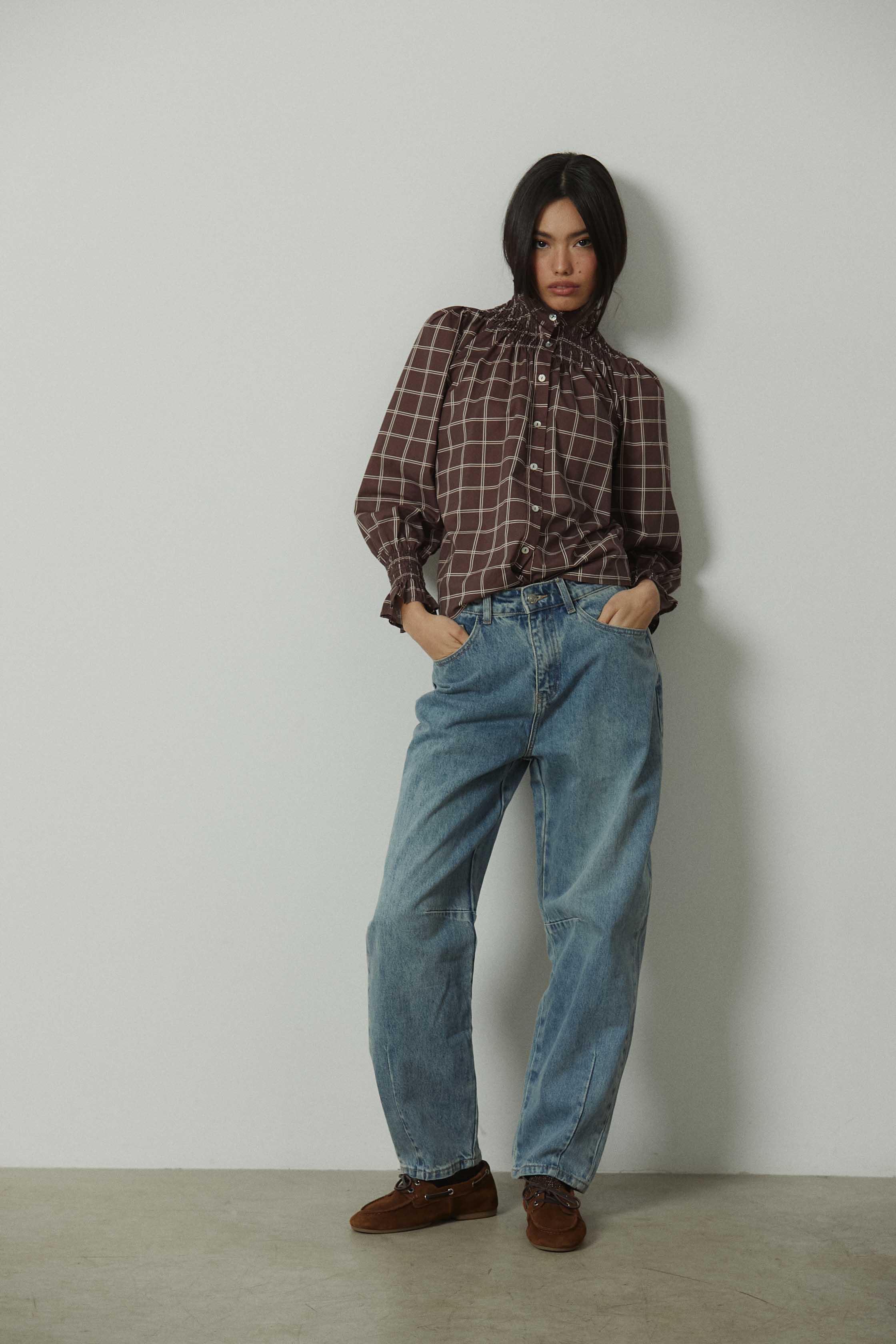 Camisa cuadros fruncida marrón