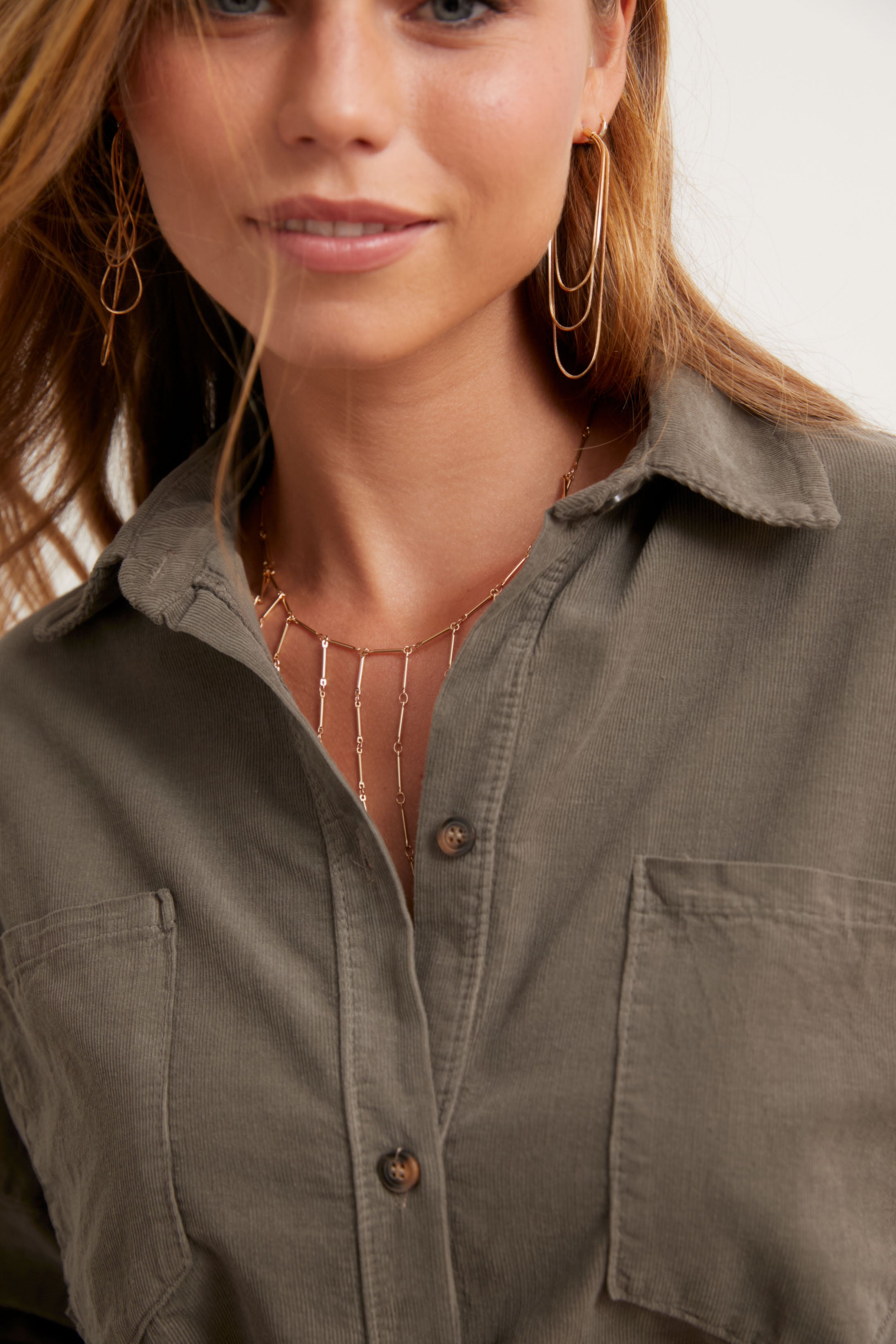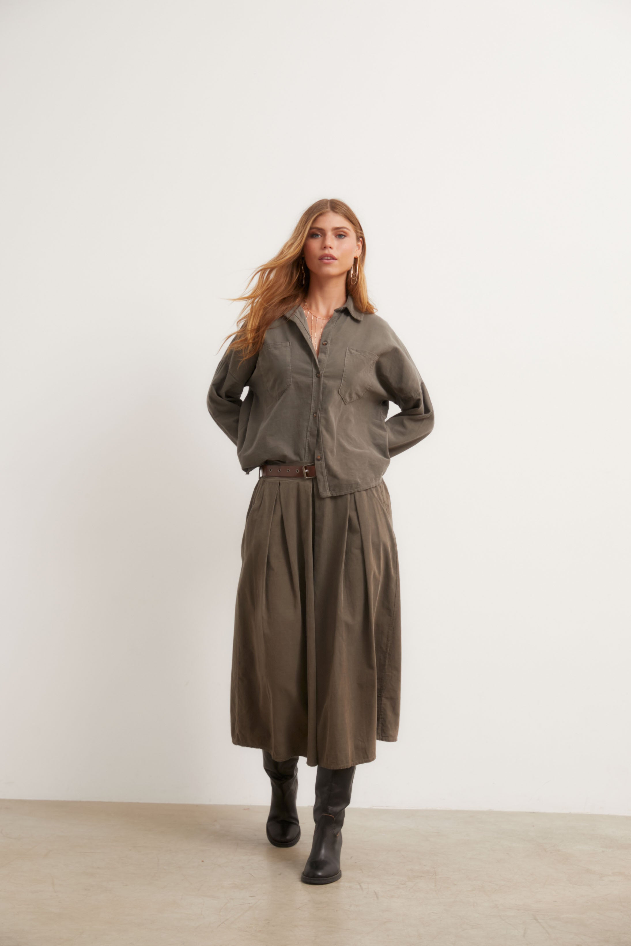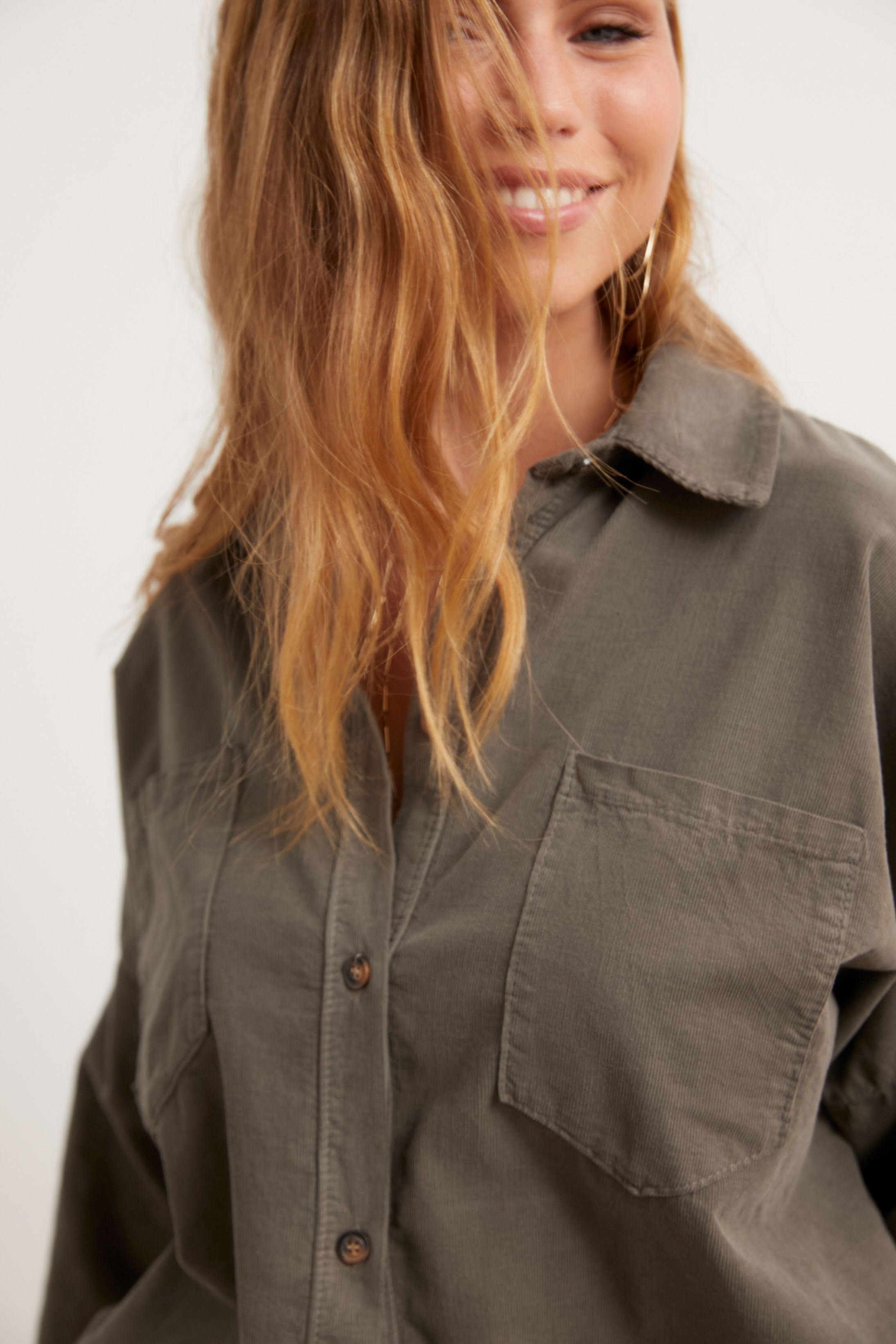 Camisa de pana en tono topo con corte recto y estilo relajado. Presenta cuello clásico, cierre frontal con botones metálicos y dos bolsillos de plastrón en el pecho. Su textura suave y su diseño limpio aportan un aire desenfadado y atemporal.