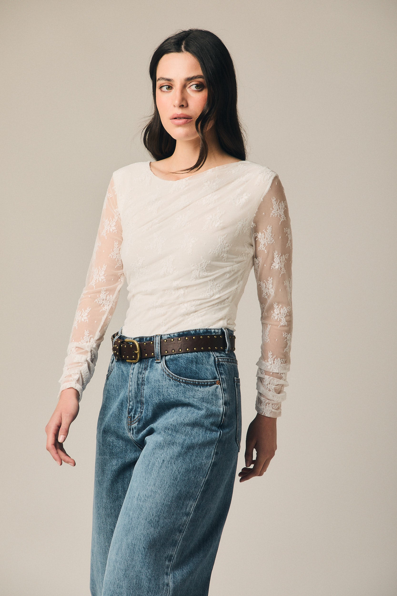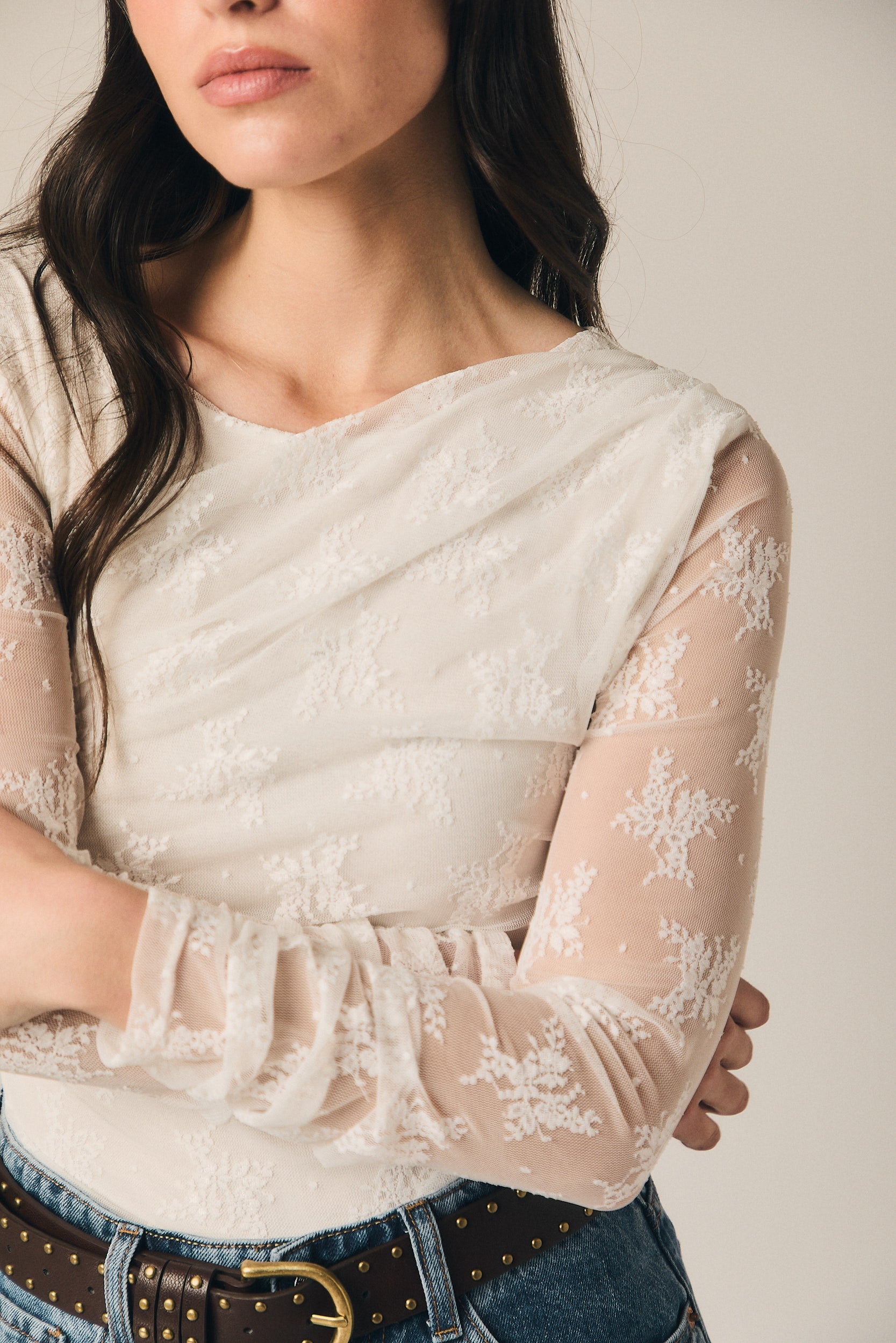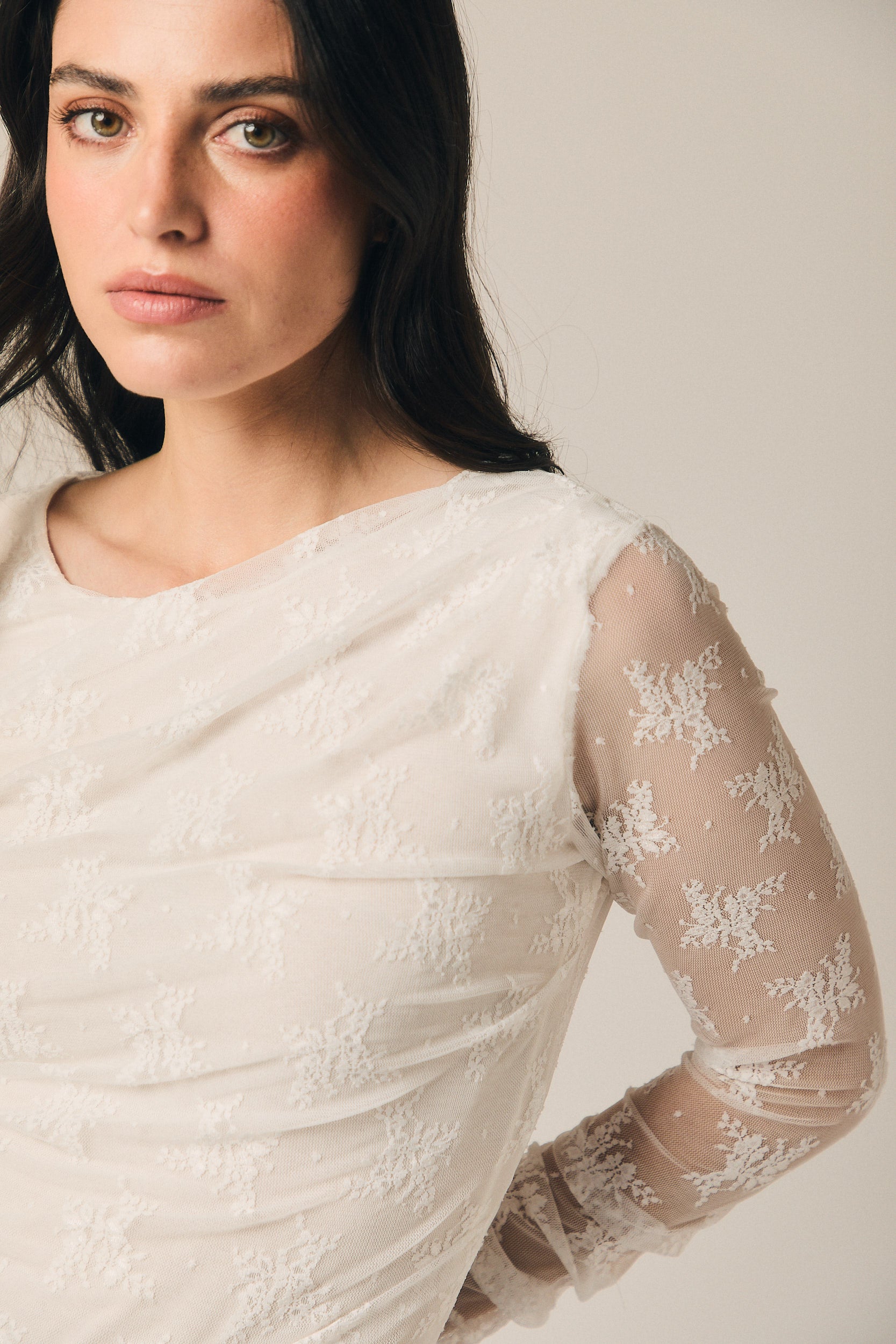 Top de mujer en color blanco confeccionado en blonda con motivo floral. Presenta escote barco ligeramente asimétrico y manga larga semitransparente. El cuerpo incorpora efecto drapeado que estiliza la silueta y aporta textura al diseño.
