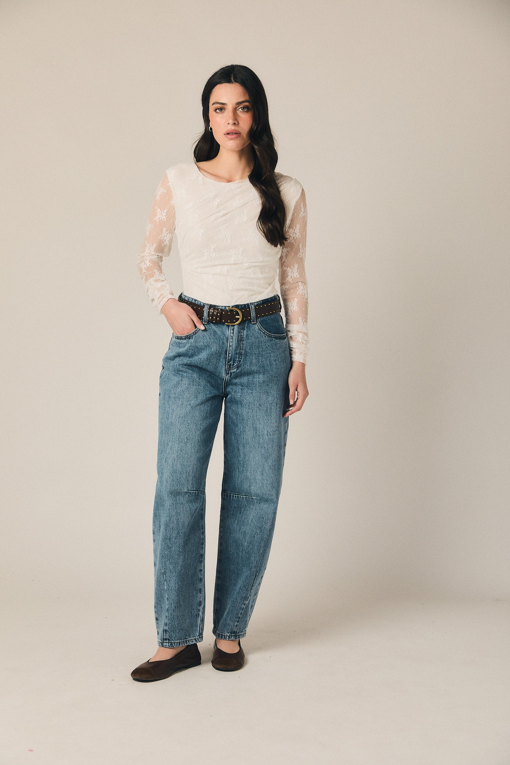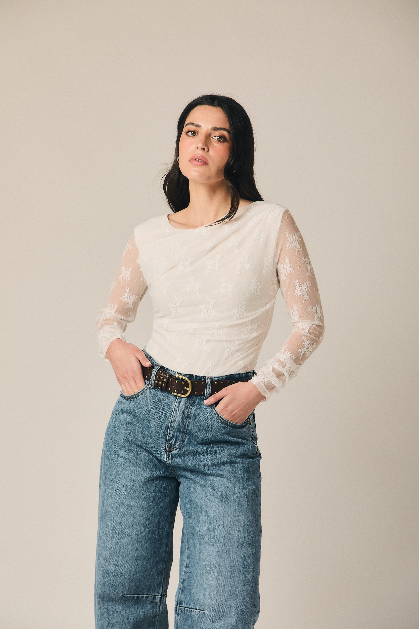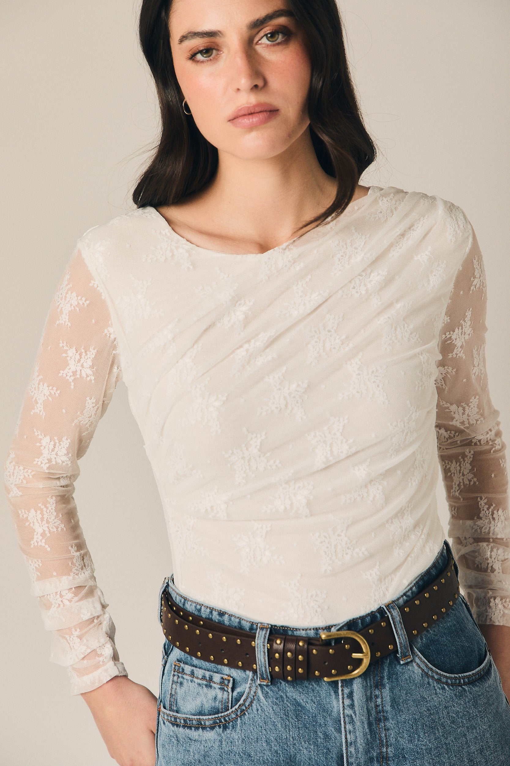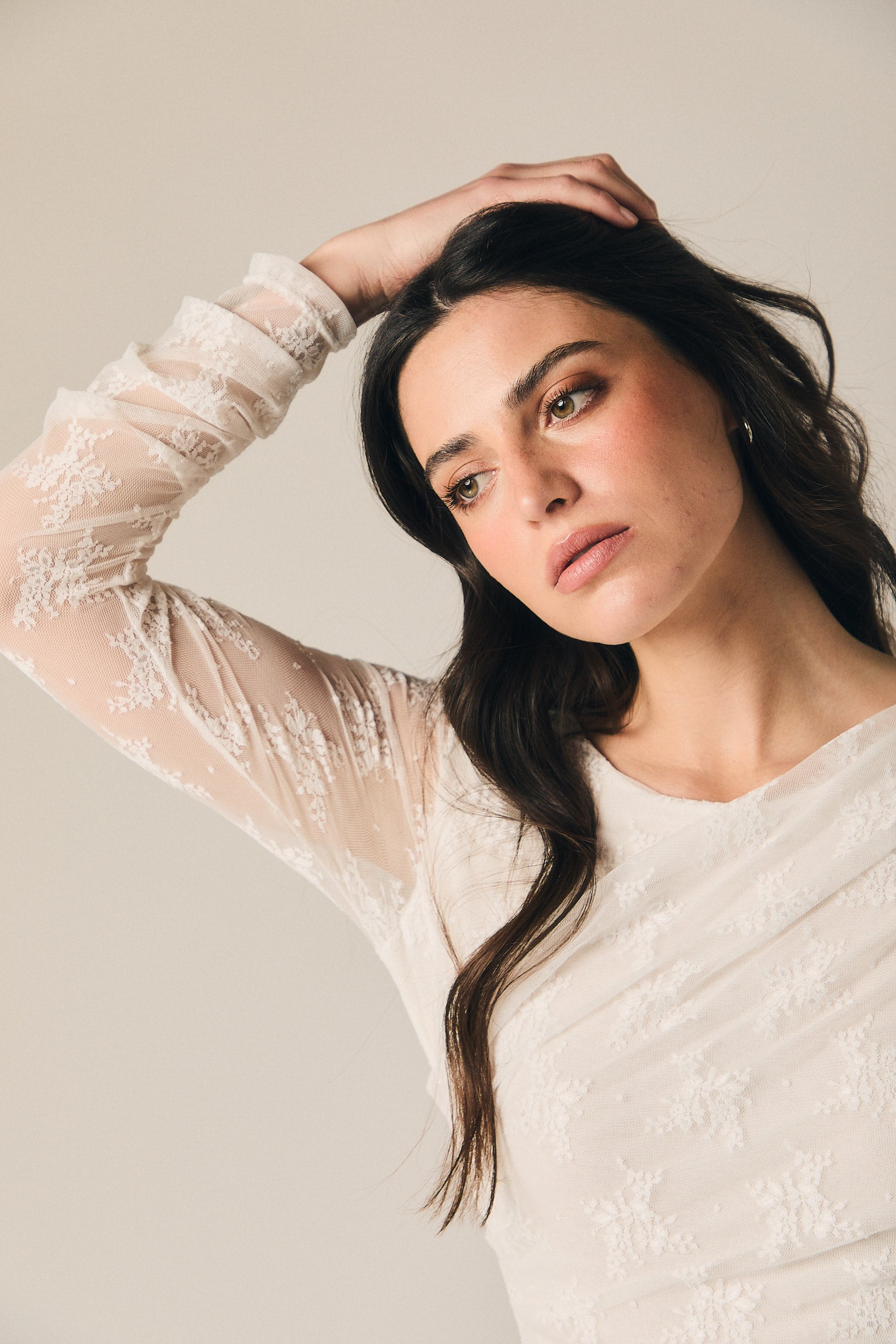 Top de mujer en color blanco confeccionado en blonda con motivo floral. Presenta escote barco ligeramente asimétrico y manga larga semitransparente. El cuerpo incorpora efecto drapeado que estiliza la silueta y aporta textura al diseño.