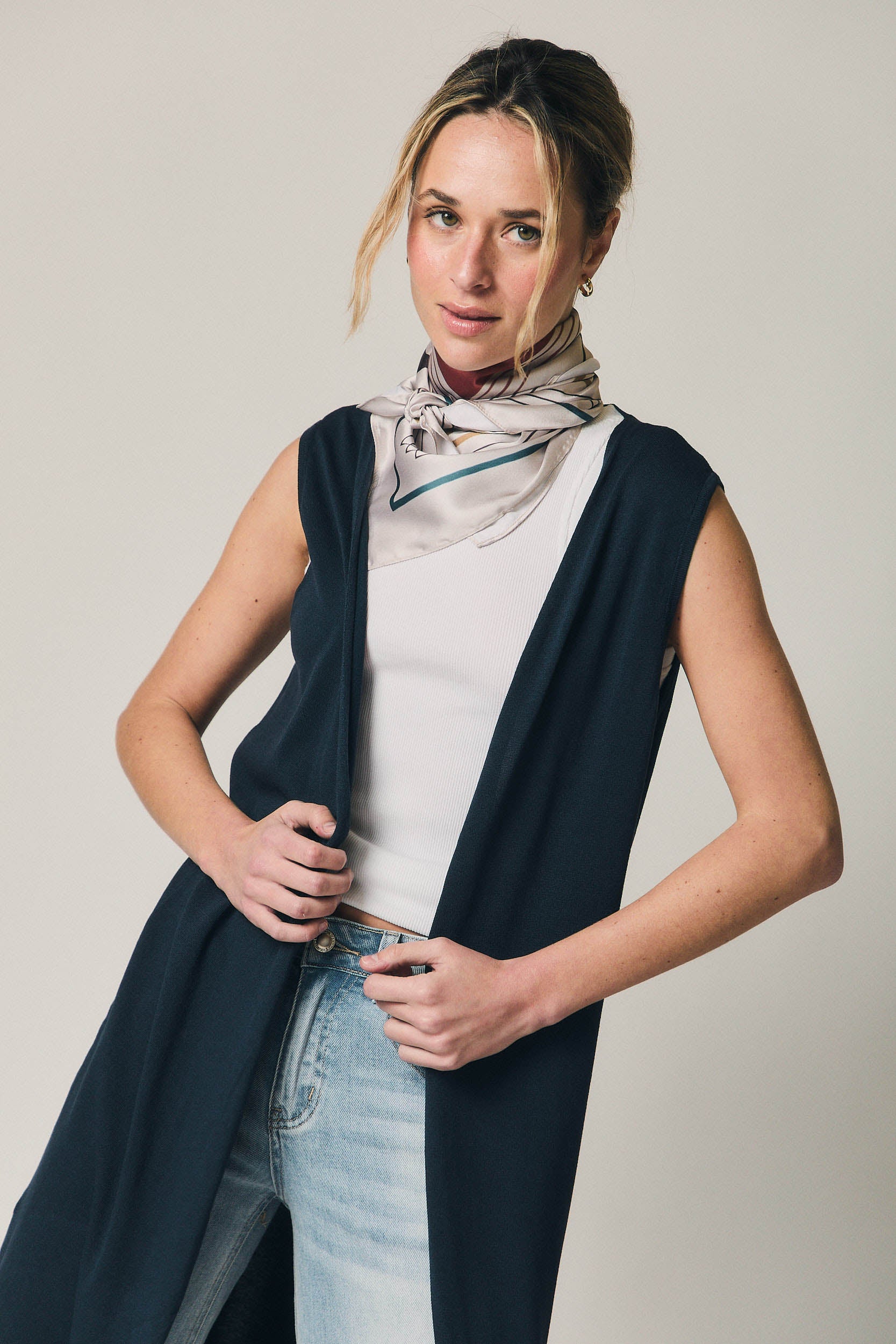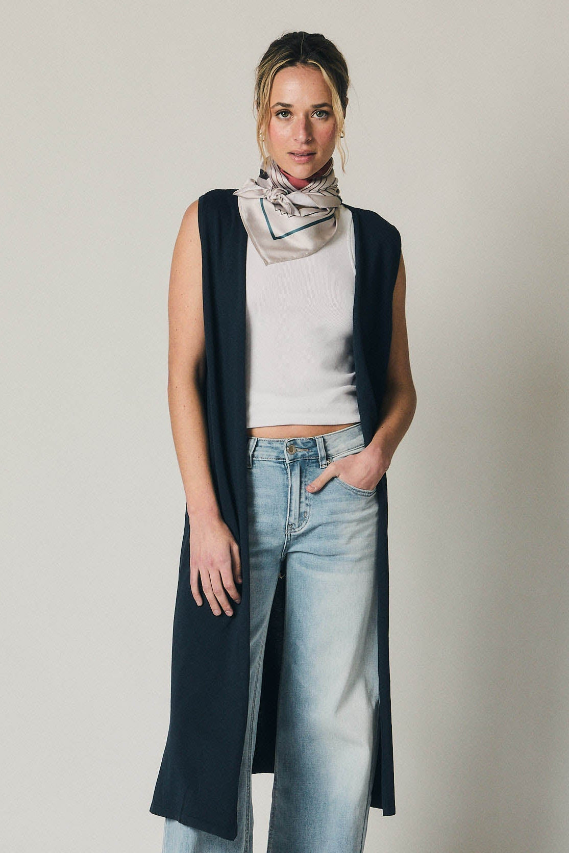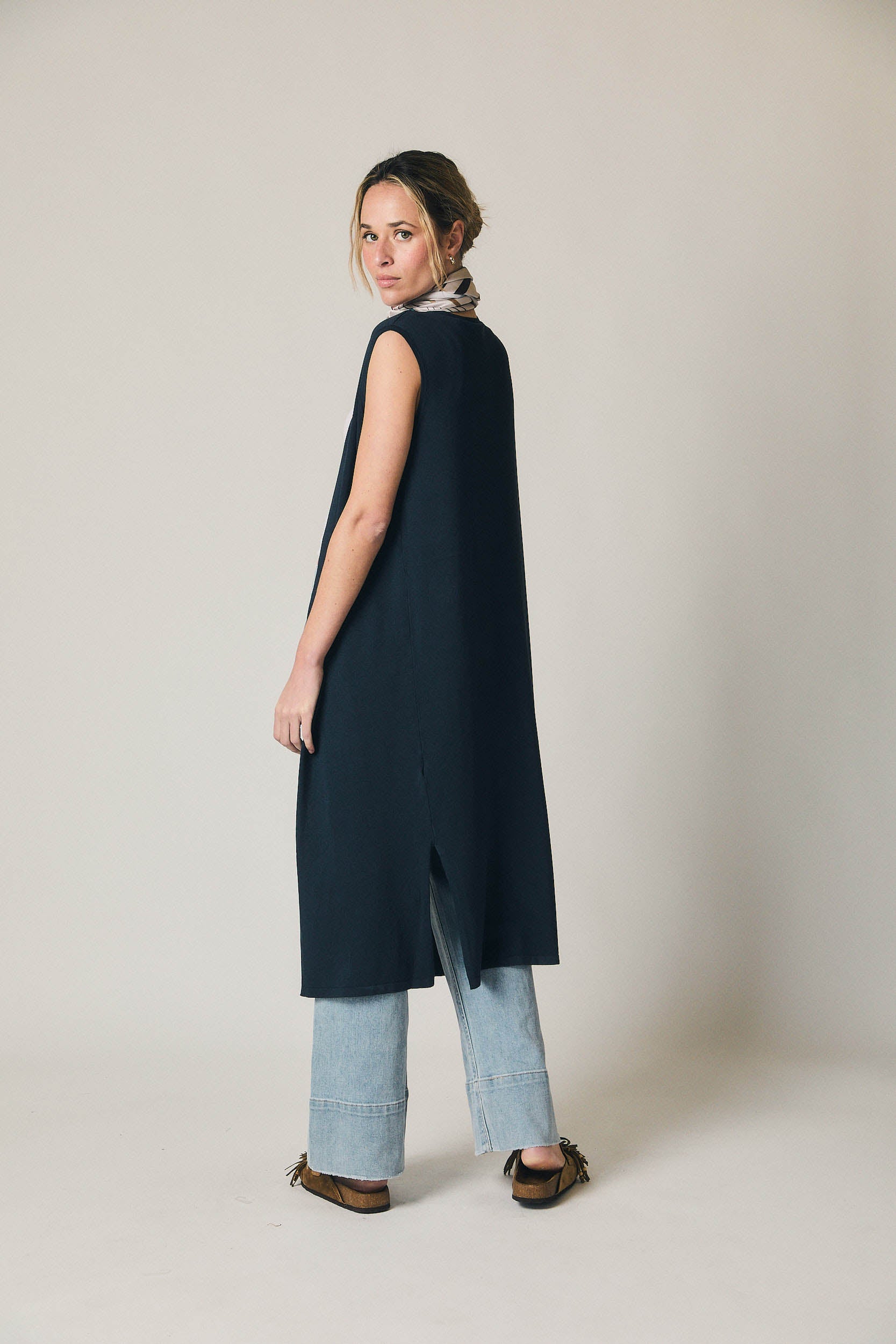 Chaleco largo de punto en tono azul marino. Diseño abierto sin cierre, con escote amplio y silueta recta que cae hasta media pierna. Presenta corte limpio y minimalista, sin mangas y con caída fluida que aporta movimiento al conjunto.